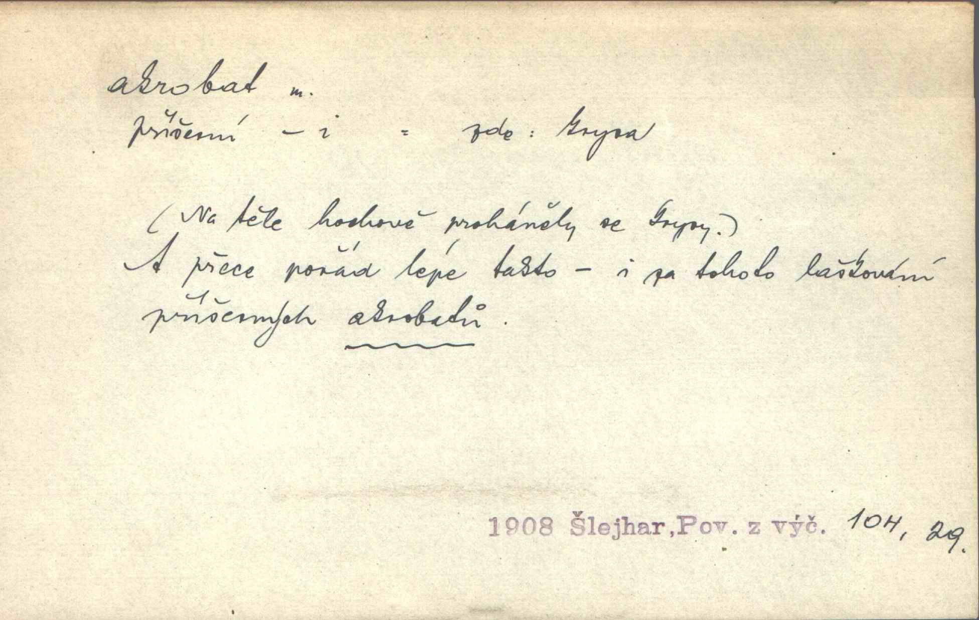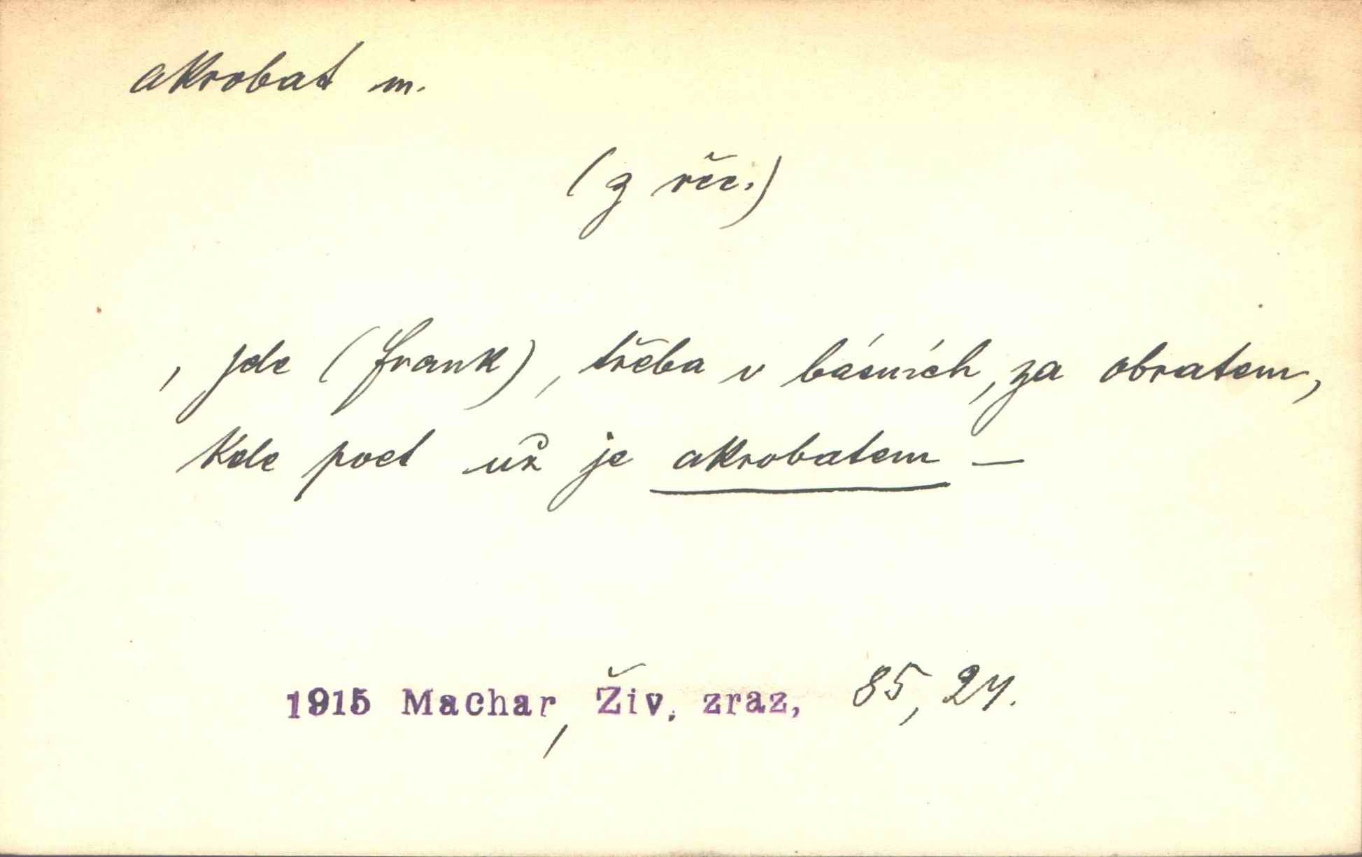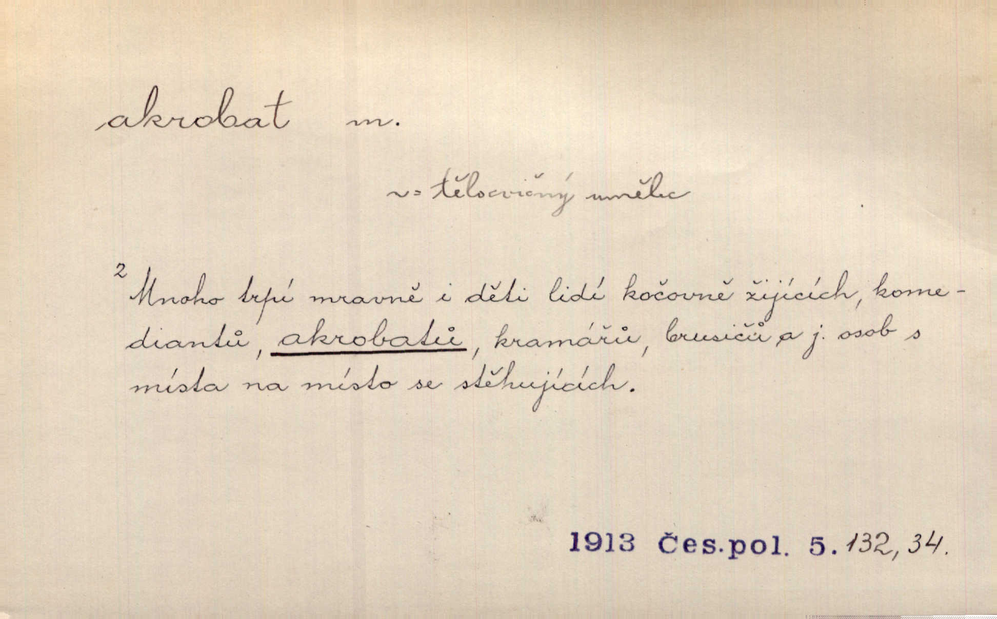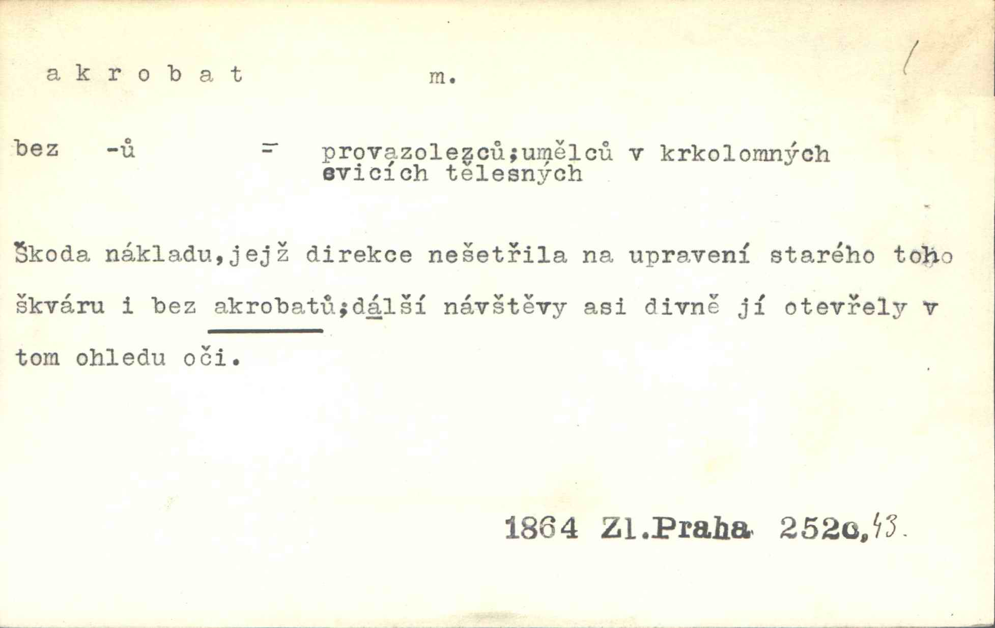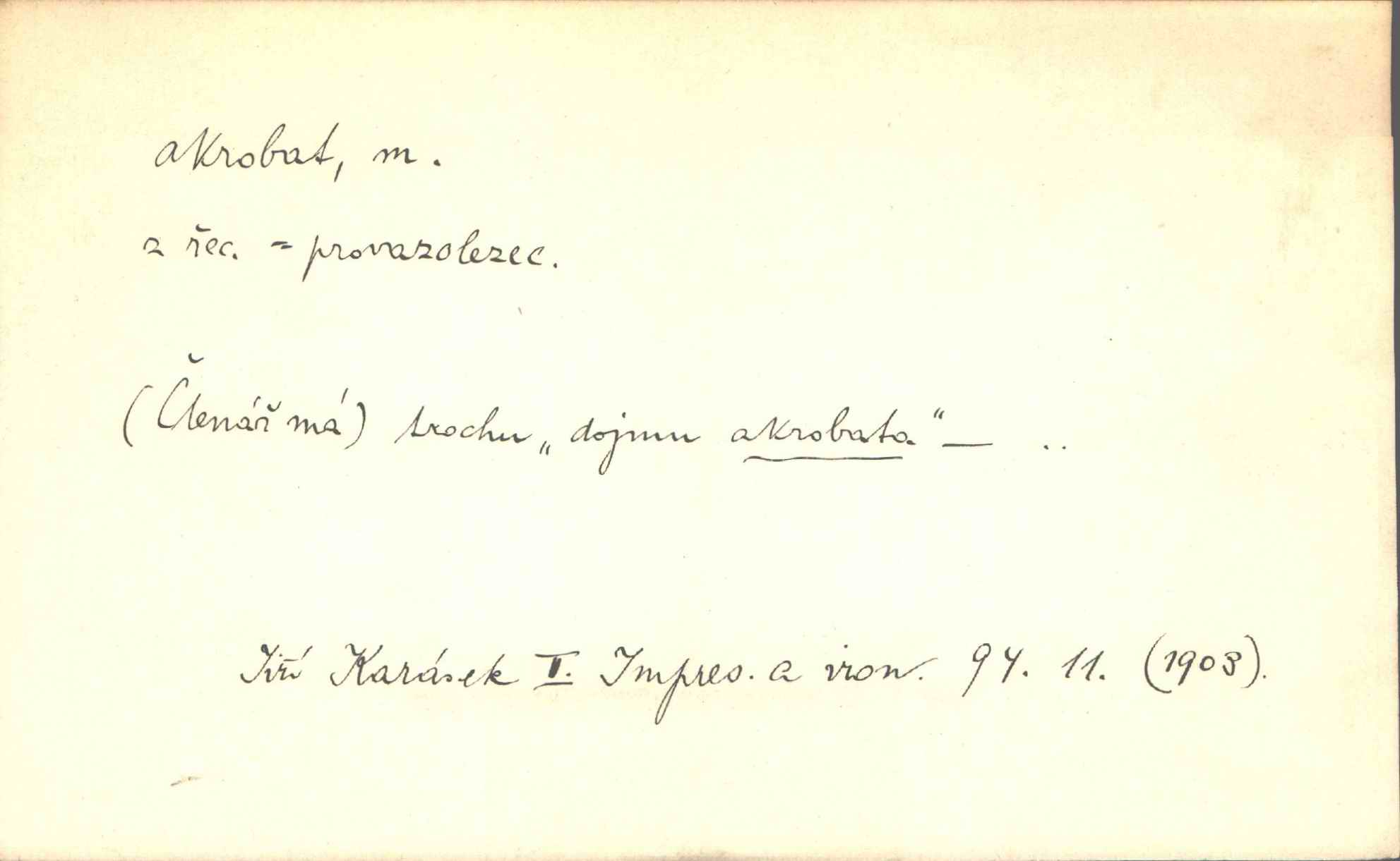 - akrobat, -a (pl. akrobati) m. cirkusový umělec, zvl. provazolezec. D přen. pejor. o umělcích dbajících jen o stránku technickou a okázalost. Jde, třeba v básních, za obratem, kde básník je už akrobatem. Mach. Básník s duší a vkusem akrobata, cítícího potřebu sensace a dychtícího po chvále ulic. Baar.