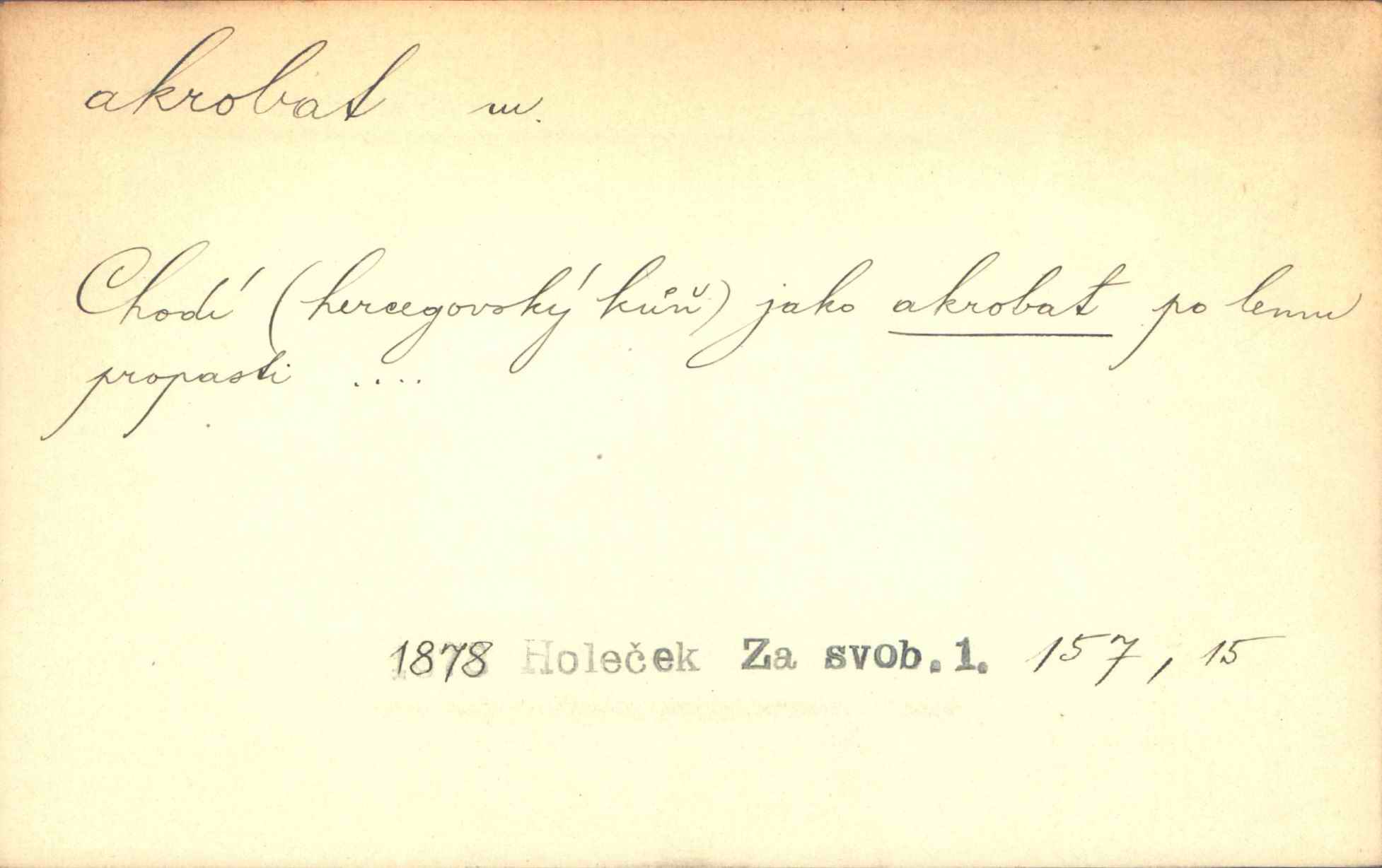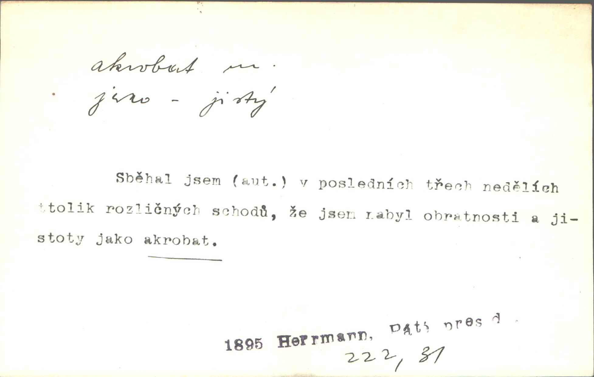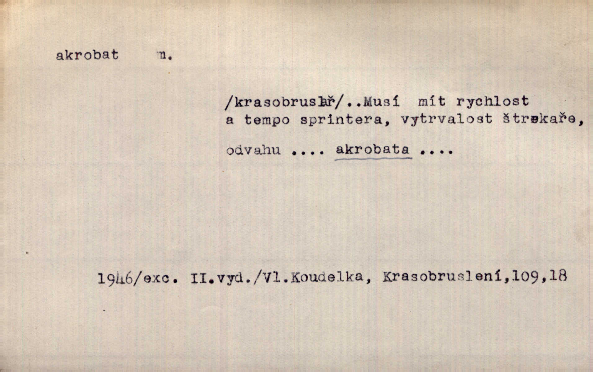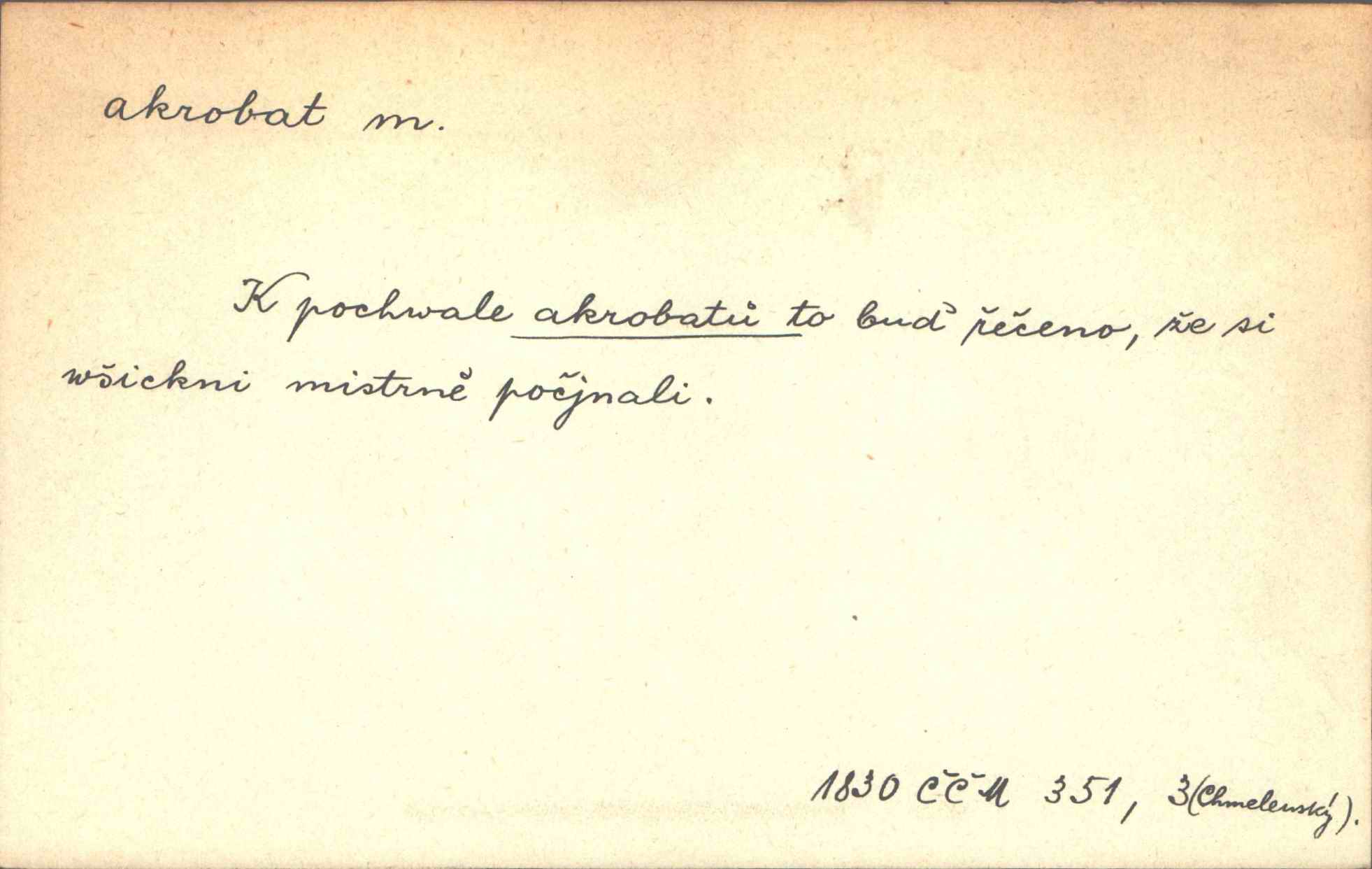- akrobat, -a (pl. akrobati) m. cirkusový umělec, zvl. provazolezec. D přen. pejor. o umělcích dbajících jen o stránku technickou a okázalost. Jde, třeba v básních, za obratem, kde básník je už akrobatem. Mach. Básník s duší a vkusem akrobata, cítícího potřebu sensace a dychtícího po chvále ulic. Baar.