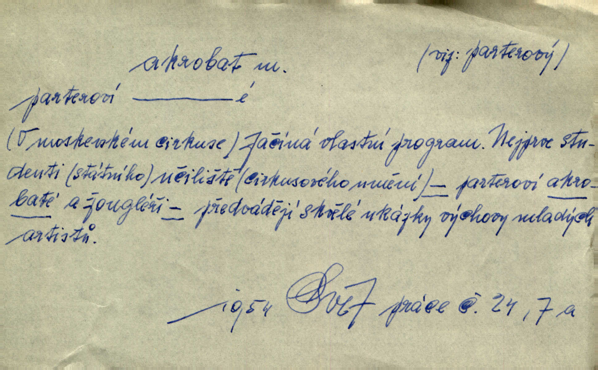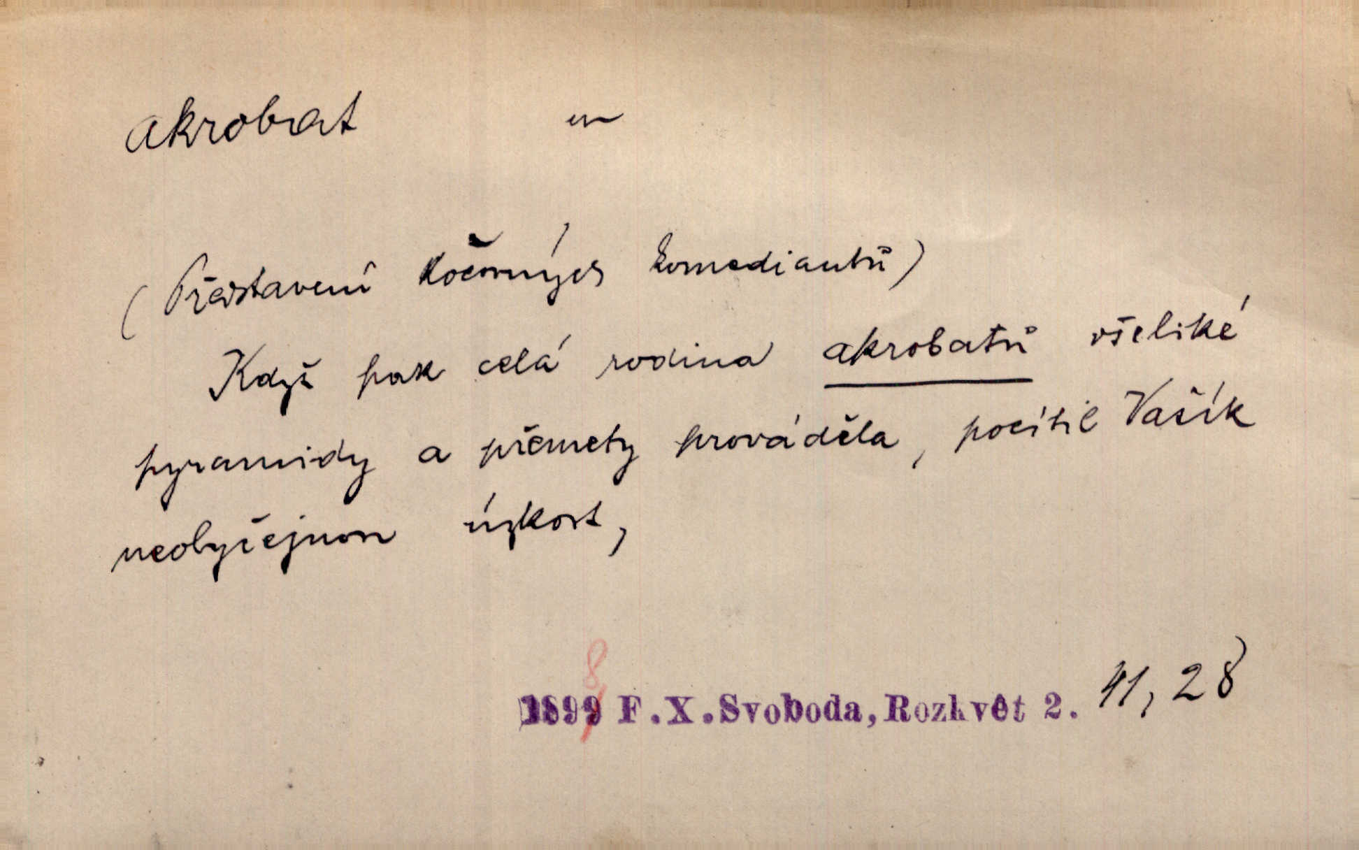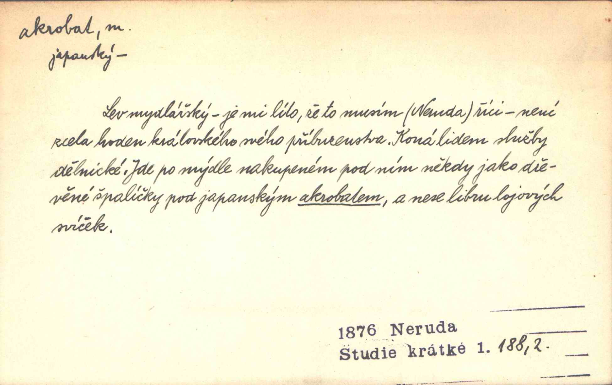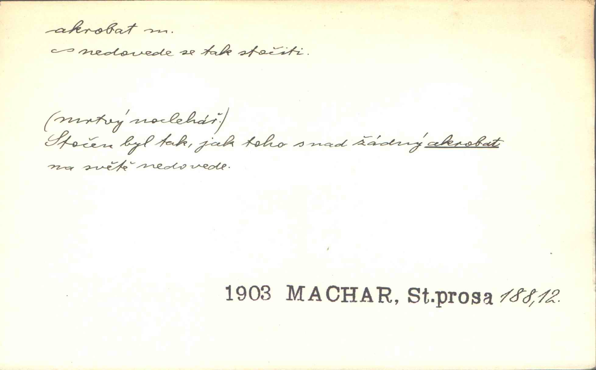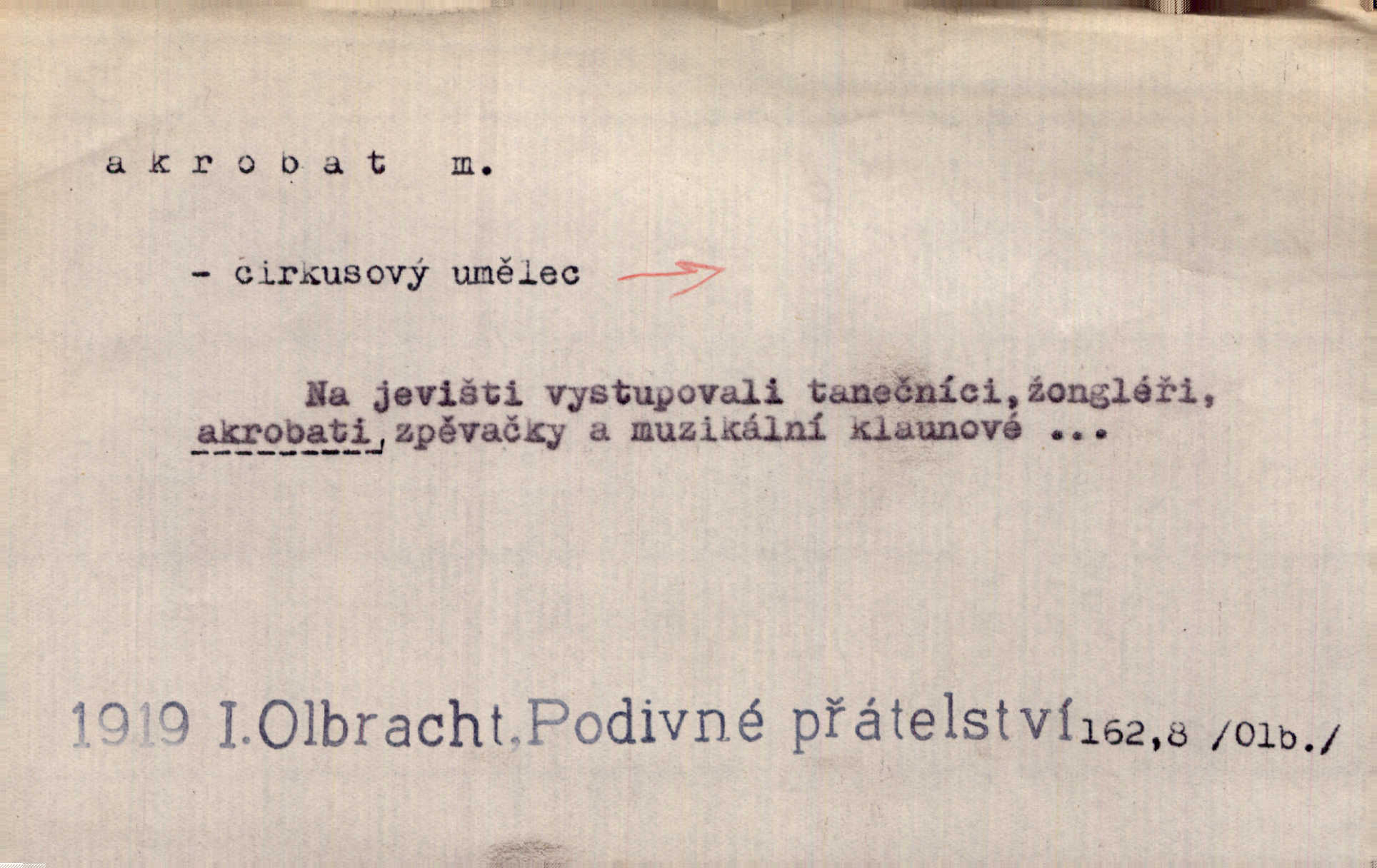 - akrobat, -a (pl. akrobati) m. cirkusový umělec, zvl. provazolezec. D přen. pejor. o umělcích dbajících jen o stránku technickou a okázalost. Jde, třeba v básních, za obratem, kde básník je už akrobatem. Mach. Básník s duší a vkusem akrobata, cítícího potřebu sensace a dychtícího po chvále ulic. Baar.