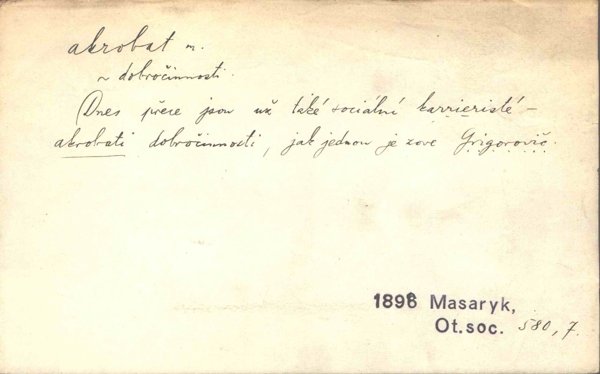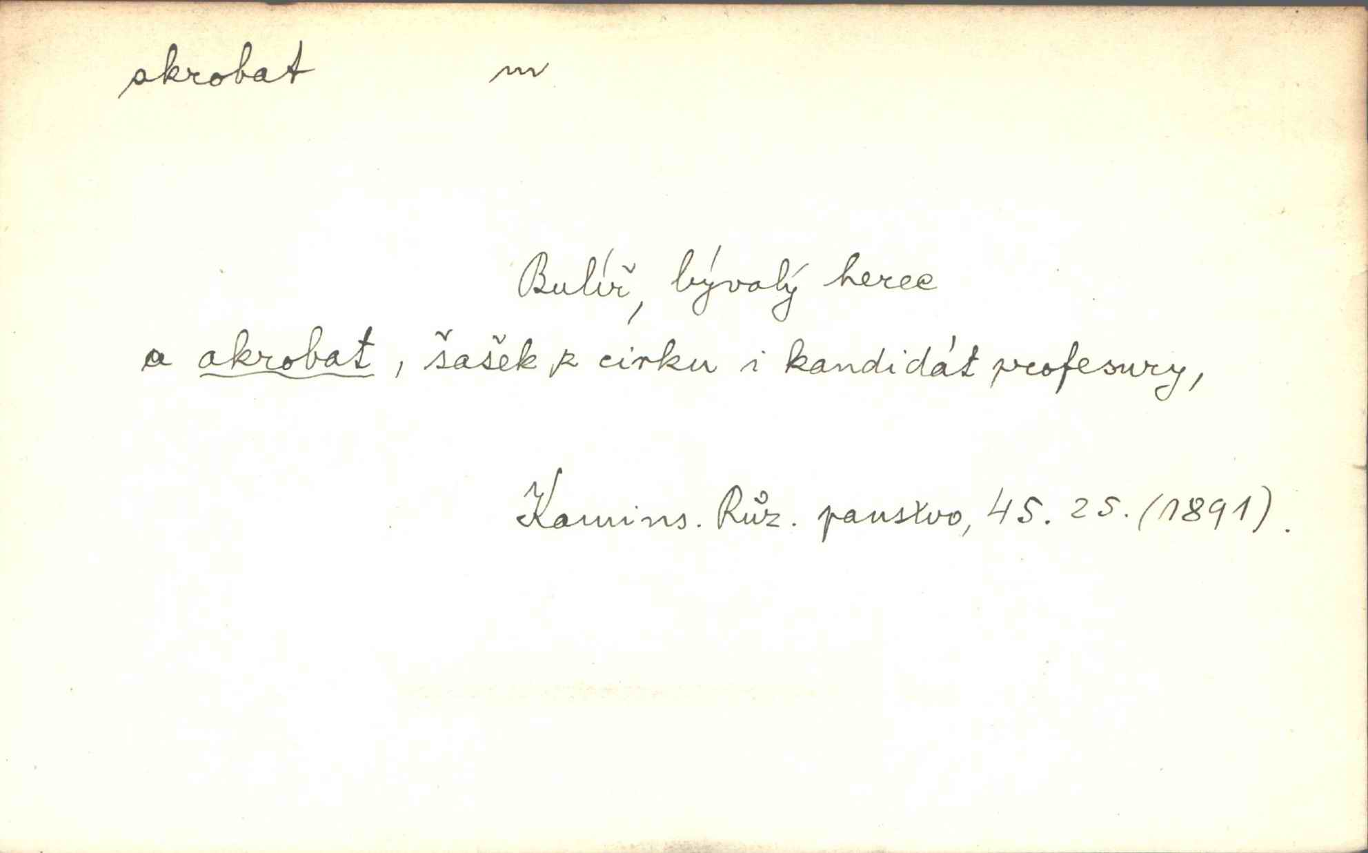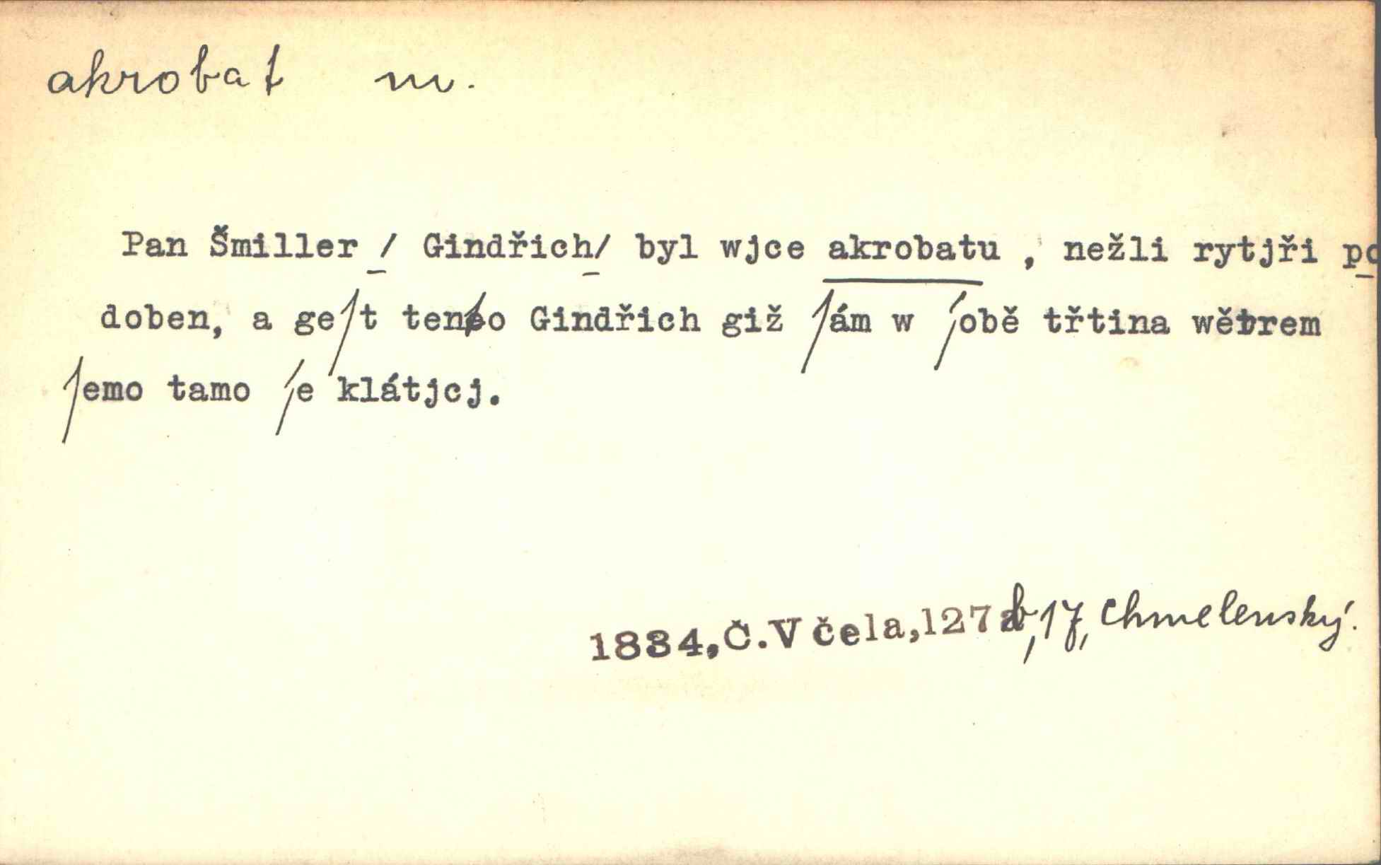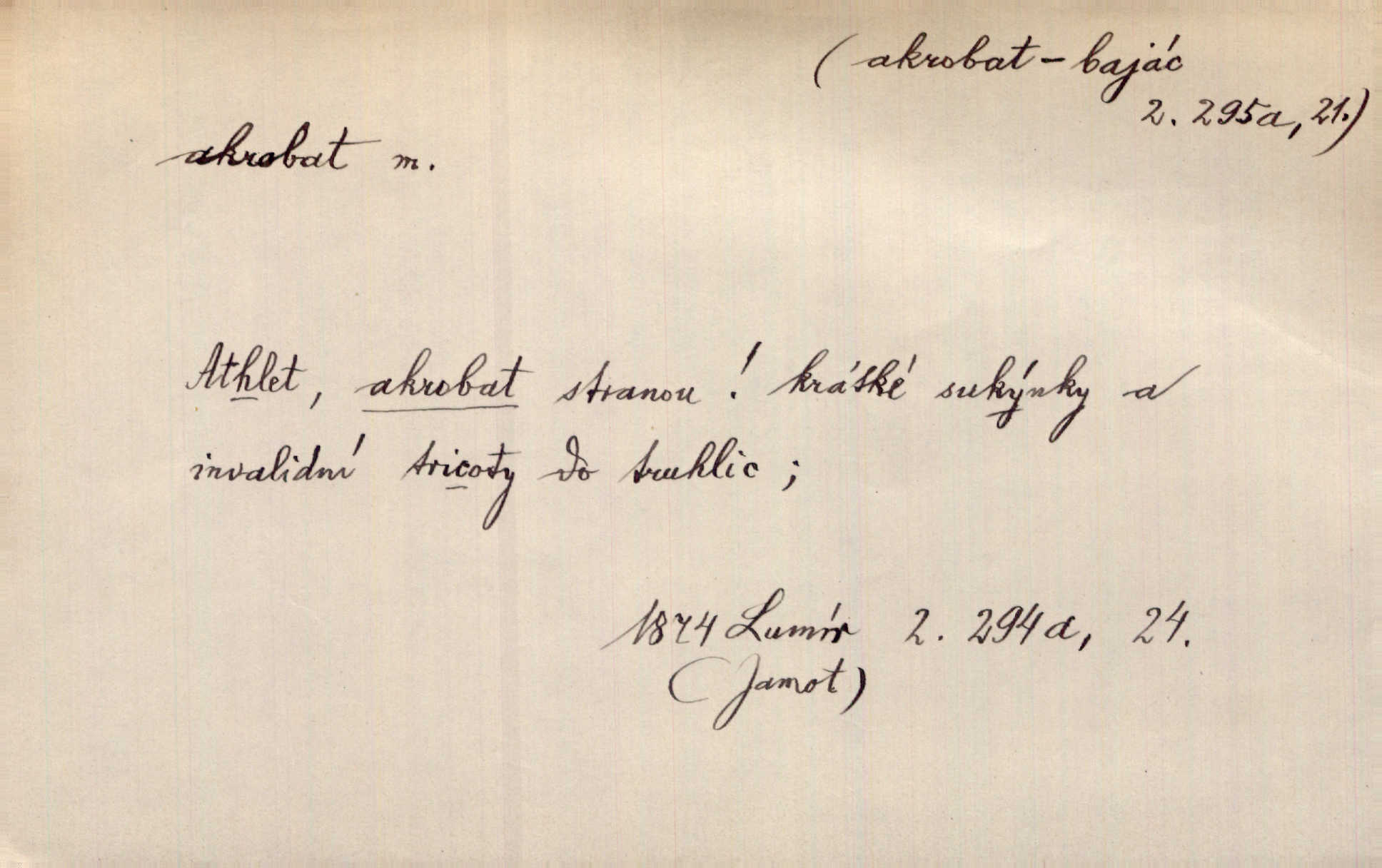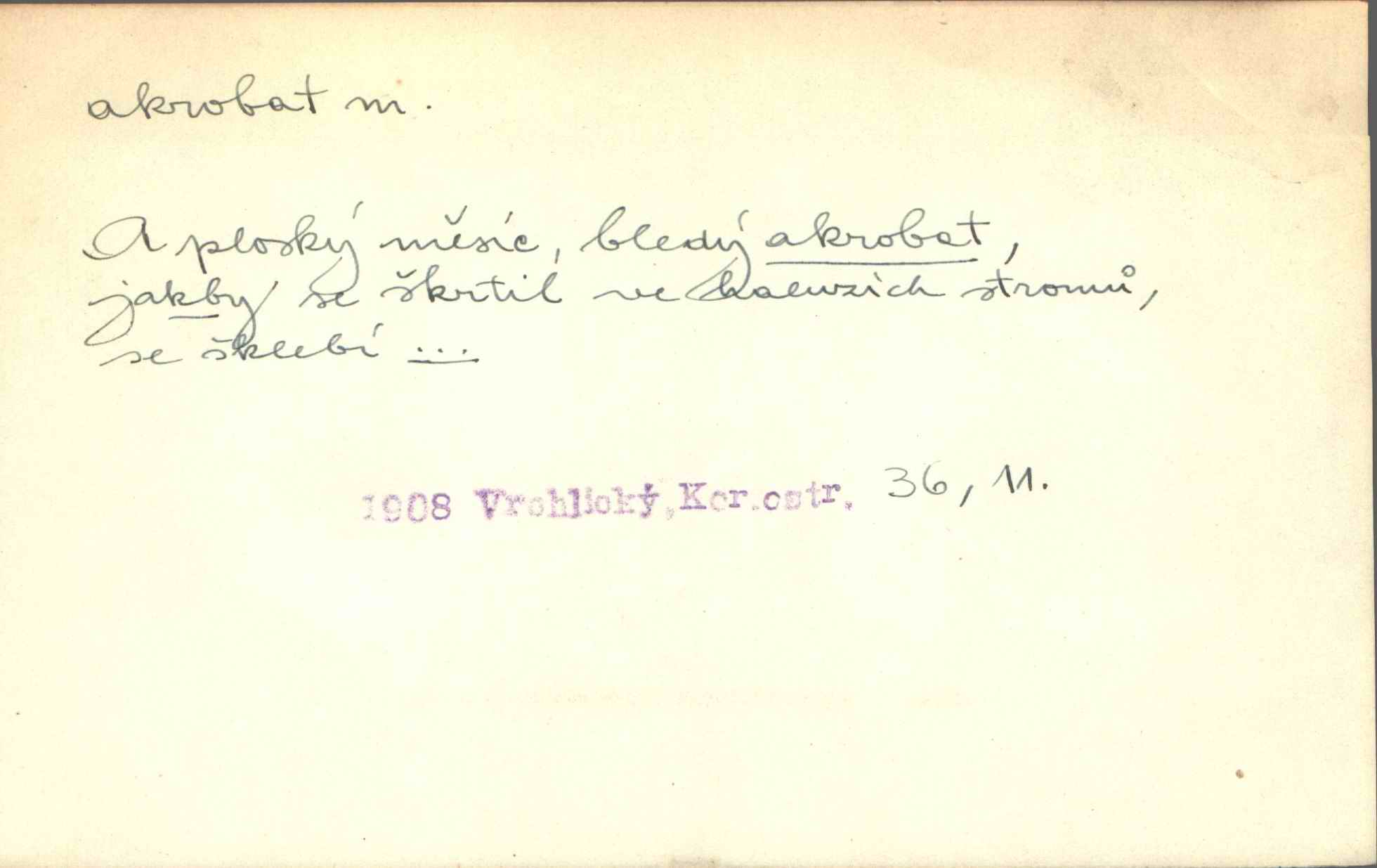 - akrobat, -a (pl. akrobati) m. cirkusový umělec, zvl. provazolezec. D přen. pejor. o umělcích dbajících jen o stránku technickou a okázalost. Jde, třeba v básních, za obratem, kde básník je už akrobatem. Mach. Básník s duší a vkusem akrobata, cítícího potřebu sensace a dychtícího po chvále ulic. Baar.