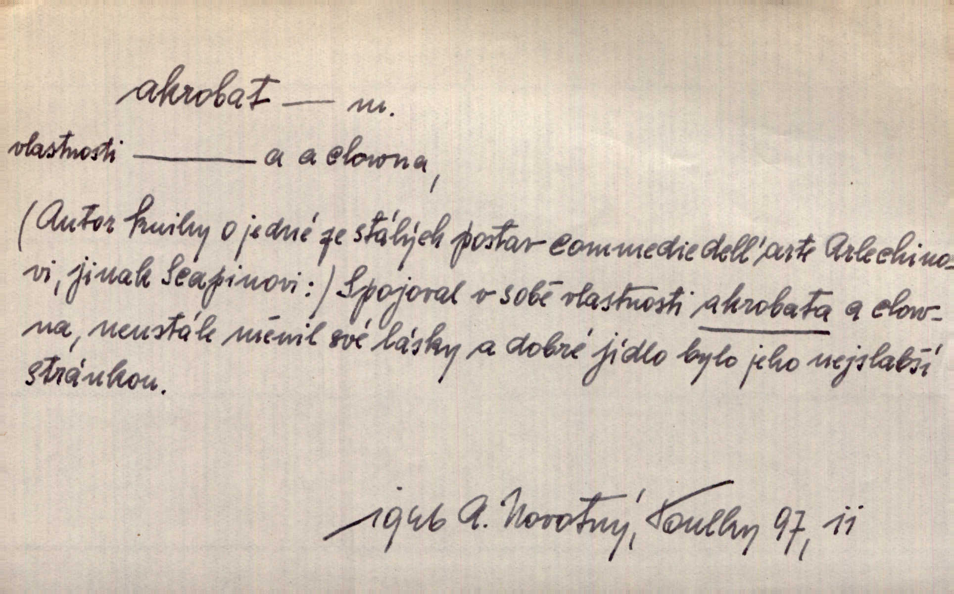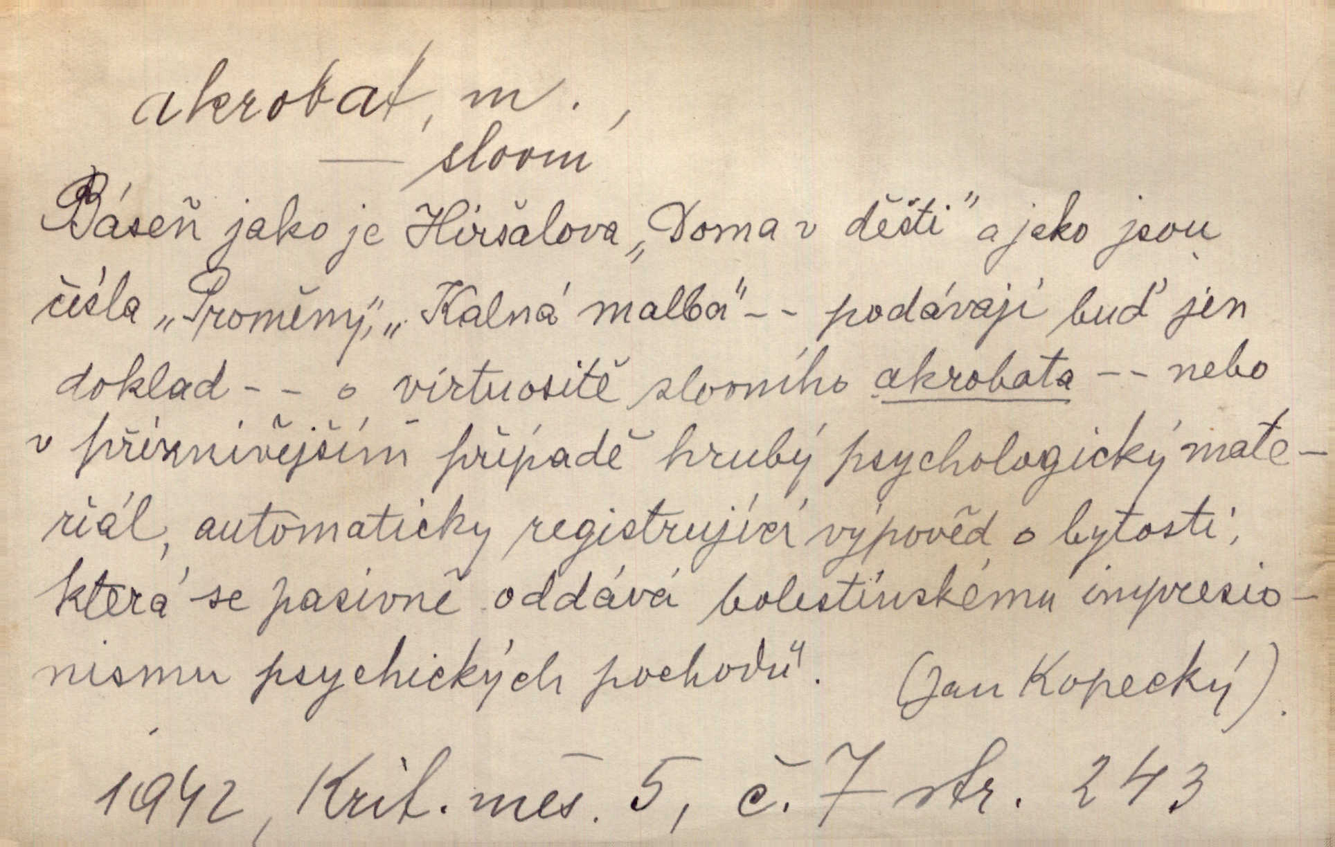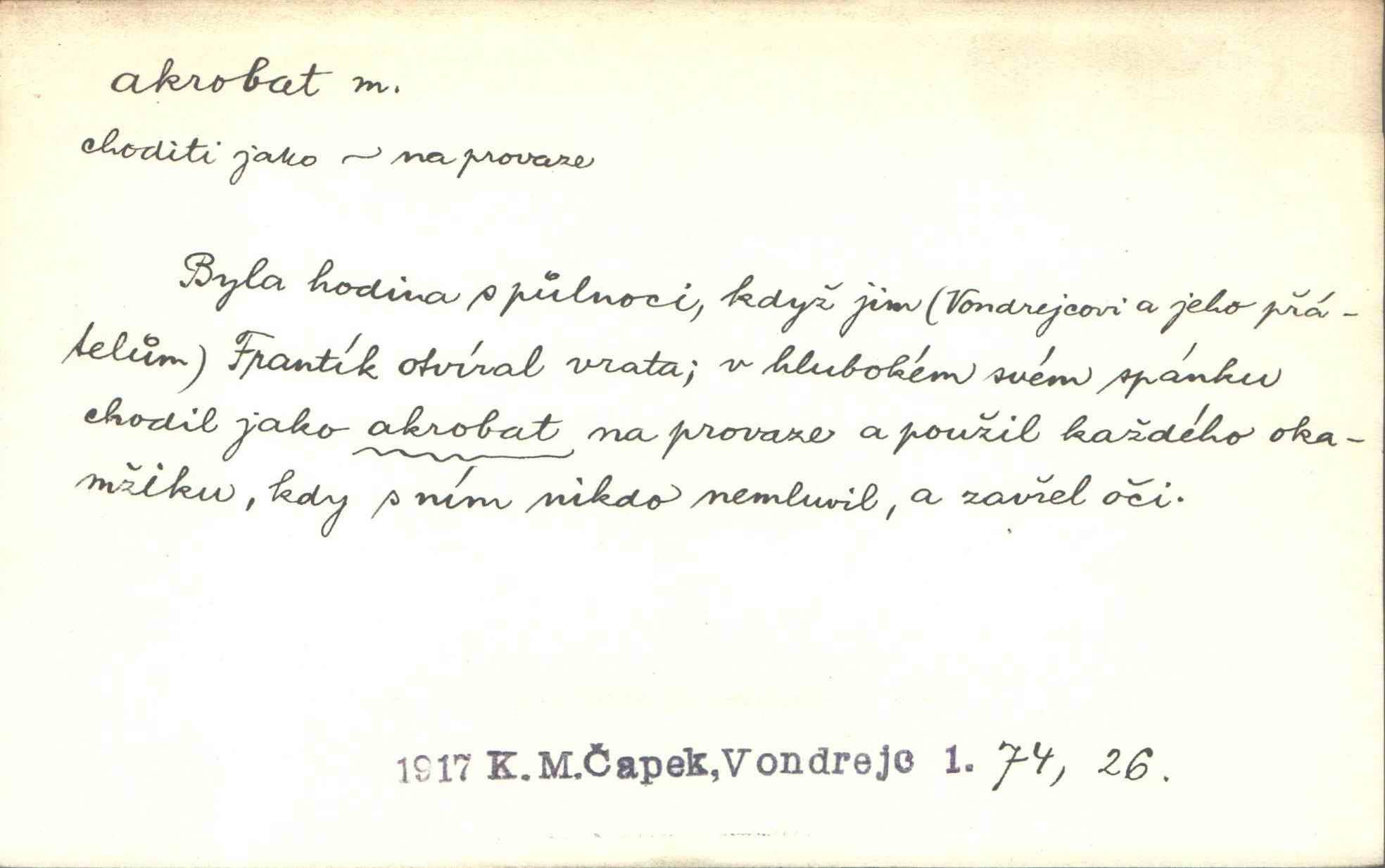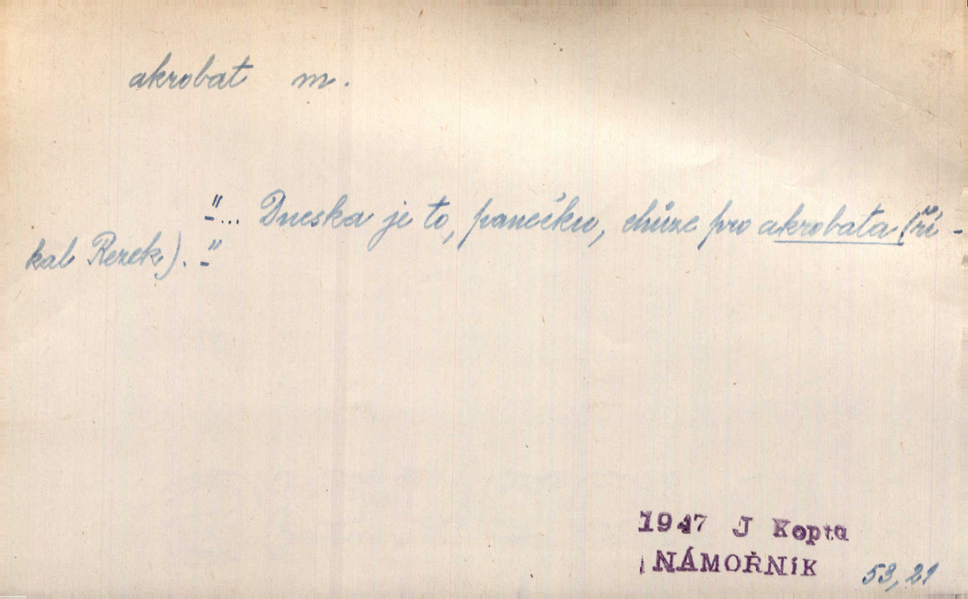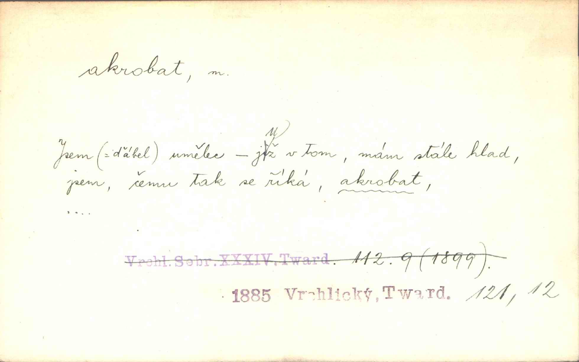 - akrobat, -a (pl. akrobati) m. cirkusový umělec, zvl. provazolezec. D přen. pejor. o umělcích dbajících jen o stránku technickou a okázalost. Jde, třeba v básních, za obratem, kde básník je už akrobatem. Mach. Básník s duší a vkusem akrobata, cítícího potřebu sensace a dychtícího po chvále ulic. Baar.
