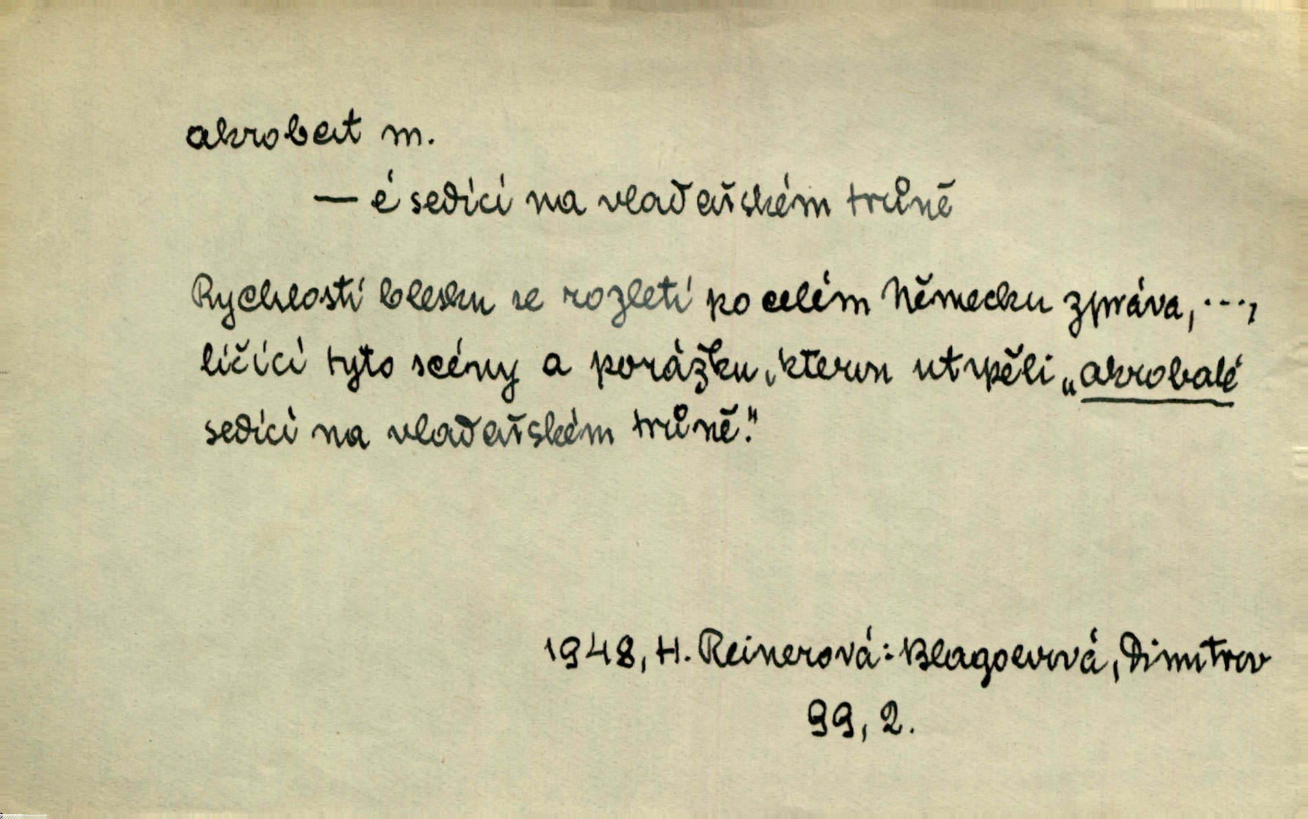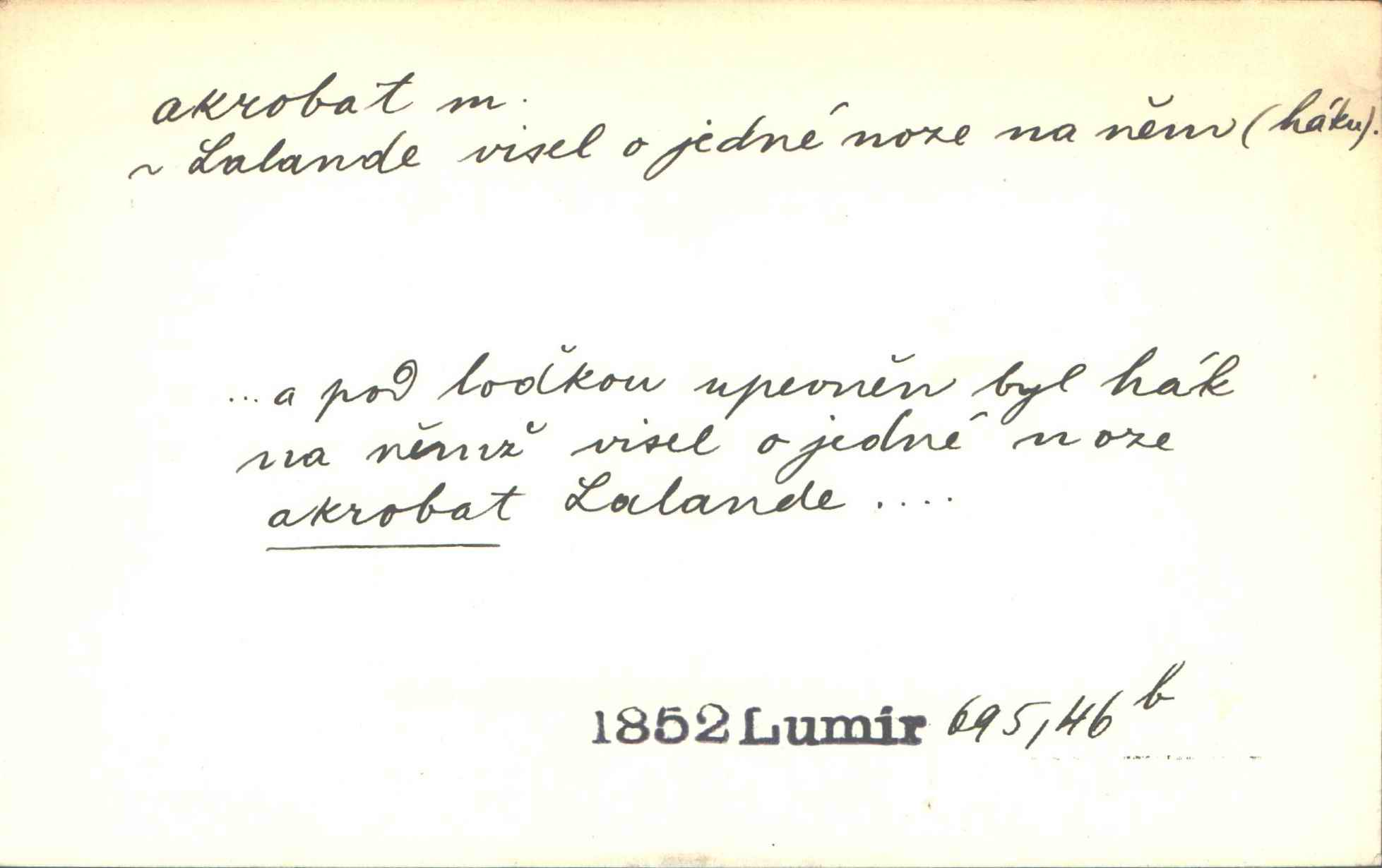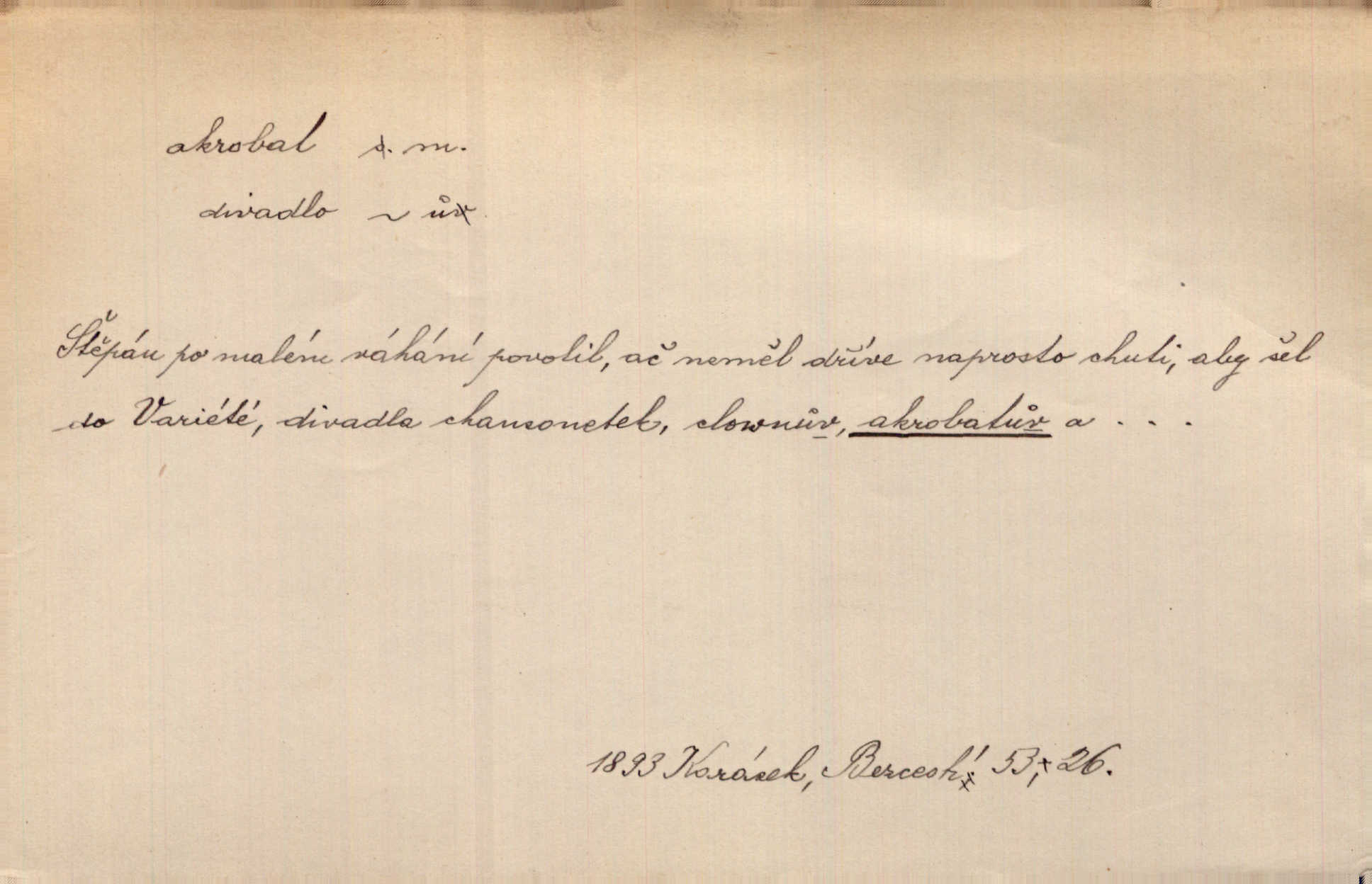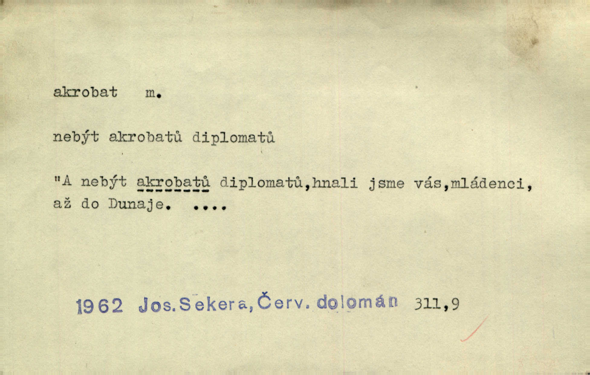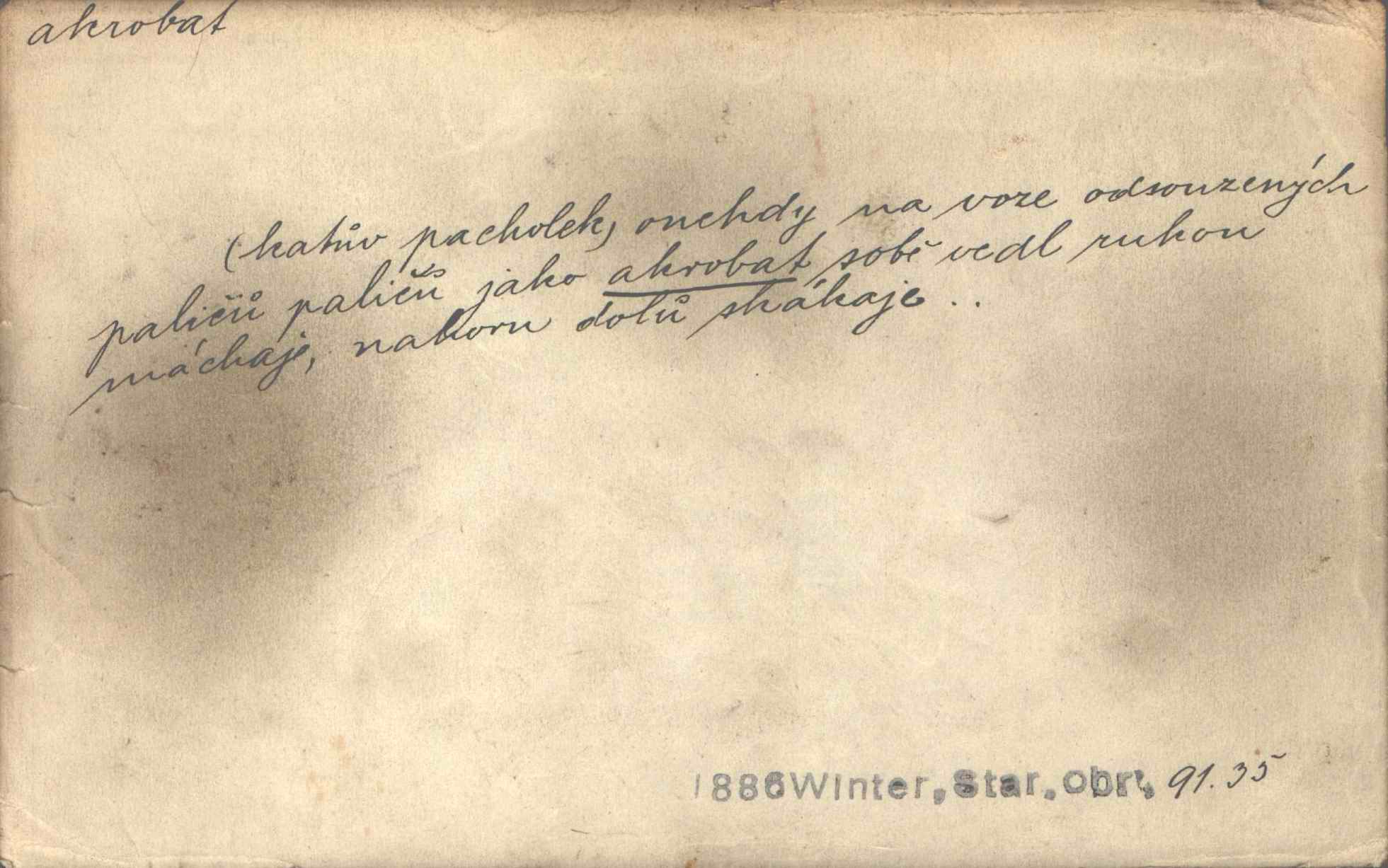 - akrobat, -a (pl. akrobati) m. cirkusový umělec, zvl. provazolezec. D přen. pejor. o umělcích dbajících jen o stránku technickou a okázalost. Jde, třeba v básních, za obratem, kde básník je už akrobatem. Mach. Básník s duší a vkusem akrobata, cítícího potřebu sensace a dychtícího po chvále ulic. Baar.