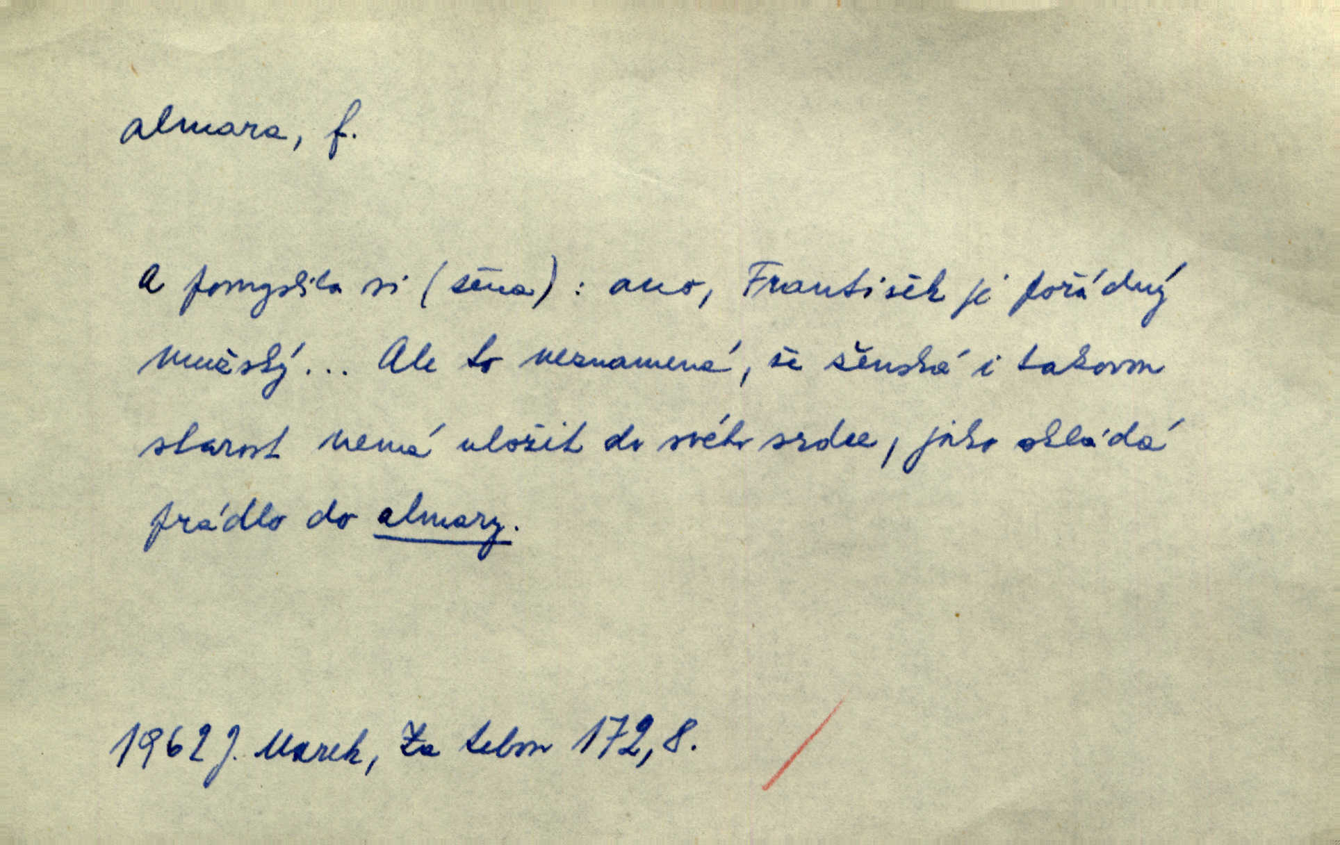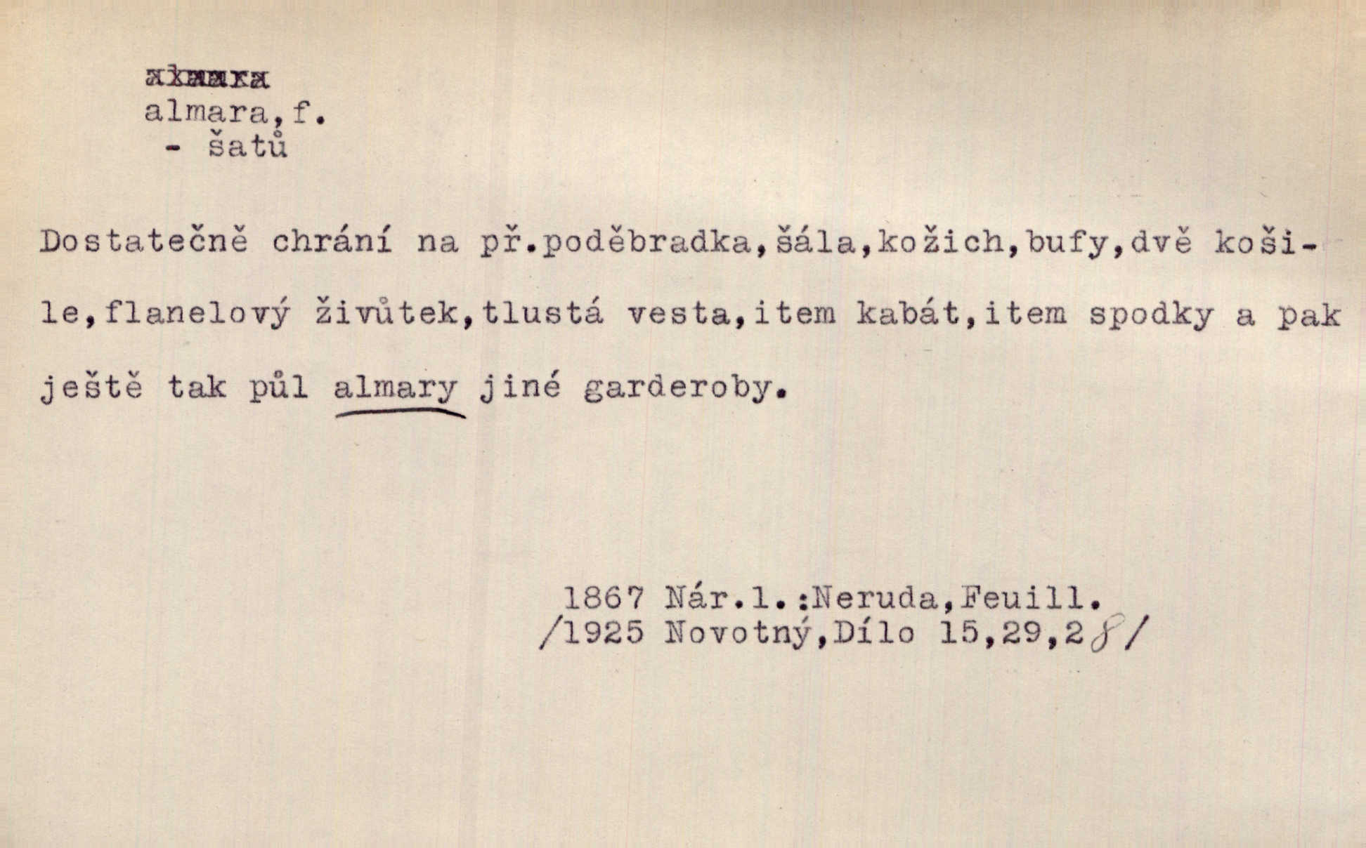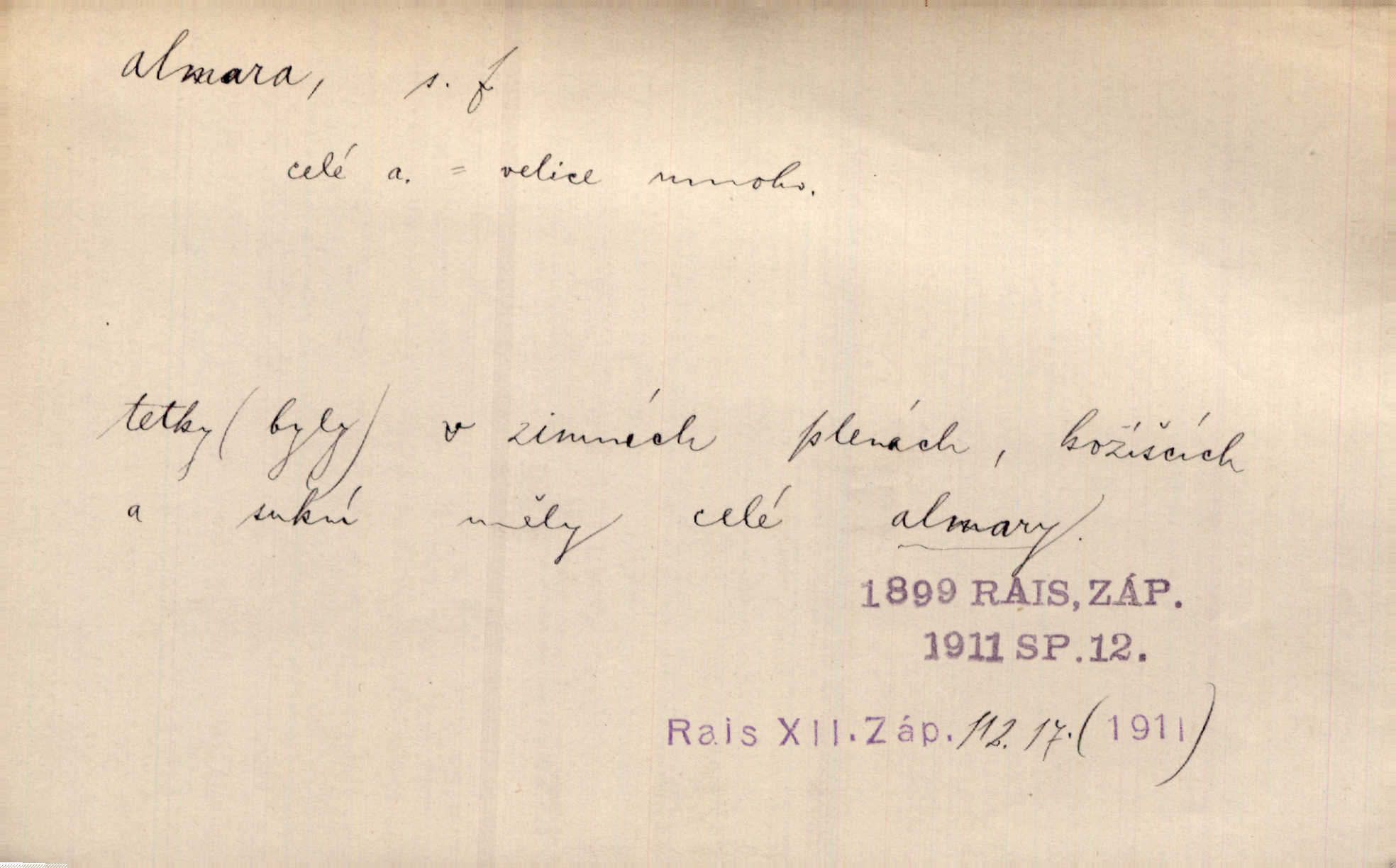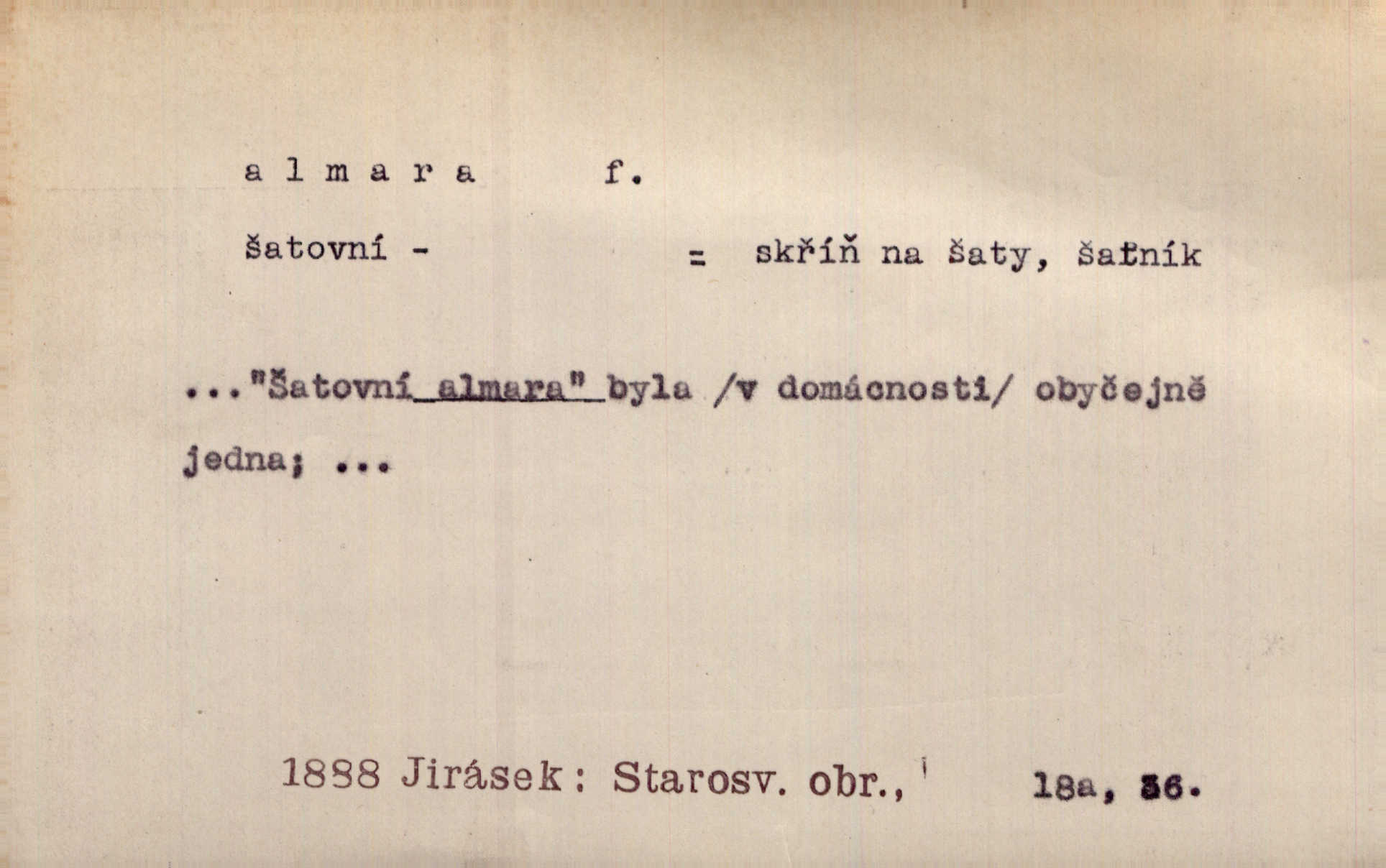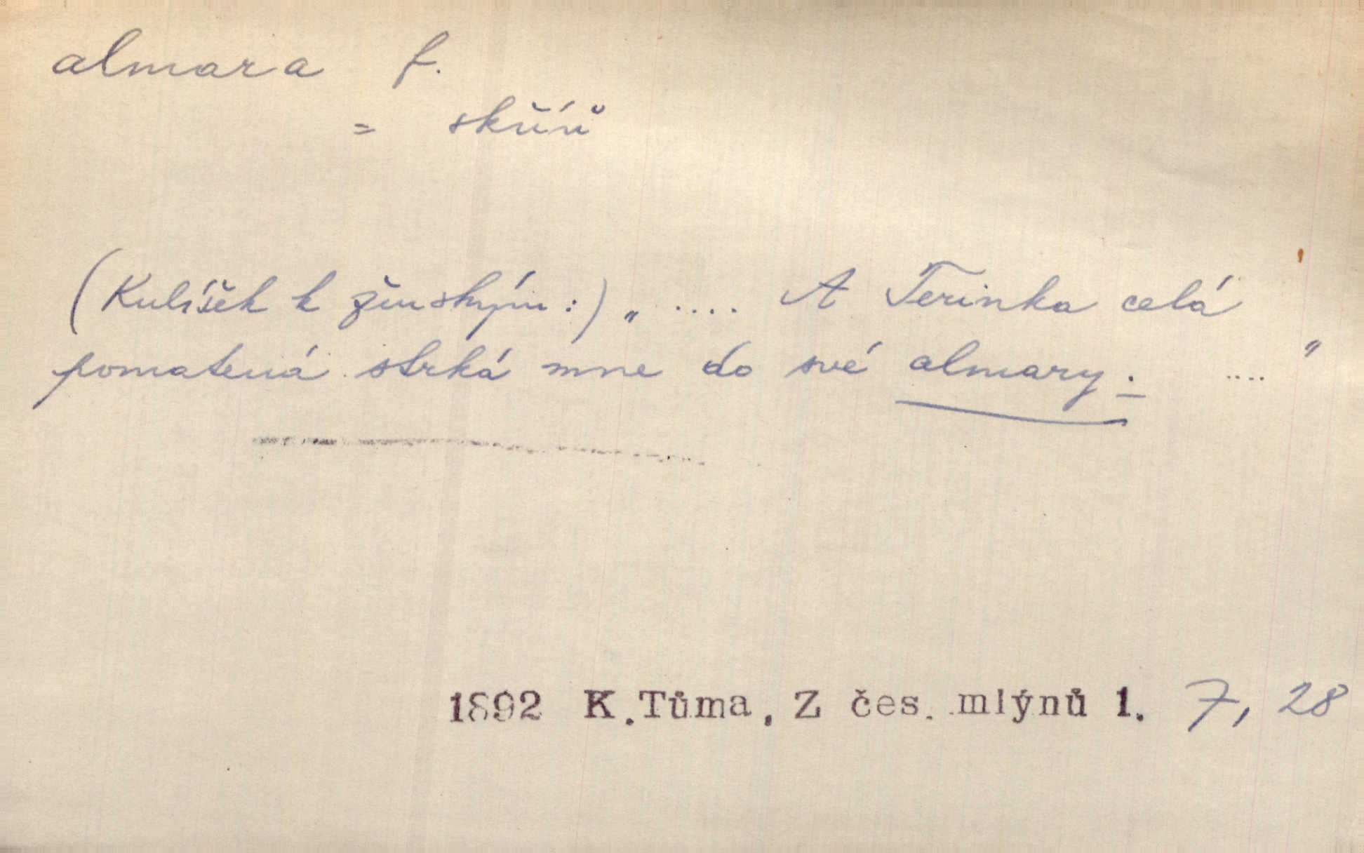 - almara, -y f. lid. skříň. Oblekla na sebe v almaře uschované kanafasové modračky. V. Mrš. Rozevřev almaru vyňal z ní knížku. Jir. Měl v almaře oddělení stále zásobené chlebem. Jir. Přen., hum. o něčem velkém a nemotorném. Říditi rachotící tu almaru [dostavník]‚ k tomu věru zapotřebí nejen síly a zkušenosti. Štol. Ohromná almara, kterou spatřil, byla Bártovcova žena. Klost.