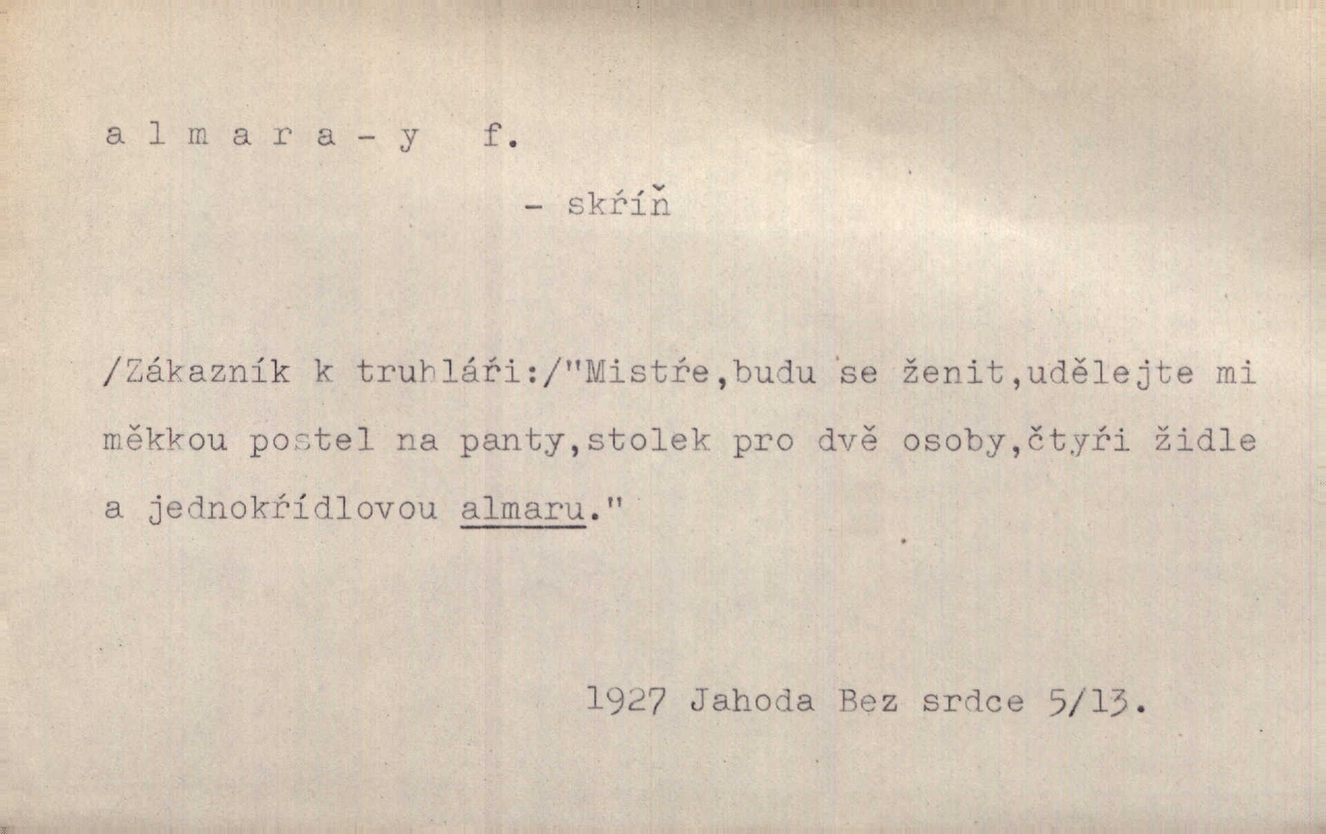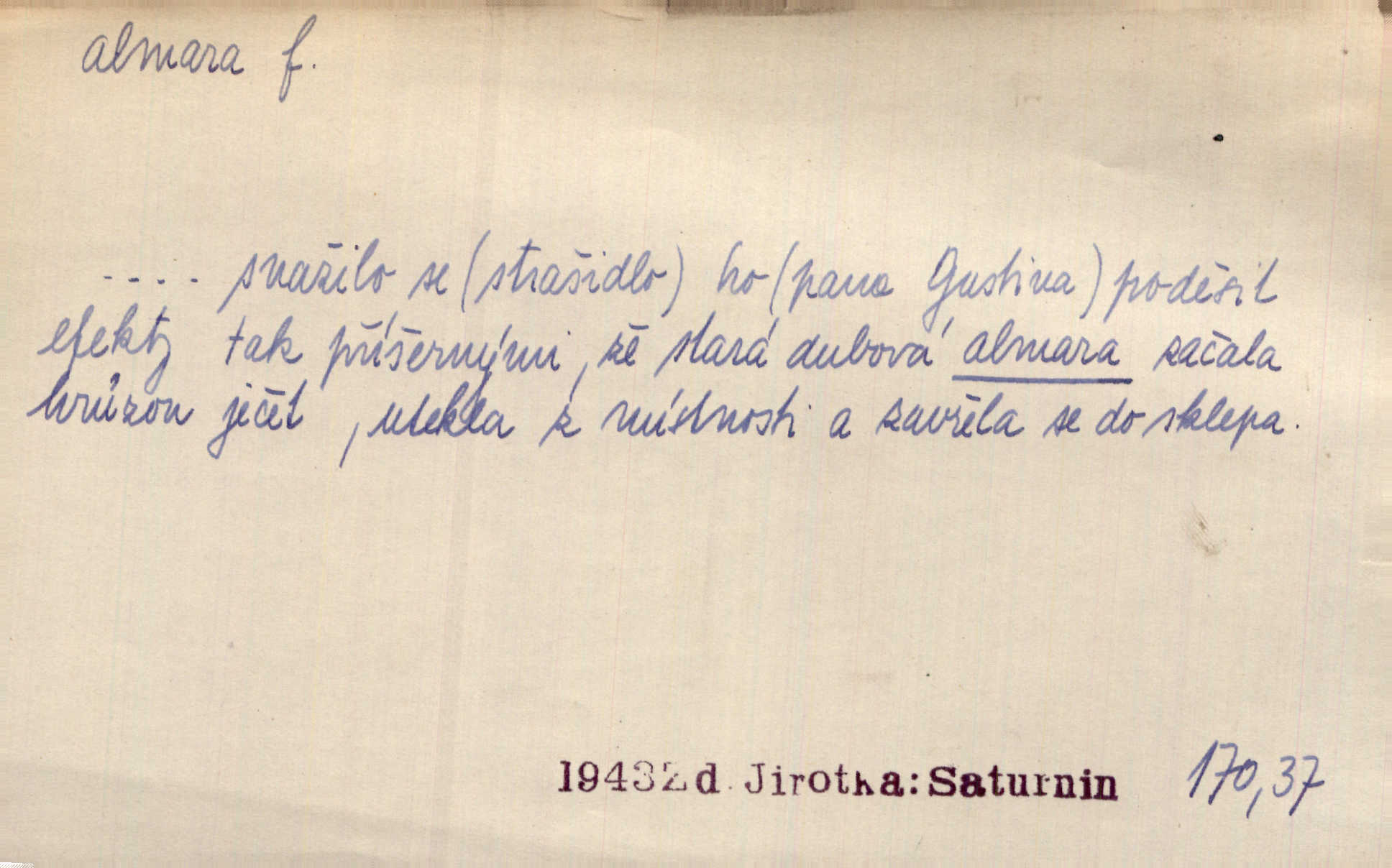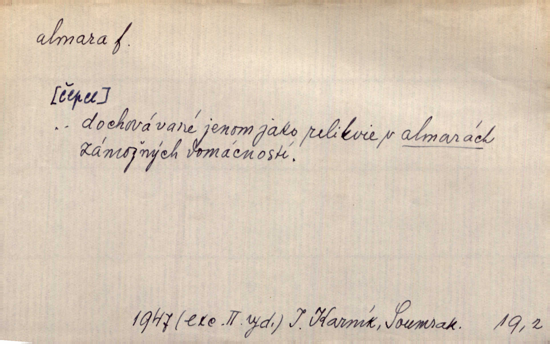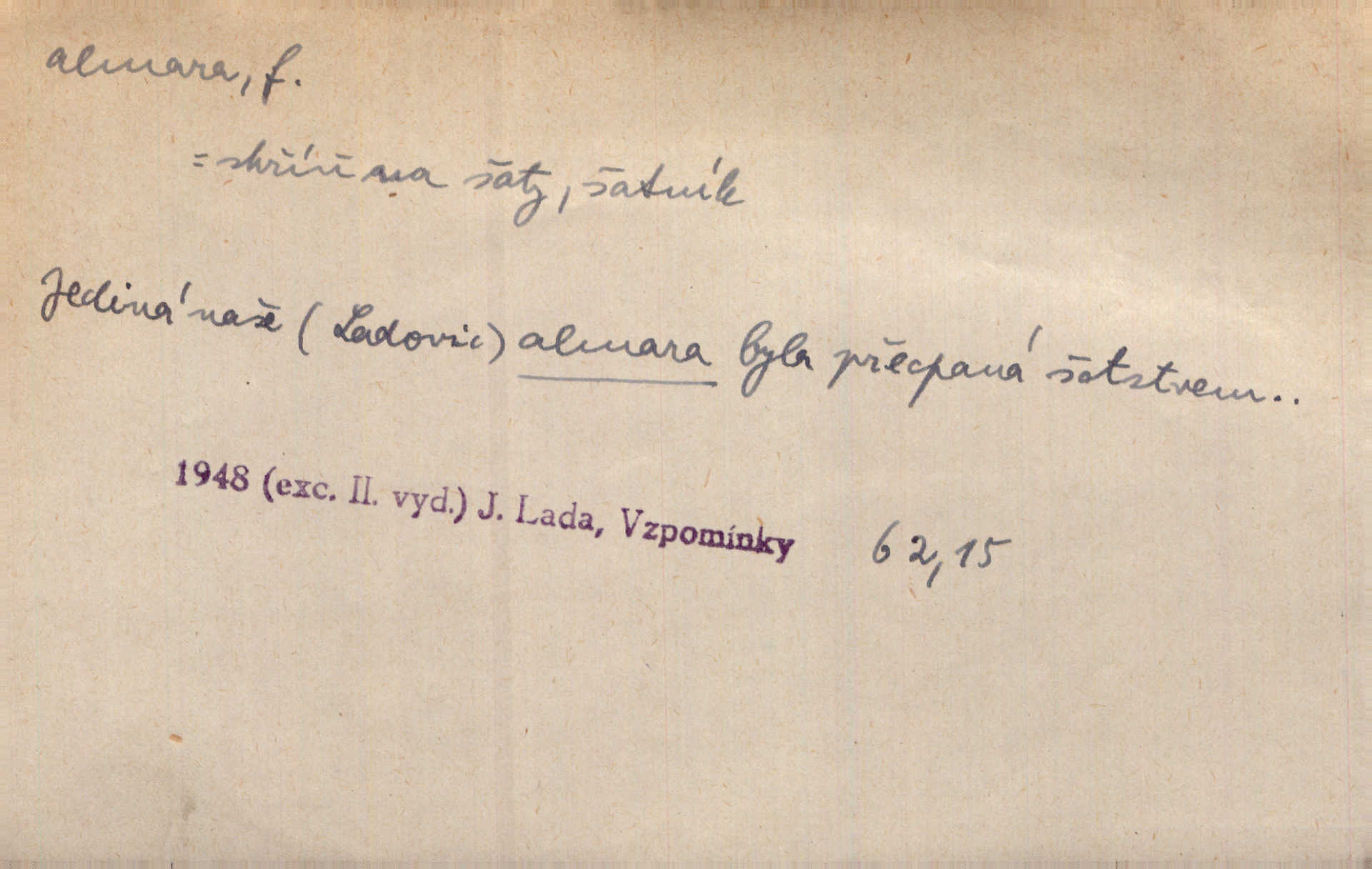 - almara, -y f. lid. skříň. Oblekla na sebe v almaře uschované kanafasové modračky. V. Mrš. Rozevřev almaru vyňal z ní knížku. Jir. Měl v almaře oddělení stále zásobené chlebem. Jir. Přen., hum. o něčem velkém a nemotorném. Říditi rachotící tu almaru [dostavník]‚ k tomu věru zapotřebí nejen síly a zkušenosti. Štol. Ohromná almara, kterou spatřil, byla Bártovcova žena. Klost.