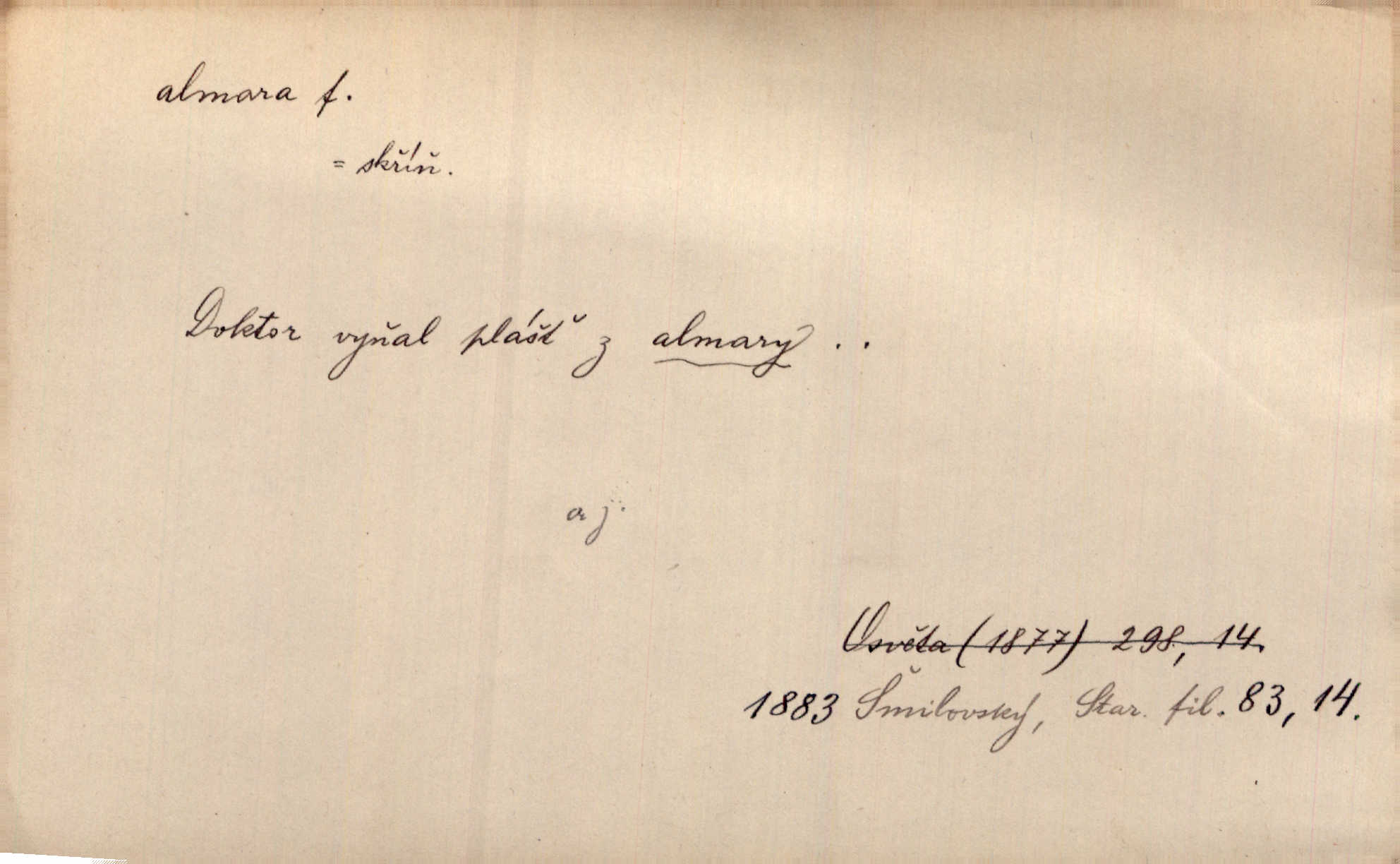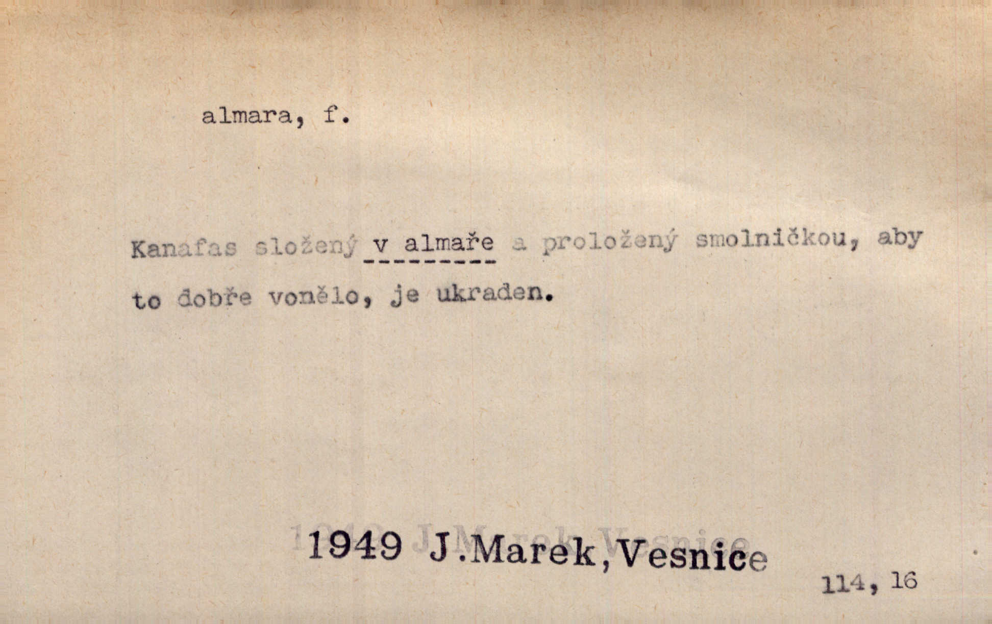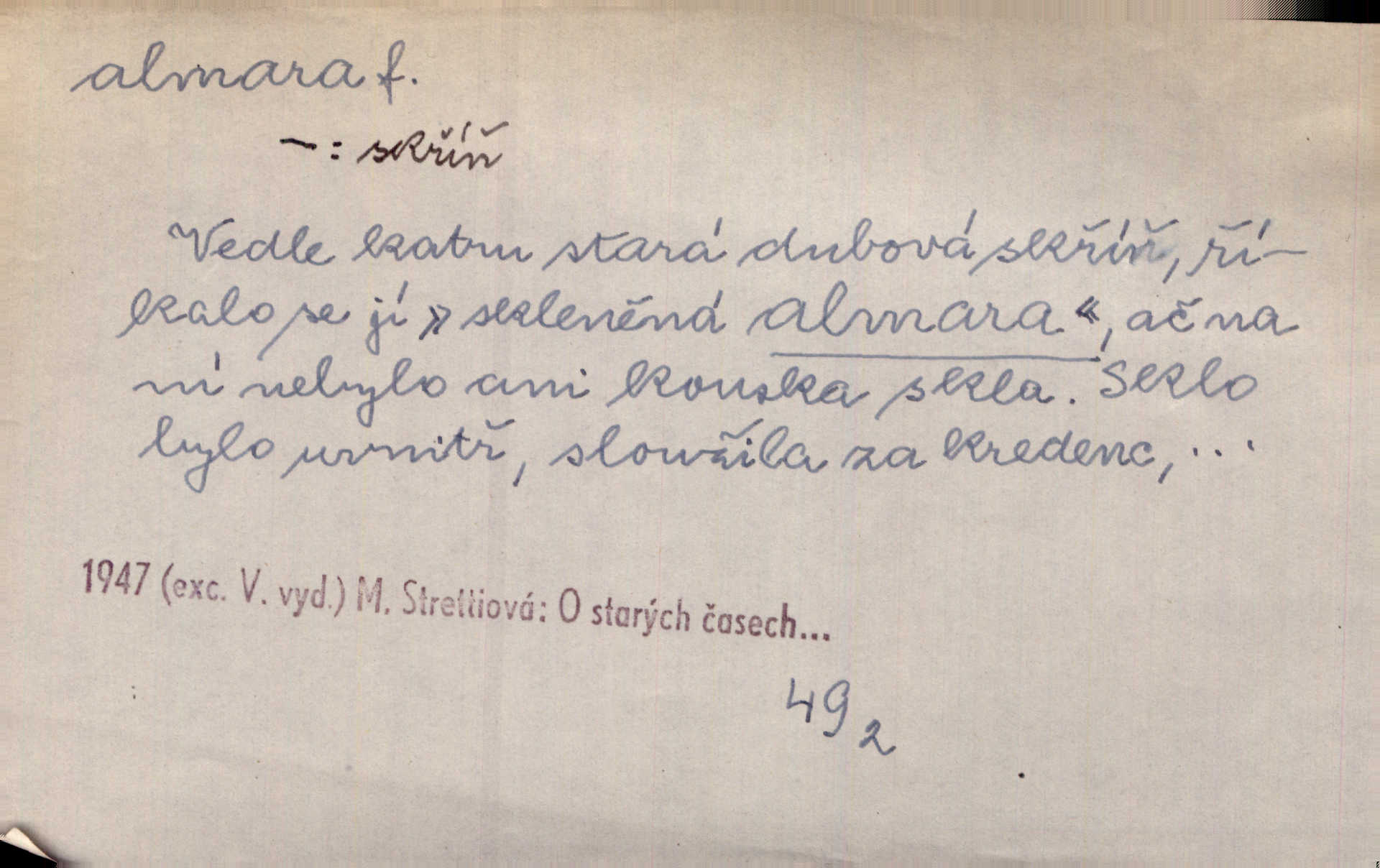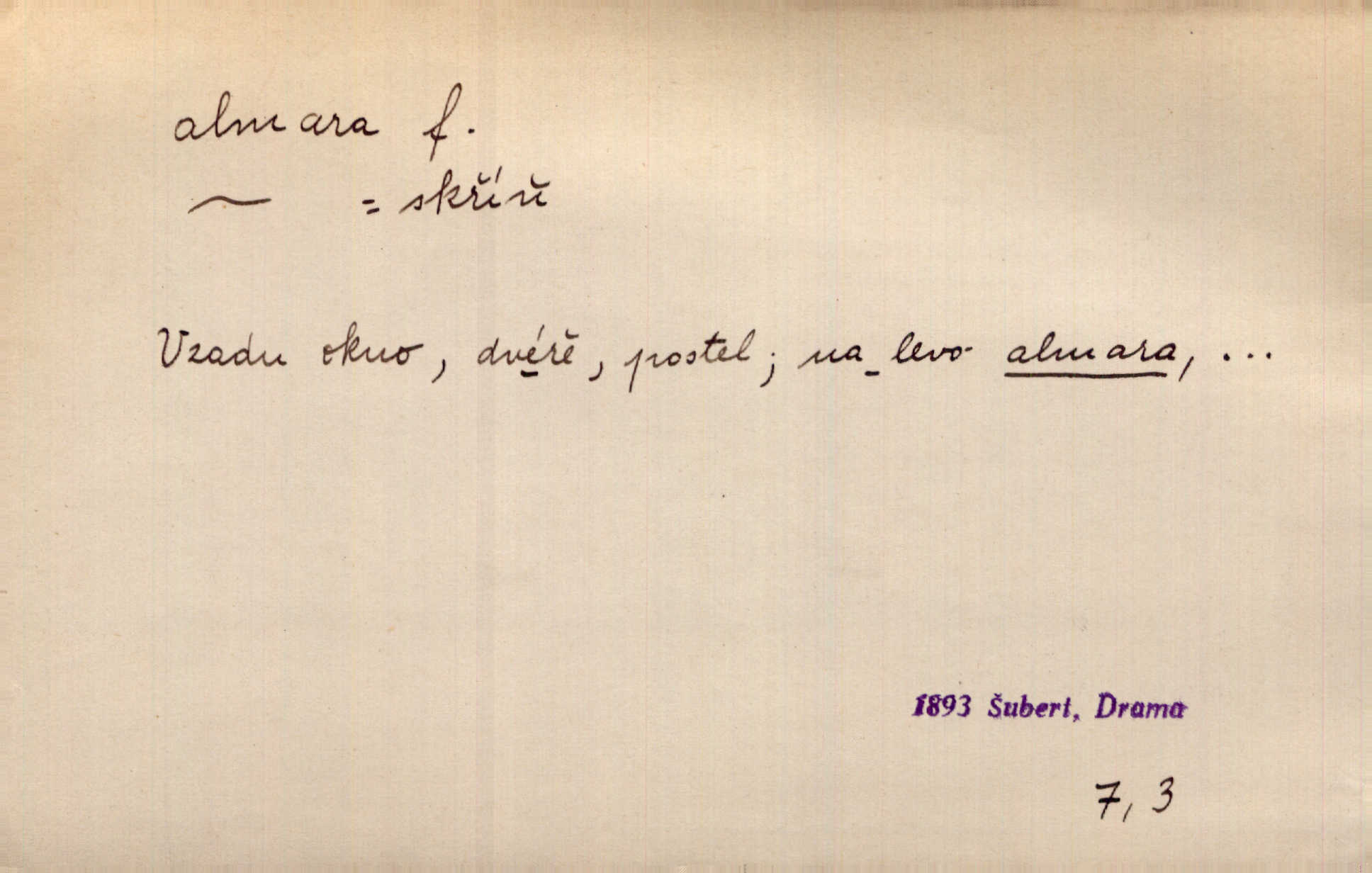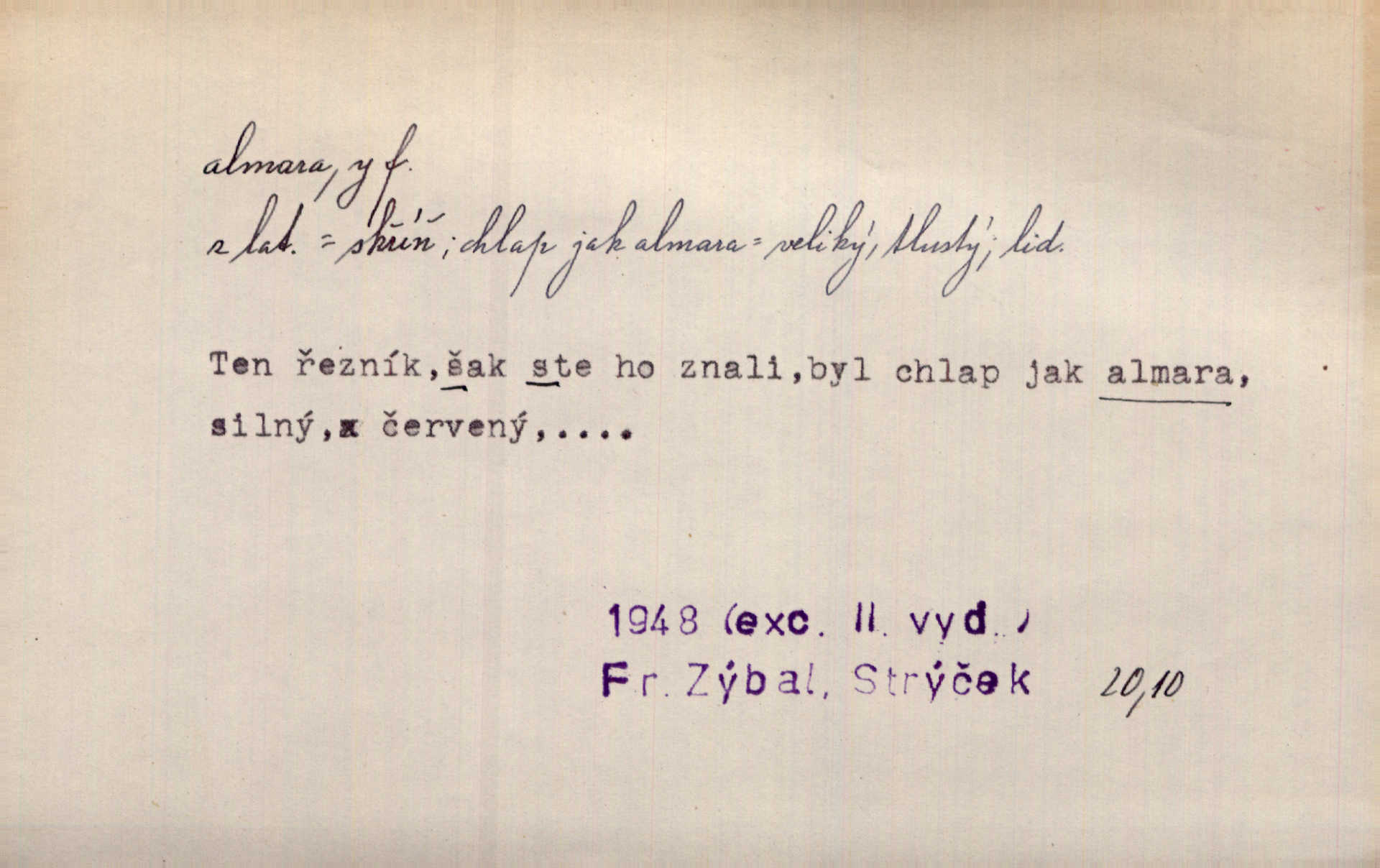 - almara, -y f. lid. skříň. Oblekla na sebe v almaře uschované kanafasové modračky. V. Mrš. Rozevřev almaru vyňal z ní knížku. Jir. Měl v almaře oddělení stále zásobené chlebem. Jir. Přen., hum. o něčem velkém a nemotorném. Říditi rachotící tu almaru [dostavník]‚ k tomu věru zapotřebí nejen síly a zkušenosti. Štol. Ohromná almara, kterou spatřil, byla Bártovcova žena. Klost.