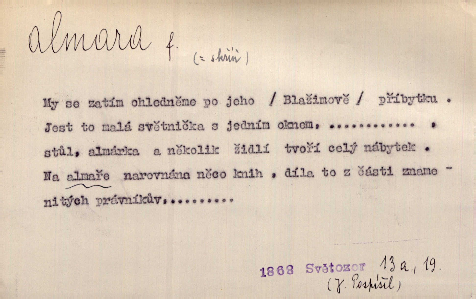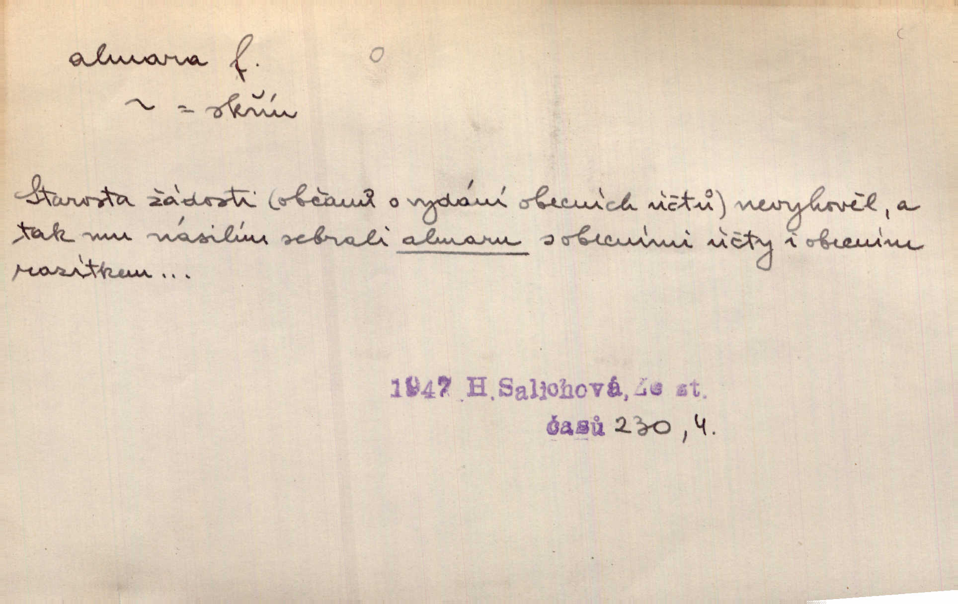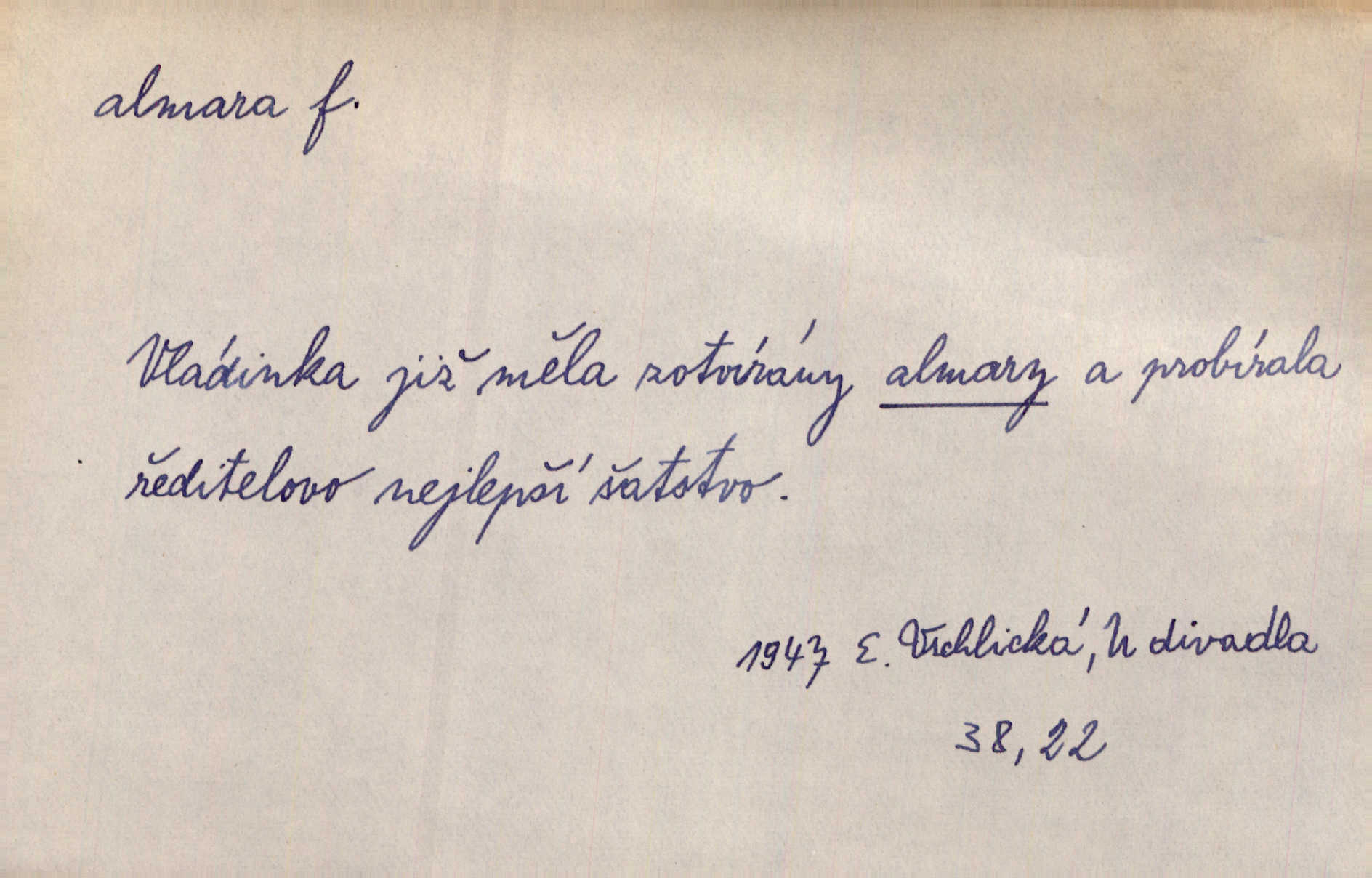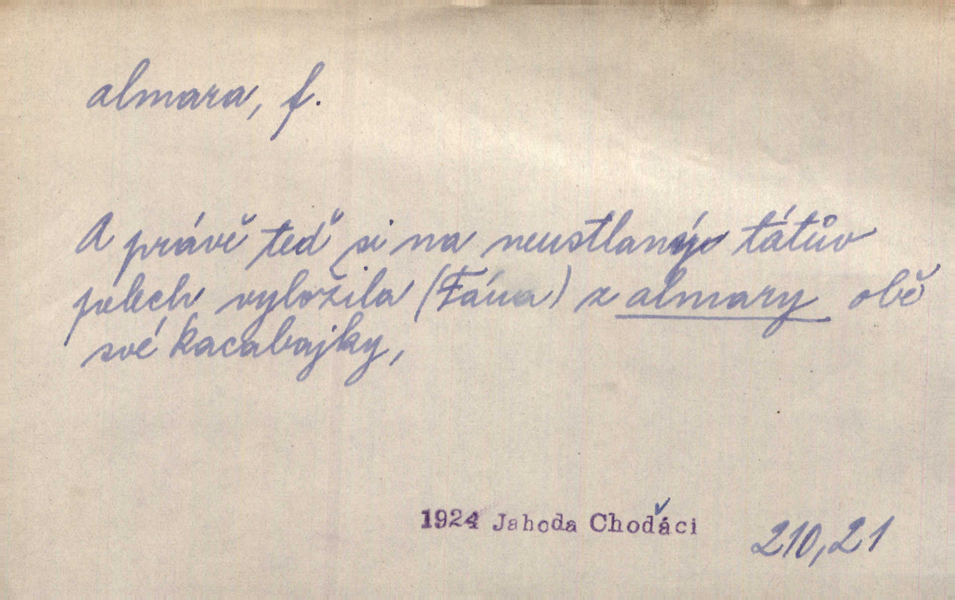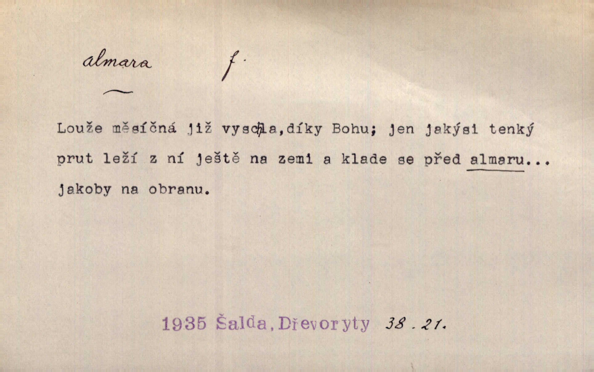 - almara, -y f. lid. skříň. Oblekla na sebe v almaře uschované kanafasové modračky. V. Mrš. Rozevřev almaru vyňal z ní knížku. Jir. Měl v almaře oddělení stále zásobené chlebem. Jir. Přen., hum. o něčem velkém a nemotorném. Říditi rachotící tu almaru [dostavník]‚ k tomu věru zapotřebí nejen síly a zkušenosti. Štol. Ohromná almara, kterou spatřil, byla Bártovcova žena. Klost.