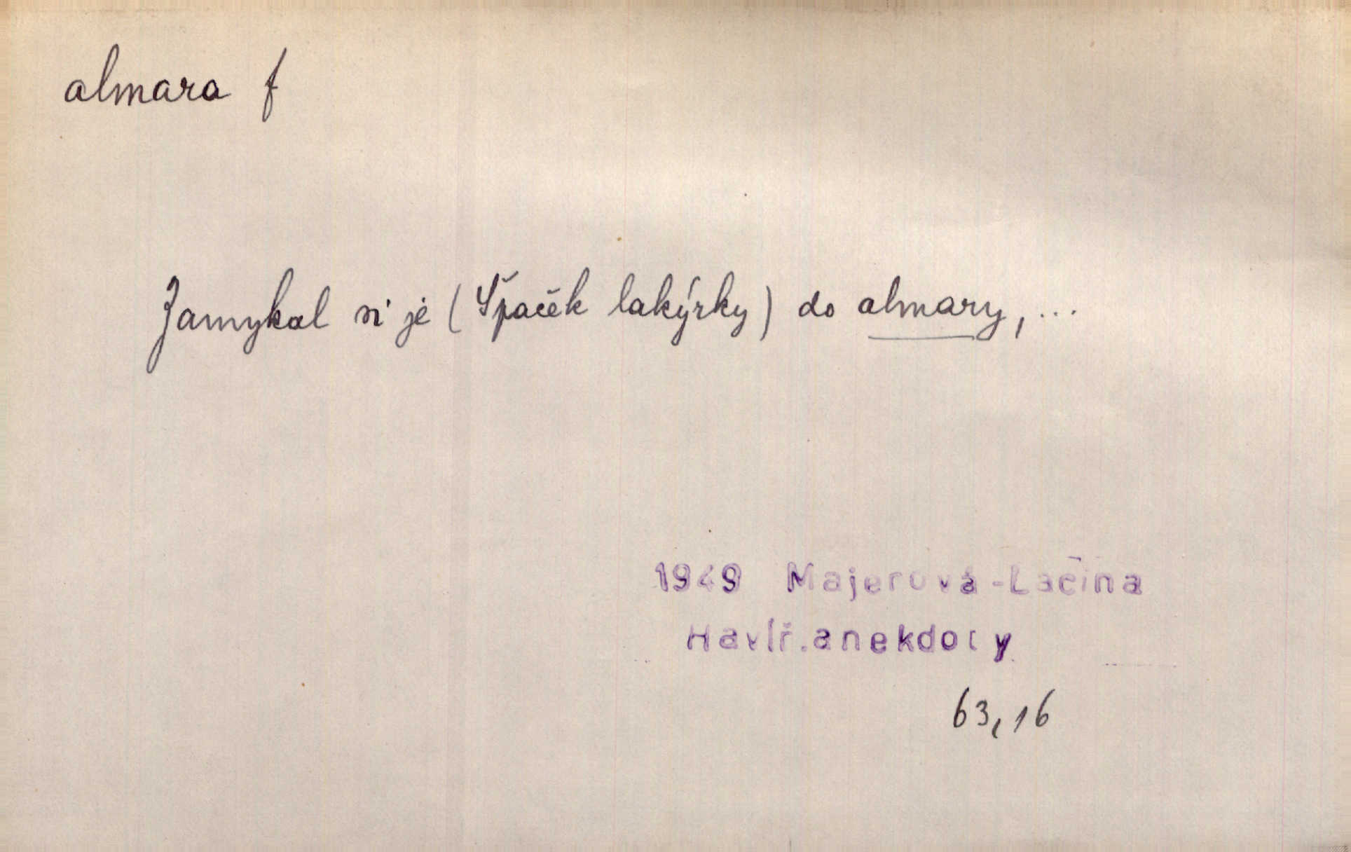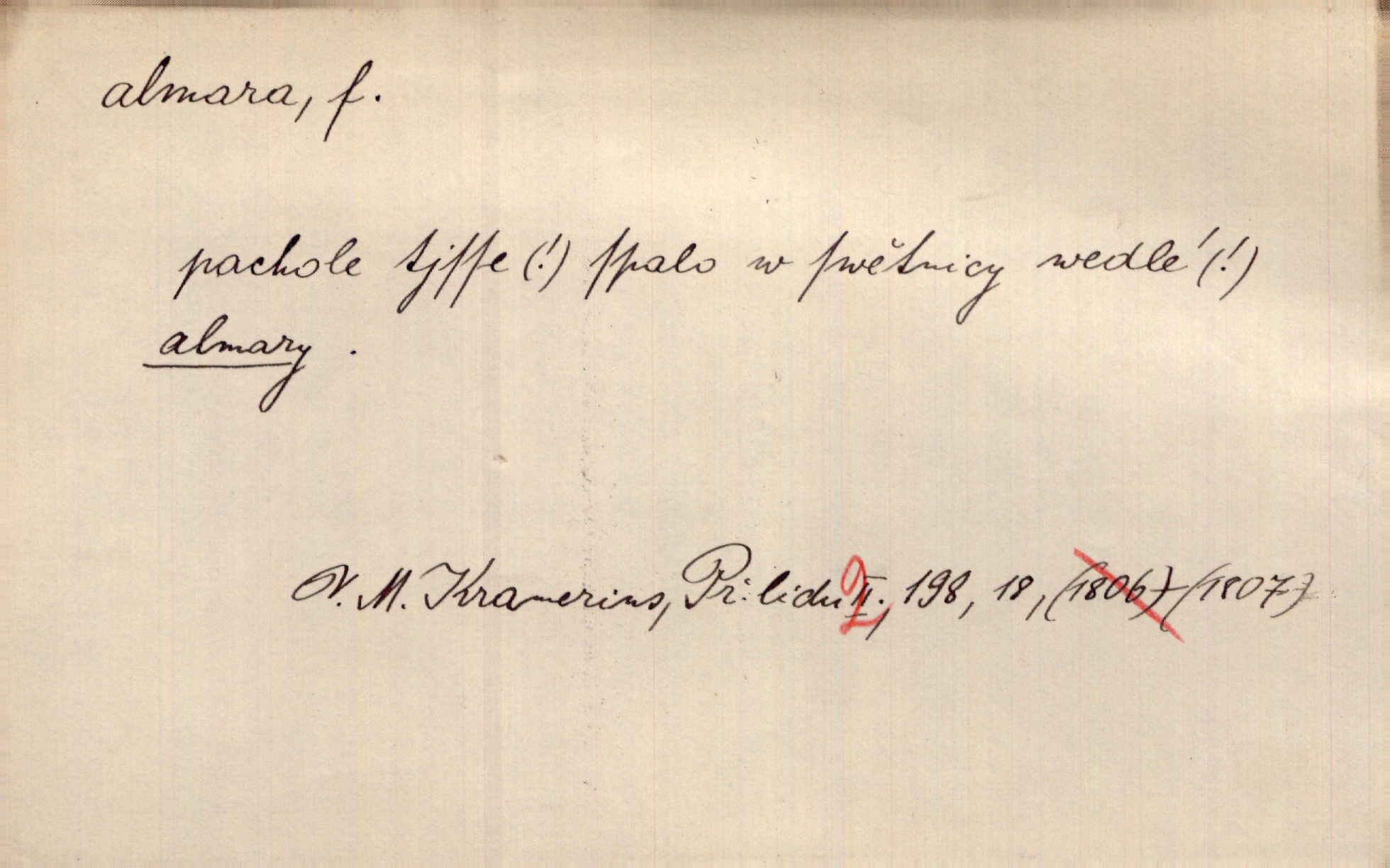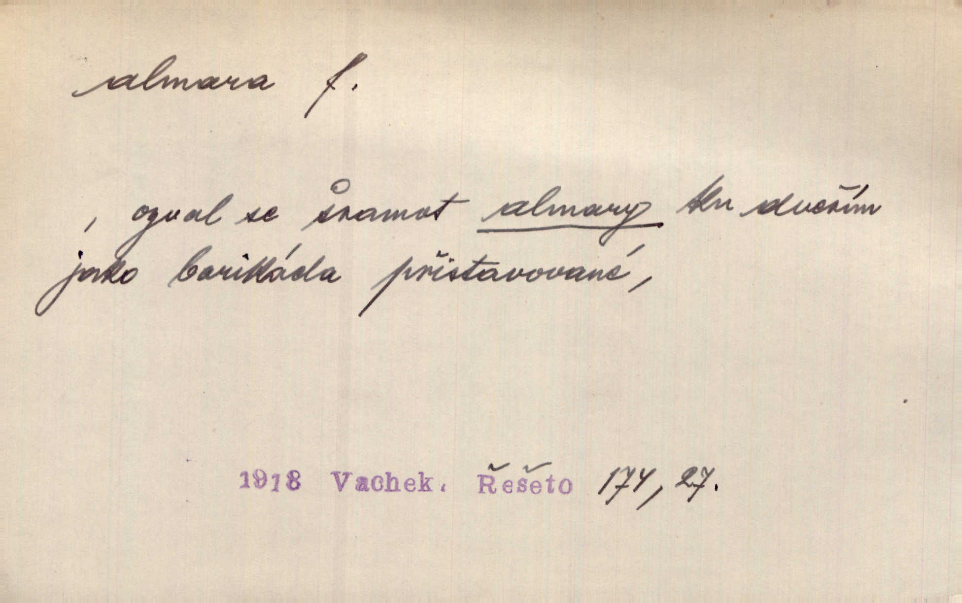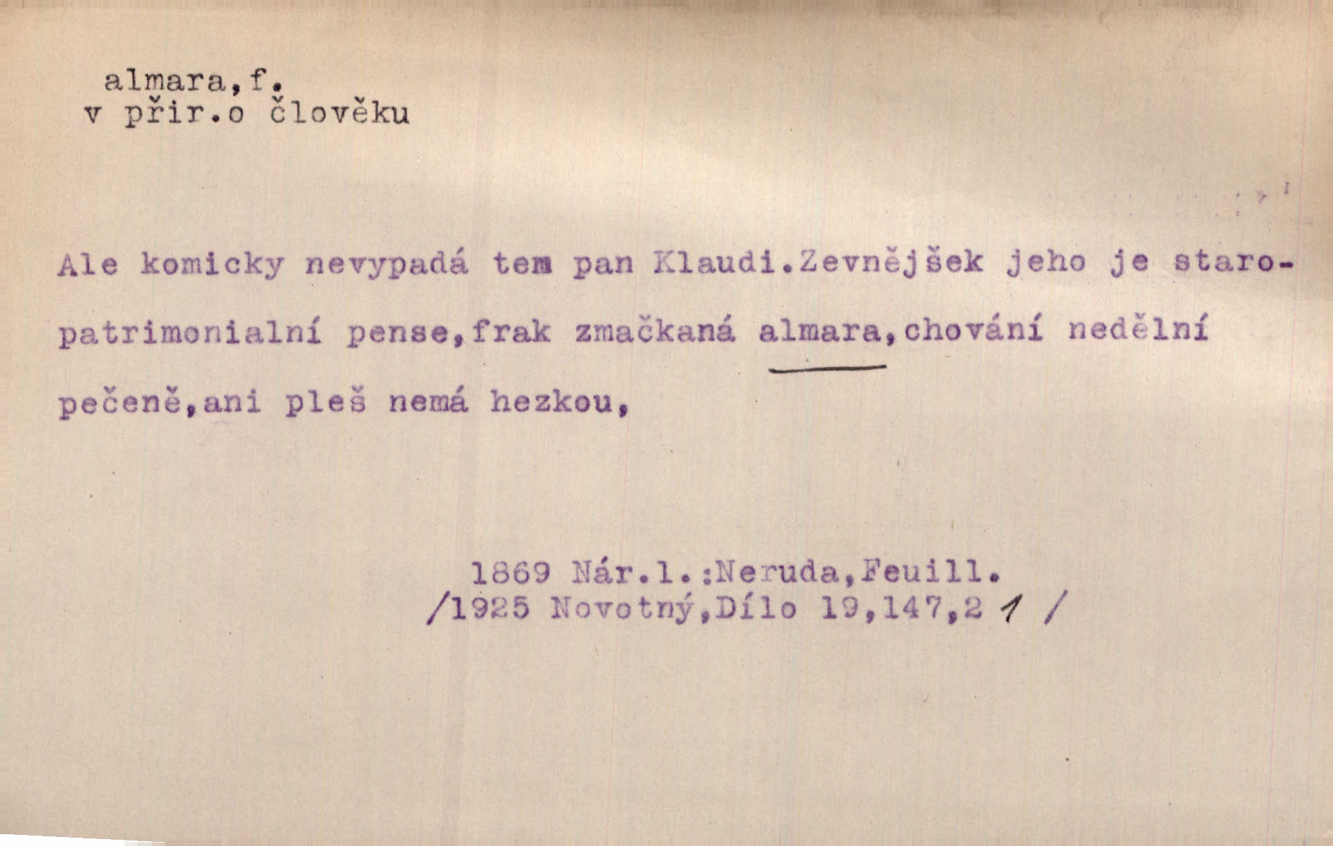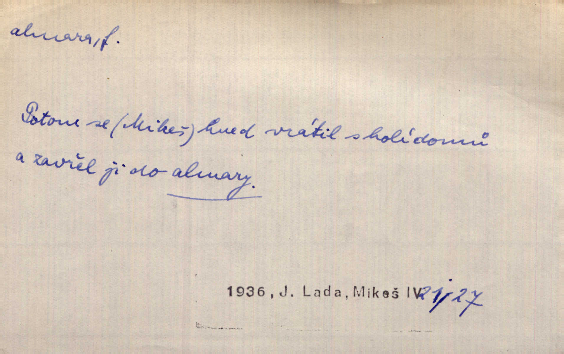 - almara, -y f. lid. skříň. Oblekla na sebe v almaře uschované kanafasové modračky. V. Mrš. Rozevřev almaru vyňal z ní knížku. Jir. Měl v almaře oddělení stále zásobené chlebem. Jir. Přen., hum. o něčem velkém a nemotorném. Říditi rachotící tu almaru [dostavník]‚ k tomu věru zapotřebí nejen síly a zkušenosti. Štol. Ohromná almara, kterou spatřil, byla Bártovcova žena. Klost.