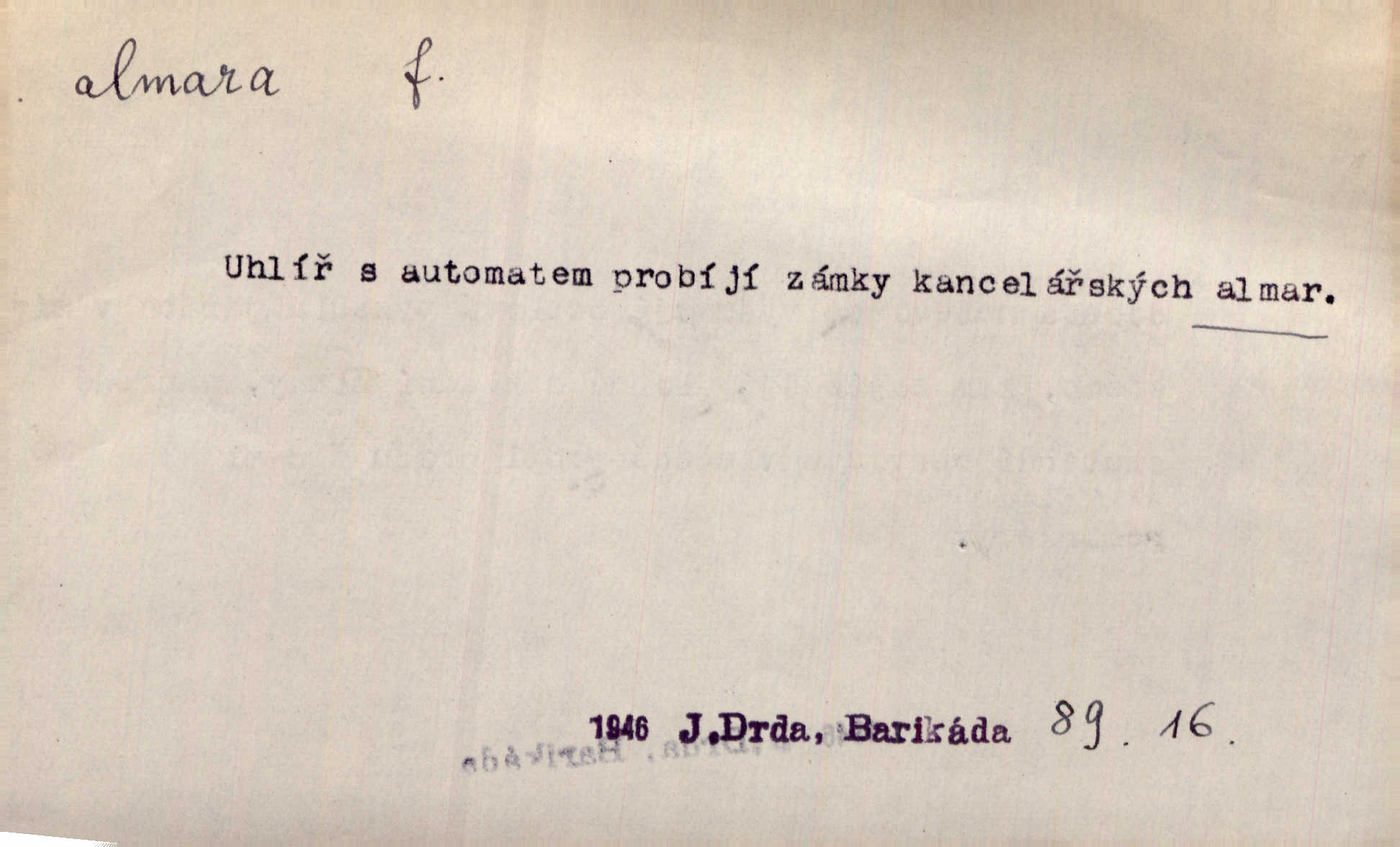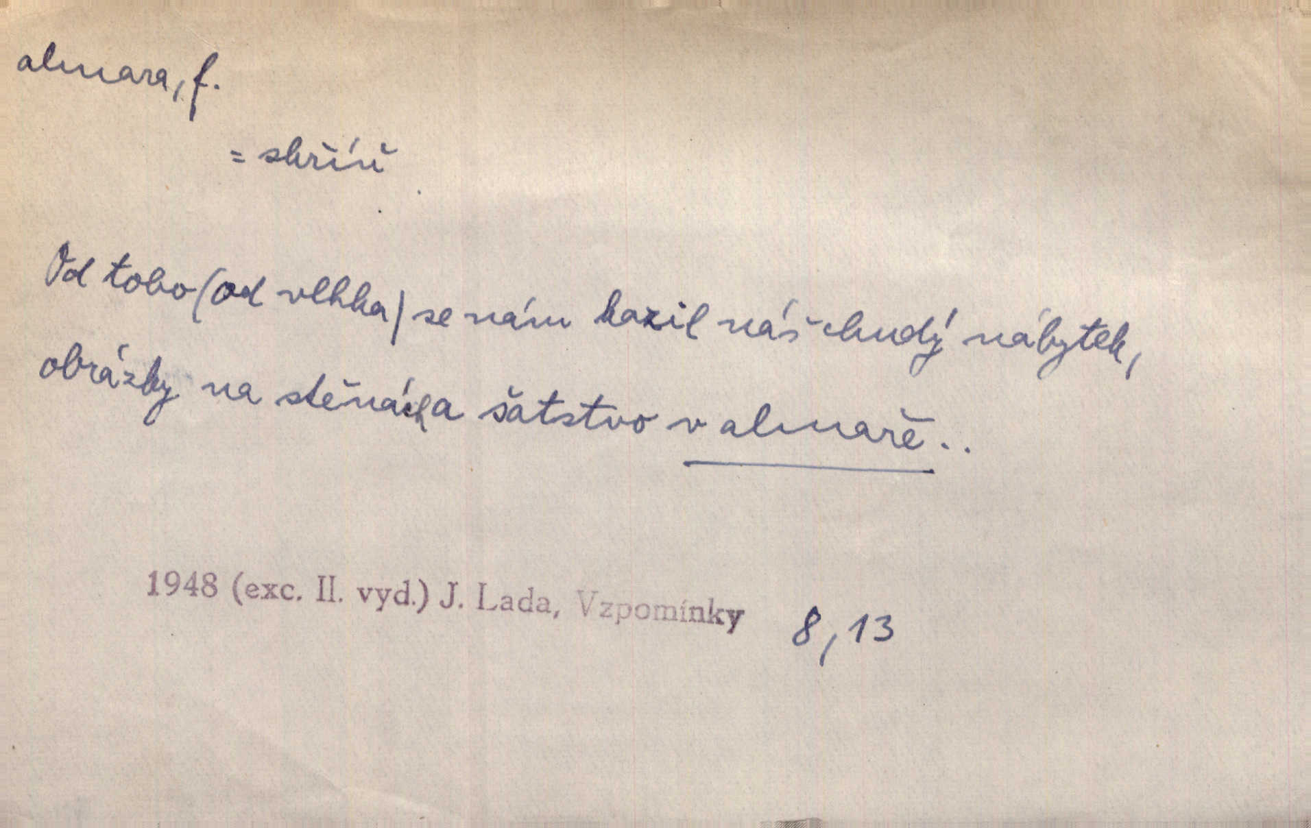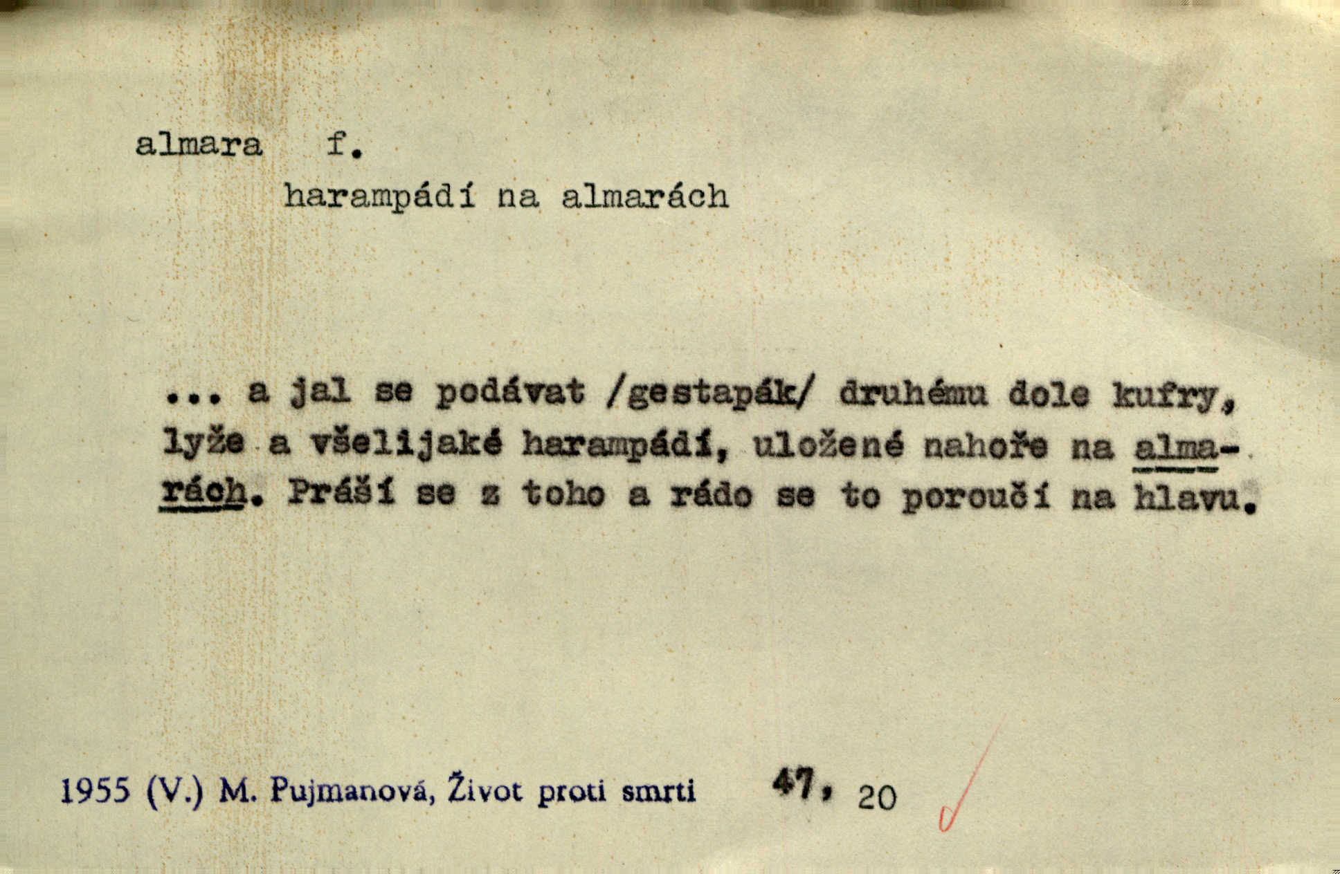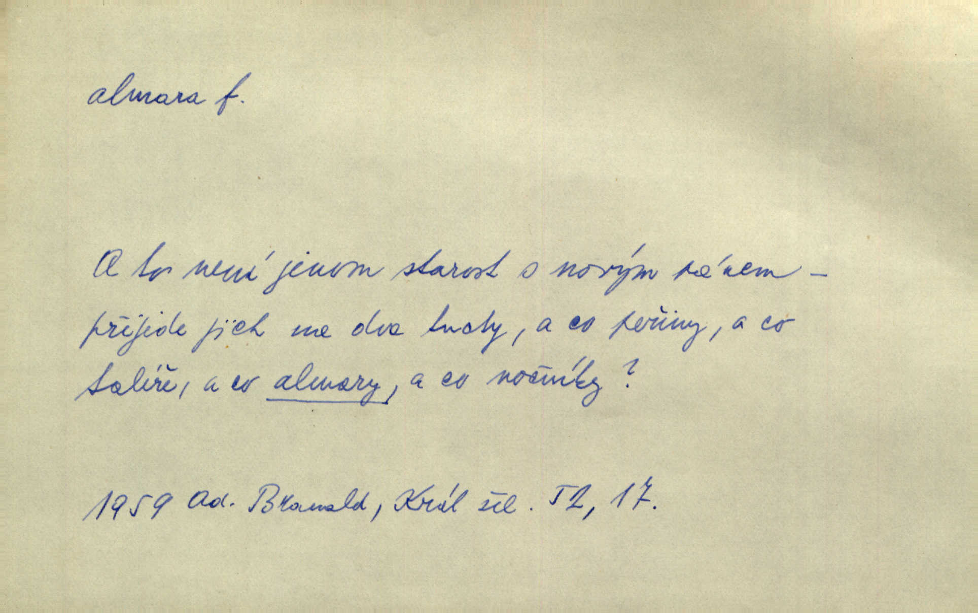 - almara, -y f. lid. skříň. Oblekla na sebe v almaře uschované kanafasové modračky. V. Mrš. Rozevřev almaru vyňal z ní knížku. Jir. Měl v almaře oddělení stále zásobené chlebem. Jir. Přen., hum. o něčem velkém a nemotorném. Říditi rachotící tu almaru [dostavník]‚ k tomu věru zapotřebí nejen síly a zkušenosti. Štol. Ohromná almara, kterou spatřil, byla Bártovcova žena. Klost.