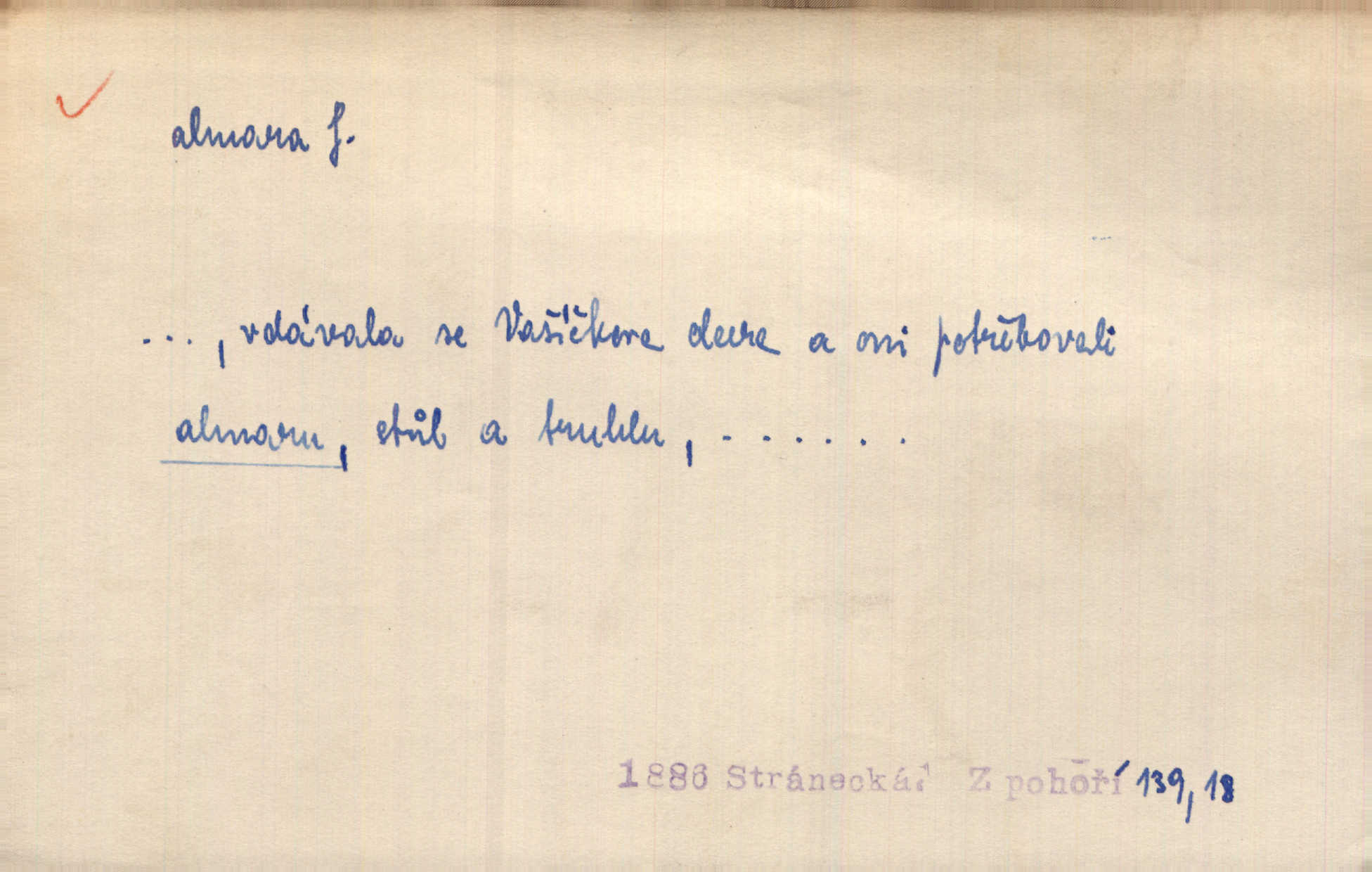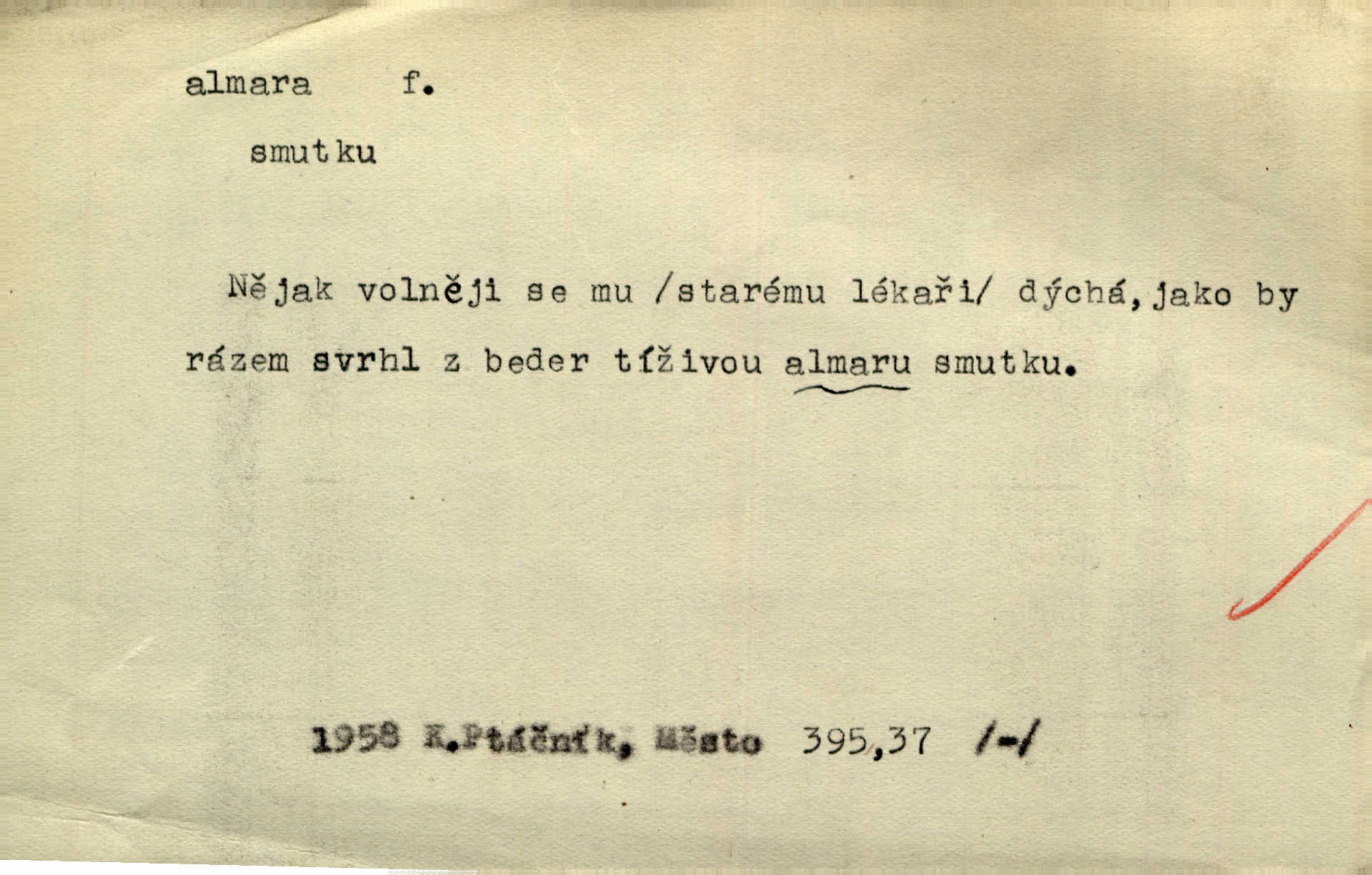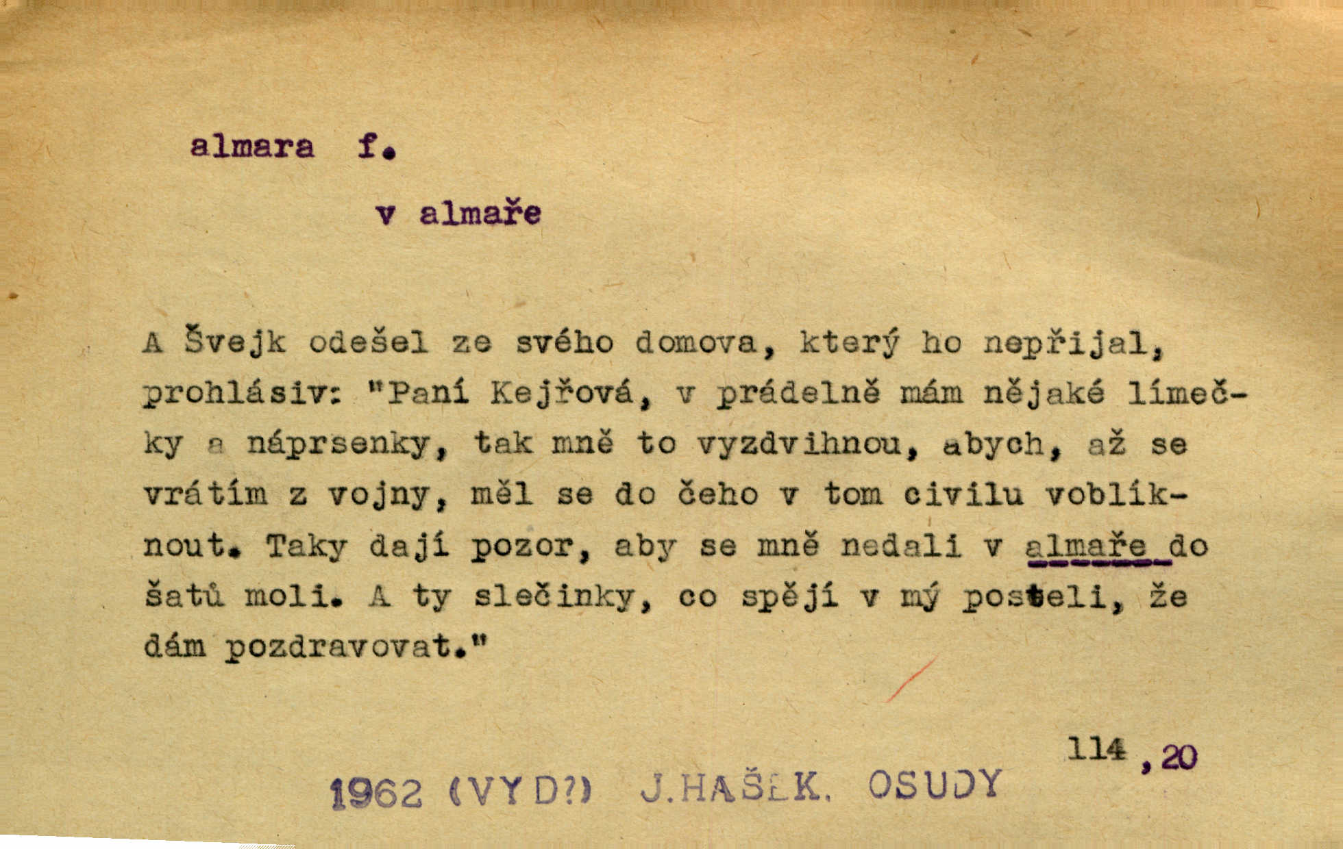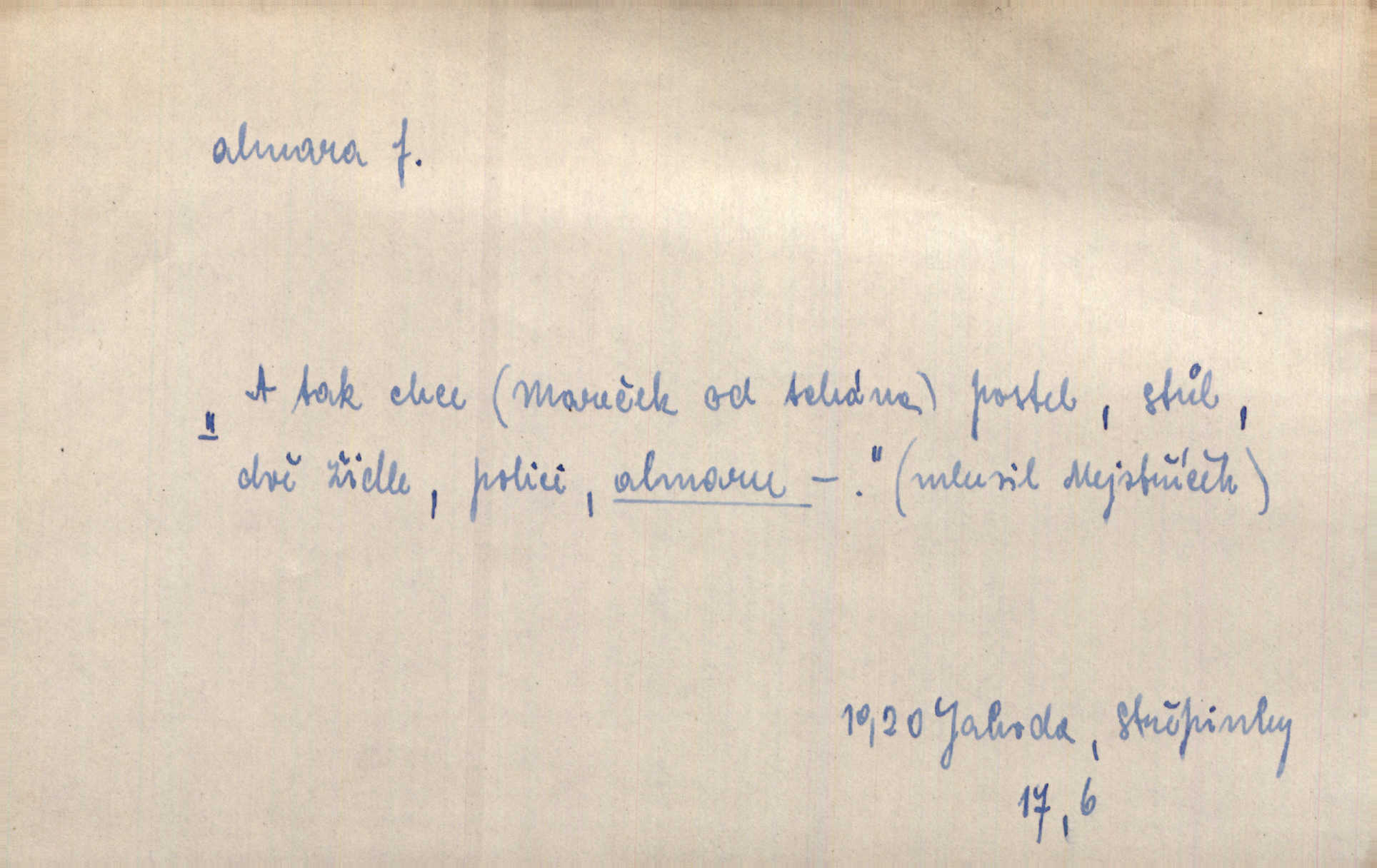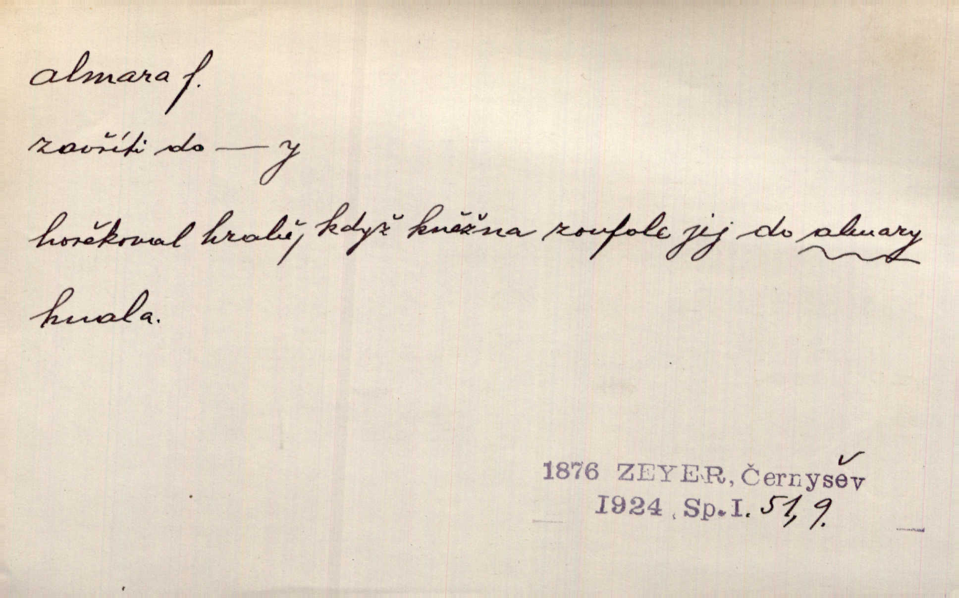 - almara, -y f. lid. skříň. Oblekla na sebe v almaře uschované kanafasové modračky. V. Mrš. Rozevřev almaru vyňal z ní knížku. Jir. Měl v almaře oddělení stále zásobené chlebem. Jir. Přen., hum. o něčem velkém a nemotorném. Říditi rachotící tu almaru [dostavník]‚ k tomu věru zapotřebí nejen síly a zkušenosti. Štol. Ohromná almara, kterou spatřil, byla Bártovcova žena. Klost.