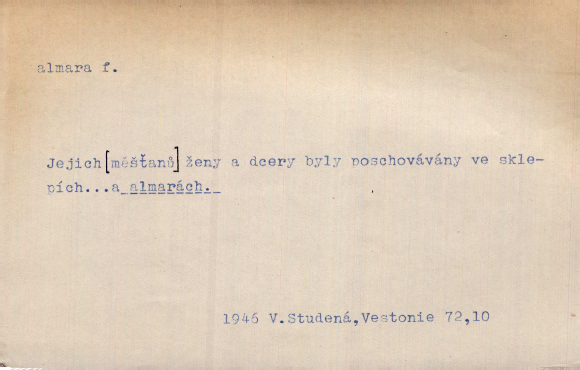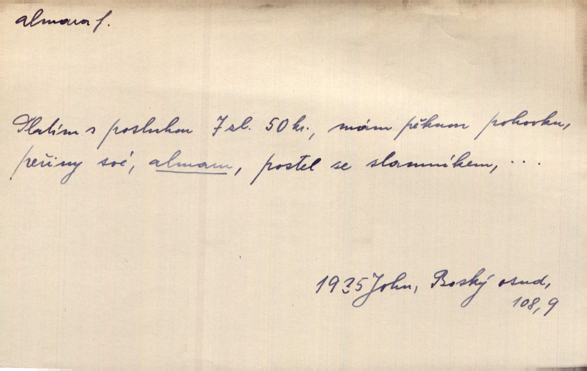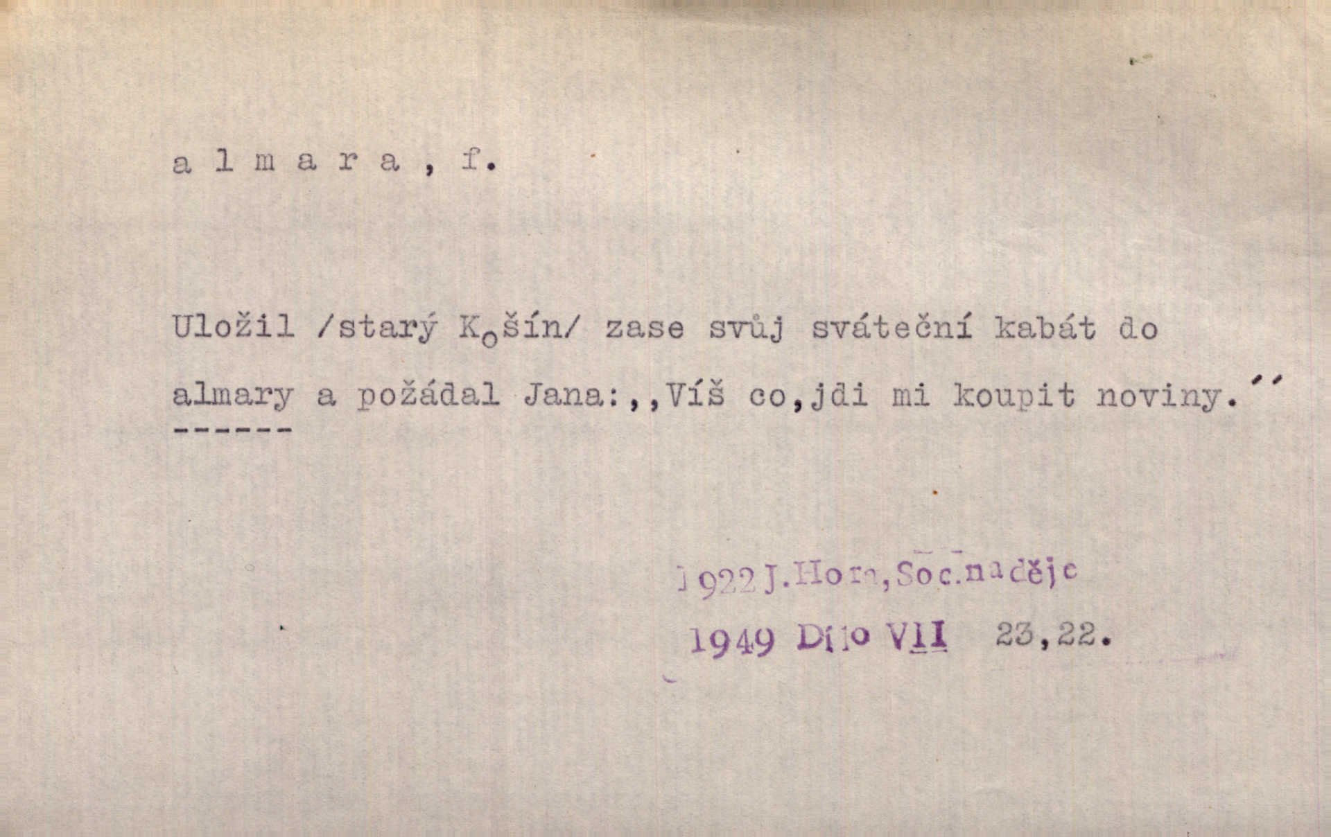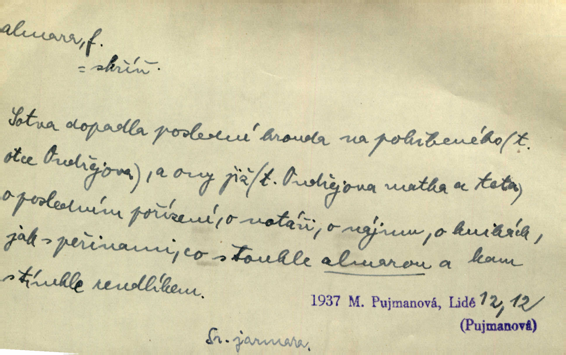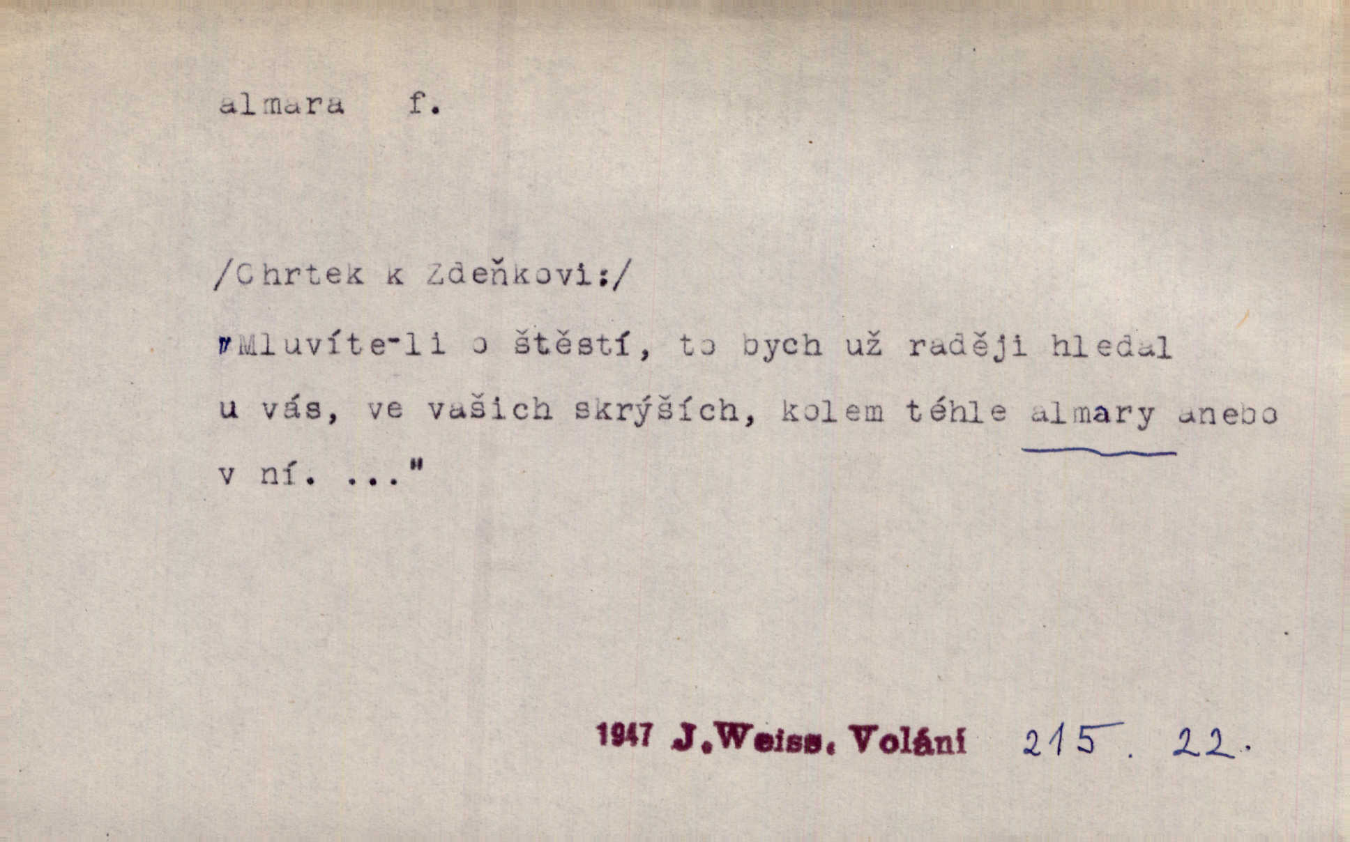 - almara, -y f. lid. skříň. Oblekla na sebe v almaře uschované kanafasové modračky. V. Mrš. Rozevřev almaru vyňal z ní knížku. Jir. Měl v almaře oddělení stále zásobené chlebem. Jir. Přen., hum. o něčem velkém a nemotorném. Říditi rachotící tu almaru [dostavník]‚ k tomu věru zapotřebí nejen síly a zkušenosti. Štol. Ohromná almara, kterou spatřil, byla Bártovcova žena. Klost.
