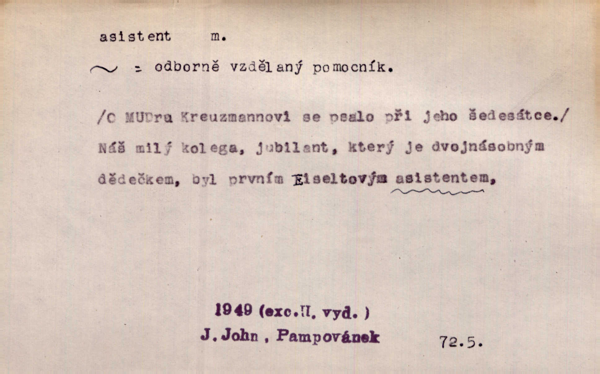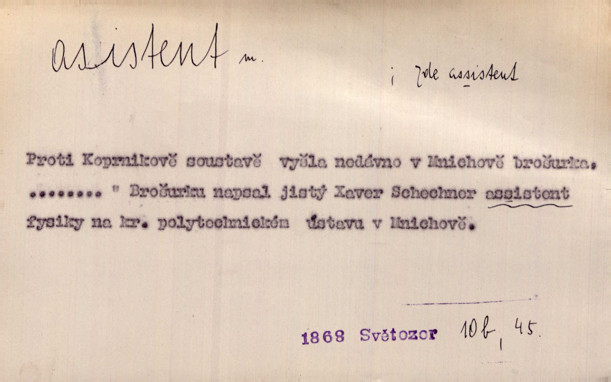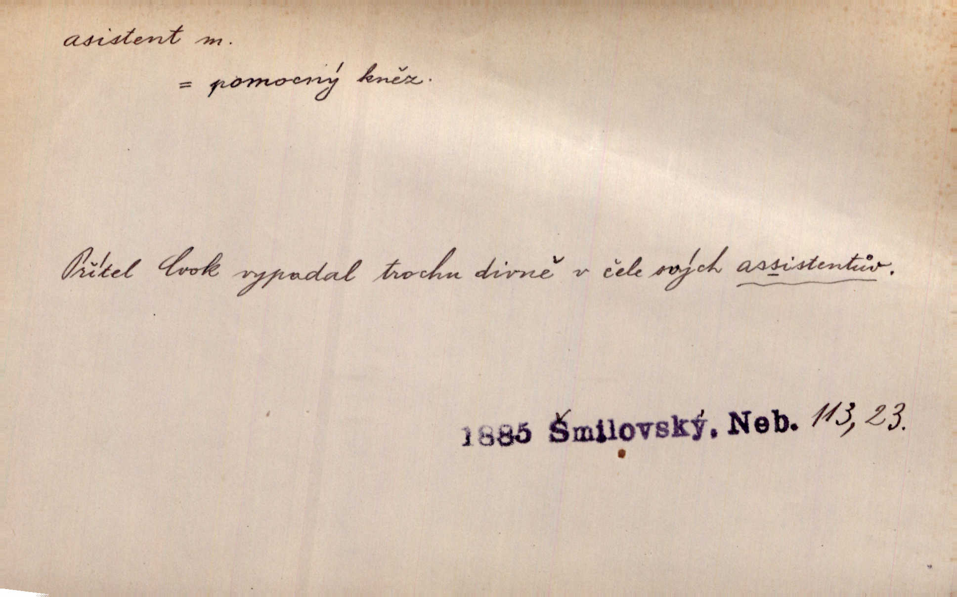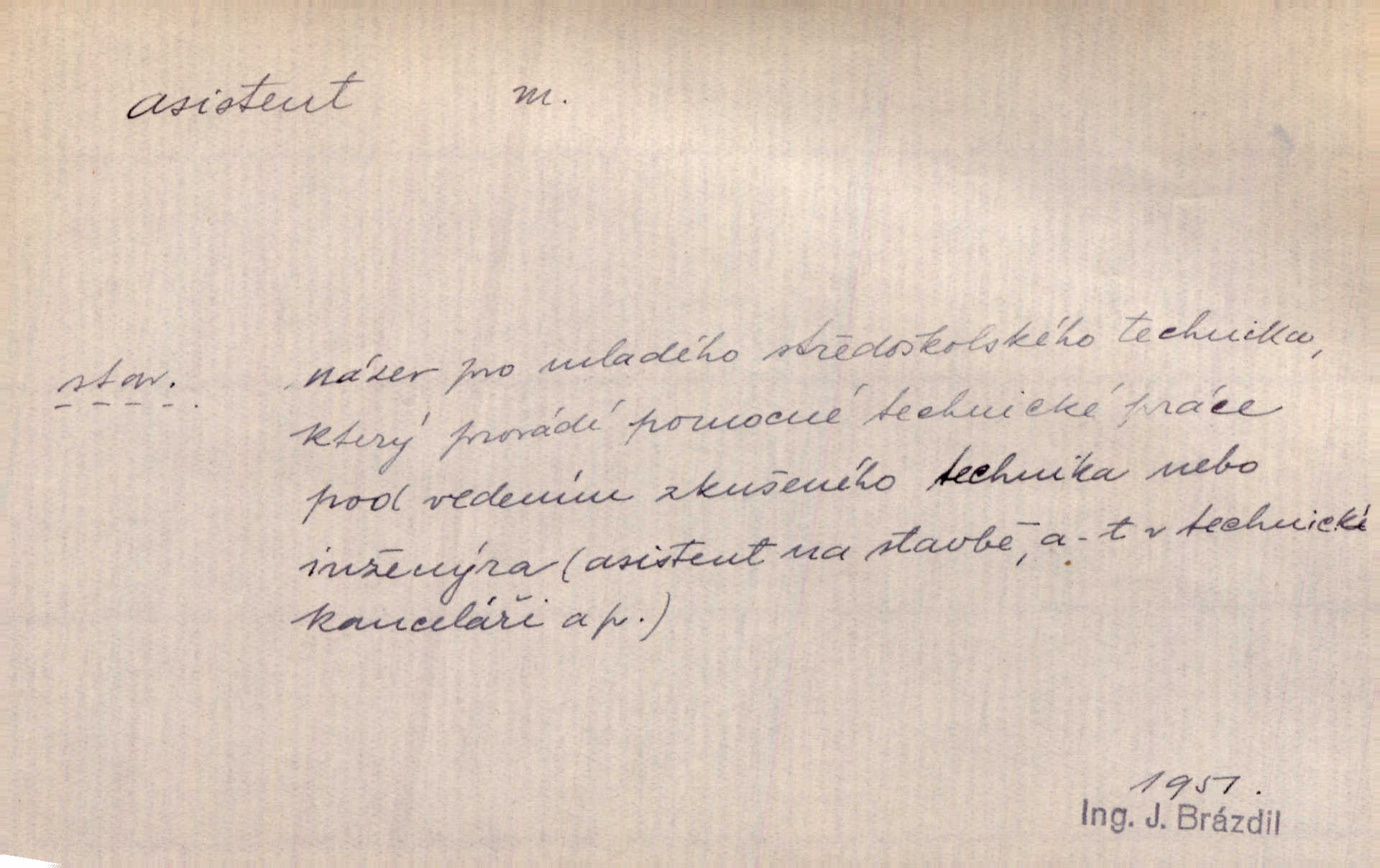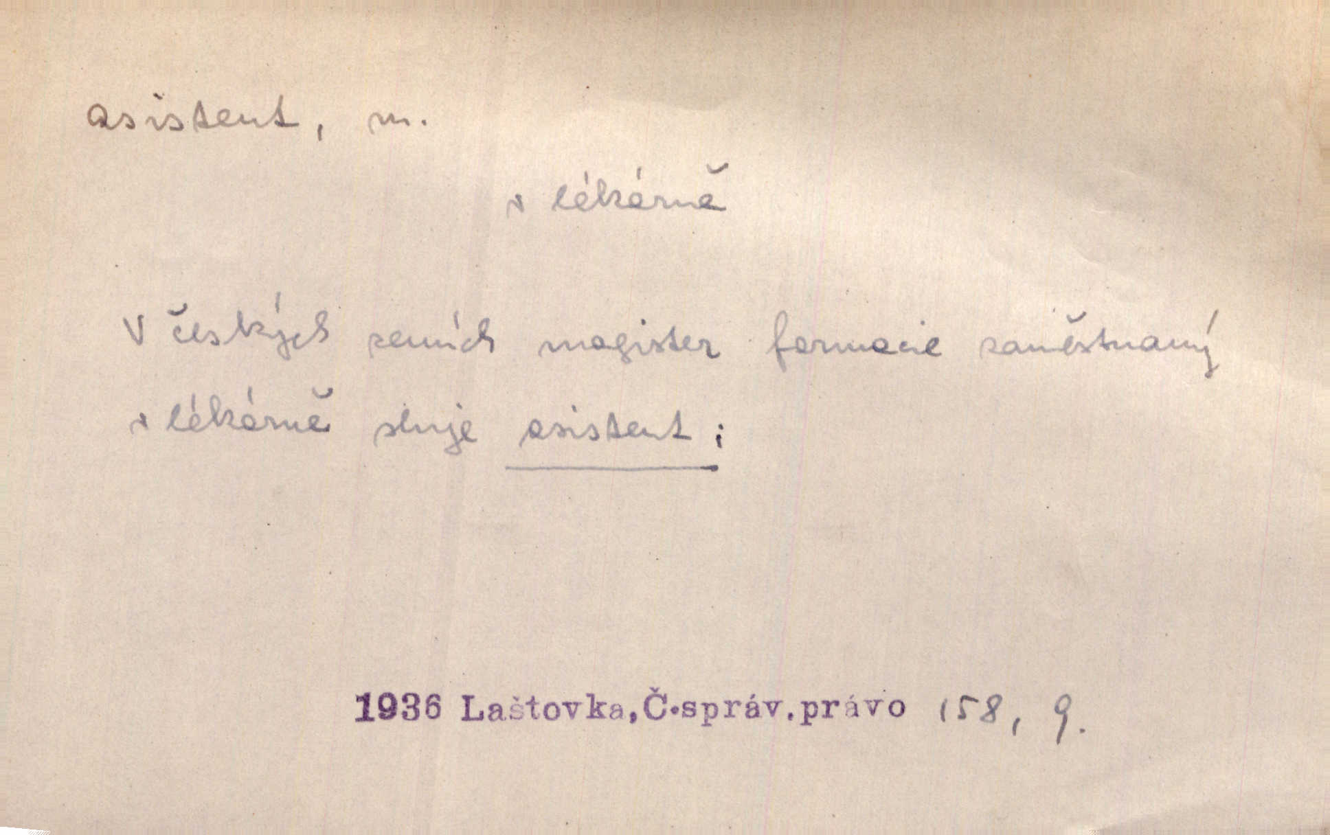 - asistent, -a m. kdo při nějakém výkonu přisluhuje, pomáhá; titul nižších úředníků; pomocná síla na školách a zvl. při ústavech vědeckých. Asistent stavitelský, lesní, soudní, poštovní; asistent kreslení, tělocviku (na střed. škole); asistent knihovny, musea, kliniky, semináře, laboratoře (na vysoké škole).