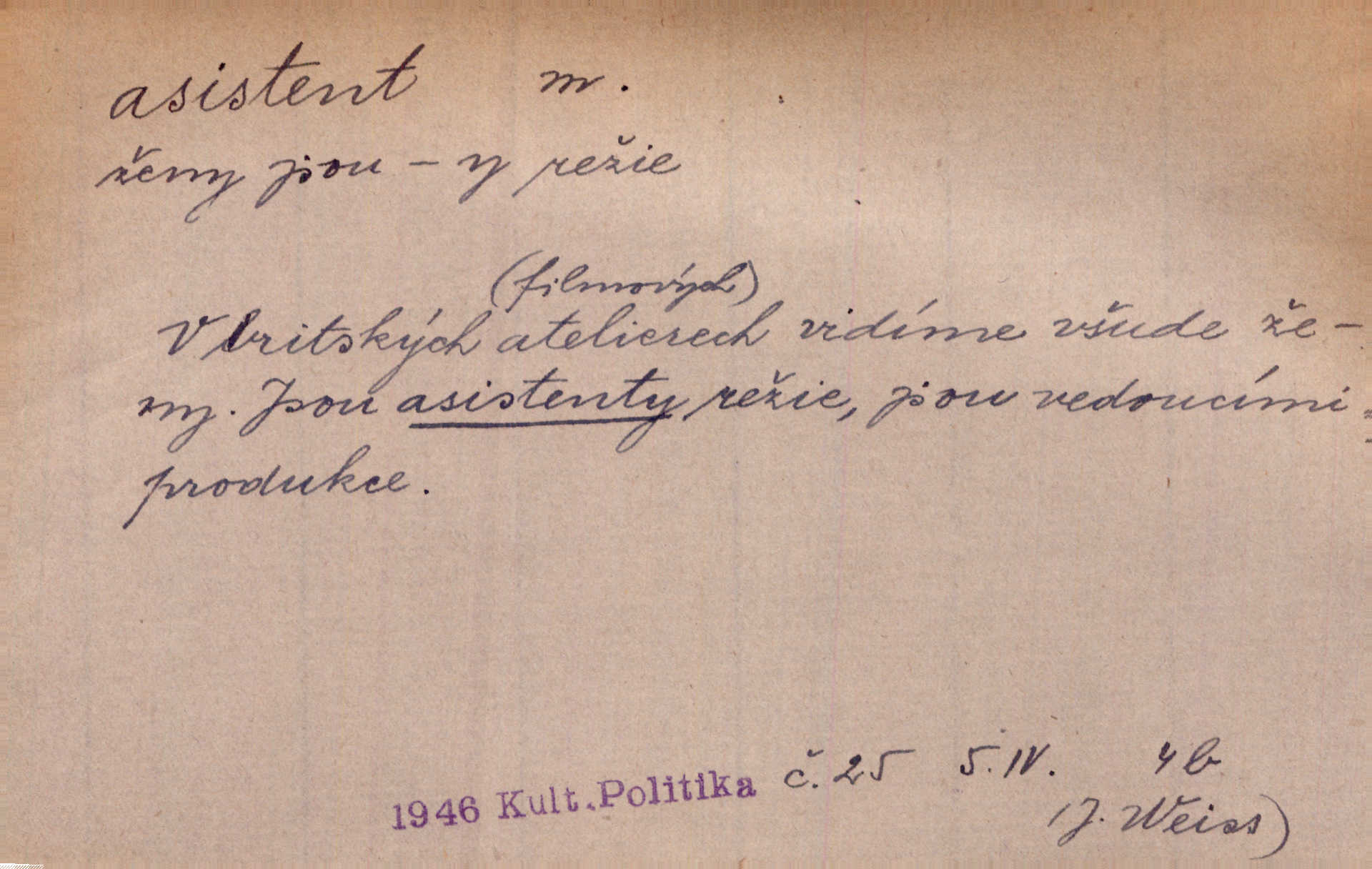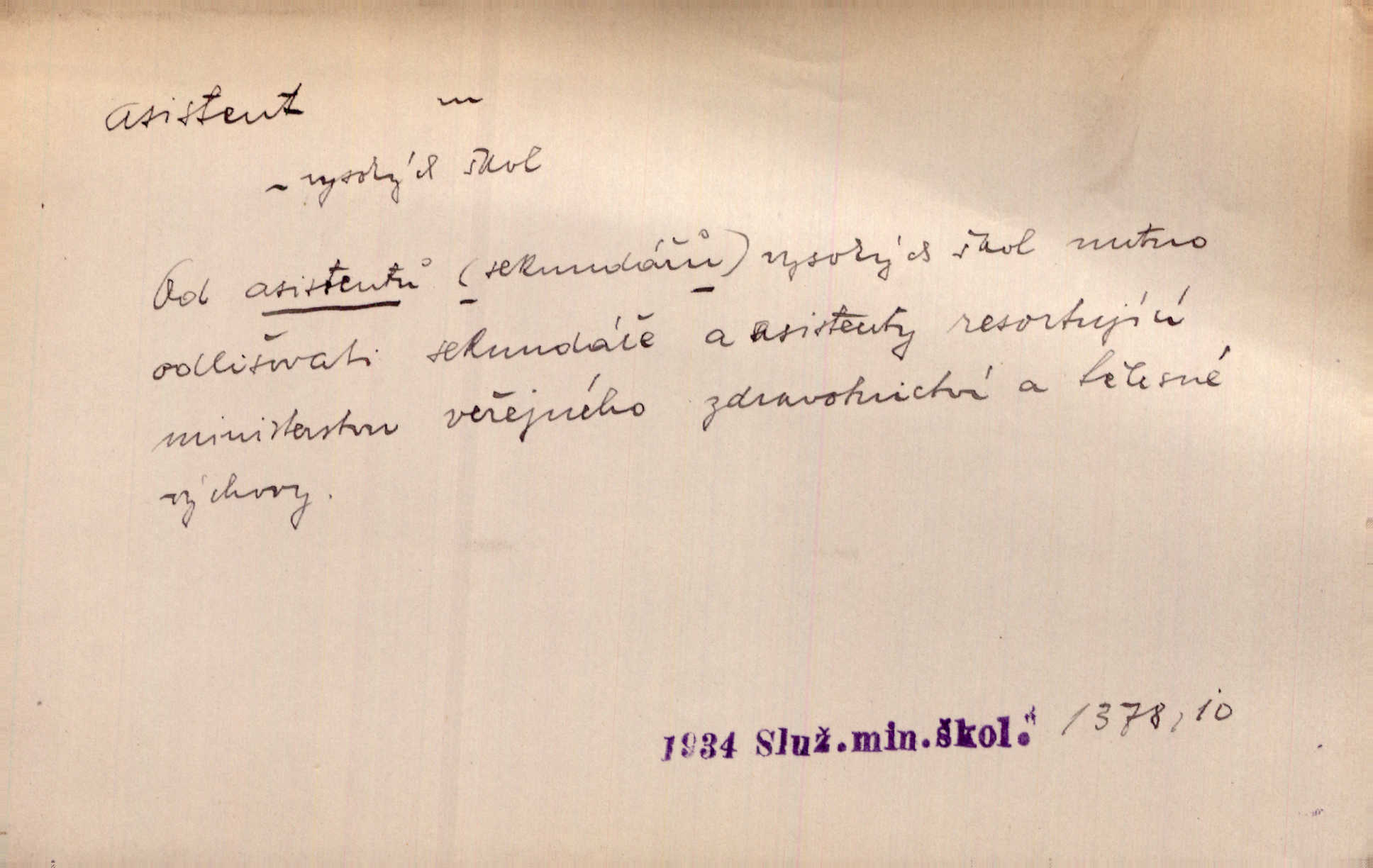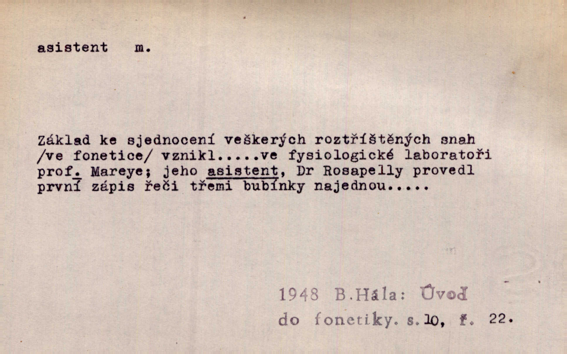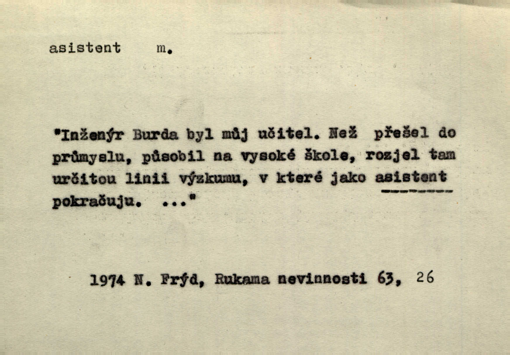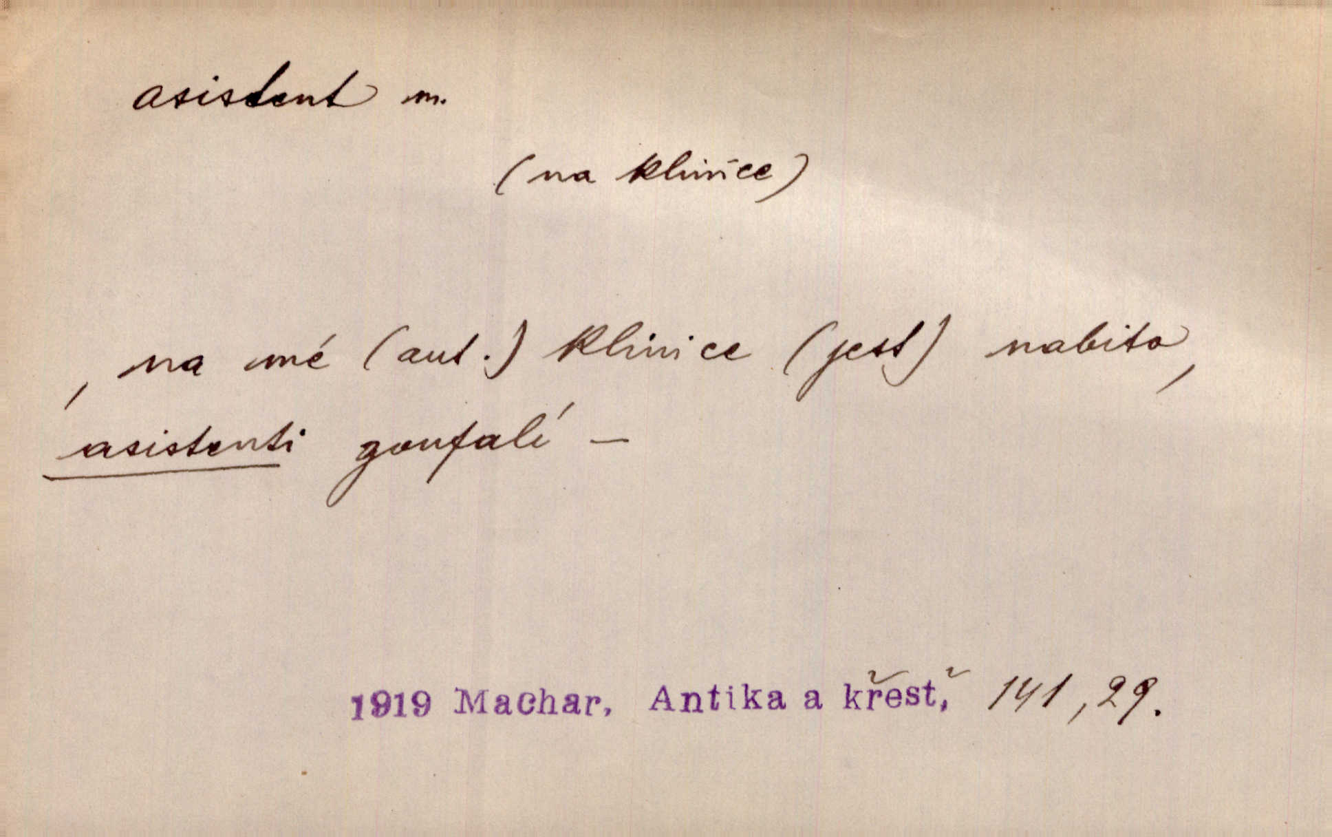 - asistent, -a m. kdo při nějakém výkonu přisluhuje, pomáhá; titul nižších úředníků; pomocná síla na školách a zvl. při ústavech vědeckých. Asistent stavitelský, lesní, soudní, poštovní; asistent kreslení, tělocviku (na střed. škole); asistent knihovny, musea, kliniky, semináře, laboratoře (na vysoké škole).