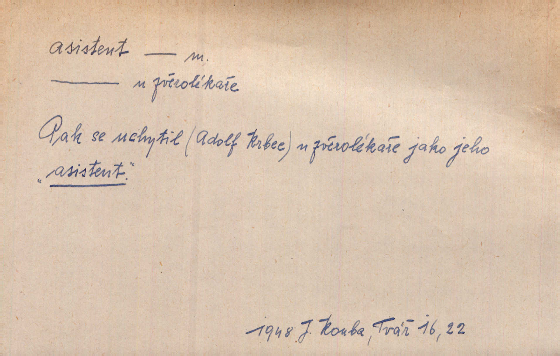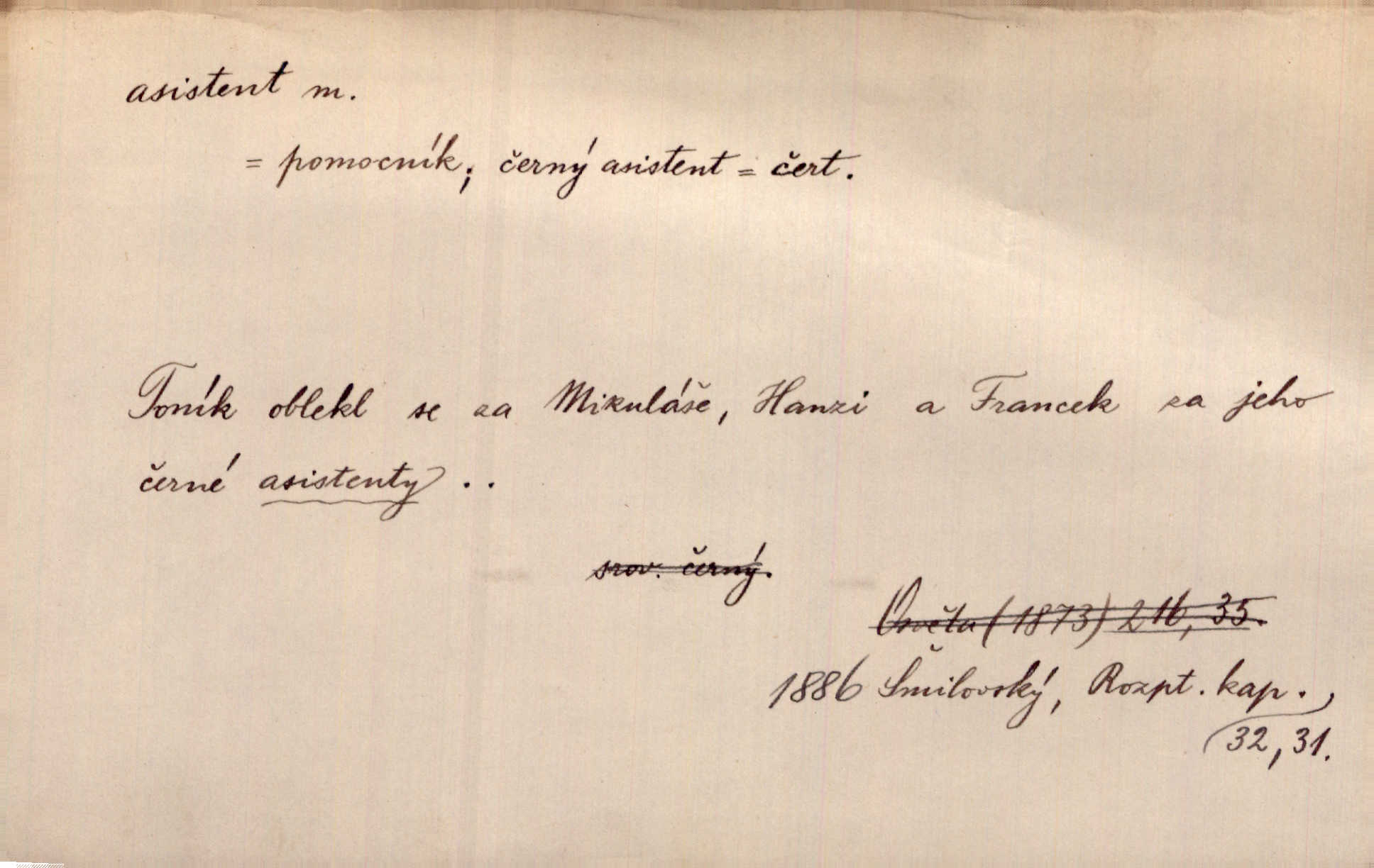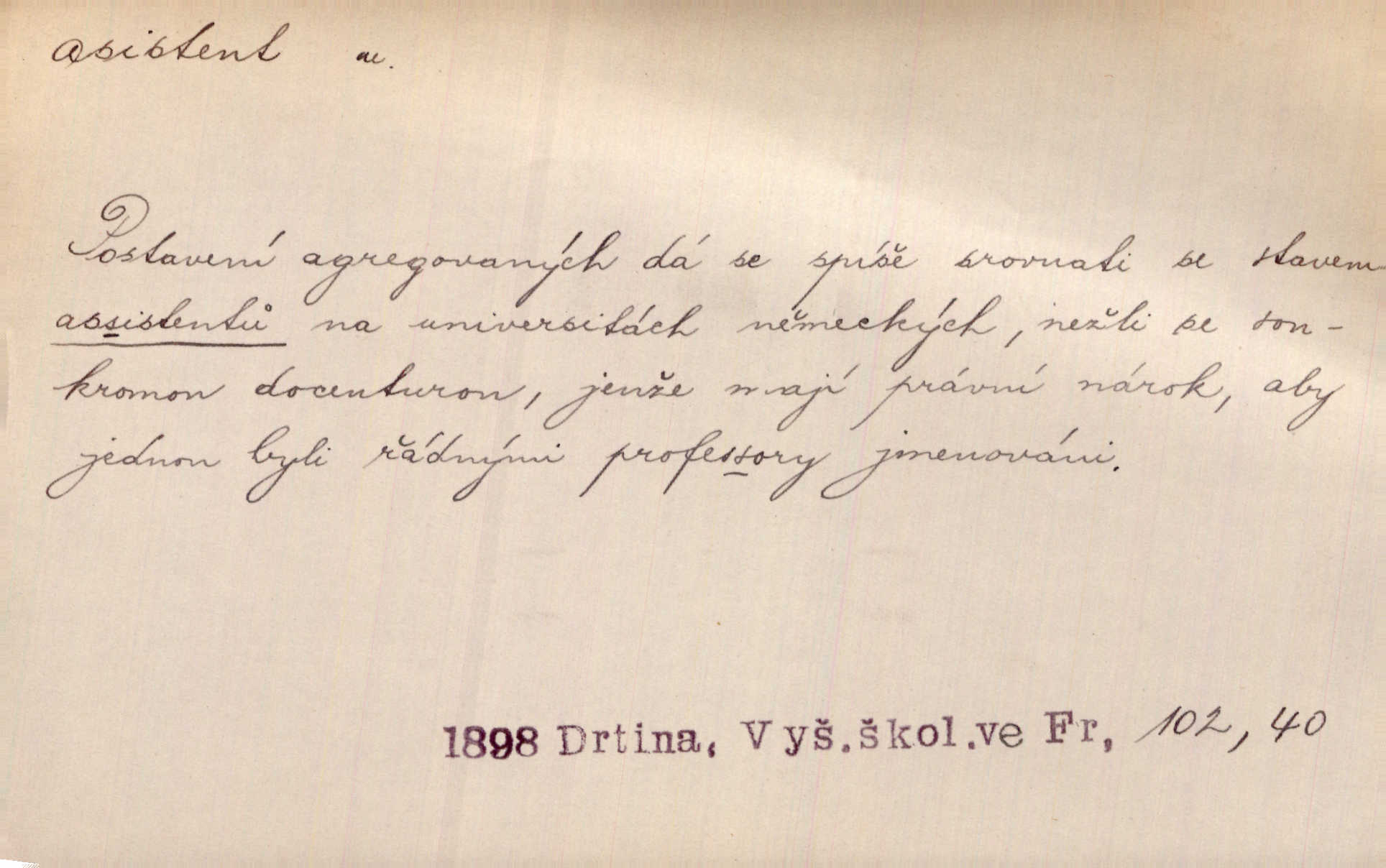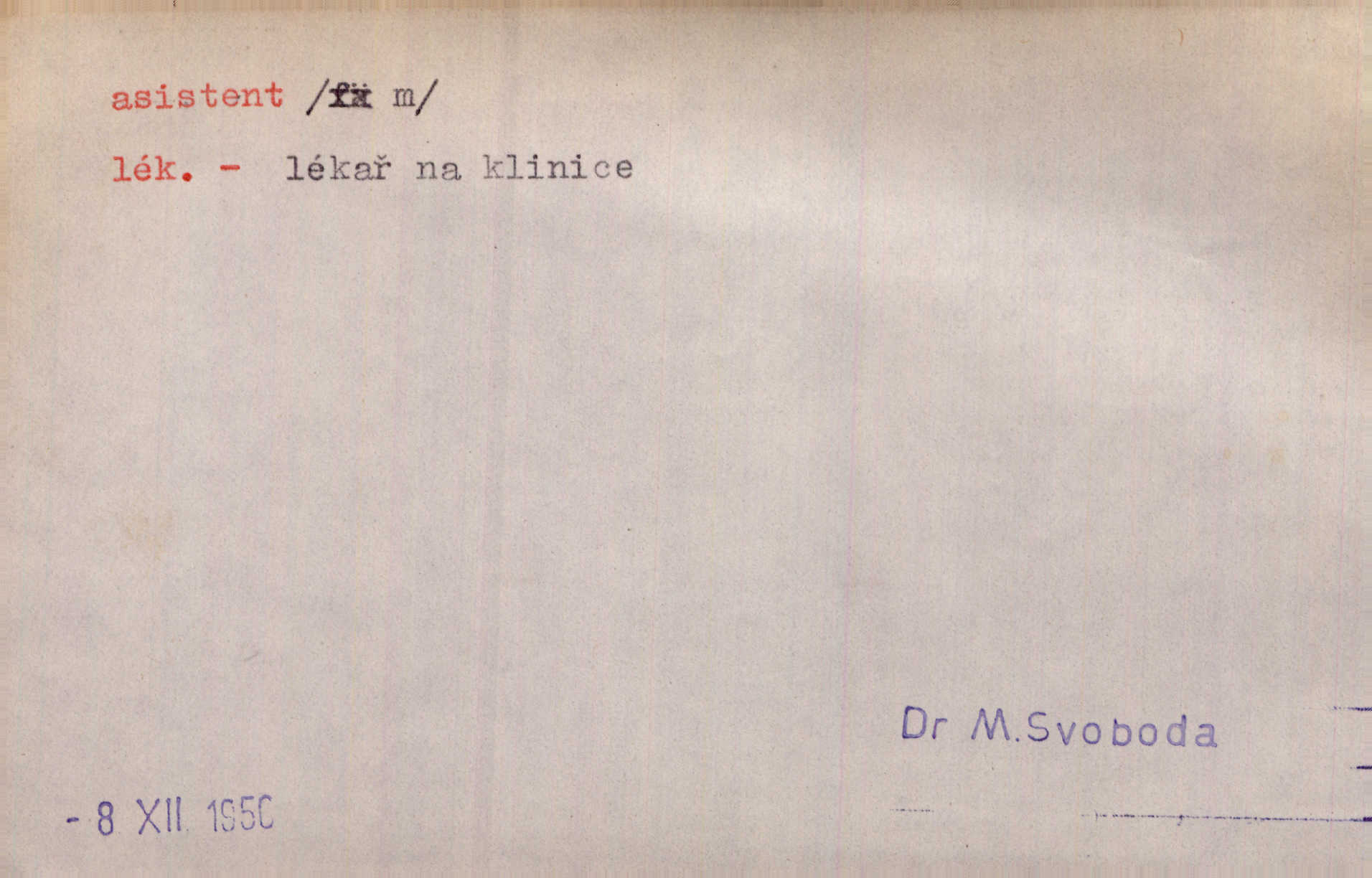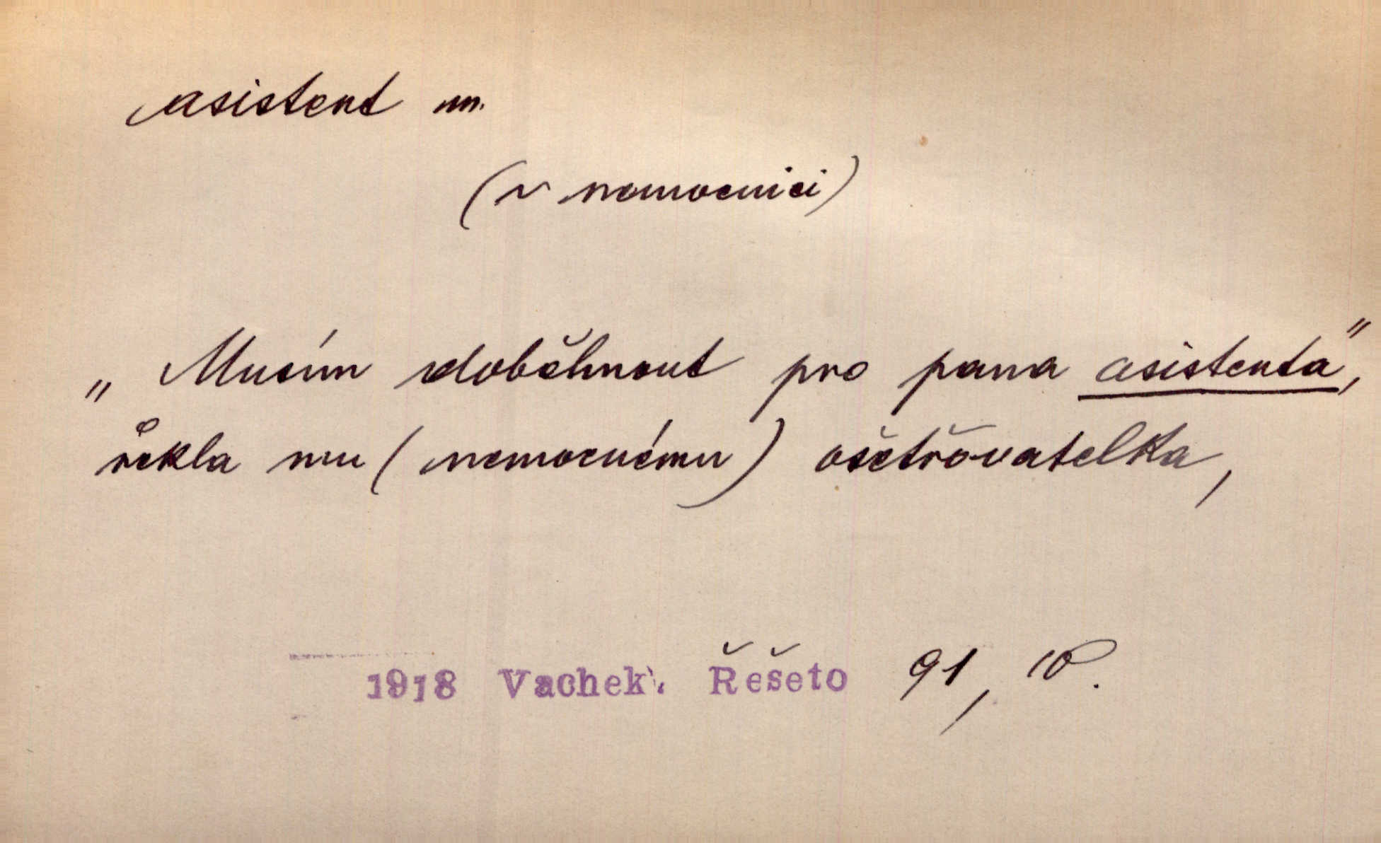 - asistent, -a m. kdo při nějakém výkonu přisluhuje, pomáhá; titul nižších úředníků; pomocná síla na školách a zvl. při ústavech vědeckých. Asistent stavitelský, lesní, soudní, poštovní; asistent kreslení, tělocviku (na střed. škole); asistent knihovny, musea, kliniky, semináře, laboratoře (na vysoké škole).