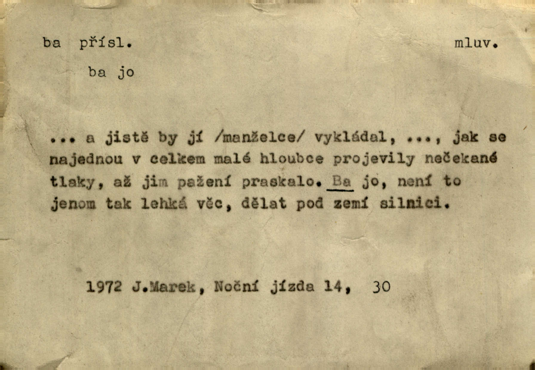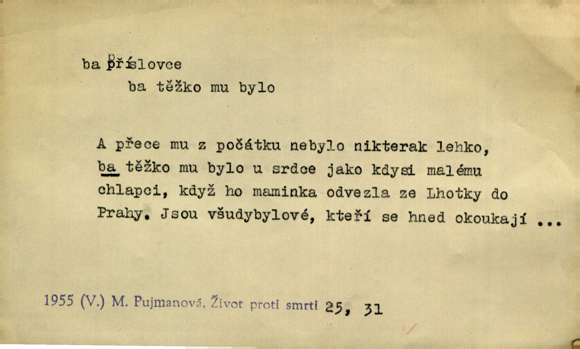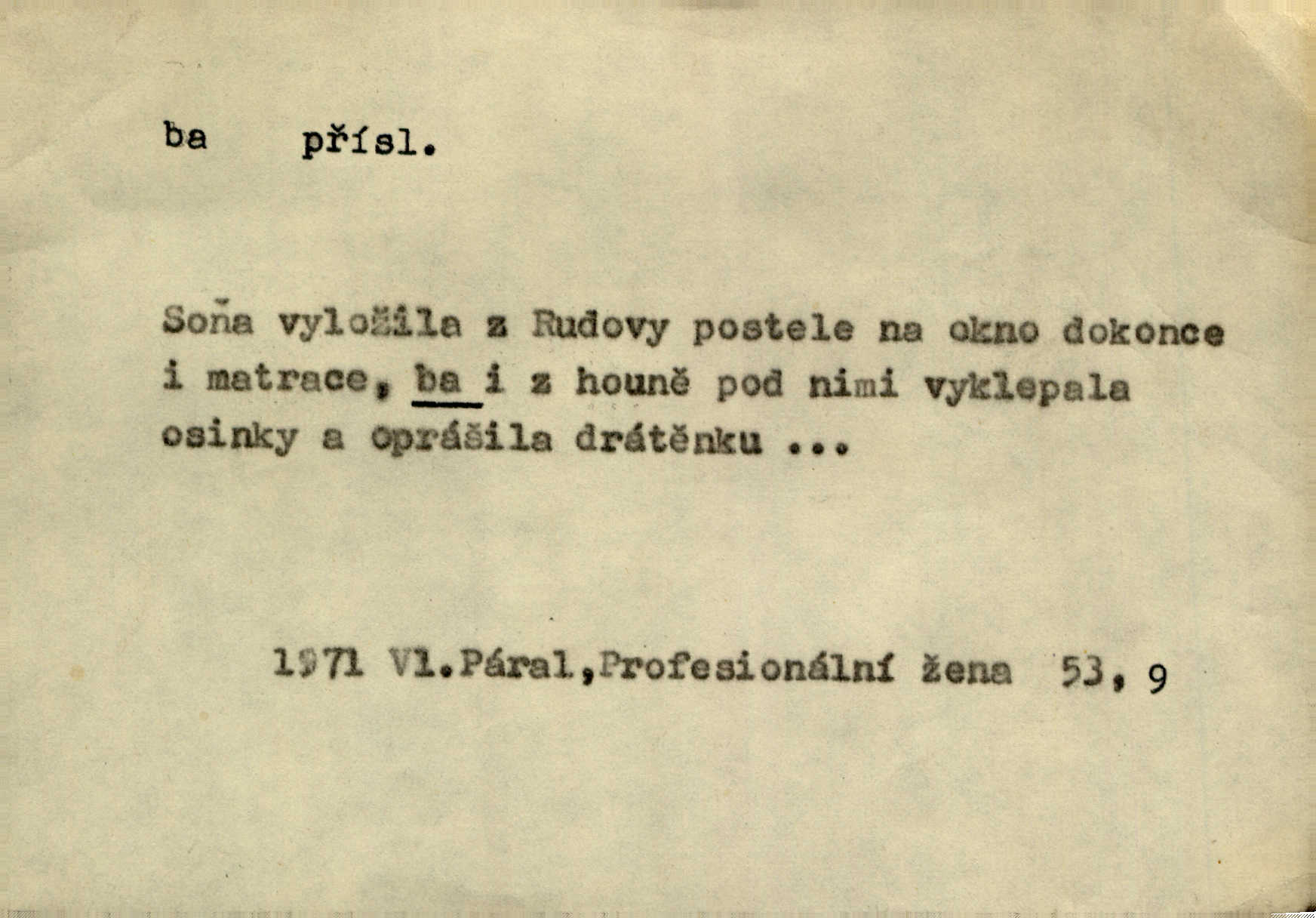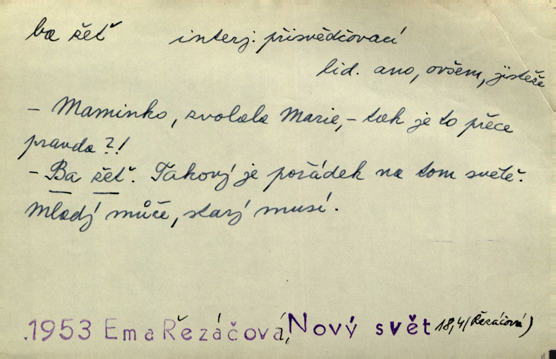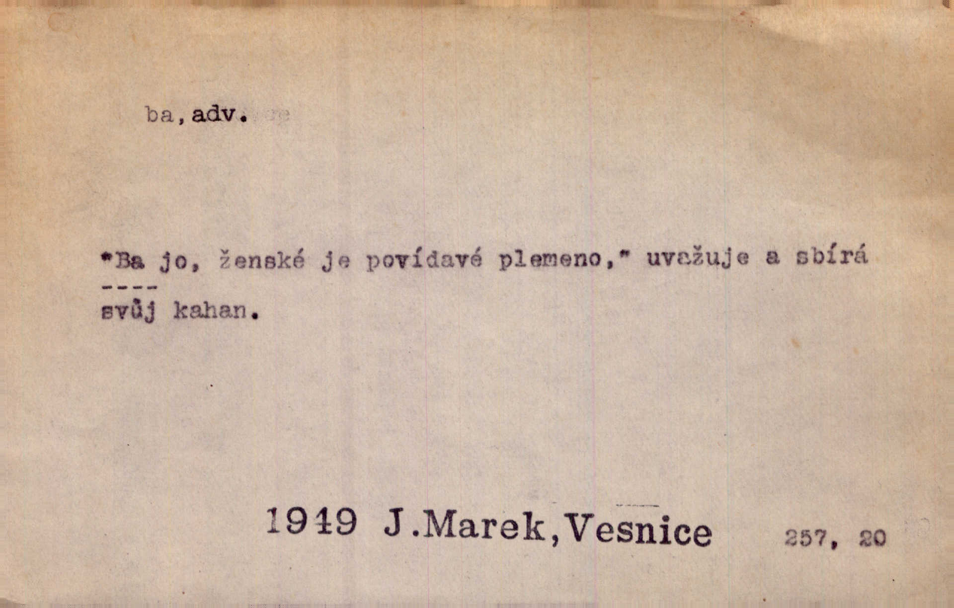 - ba adv. lid. potvrzuje samo nebo ve spojení s jinými slovy (ba ano, ba arci, ba ba, ba ovšem, ba pravda, ba právě, ba to že, ba věru, ba že, ba žeť, i ba, no ba, nu ba). „A lidé umírají hladem.“ zahučel Baltazar… „Ba že, kmotře, umírají.“ Jir. „Máš sčesáno?“ „I ba, nemám.“ Rais. Jaká je úroda? Ba špatná. Herb. D sp. s význ. zesilovacím. Domácnost ho pořád těšila, ba snad čím dále tím více. Jir.