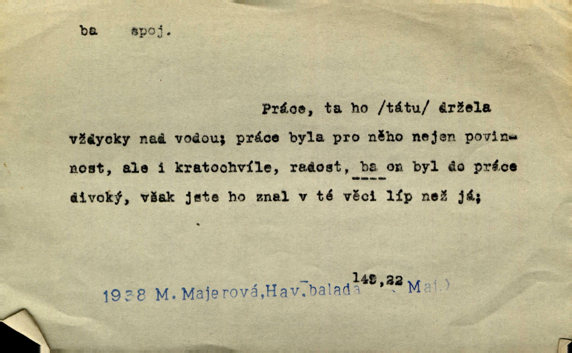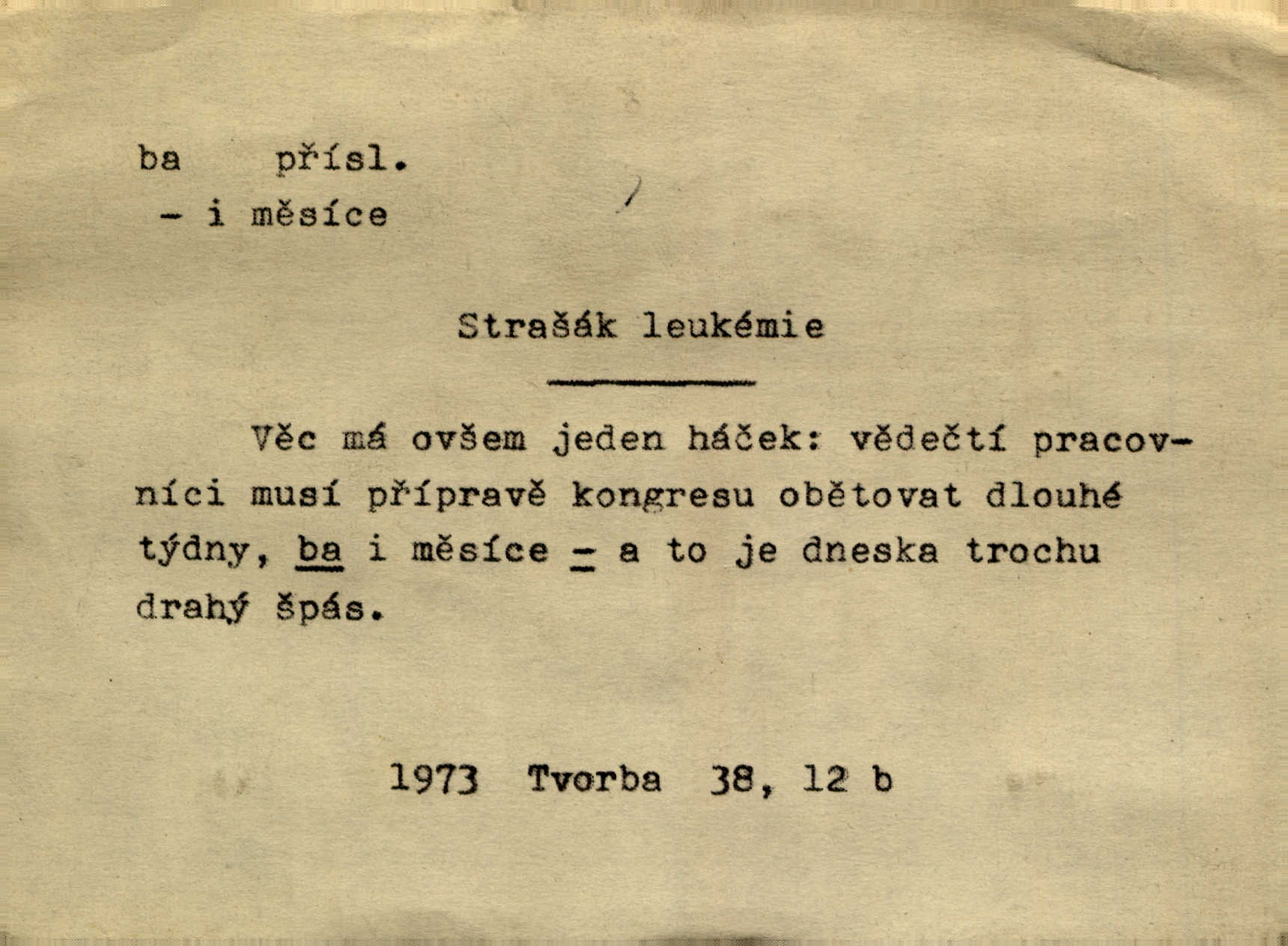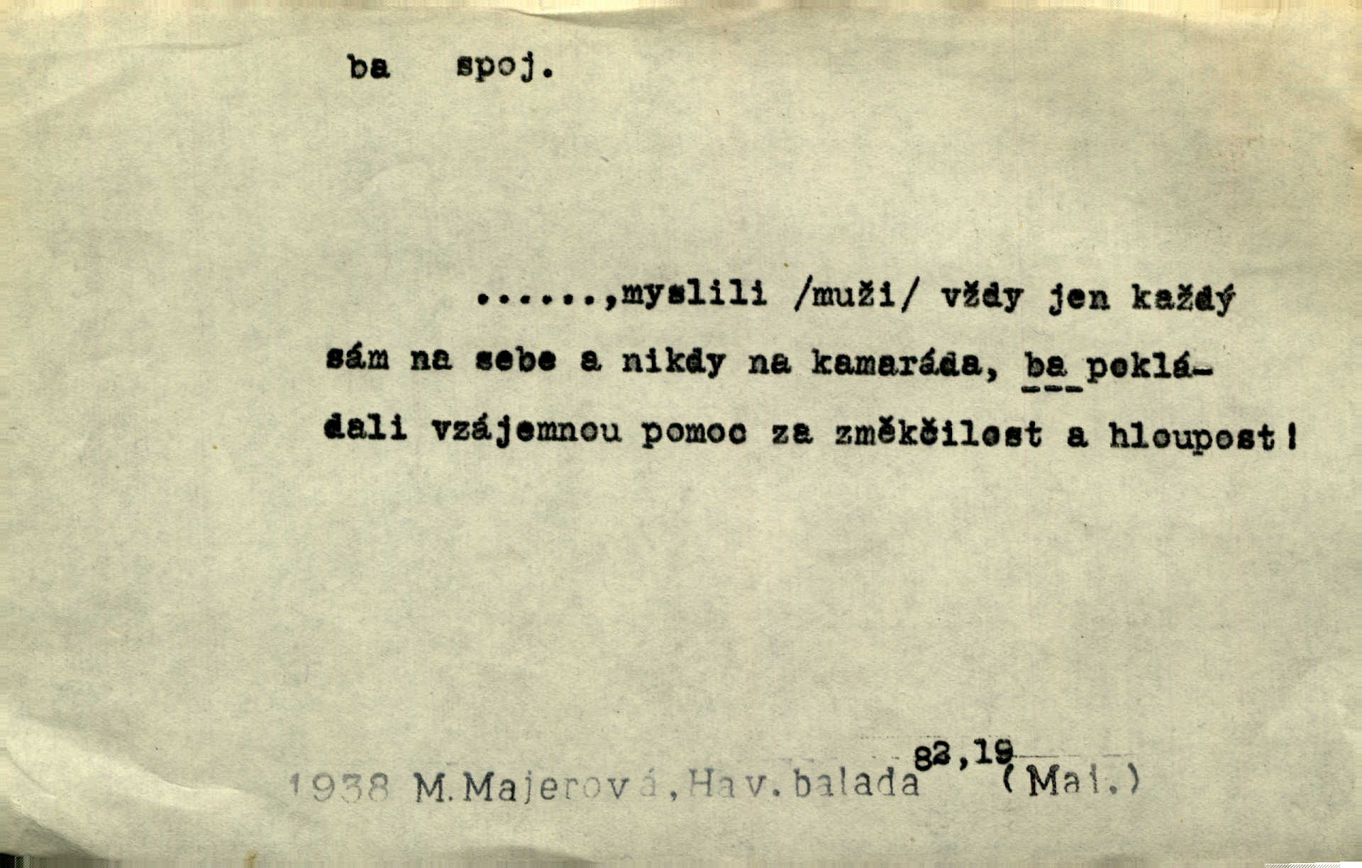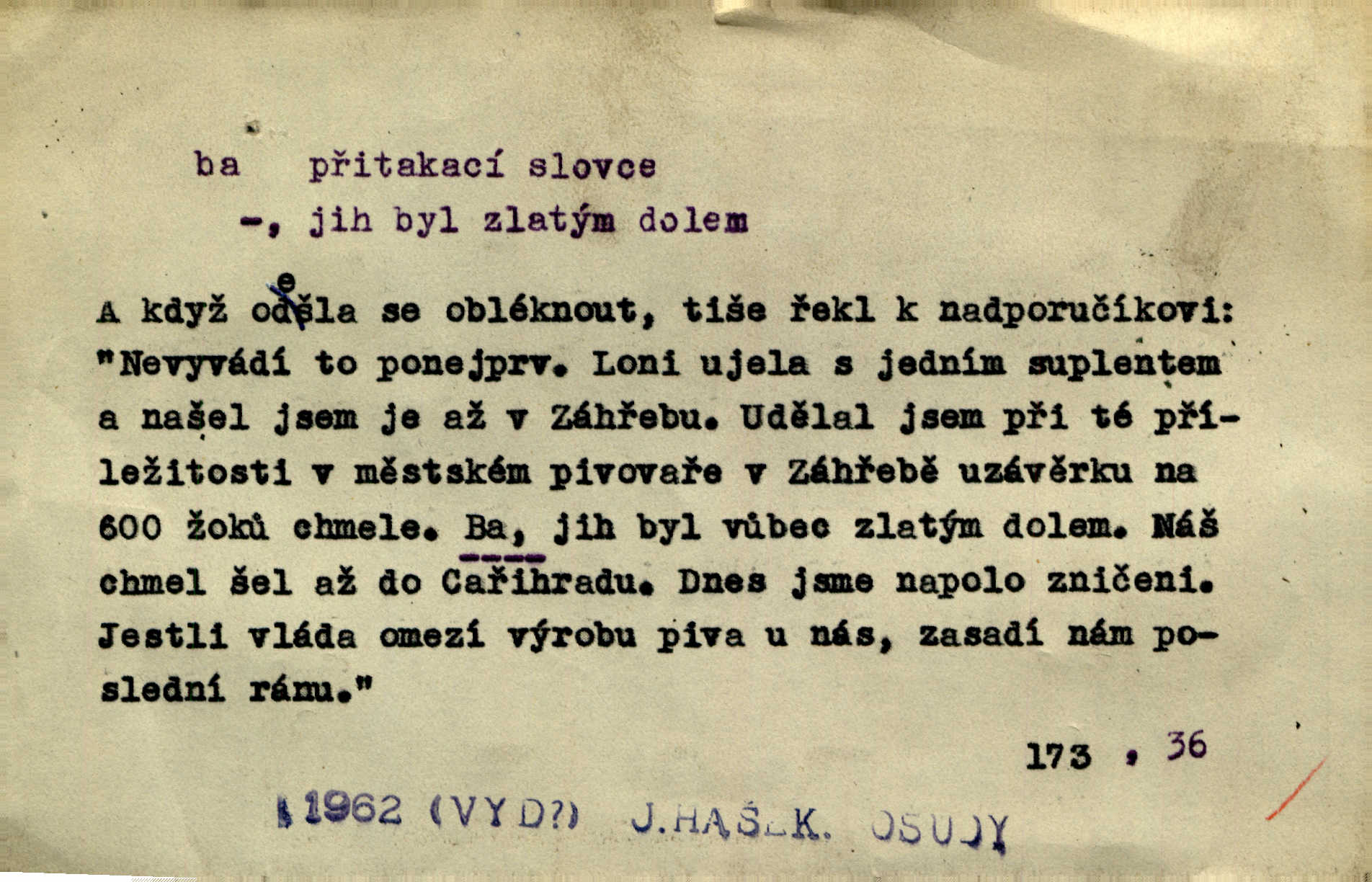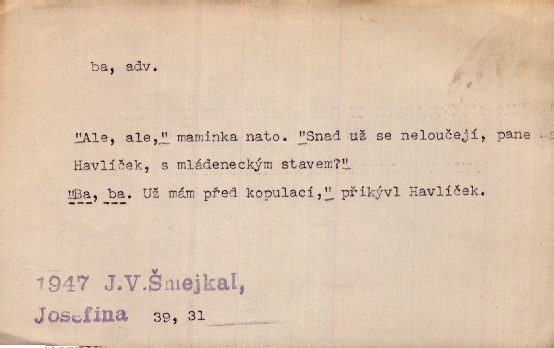 - ba adv. lid. potvrzuje samo nebo ve spojení s jinými slovy (ba ano, ba arci, ba ba, ba ovšem, ba pravda, ba právě, ba to že, ba věru, ba že, ba žeť, i ba, no ba, nu ba). „A lidé umírají hladem.“ zahučel Baltazar… „Ba že, kmotře, umírají.“ Jir. „Máš sčesáno?“ „I ba, nemám.“ Rais. Jaká je úroda? Ba špatná. Herb. D sp. s význ. zesilovacím. Domácnost ho pořád těšila, ba snad čím dále tím více. Jir.