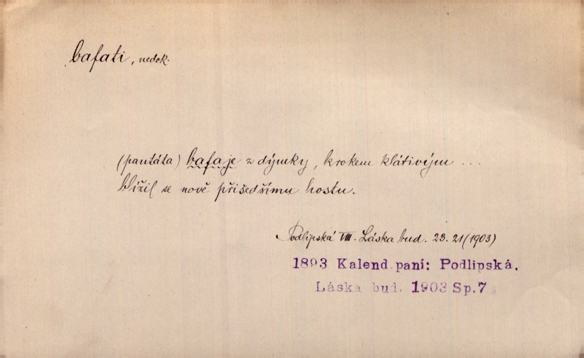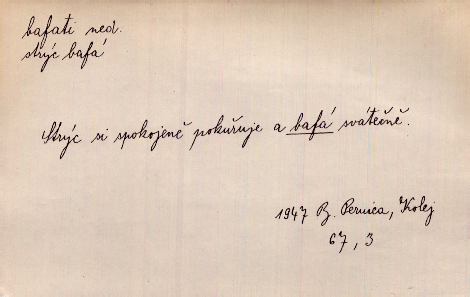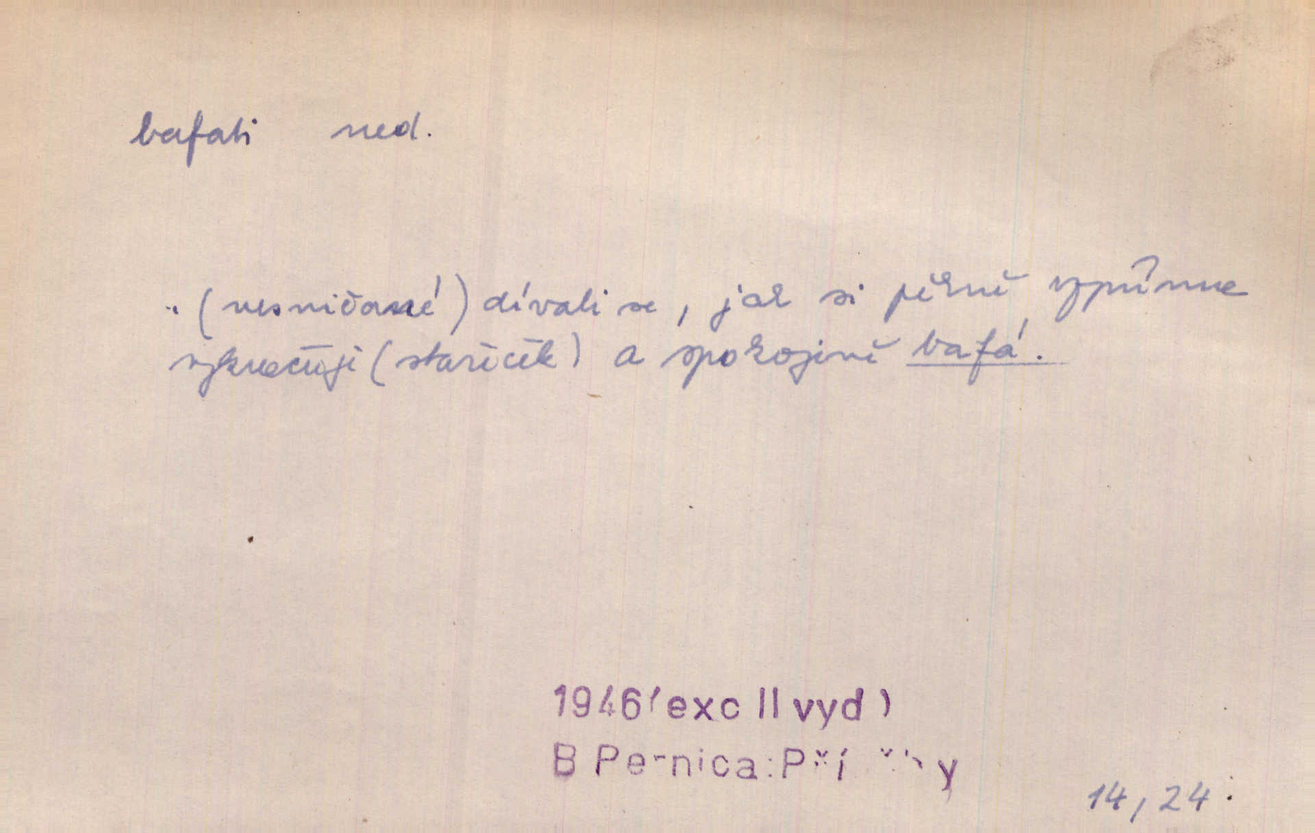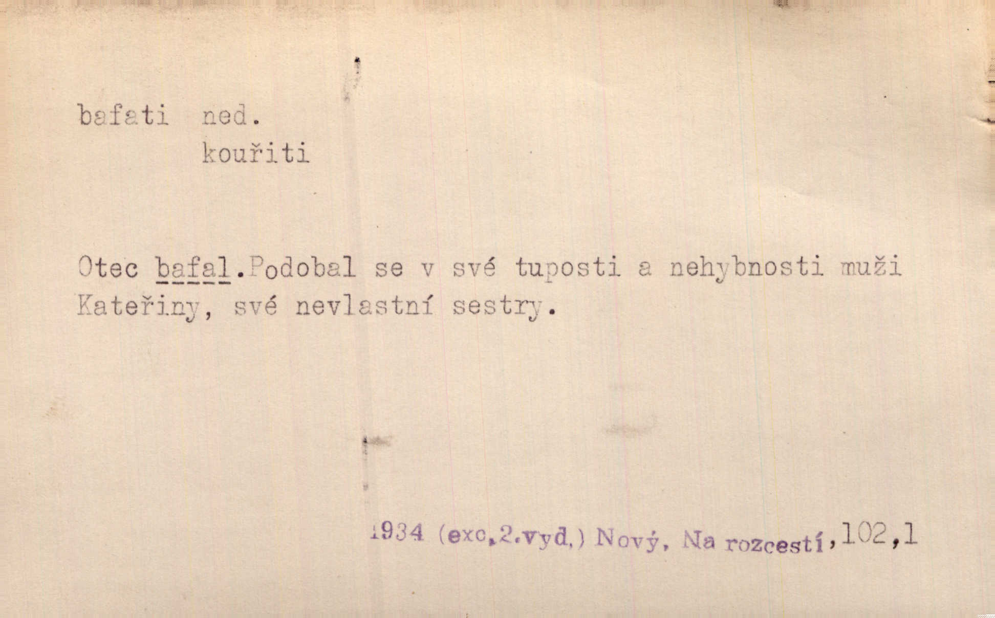 - bafati ned. štěkati. Pejsek bafal na každého. Sova. D vulg. na někoho křičeti. D vydávati retní zvuky při kouření, vypouštěti kouř s těmito zvuky; fam. kouřiti. V měkkém bílém kouři rychle bafají Hrouzkovy rty. V. Mrš. Nastalo ticho sotva rušené bafáním kouřících. Vrch. Starý bafal jako komín, když se smrkovým roštím zatopí. Rais. Tím bafáním to nespravíš. Leda bys hosty vykouřit chtěl do posledního. V. Mrš.
