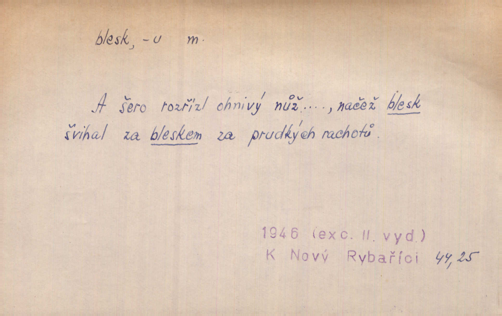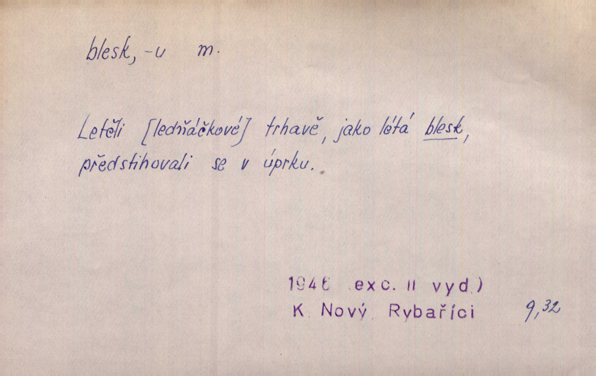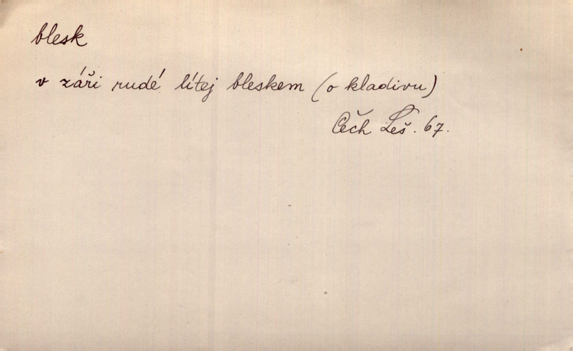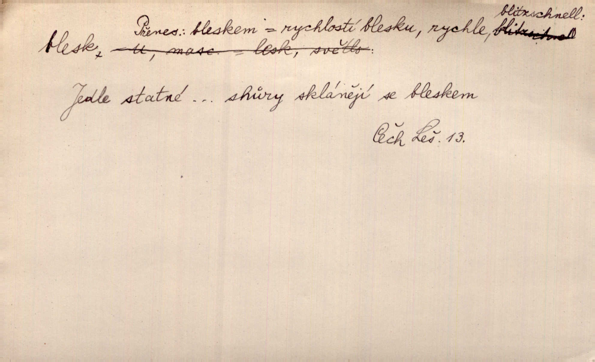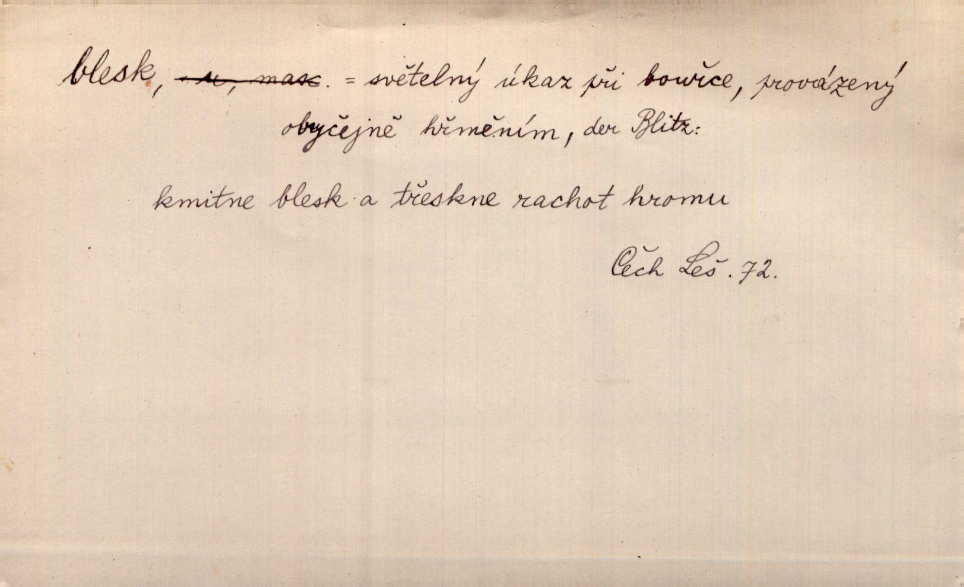 - blesk, -u m. světelný jev při bouřce způsobovaný výbojem elektřiny. Nebe se otvíralo v blescích. Podl. Vichřice duje, blesk se s bleskem stíhá. Krás. Blesky se křižují. Blesk udeřil. Blesk kulový, jiskrový, plošný. V tom jí jako blesk projela hlavou myšlenka, že snad Havel musí na vojnu. Prav. Koně ucítivše volnost, letěli nyní ne již šípem, ale bleskem, šíleně. Zey. Tu se mu však panna Adlička bleskem, jako úhoř, z rukou vyvinula. Jir. D ostré, prudké světlo; intensivní lesk, třpyt. Oči mu zářily v blesku měsíce. A. Mrš. Zlatý, bitý pás, v němž zářilo a blesky metalo drahé kamení, Jir. Blesk oceli se šerou síní mih’. Zey. Podívá se a blesk vyšlehne z černých žhavých očí jejích. Baar. Lev potřásá svou hřívou, blesky hází z očí. Vrch. D náhlé zaplanutí očí jako projev prudkého citu. Má milá přišla, v očích smavých jí radostí blesk jasně plál. Mach. Okem šlehl blesk nevýslovné zášti, ruka jela po noži v pasu. Ner. Tu blesk prudkého vzdoru se jí zaskvěl v očích. Dur. Z oček sršely blesky jízlivosti. Arb. D Přen. Oslňoval je rád bleskem svého ducha. Čech. Bás. Jak upoutati libelulu, která, modrý blesk, se míhá nad vodou u věčném pohybu jak vítr? Zey. D lesk a blesk vnější okázalost, nádhera. Marný, mizerný svět, po lesku a blesku baživá směsice bez ladu a skladu. Tyl. Slečna Julinka stála před zrcadlem v plném lesku a blesku. Kosm. D při zvolání a klení: blesky boží!, živé blesky!, hromy a blesky! Blesky boží! proklatí ti ptáci. Staš. Hromy a blesky, pusťte mne, nebo zapomenu všecky rytířské zákony. Stroup. Na hromech líhá a na blescích vstává kleje celý den. Sez.
