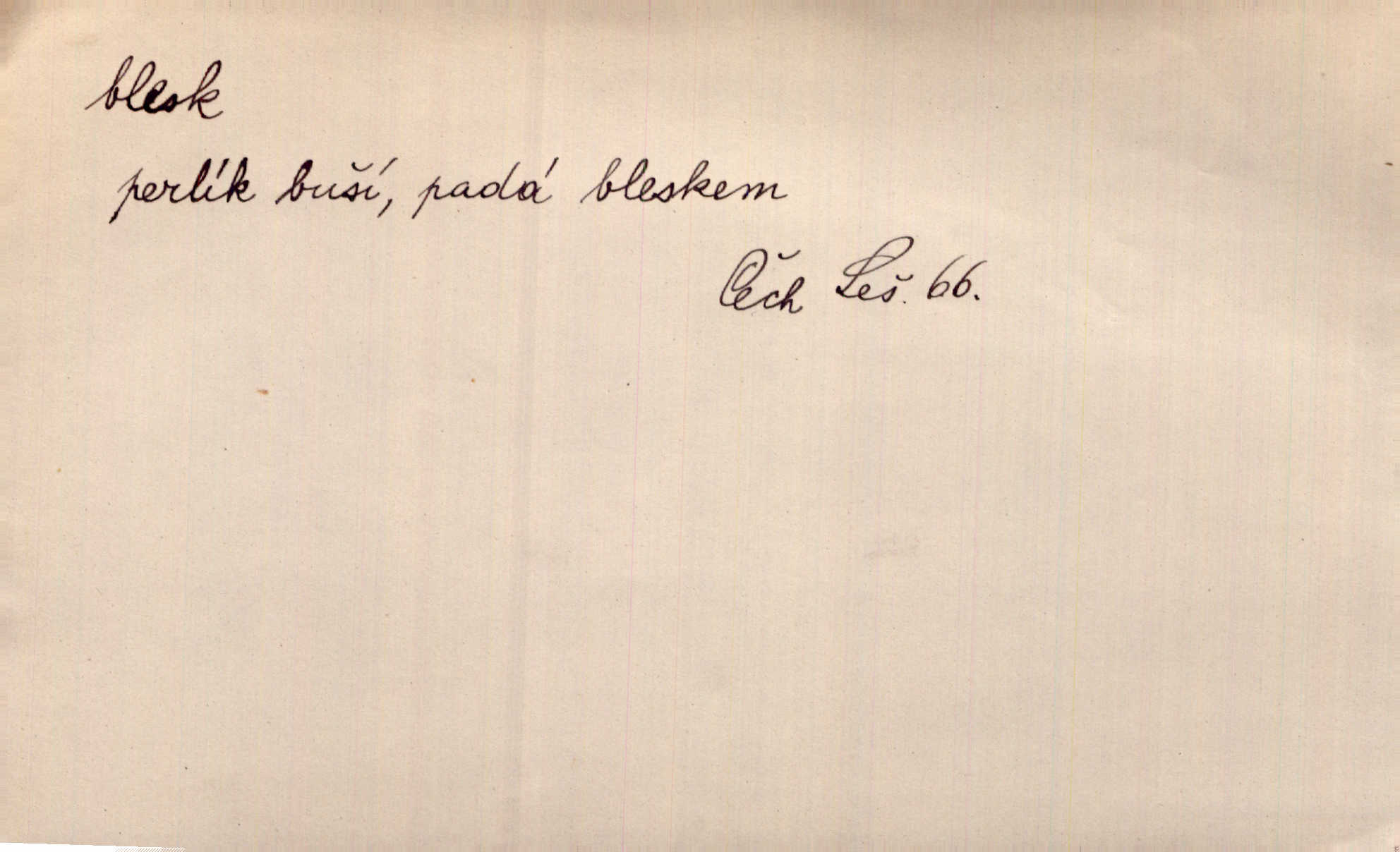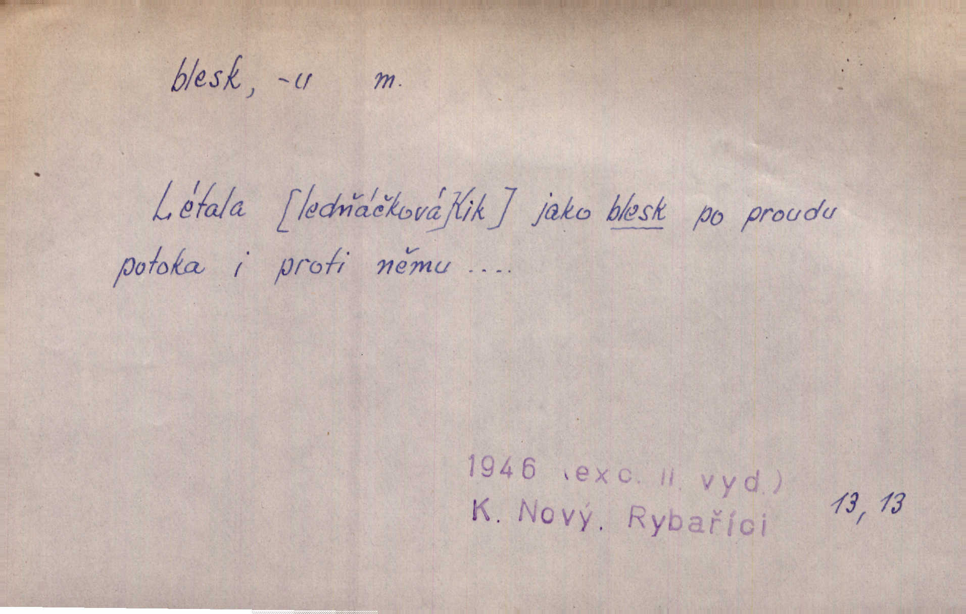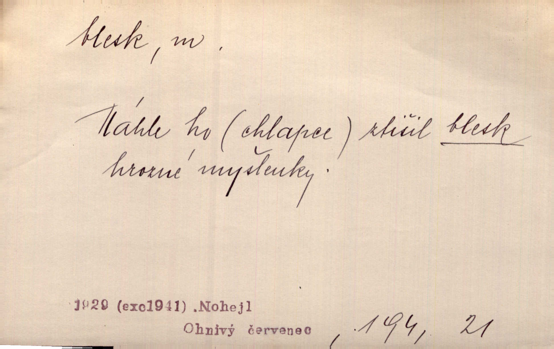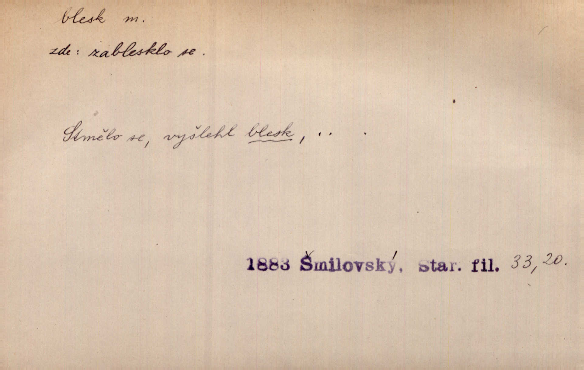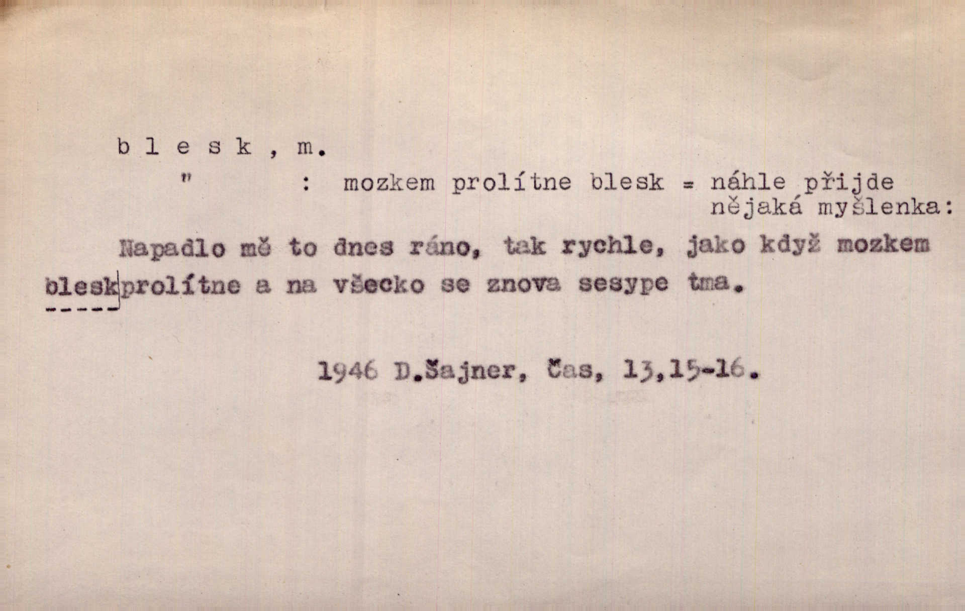 - blesk, -u m. světelný jev při bouřce způsobovaný výbojem elektřiny. Nebe se otvíralo v blescích. Podl. Vichřice duje, blesk se s bleskem stíhá. Krás. Blesky se křižují. Blesk udeřil. Blesk kulový, jiskrový, plošný. V tom jí jako blesk projela hlavou myšlenka, že snad Havel musí na vojnu. Prav. Koně ucítivše volnost, letěli nyní ne již šípem, ale bleskem, šíleně. Zey. Tu se mu však panna Adlička bleskem, jako úhoř, z rukou vyvinula. Jir. D ostré, prudké světlo; intensivní lesk, třpyt. Oči mu zářily v blesku měsíce. A. Mrš. Zlatý, bitý pás, v němž zářilo a blesky metalo drahé kamení, Jir. Blesk oceli se šerou síní mih’. Zey. Podívá se a blesk vyšlehne z černých žhavých očí jejích. Baar. Lev potřásá svou hřívou, blesky hází z očí. Vrch. D náhlé zaplanutí očí jako projev prudkého citu. Má milá přišla, v očích smavých jí radostí blesk jasně plál. Mach. Okem šlehl blesk nevýslovné zášti, ruka jela po noži v pasu. Ner. Tu blesk prudkého vzdoru se jí zaskvěl v očích. Dur. Z oček sršely blesky jízlivosti. Arb. D Přen. Oslňoval je rád bleskem svého ducha. Čech. Bás. Jak upoutati libelulu, která, modrý blesk, se míhá nad vodou u věčném pohybu jak vítr? Zey. D lesk a blesk vnější okázalost, nádhera. Marný, mizerný svět, po lesku a blesku baživá směsice bez ladu a skladu. Tyl. Slečna Julinka stála před zrcadlem v plném lesku a blesku. Kosm. D při zvolání a klení: blesky boží!, živé blesky!, hromy a blesky! Blesky boží! proklatí ti ptáci. Staš. Hromy a blesky, pusťte mne, nebo zapomenu všecky rytířské zákony. Stroup. Na hromech líhá a na blescích vstává kleje celý den. Sez.