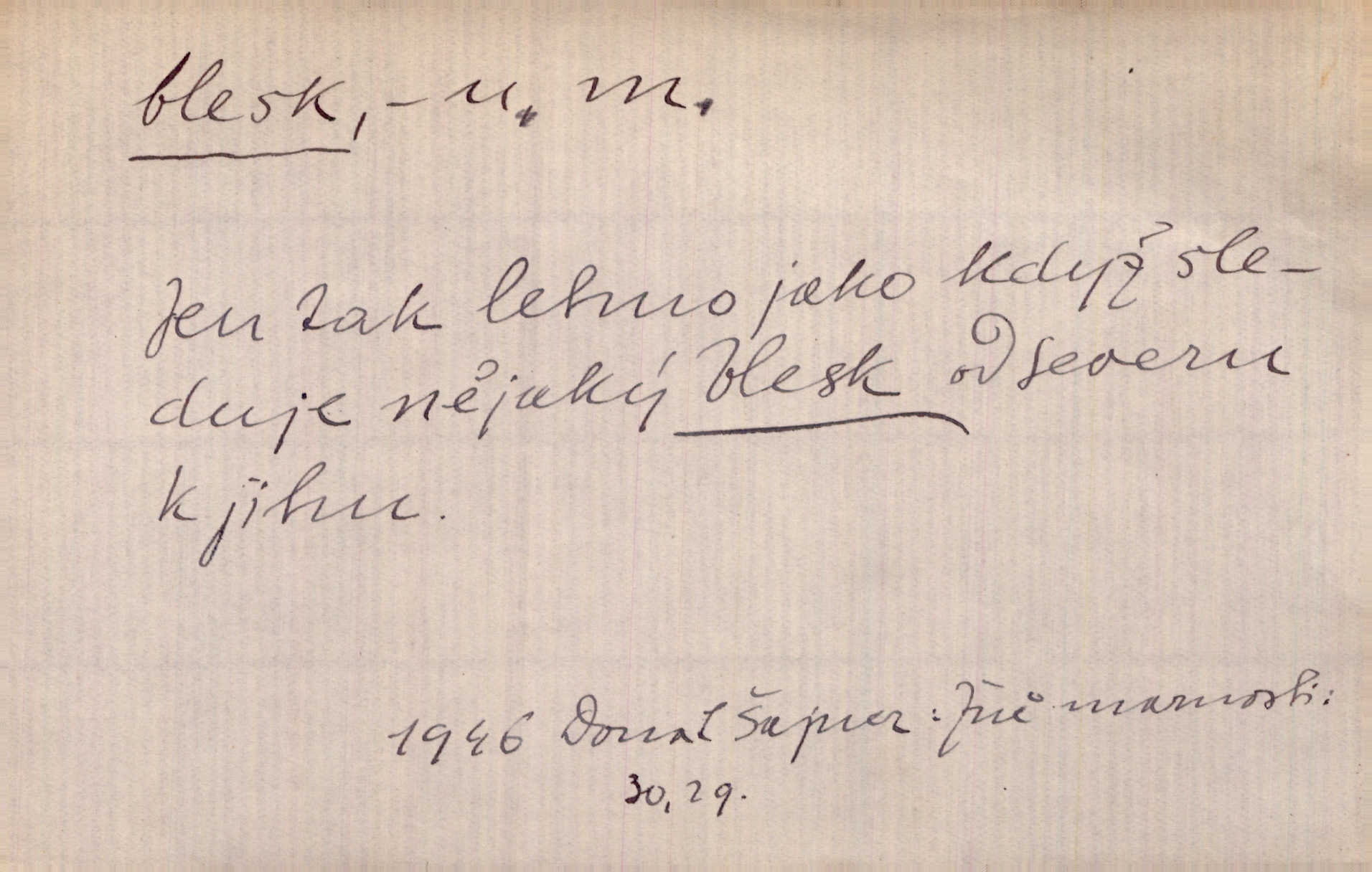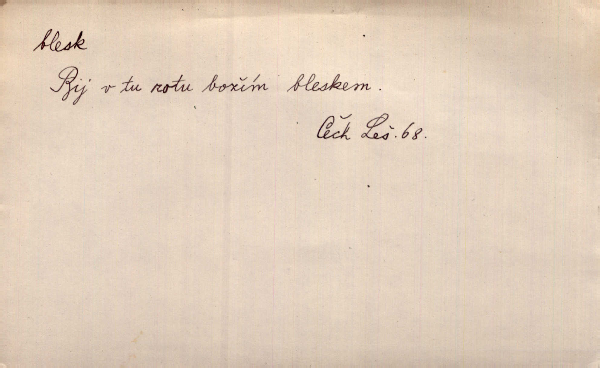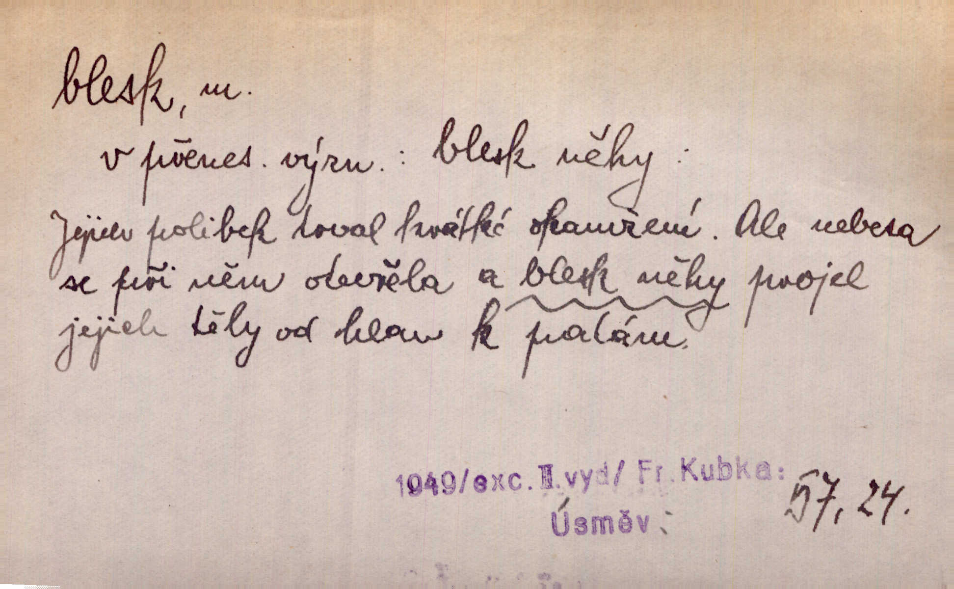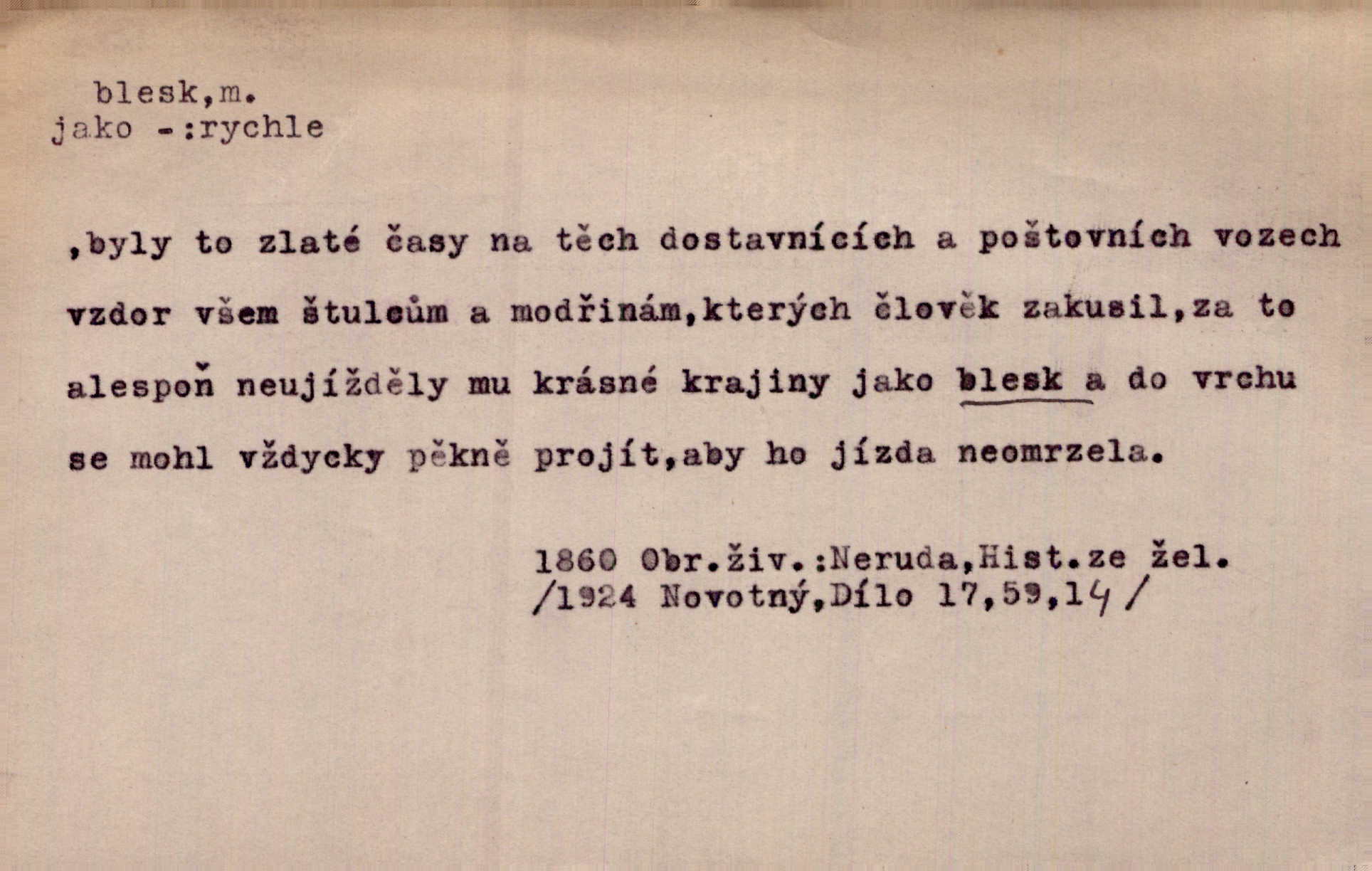- blesk, -u m. světelný jev při bouřce způsobovaný výbojem elektřiny. Nebe se otvíralo v blescích. Podl. Vichřice duje, blesk se s bleskem stíhá. Krás. Blesky se křižují. Blesk udeřil. Blesk kulový, jiskrový, plošný. V tom jí jako blesk projela hlavou myšlenka, že snad Havel musí na vojnu. Prav. Koně ucítivše volnost, letěli nyní ne již šípem, ale bleskem, šíleně. Zey. Tu se mu však panna Adlička bleskem, jako úhoř, z rukou vyvinula. Jir. D ostré, prudké světlo; intensivní lesk, třpyt. Oči mu zářily v blesku měsíce. A. Mrš. Zlatý, bitý pás, v němž zářilo a blesky metalo drahé kamení, Jir. Blesk oceli se šerou síní mih’. Zey. Podívá se a blesk vyšlehne z černých žhavých očí jejích. Baar. Lev potřásá svou hřívou, blesky hází z očí. Vrch. D náhlé zaplanutí očí jako projev prudkého citu. Má milá přišla, v očích smavých jí radostí blesk jasně plál. Mach. Okem šlehl blesk nevýslovné zášti, ruka jela po noži v pasu. Ner. Tu blesk prudkého vzdoru se jí zaskvěl v očích. Dur. Z oček sršely blesky jízlivosti. Arb. D Přen. Oslňoval je rád bleskem svého ducha. Čech. Bás. Jak upoutati libelulu, která, modrý blesk, se míhá nad vodou u věčném pohybu jak vítr? Zey. D lesk a blesk vnější okázalost, nádhera. Marný, mizerný svět, po lesku a blesku baživá směsice bez ladu a skladu. Tyl. Slečna Julinka stála před zrcadlem v plném lesku a blesku. Kosm. D při zvolání a klení: blesky boží!, živé blesky!, hromy a blesky! Blesky boží! proklatí ti ptáci. Staš. Hromy a blesky, pusťte mne, nebo zapomenu všecky rytířské zákony. Stroup. Na hromech líhá a na blescích vstává kleje celý den. Sez.