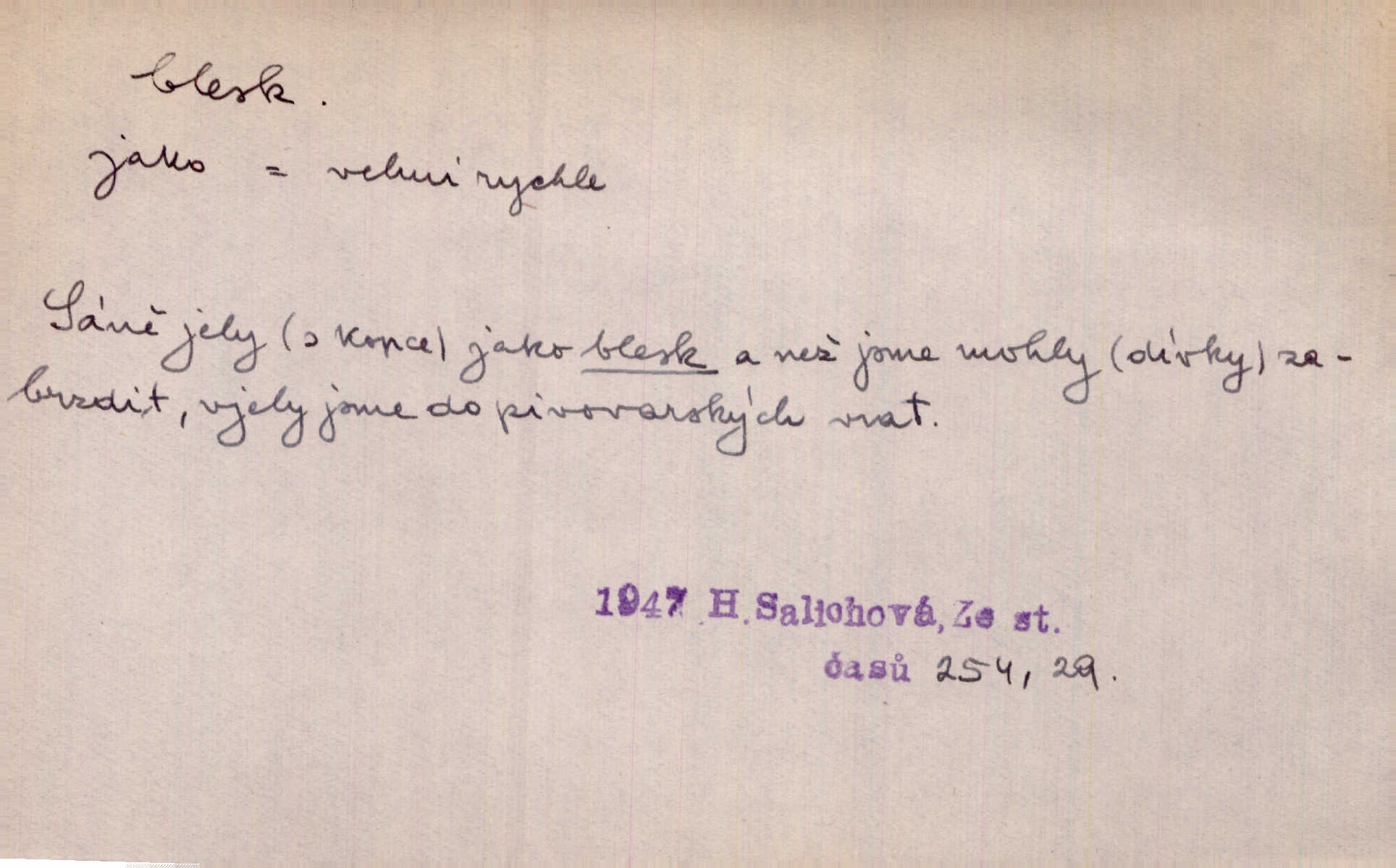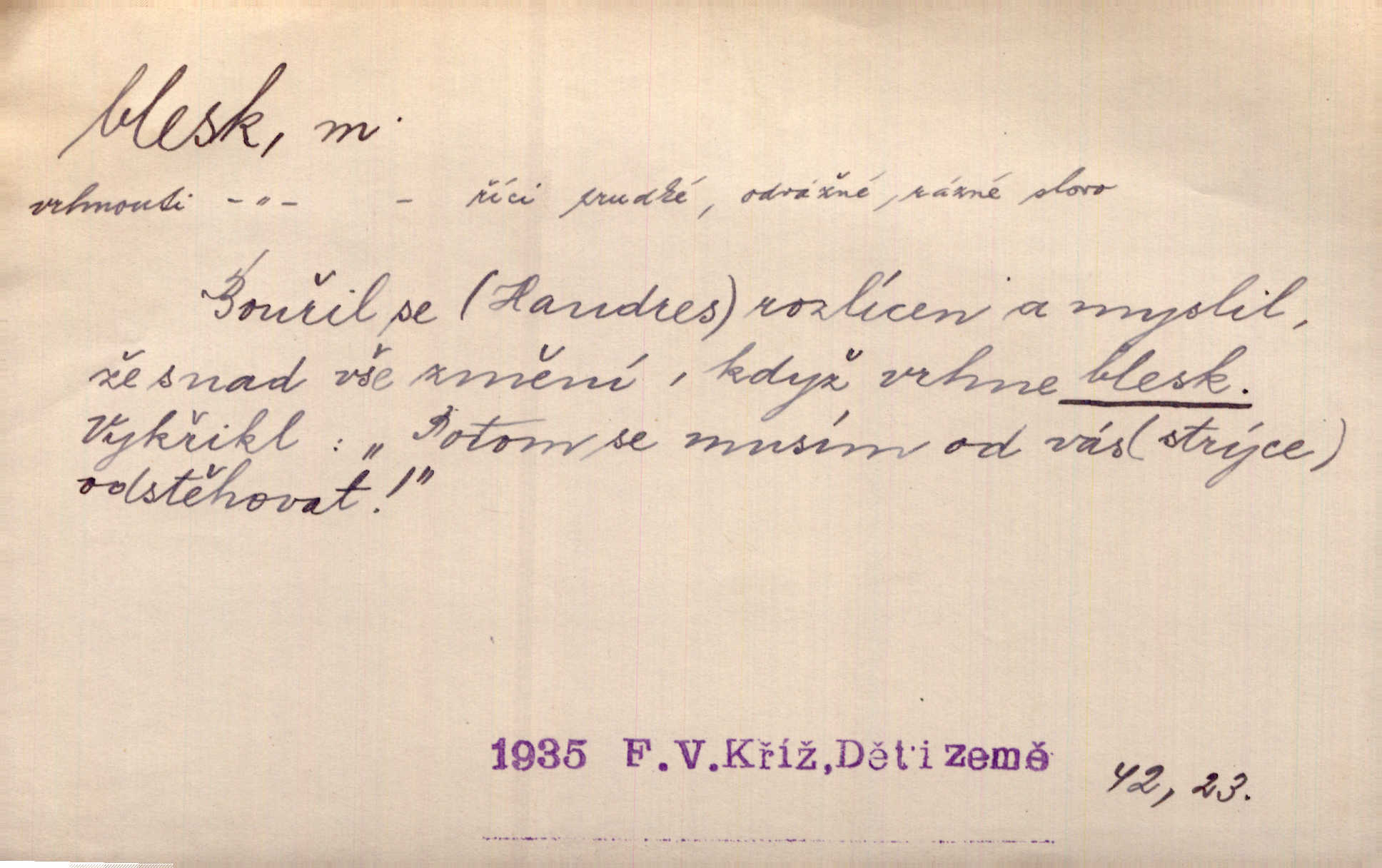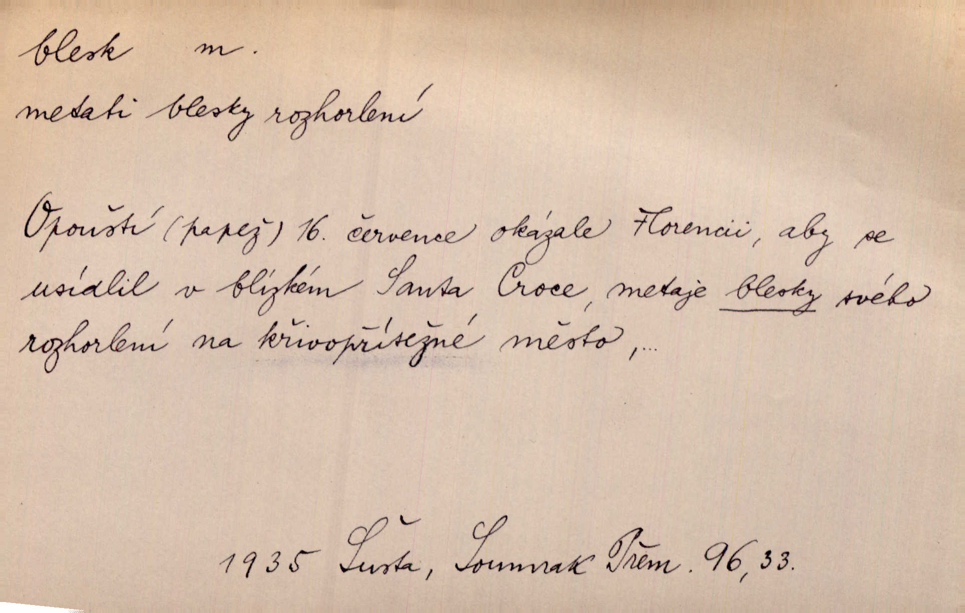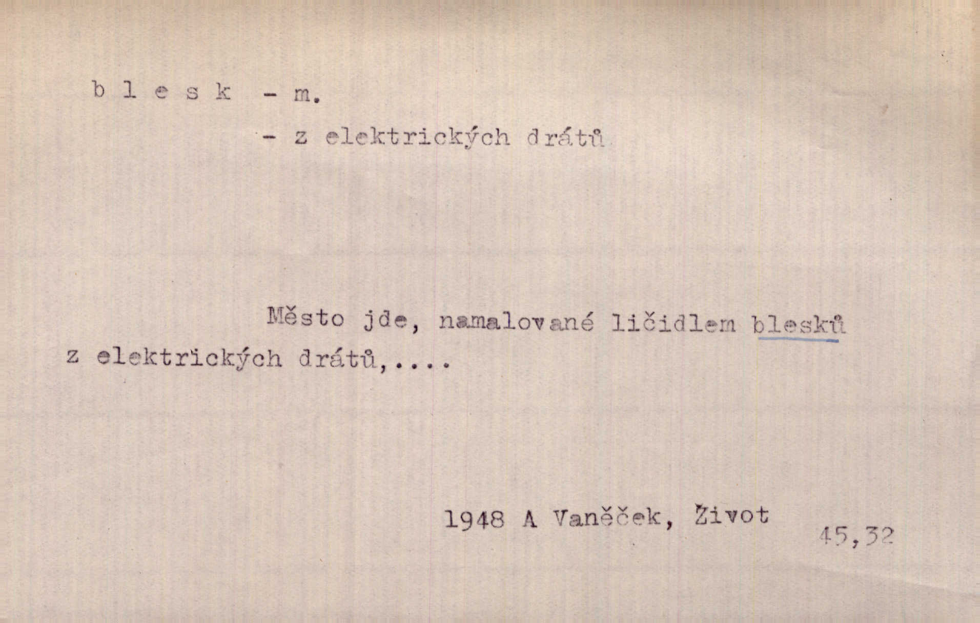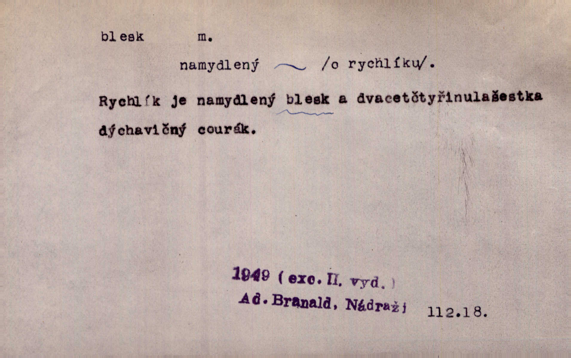 - blesk, -u m. světelný jev při bouřce způsobovaný výbojem elektřiny. Nebe se otvíralo v blescích. Podl. Vichřice duje, blesk se s bleskem stíhá. Krás. Blesky se křižují. Blesk udeřil. Blesk kulový, jiskrový, plošný. V tom jí jako blesk projela hlavou myšlenka, že snad Havel musí na vojnu. Prav. Koně ucítivše volnost, letěli nyní ne již šípem, ale bleskem, šíleně. Zey. Tu se mu však panna Adlička bleskem, jako úhoř, z rukou vyvinula. Jir. D ostré, prudké světlo; intensivní lesk, třpyt. Oči mu zářily v blesku měsíce. A. Mrš. Zlatý, bitý pás, v němž zářilo a blesky metalo drahé kamení, Jir. Blesk oceli se šerou síní mih’. Zey. Podívá se a blesk vyšlehne z černých žhavých očí jejích. Baar. Lev potřásá svou hřívou, blesky hází z očí. Vrch. D náhlé zaplanutí očí jako projev prudkého citu. Má milá přišla, v očích smavých jí radostí blesk jasně plál. Mach. Okem šlehl blesk nevýslovné zášti, ruka jela po noži v pasu. Ner. Tu blesk prudkého vzdoru se jí zaskvěl v očích. Dur. Z oček sršely blesky jízlivosti. Arb. D Přen. Oslňoval je rád bleskem svého ducha. Čech. Bás. Jak upoutati libelulu, která, modrý blesk, se míhá nad vodou u věčném pohybu jak vítr? Zey. D lesk a blesk vnější okázalost, nádhera. Marný, mizerný svět, po lesku a blesku baživá směsice bez ladu a skladu. Tyl. Slečna Julinka stála před zrcadlem v plném lesku a blesku. Kosm. D při zvolání a klení: blesky boží!, živé blesky!, hromy a blesky! Blesky boží! proklatí ti ptáci. Staš. Hromy a blesky, pusťte mne, nebo zapomenu všecky rytířské zákony. Stroup. Na hromech líhá a na blescích vstává kleje celý den. Sez.