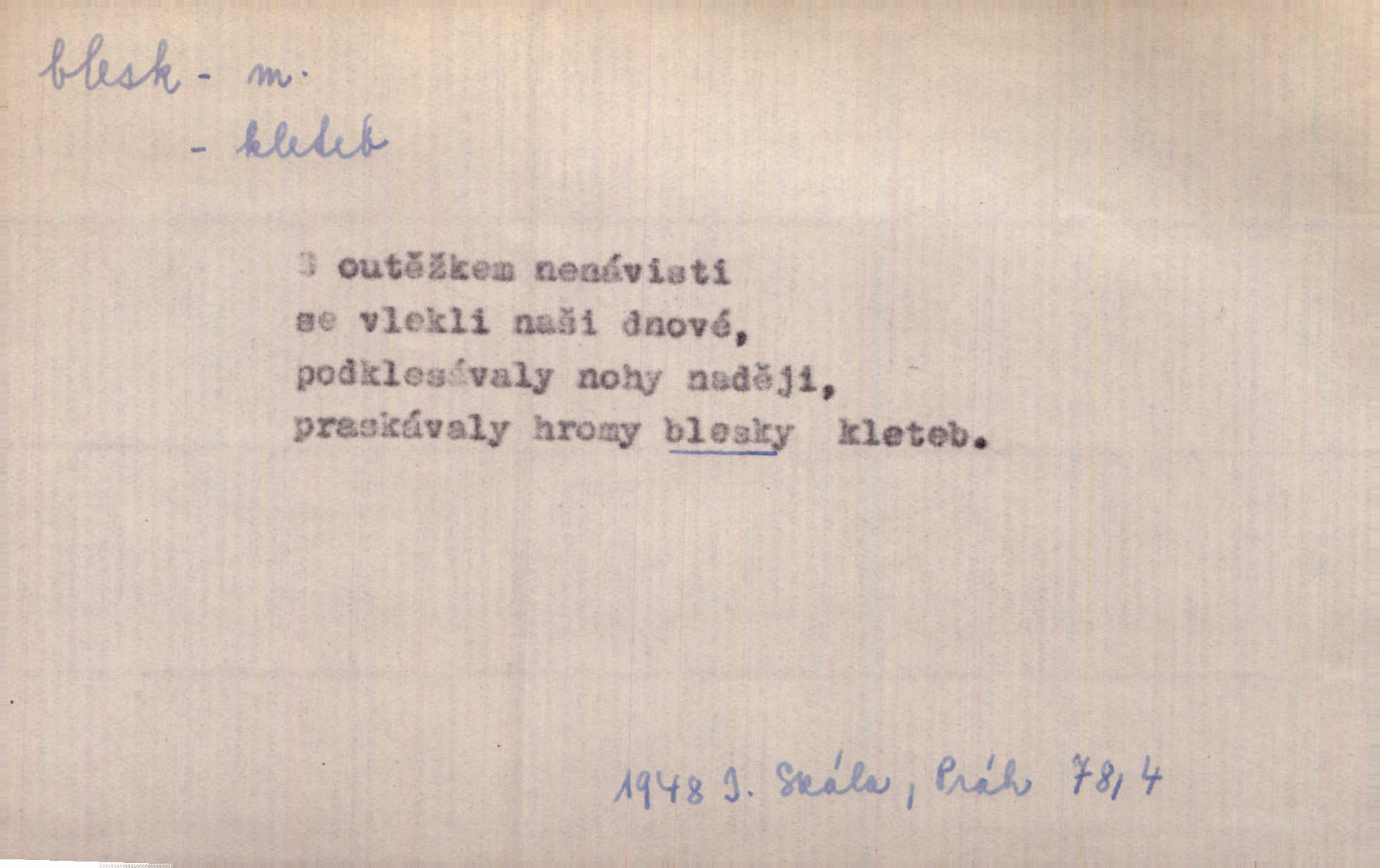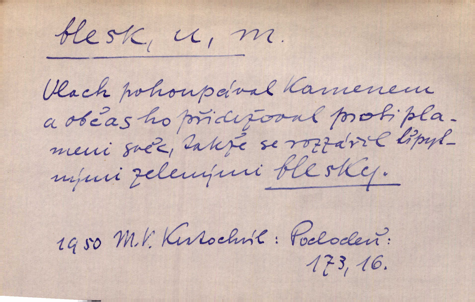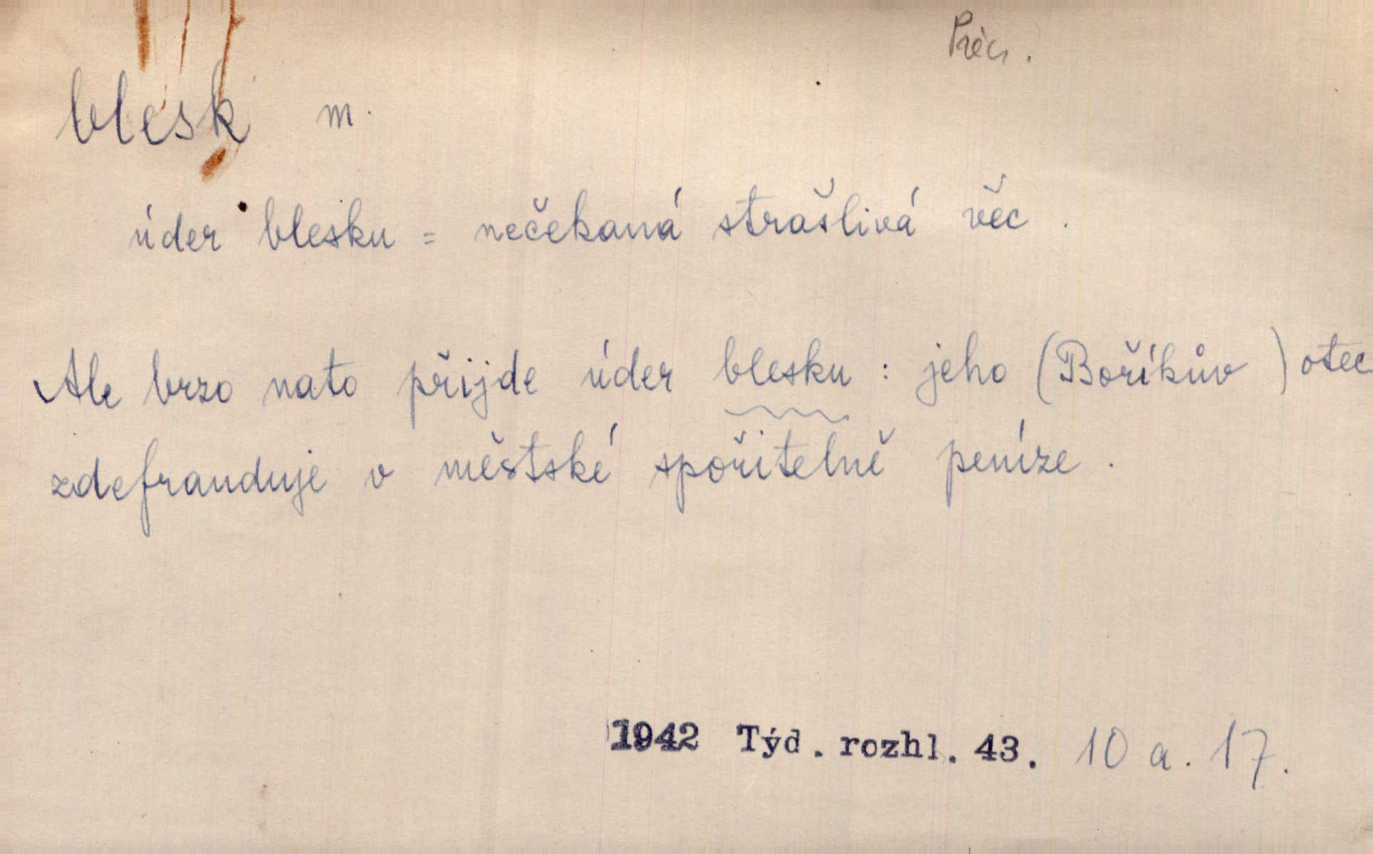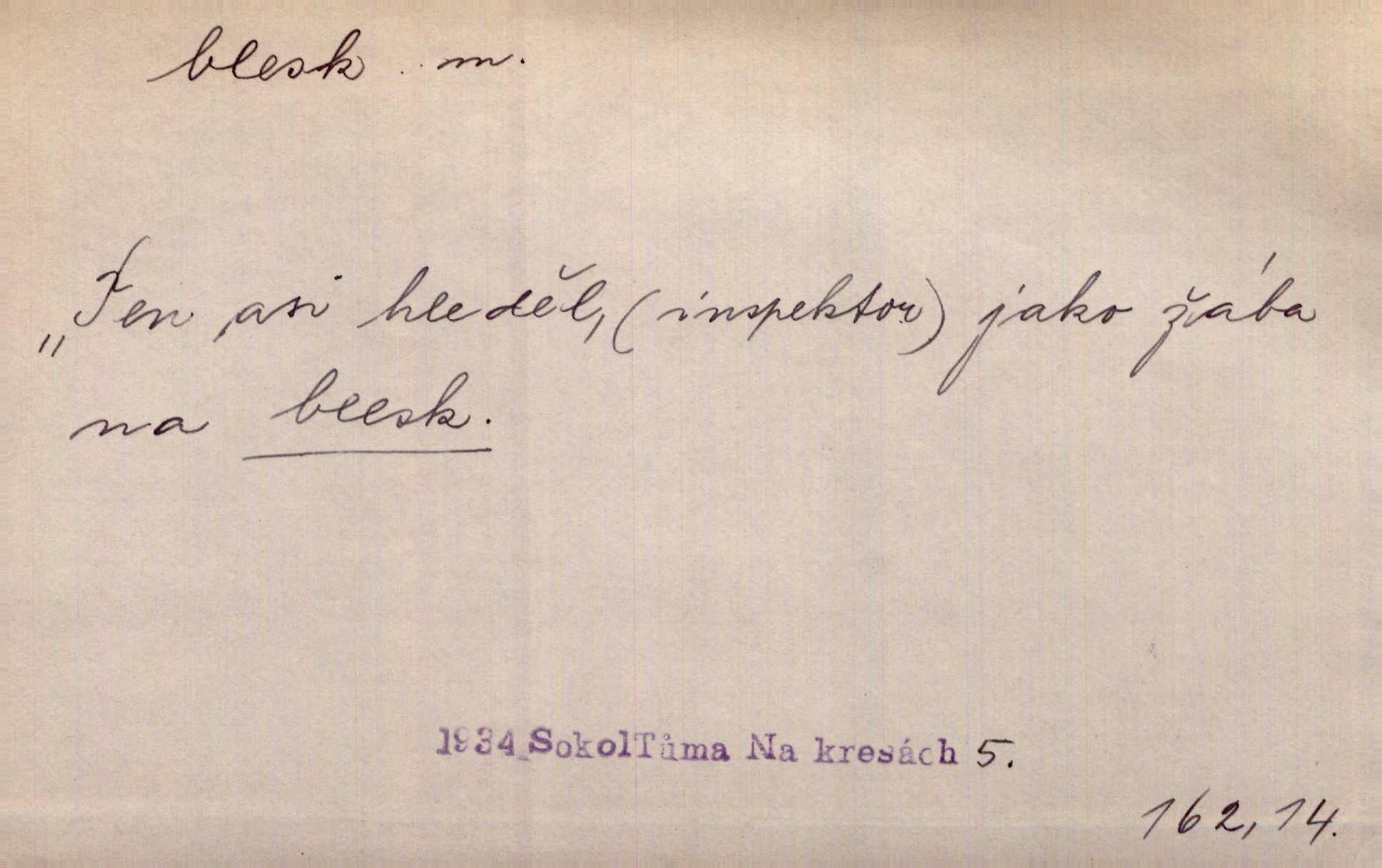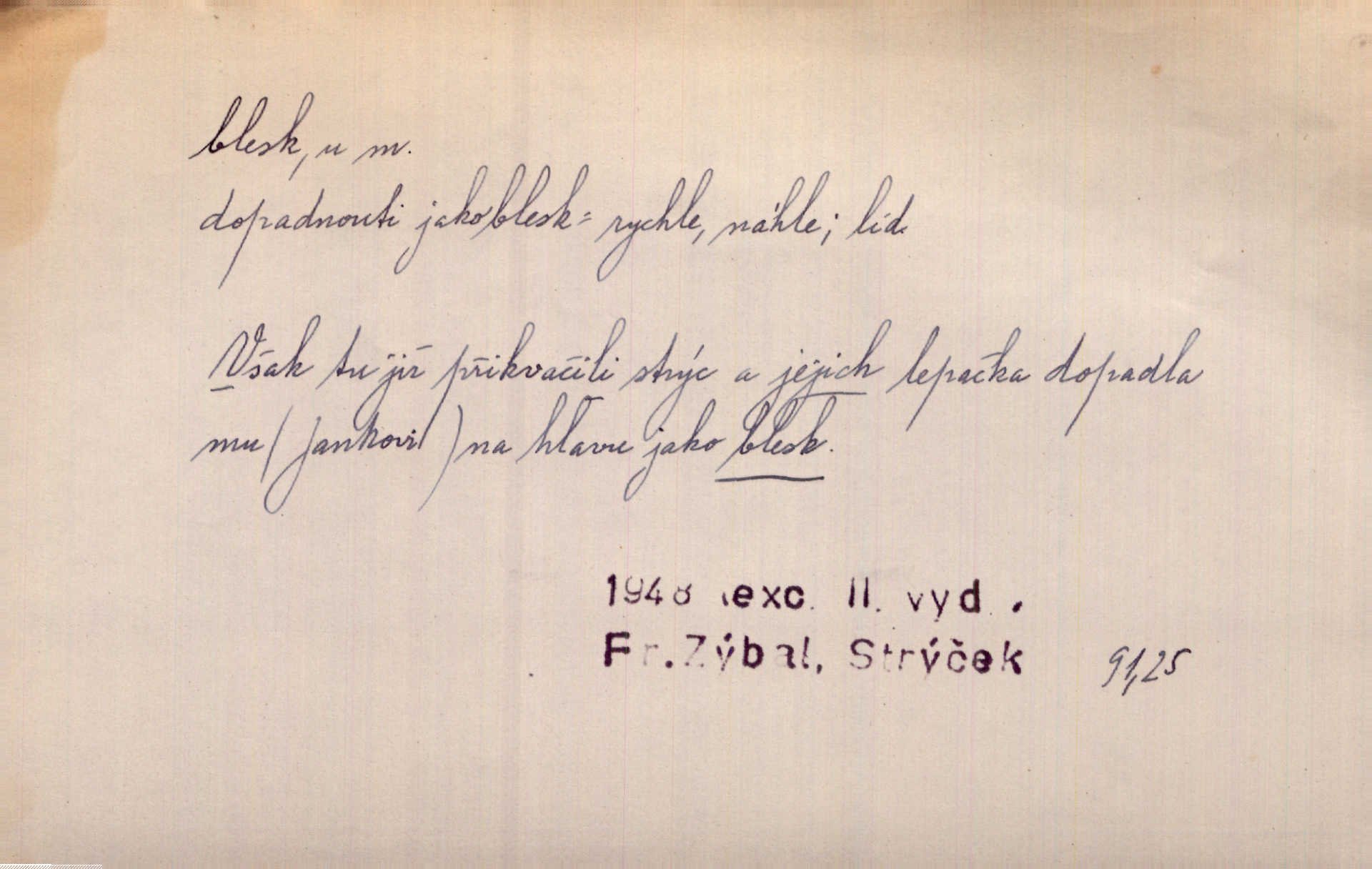 - blesk, -u m. světelný jev při bouřce způsobovaný výbojem elektřiny. Nebe se otvíralo v blescích. Podl. Vichřice duje, blesk se s bleskem stíhá. Krás. Blesky se křižují. Blesk udeřil. Blesk kulový, jiskrový, plošný. V tom jí jako blesk projela hlavou myšlenka, že snad Havel musí na vojnu. Prav. Koně ucítivše volnost, letěli nyní ne již šípem, ale bleskem, šíleně. Zey. Tu se mu však panna Adlička bleskem, jako úhoř, z rukou vyvinula. Jir. D ostré, prudké světlo; intensivní lesk, třpyt. Oči mu zářily v blesku měsíce. A. Mrš. Zlatý, bitý pás, v němž zářilo a blesky metalo drahé kamení, Jir. Blesk oceli se šerou síní mih’. Zey. Podívá se a blesk vyšlehne z černých žhavých očí jejích. Baar. Lev potřásá svou hřívou, blesky hází z očí. Vrch. D náhlé zaplanutí očí jako projev prudkého citu. Má milá přišla, v očích smavých jí radostí blesk jasně plál. Mach. Okem šlehl blesk nevýslovné zášti, ruka jela po noži v pasu. Ner. Tu blesk prudkého vzdoru se jí zaskvěl v očích. Dur. Z oček sršely blesky jízlivosti. Arb. D Přen. Oslňoval je rád bleskem svého ducha. Čech. Bás. Jak upoutati libelulu, která, modrý blesk, se míhá nad vodou u věčném pohybu jak vítr? Zey. D lesk a blesk vnější okázalost, nádhera. Marný, mizerný svět, po lesku a blesku baživá směsice bez ladu a skladu. Tyl. Slečna Julinka stála před zrcadlem v plném lesku a blesku. Kosm. D při zvolání a klení: blesky boží!, živé blesky!, hromy a blesky! Blesky boží! proklatí ti ptáci. Staš. Hromy a blesky, pusťte mne, nebo zapomenu všecky rytířské zákony. Stroup. Na hromech líhá a na blescích vstává kleje celý den. Sez.