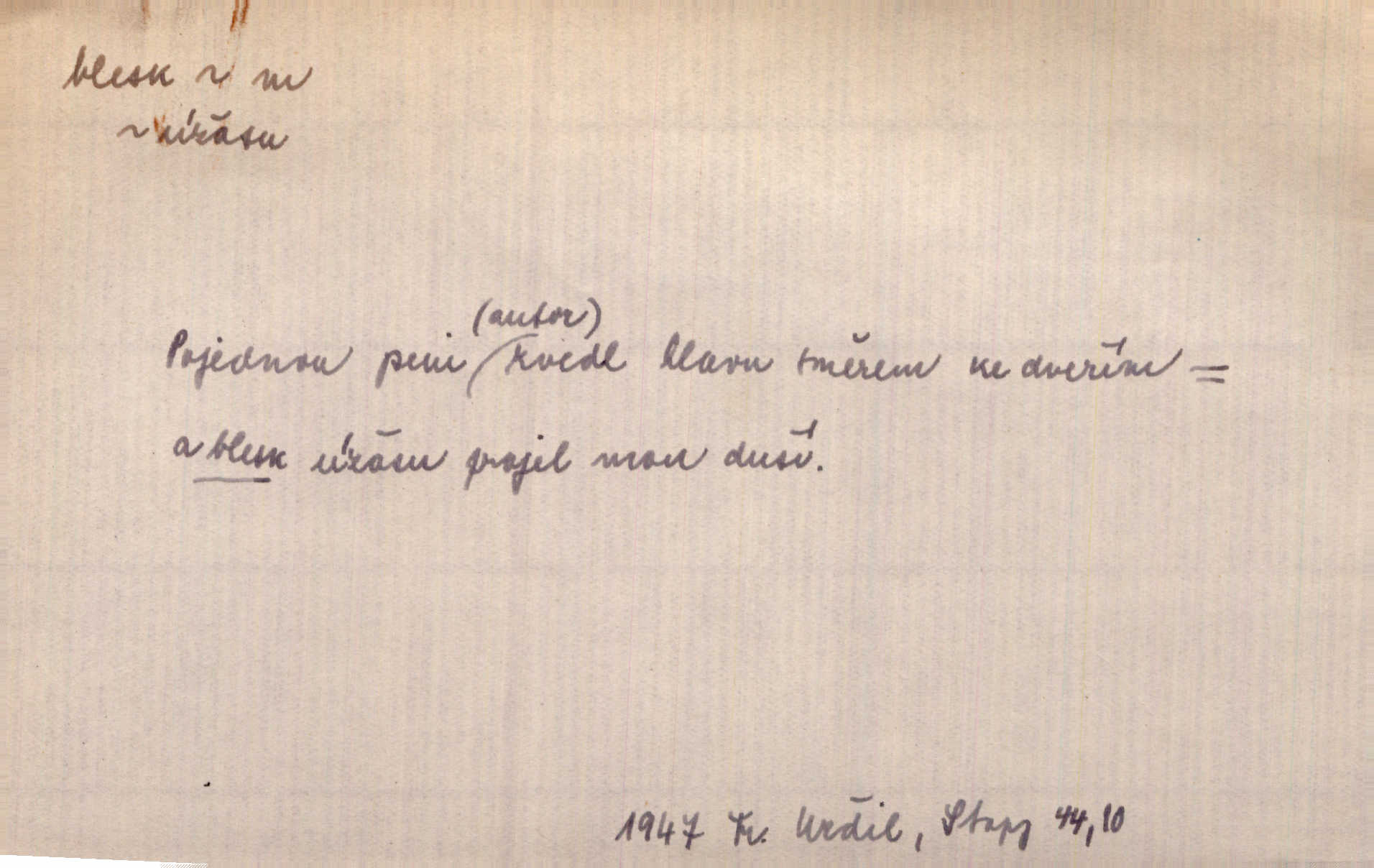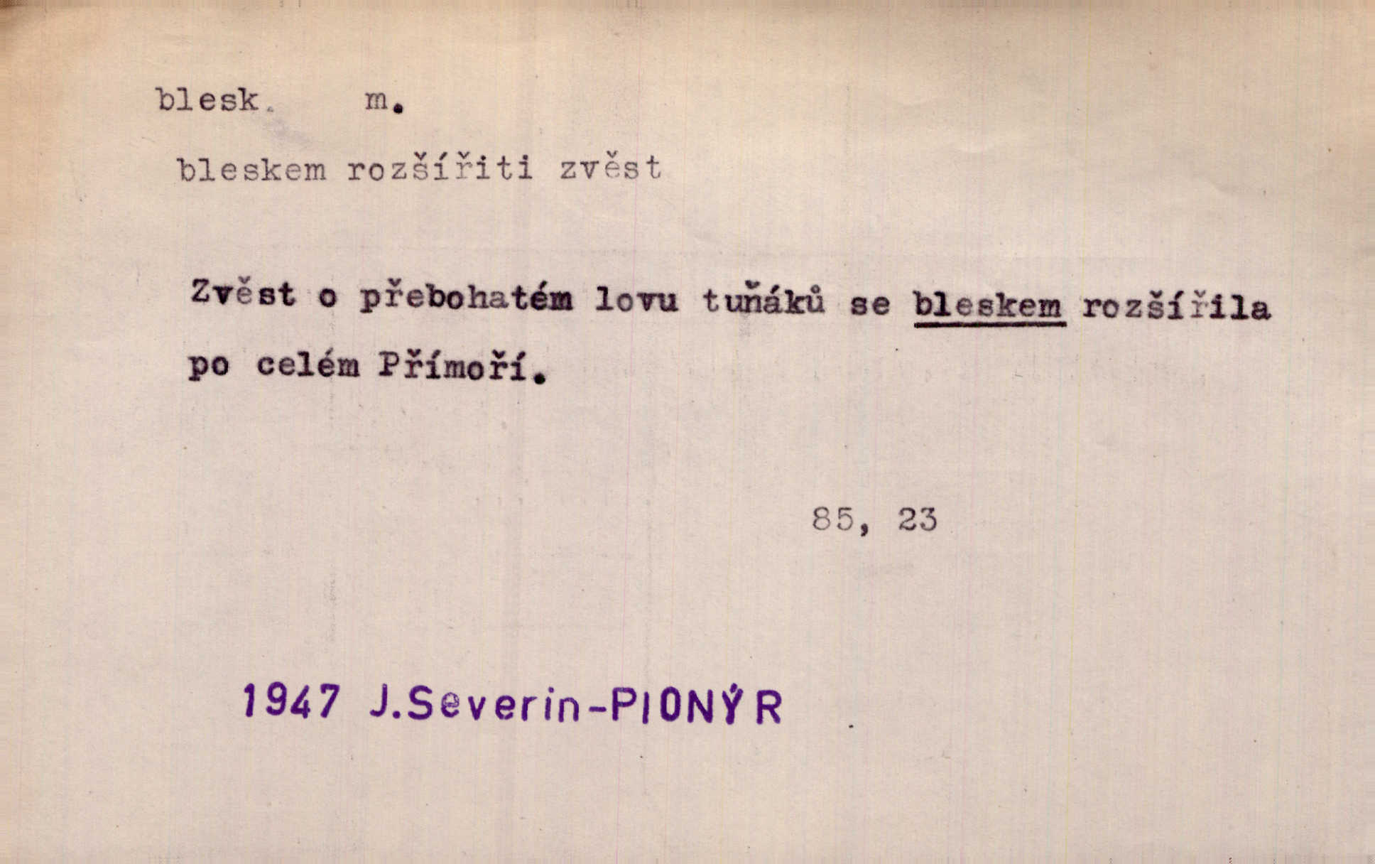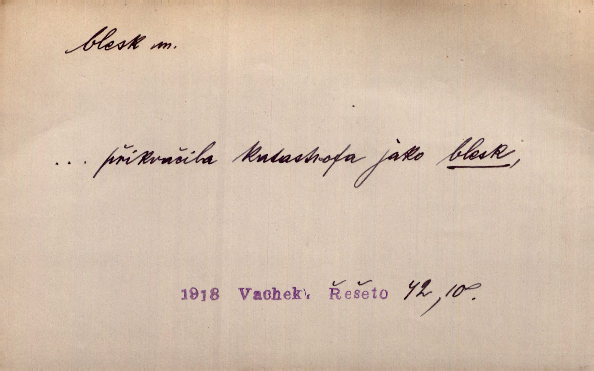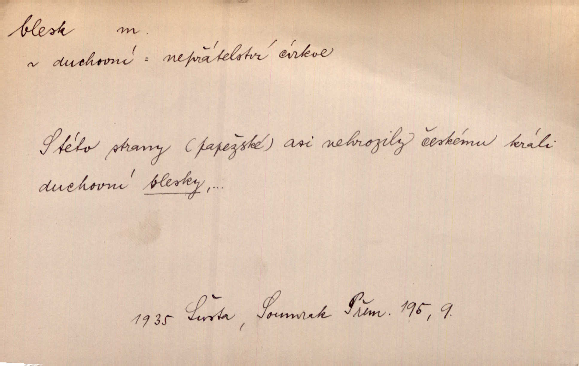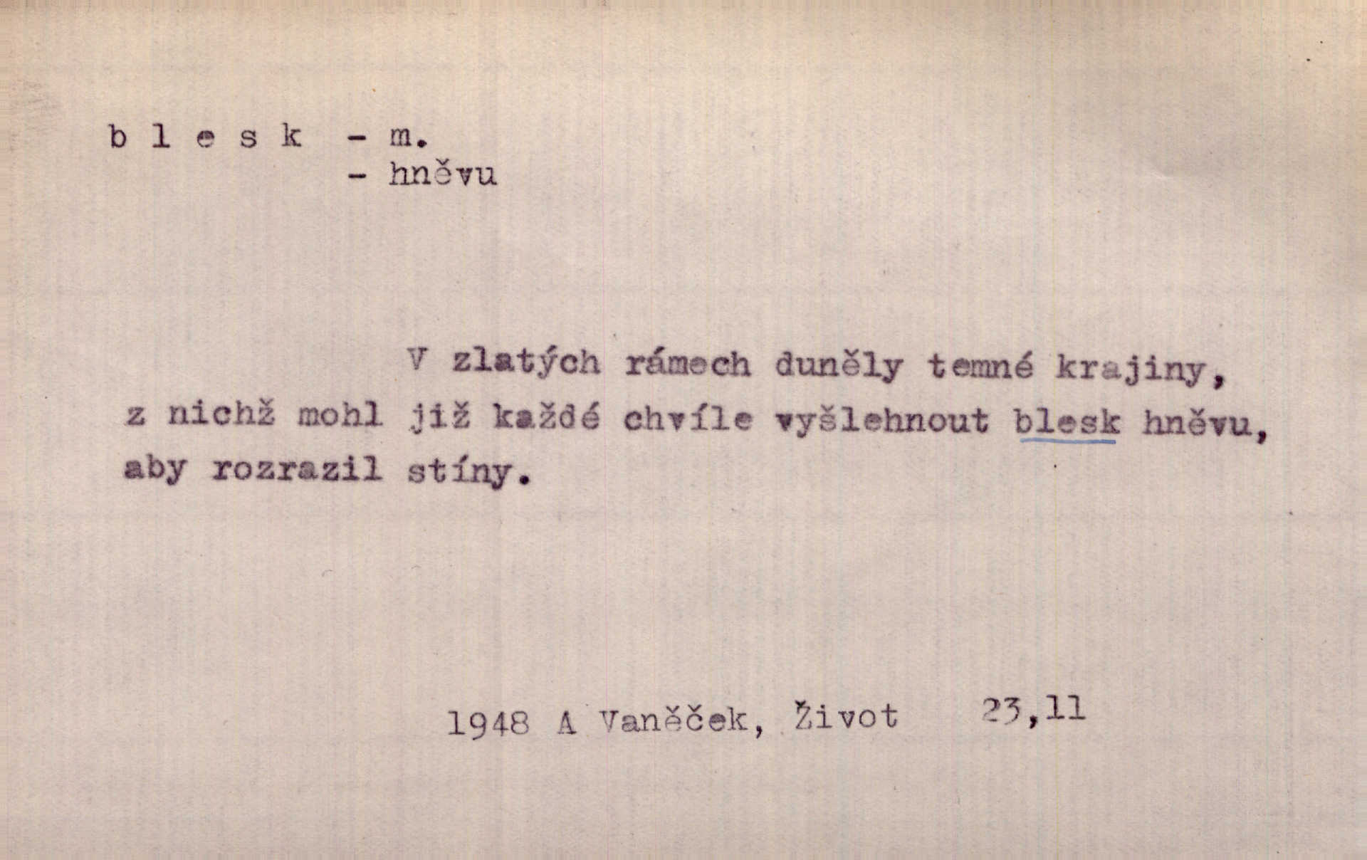 - blesk, -u m. světelný jev při bouřce způsobovaný výbojem elektřiny. Nebe se otvíralo v blescích. Podl. Vichřice duje, blesk se s bleskem stíhá. Krás. Blesky se křižují. Blesk udeřil. Blesk kulový, jiskrový, plošný. V tom jí jako blesk projela hlavou myšlenka, že snad Havel musí na vojnu. Prav. Koně ucítivše volnost, letěli nyní ne již šípem, ale bleskem, šíleně. Zey. Tu se mu však panna Adlička bleskem, jako úhoř, z rukou vyvinula. Jir. D ostré, prudké světlo; intensivní lesk, třpyt. Oči mu zářily v blesku měsíce. A. Mrš. Zlatý, bitý pás, v němž zářilo a blesky metalo drahé kamení, Jir. Blesk oceli se šerou síní mih’. Zey. Podívá se a blesk vyšlehne z černých žhavých očí jejích. Baar. Lev potřásá svou hřívou, blesky hází z očí. Vrch. D náhlé zaplanutí očí jako projev prudkého citu. Má milá přišla, v očích smavých jí radostí blesk jasně plál. Mach. Okem šlehl blesk nevýslovné zášti, ruka jela po noži v pasu. Ner. Tu blesk prudkého vzdoru se jí zaskvěl v očích. Dur. Z oček sršely blesky jízlivosti. Arb. D Přen. Oslňoval je rád bleskem svého ducha. Čech. Bás. Jak upoutati libelulu, která, modrý blesk, se míhá nad vodou u věčném pohybu jak vítr? Zey. D lesk a blesk vnější okázalost, nádhera. Marný, mizerný svět, po lesku a blesku baživá směsice bez ladu a skladu. Tyl. Slečna Julinka stála před zrcadlem v plném lesku a blesku. Kosm. D při zvolání a klení: blesky boží!, živé blesky!, hromy a blesky! Blesky boží! proklatí ti ptáci. Staš. Hromy a blesky, pusťte mne, nebo zapomenu všecky rytířské zákony. Stroup. Na hromech líhá a na blescích vstává kleje celý den. Sez.