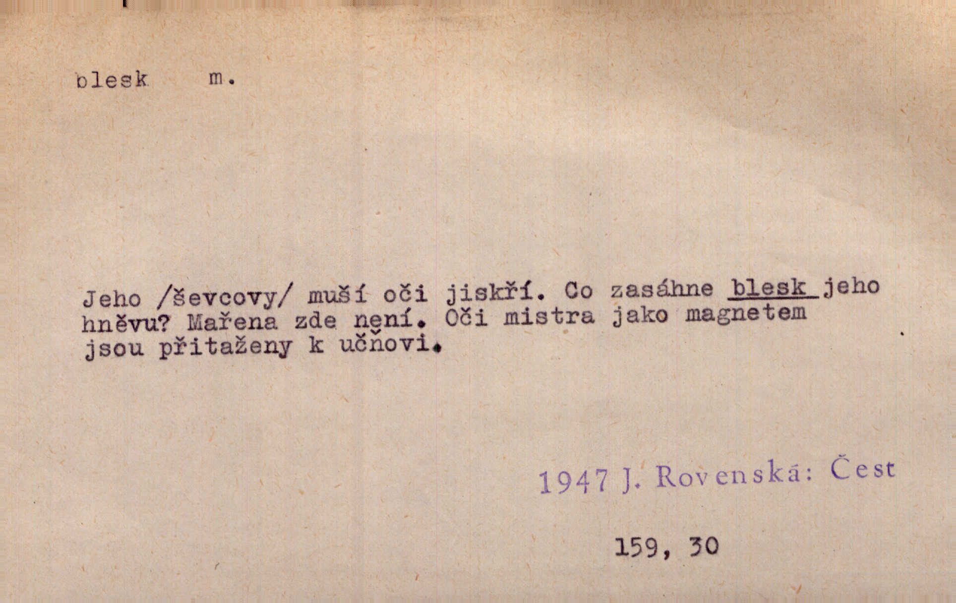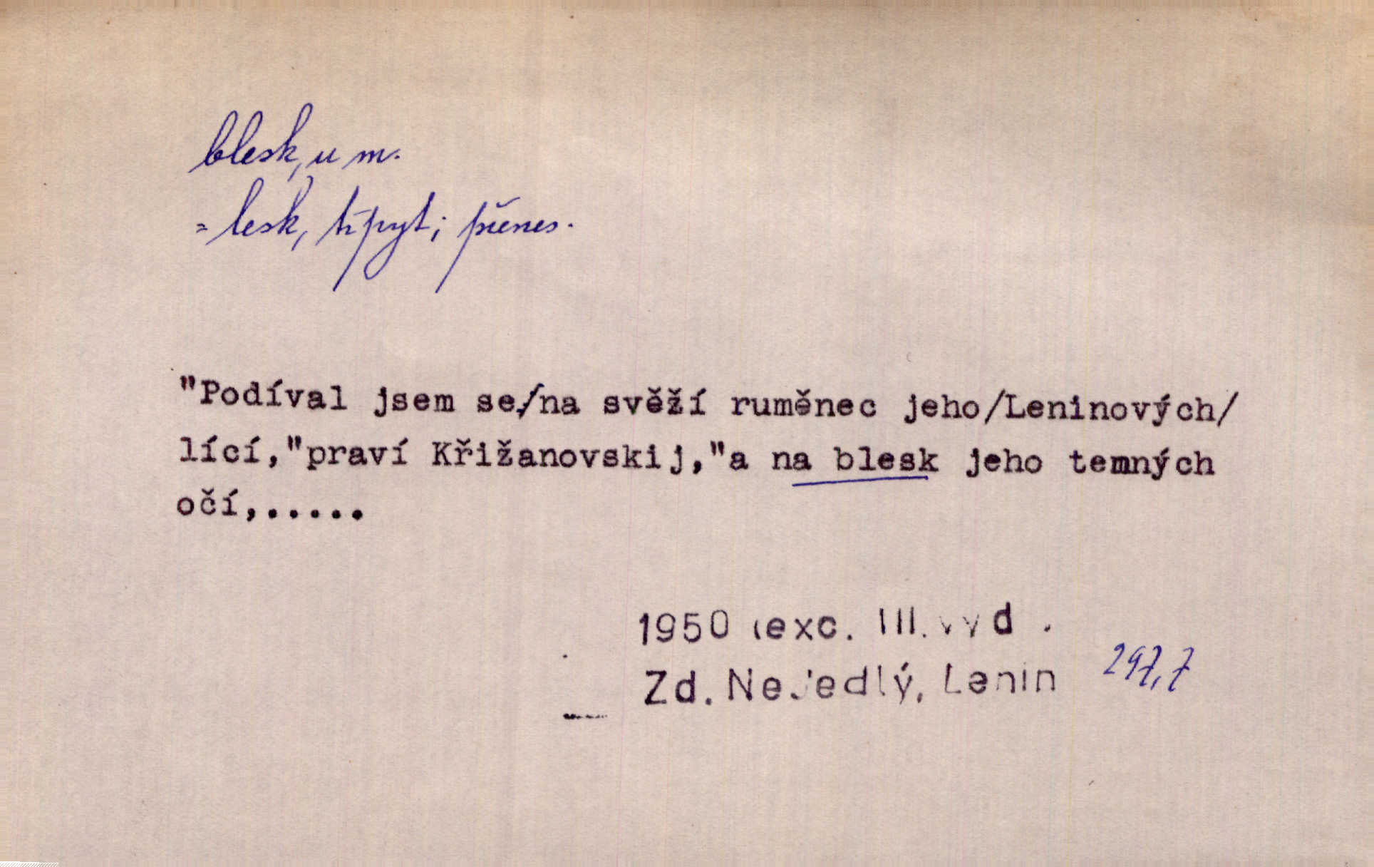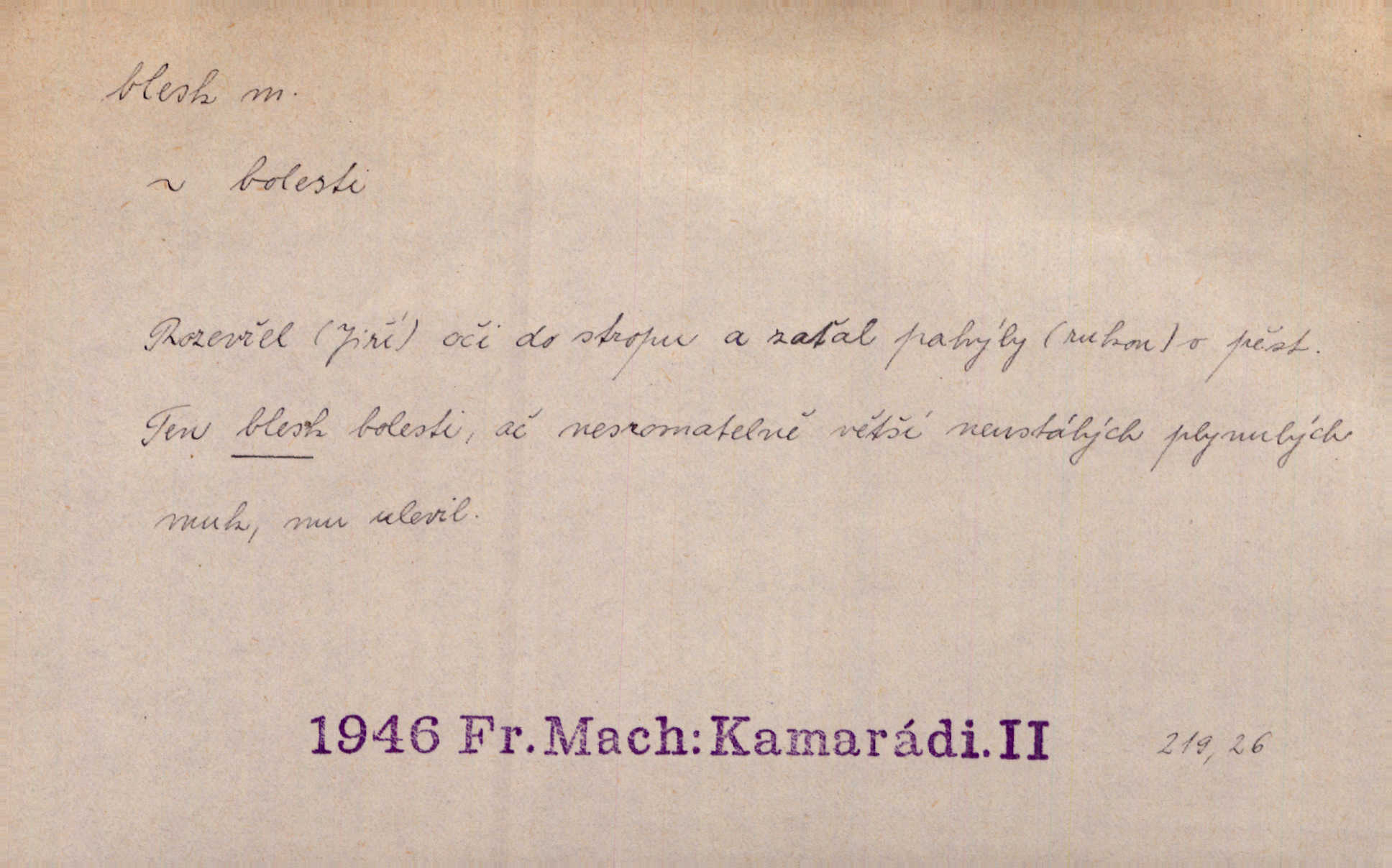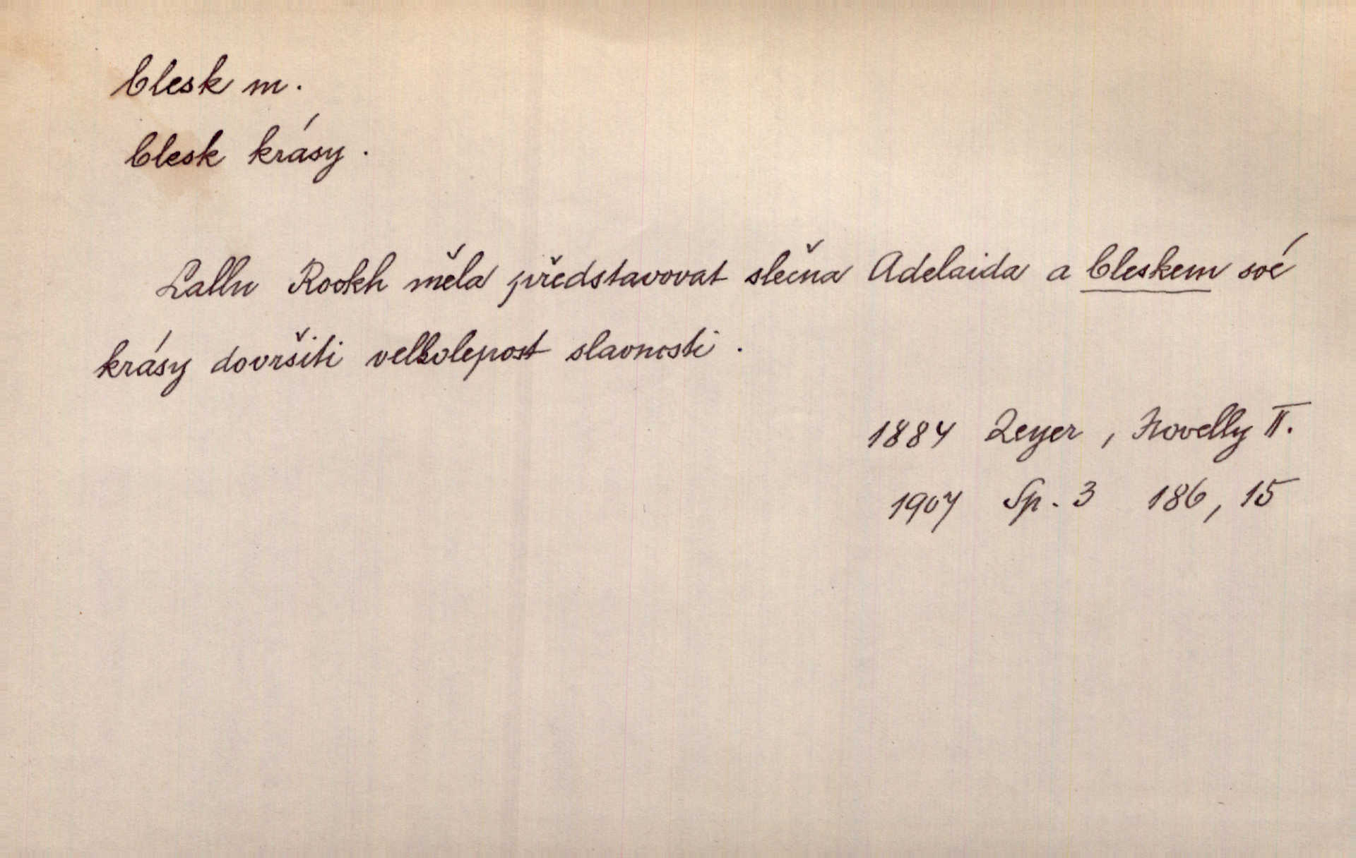 - blesk, -u m. světelný jev při bouřce způsobovaný výbojem elektřiny. Nebe se otvíralo v blescích. Podl. Vichřice duje, blesk se s bleskem stíhá. Krás. Blesky se křižují. Blesk udeřil. Blesk kulový, jiskrový, plošný. V tom jí jako blesk projela hlavou myšlenka, že snad Havel musí na vojnu. Prav. Koně ucítivše volnost, letěli nyní ne již šípem, ale bleskem, šíleně. Zey. Tu se mu však panna Adlička bleskem, jako úhoř, z rukou vyvinula. Jir. D ostré, prudké světlo; intensivní lesk, třpyt. Oči mu zářily v blesku měsíce. A. Mrš. Zlatý, bitý pás, v němž zářilo a blesky metalo drahé kamení, Jir. Blesk oceli se šerou síní mih’. Zey. Podívá se a blesk vyšlehne z černých žhavých očí jejích. Baar. Lev potřásá svou hřívou, blesky hází z očí. Vrch. D náhlé zaplanutí očí jako projev prudkého citu. Má milá přišla, v očích smavých jí radostí blesk jasně plál. Mach. Okem šlehl blesk nevýslovné zášti, ruka jela po noži v pasu. Ner. Tu blesk prudkého vzdoru se jí zaskvěl v očích. Dur. Z oček sršely blesky jízlivosti. Arb. D Přen. Oslňoval je rád bleskem svého ducha. Čech. Bás. Jak upoutati libelulu, která, modrý blesk, se míhá nad vodou u věčném pohybu jak vítr? Zey. D lesk a blesk vnější okázalost, nádhera. Marný, mizerný svět, po lesku a blesku baživá směsice bez ladu a skladu. Tyl. Slečna Julinka stála před zrcadlem v plném lesku a blesku. Kosm. D při zvolání a klení: blesky boží!, živé blesky!, hromy a blesky! Blesky boží! proklatí ti ptáci. Staš. Hromy a blesky, pusťte mne, nebo zapomenu všecky rytířské zákony. Stroup. Na hromech líhá a na blescích vstává kleje celý den. Sez.
