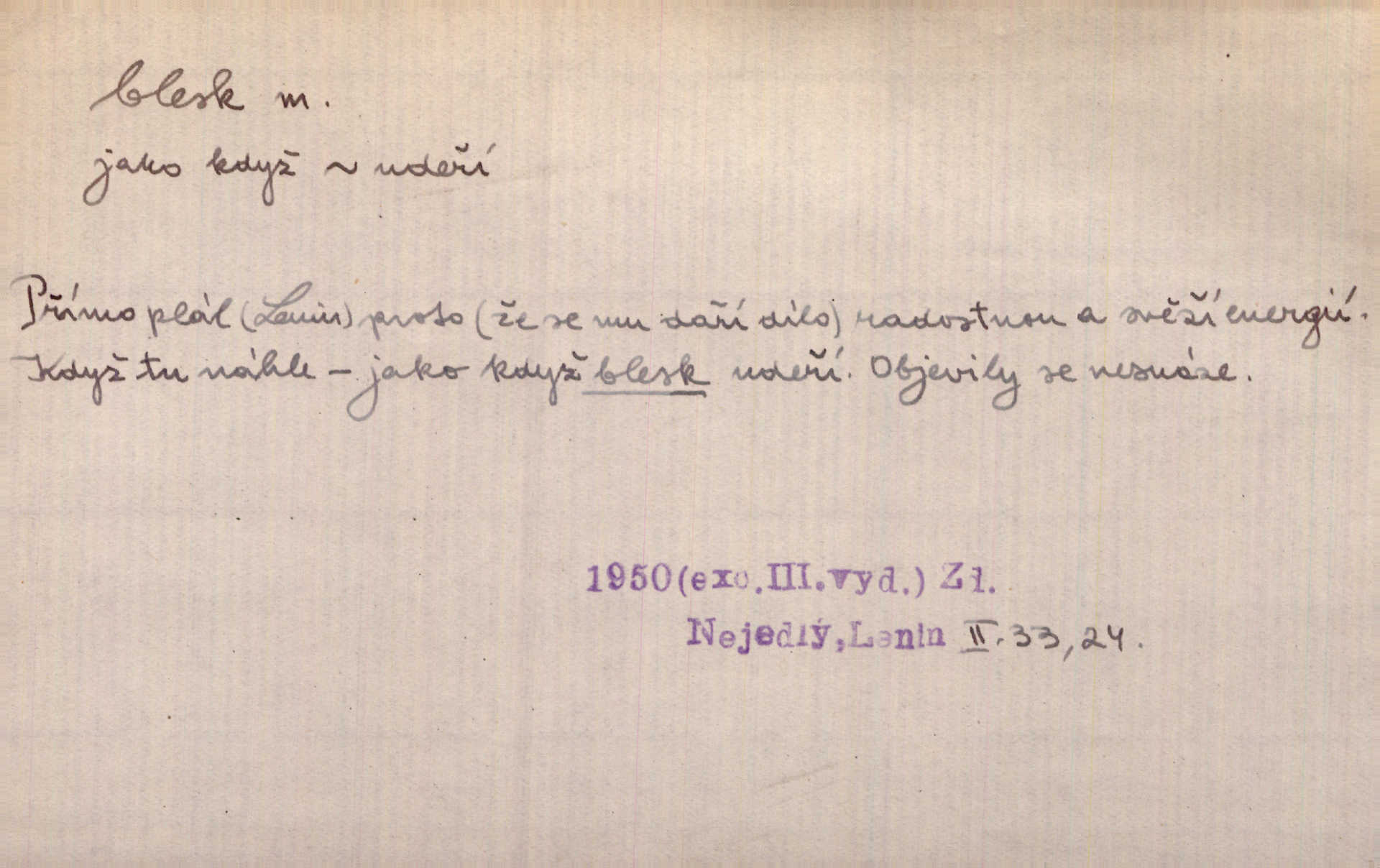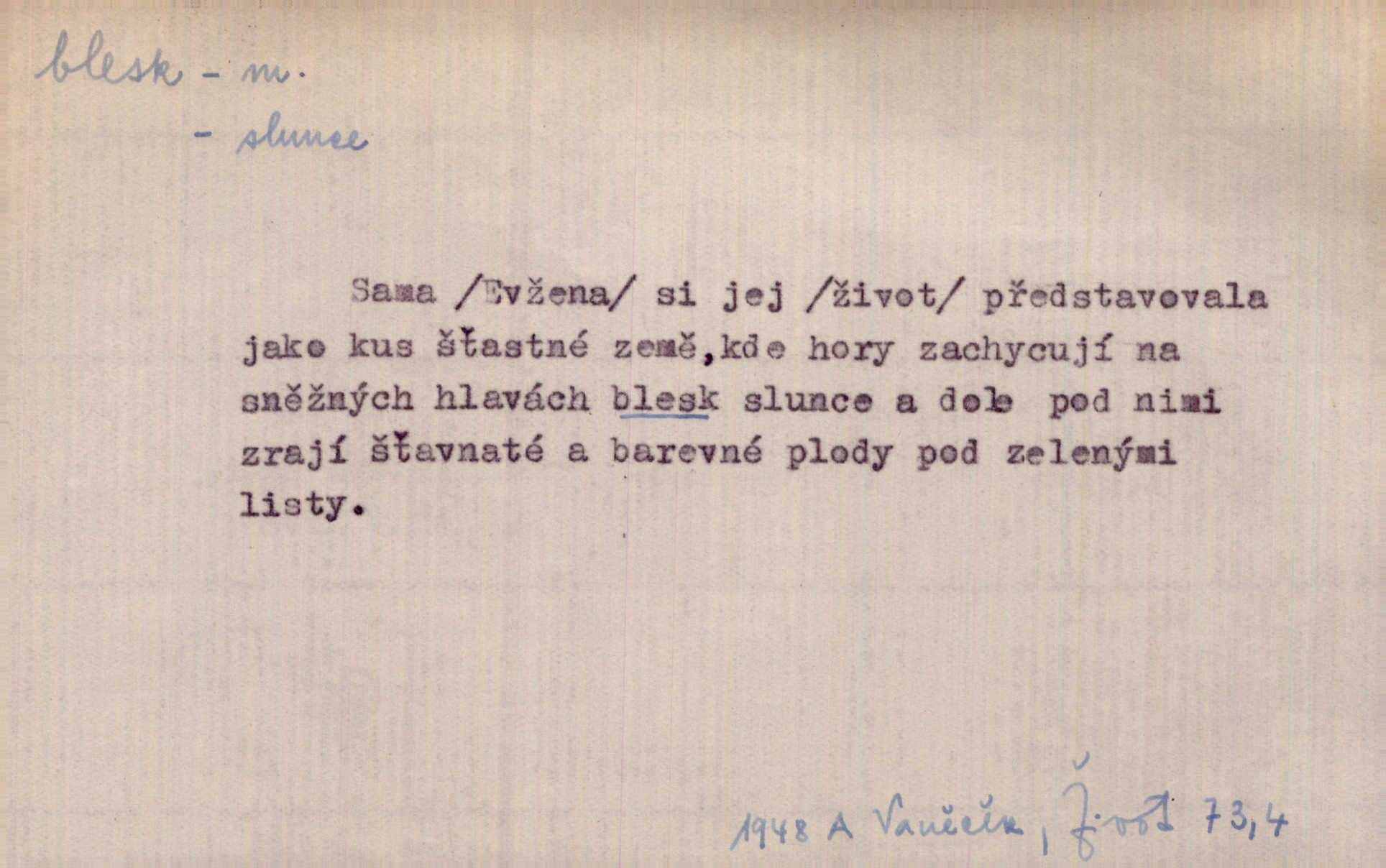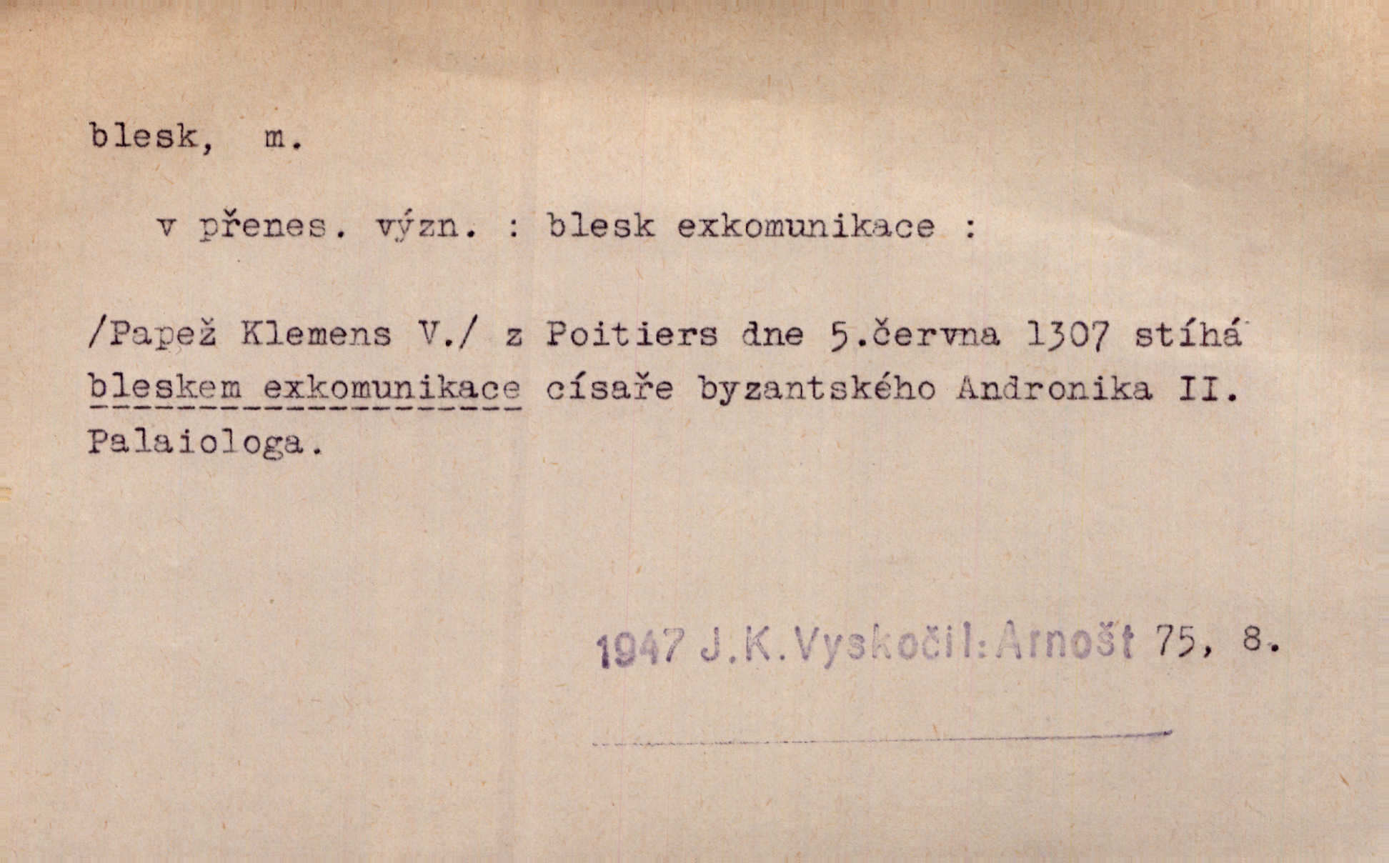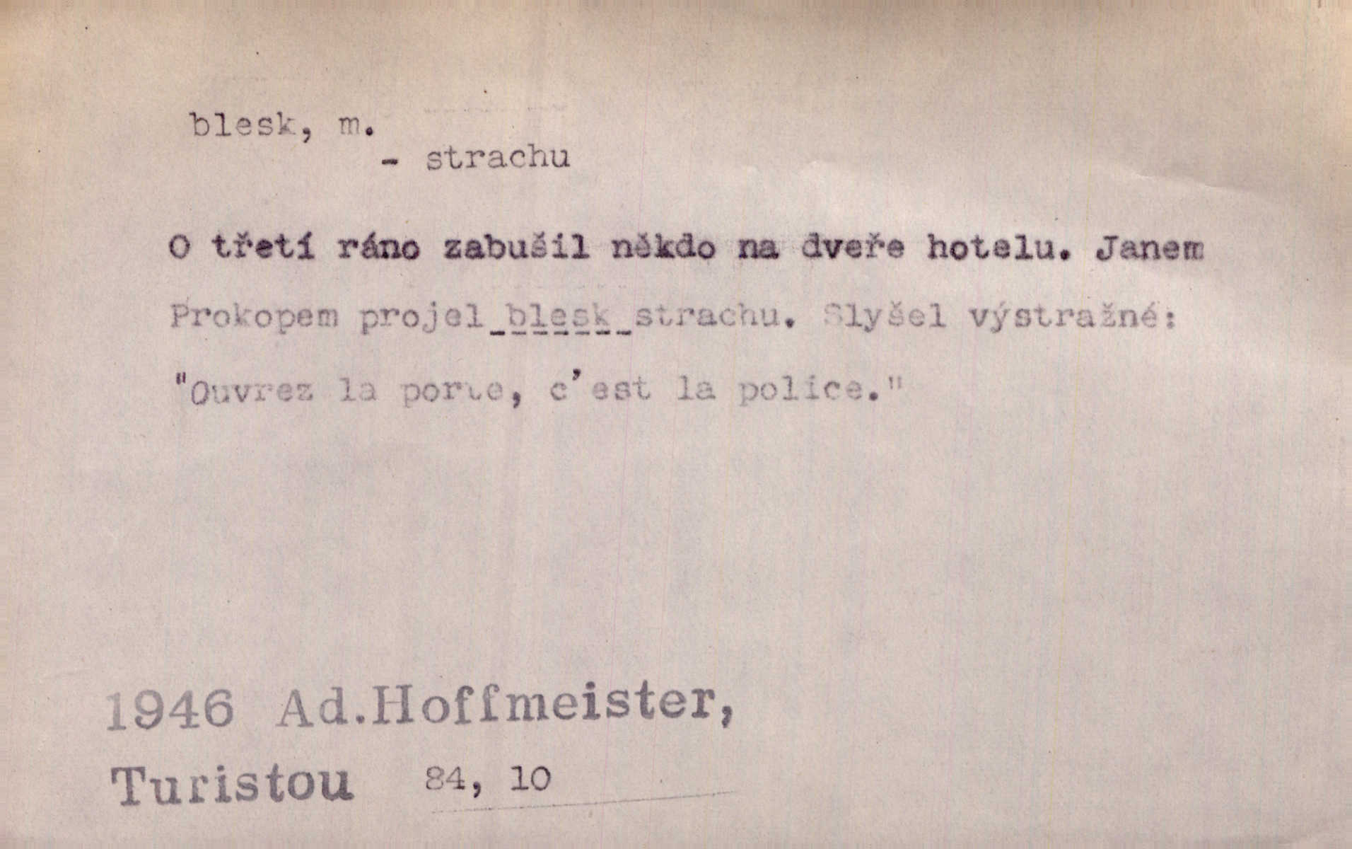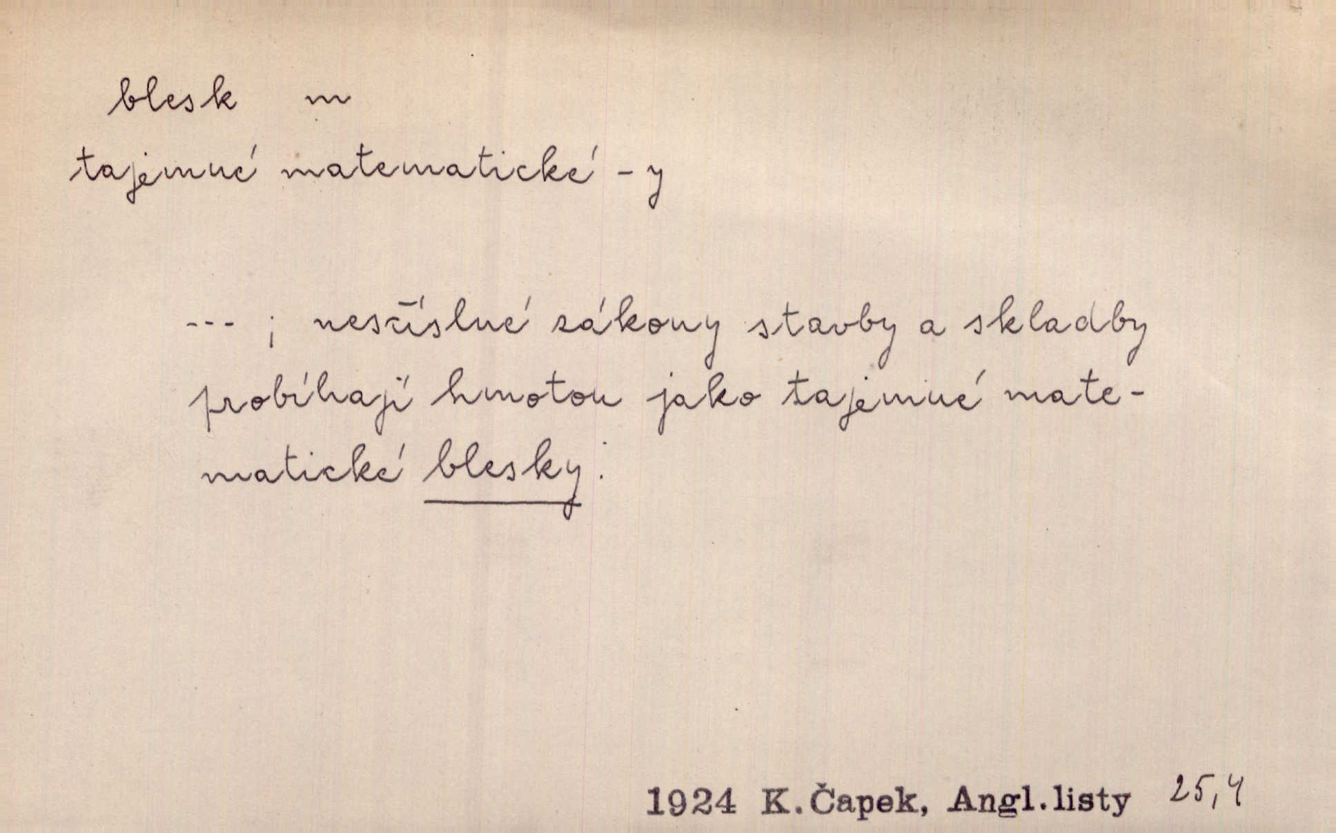- blesk, -u m. světelný jev při bouřce způsobovaný výbojem elektřiny. Nebe se otvíralo v blescích. Podl. Vichřice duje, blesk se s bleskem stíhá. Krás. Blesky se křižují. Blesk udeřil. Blesk kulový, jiskrový, plošný. V tom jí jako blesk projela hlavou myšlenka, že snad Havel musí na vojnu. Prav. Koně ucítivše volnost, letěli nyní ne již šípem, ale bleskem, šíleně. Zey. Tu se mu však panna Adlička bleskem, jako úhoř, z rukou vyvinula. Jir. D ostré, prudké světlo; intensivní lesk, třpyt. Oči mu zářily v blesku měsíce. A. Mrš. Zlatý, bitý pás, v němž zářilo a blesky metalo drahé kamení, Jir. Blesk oceli se šerou síní mih’. Zey. Podívá se a blesk vyšlehne z černých žhavých očí jejích. Baar. Lev potřásá svou hřívou, blesky hází z očí. Vrch. D náhlé zaplanutí očí jako projev prudkého citu. Má milá přišla, v očích smavých jí radostí blesk jasně plál. Mach. Okem šlehl blesk nevýslovné zášti, ruka jela po noži v pasu. Ner. Tu blesk prudkého vzdoru se jí zaskvěl v očích. Dur. Z oček sršely blesky jízlivosti. Arb. D Přen. Oslňoval je rád bleskem svého ducha. Čech. Bás. Jak upoutati libelulu, která, modrý blesk, se míhá nad vodou u věčném pohybu jak vítr? Zey. D lesk a blesk vnější okázalost, nádhera. Marný, mizerný svět, po lesku a blesku baživá směsice bez ladu a skladu. Tyl. Slečna Julinka stála před zrcadlem v plném lesku a blesku. Kosm. D při zvolání a klení: blesky boží!, živé blesky!, hromy a blesky! Blesky boží! proklatí ti ptáci. Staš. Hromy a blesky, pusťte mne, nebo zapomenu všecky rytířské zákony. Stroup. Na hromech líhá a na blescích vstává kleje celý den. Sez.