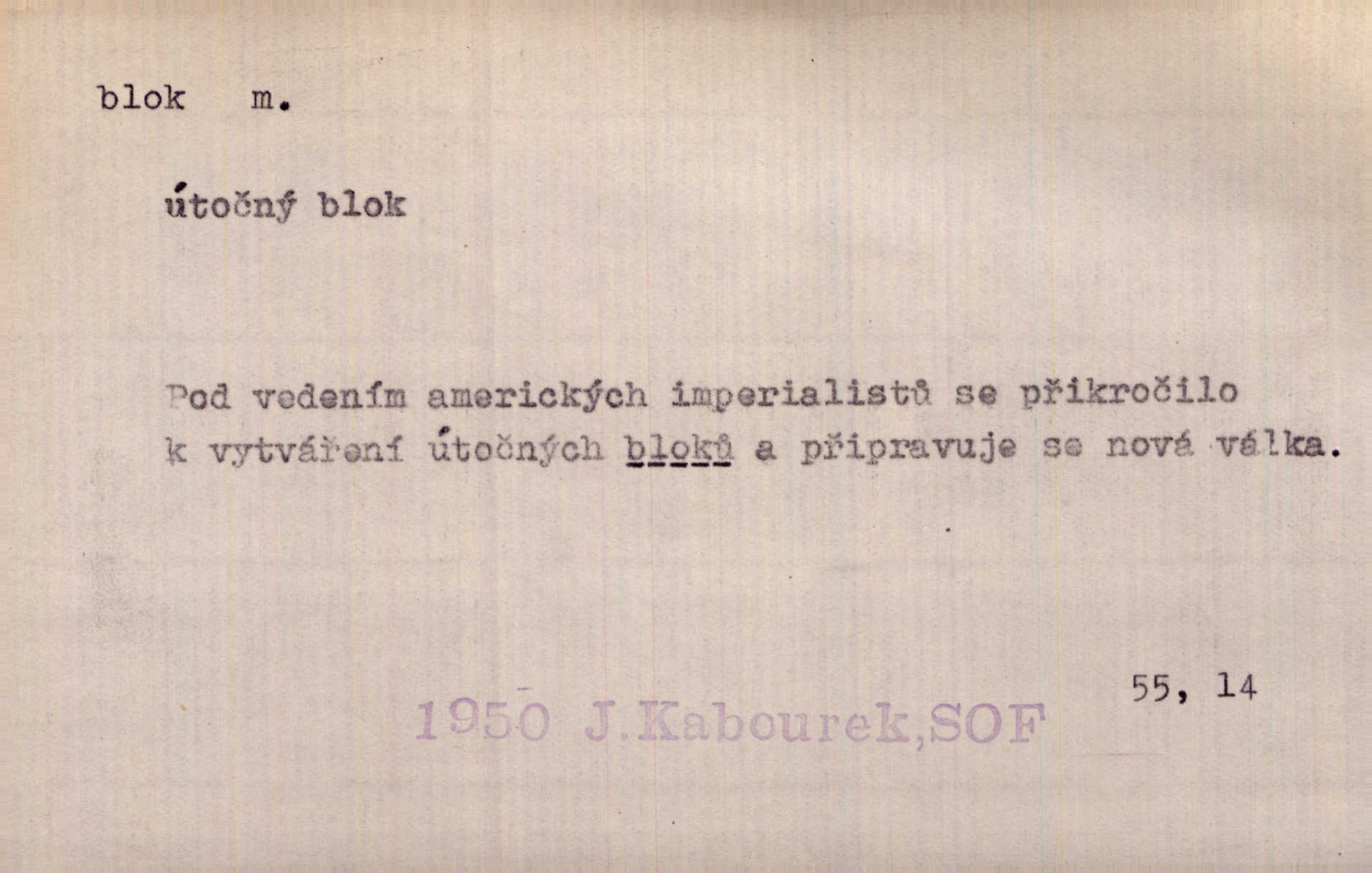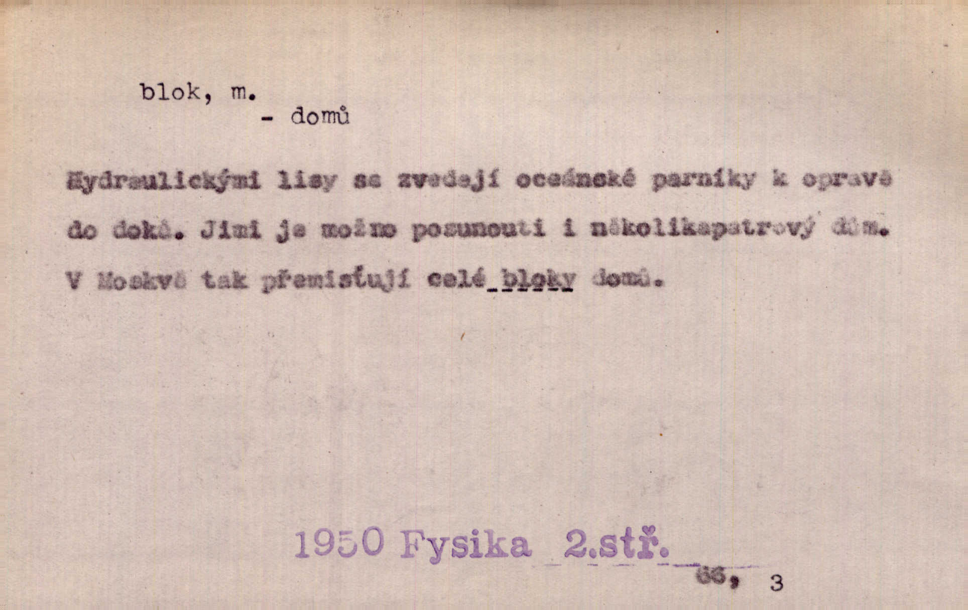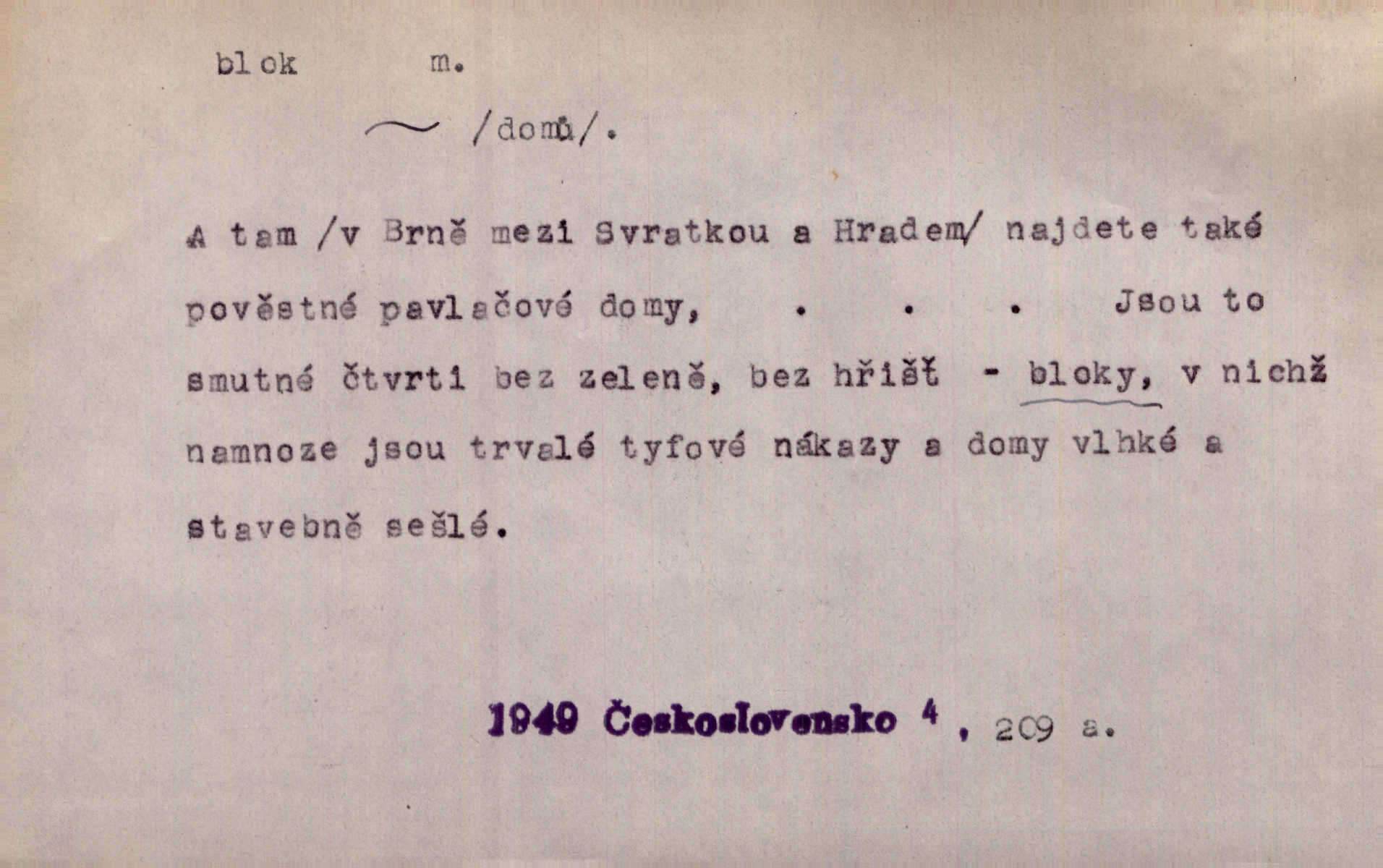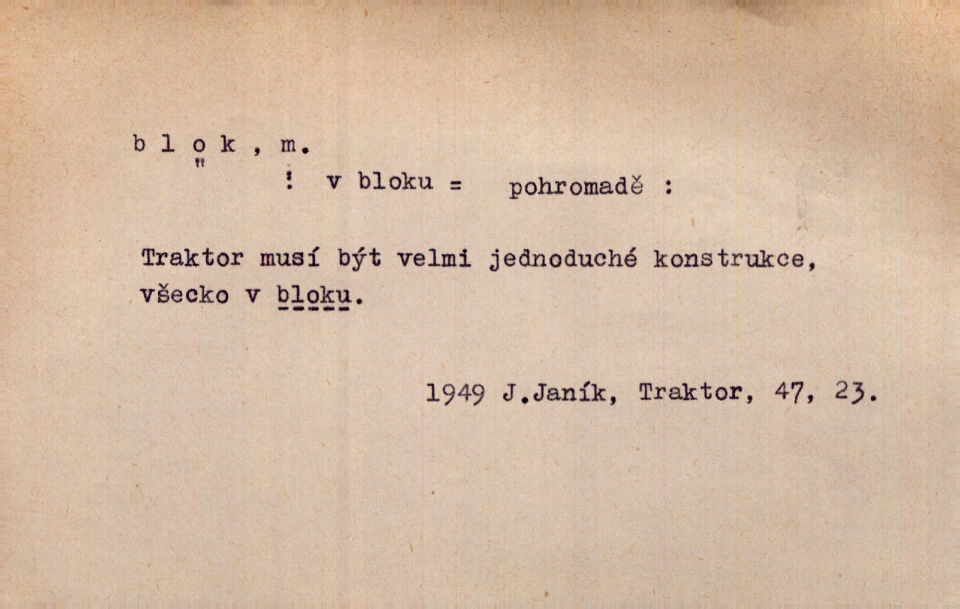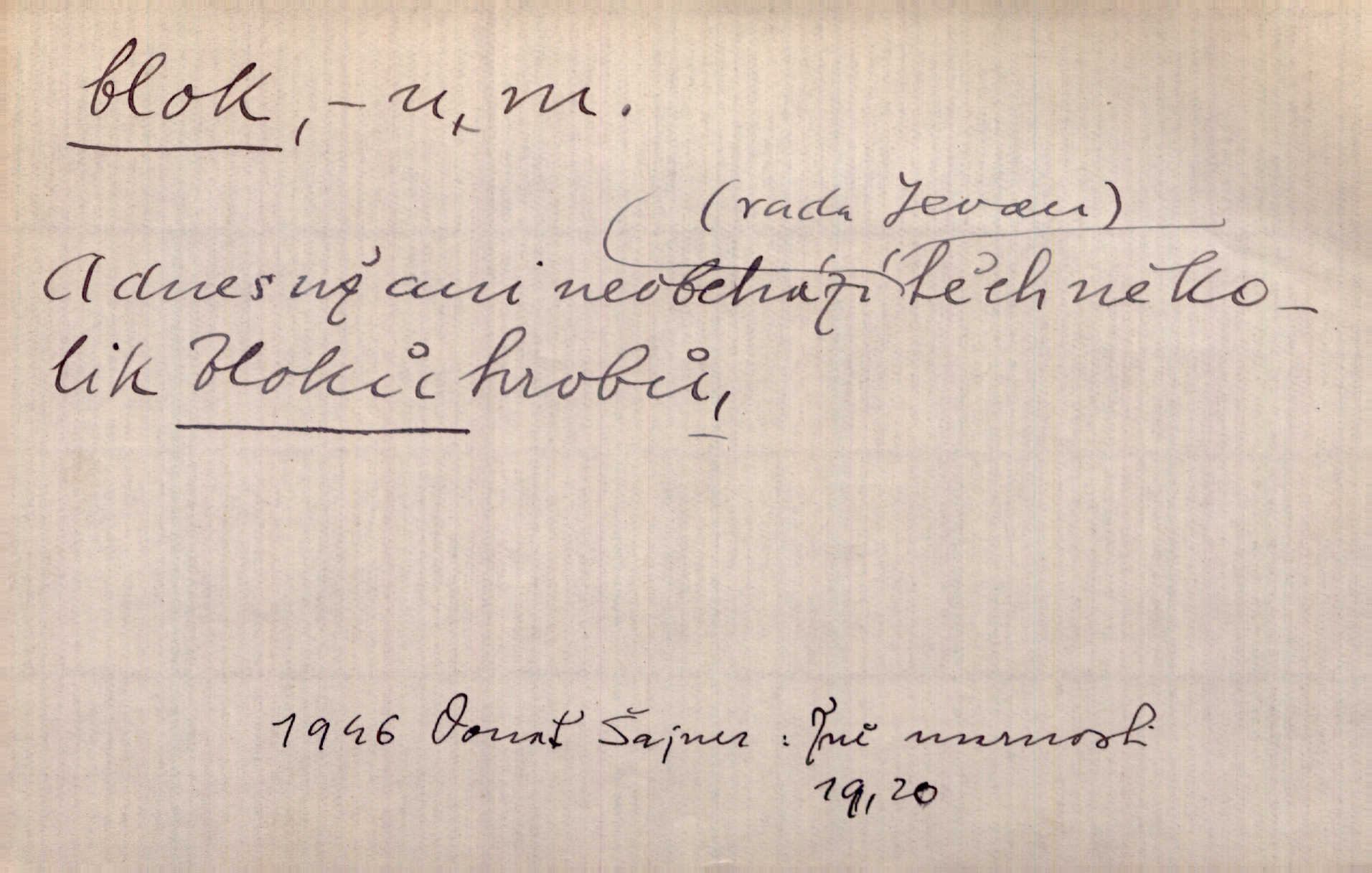 - blok, -u m. skupina domů. Stavěti dům vedle domu, bloky, ulice, město. Lang. D seskupení jistých samostatných organisací se stejnými zájmy, na př. politických stran a pod. Zlatý blok skupina států, které setrvávají při zlaté měně. Země se zlatou měnou se měly státi zároveň blokem hospodářským. Nár. l. První útok vyjde ze socialistického bloku. Mach. D svazek listů papíru a p. Vyňav plnicí pero a blok, jal se psáti recept. Čap. Ch. Blok pokladní, blok poštovních známek. Blok předplatní (v divadle). D Námoř. kladkovnice. Žel. jeden z úseků, na něž je rozdělena trať mezi dvěma stanicemi pro zvýšení bezpečnosti vlaků. Také zařízení, jímž se elektricky uzavírá a uvolňuje vjezd na jistý úsek trati.