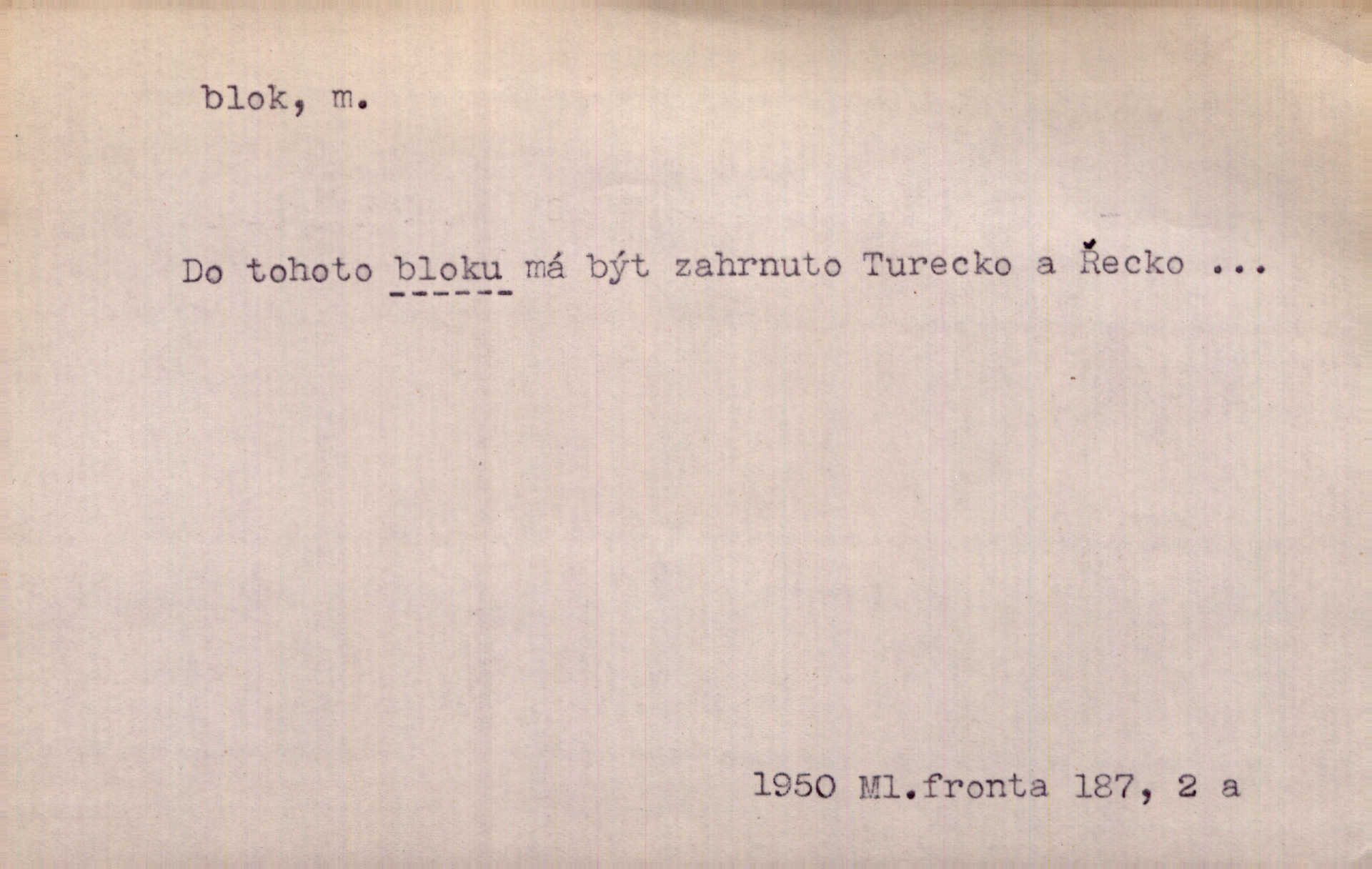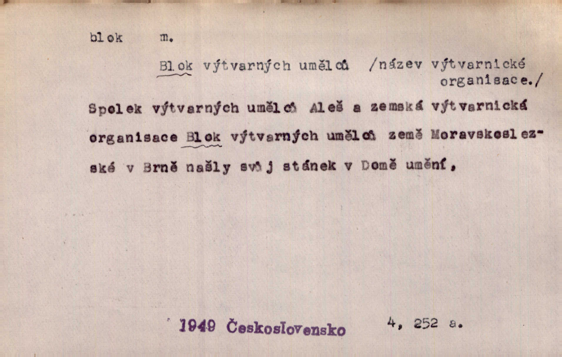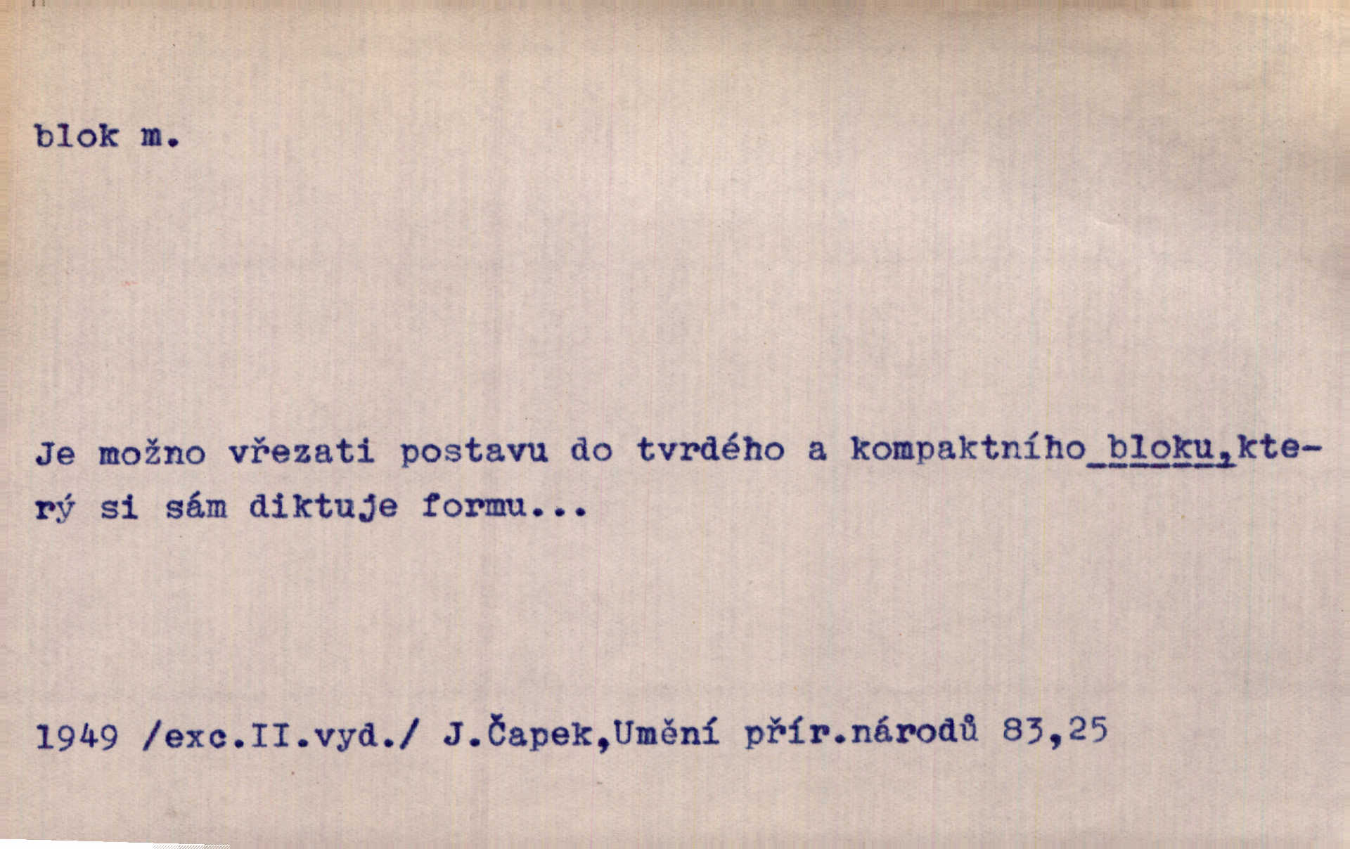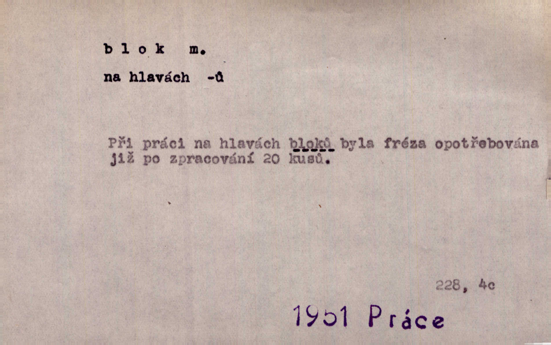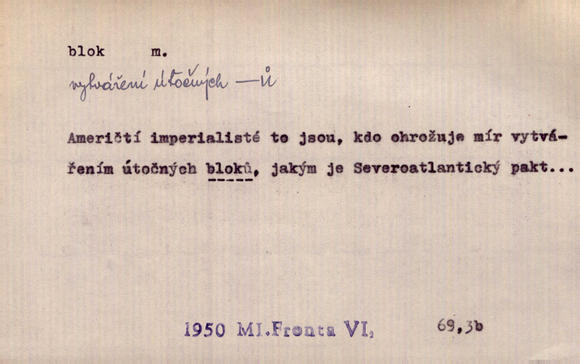 - blok, -u m. skupina domů. Stavěti dům vedle domu, bloky, ulice, město. Lang. D seskupení jistých samostatných organisací se stejnými zájmy, na př. politických stran a pod. Zlatý blok skupina států, které setrvávají při zlaté měně. Země se zlatou měnou se měly státi zároveň blokem hospodářským. Nár. l. První útok vyjde ze socialistického bloku. Mach. D svazek listů papíru a p. Vyňav plnicí pero a blok, jal se psáti recept. Čap. Ch. Blok pokladní, blok poštovních známek. Blok předplatní (v divadle). D Námoř. kladkovnice. Žel. jeden z úseků, na něž je rozdělena trať mezi dvěma stanicemi pro zvýšení bezpečnosti vlaků. Také zařízení, jímž se elektricky uzavírá a uvolňuje vjezd na jistý úsek trati.