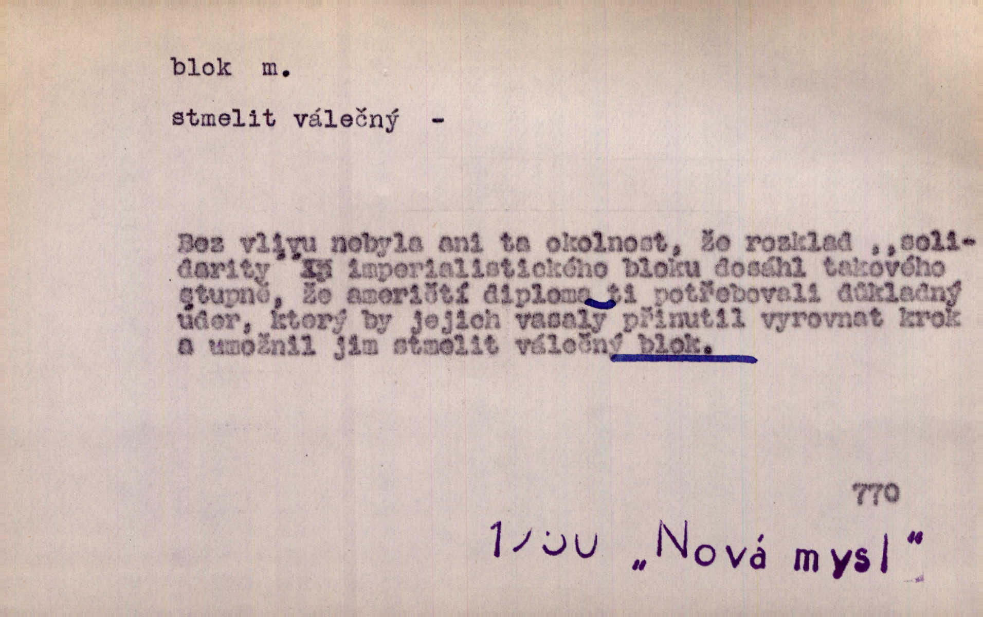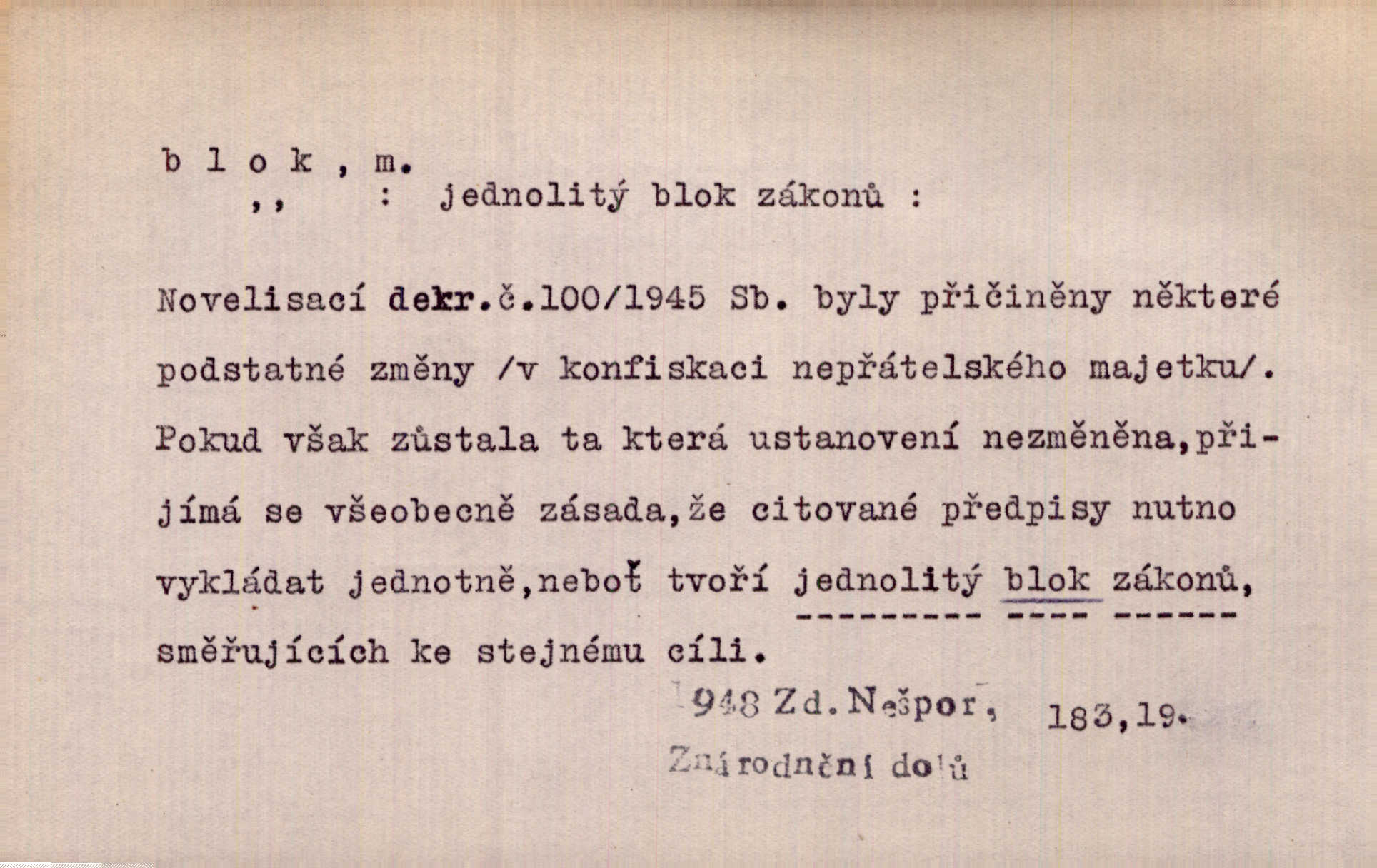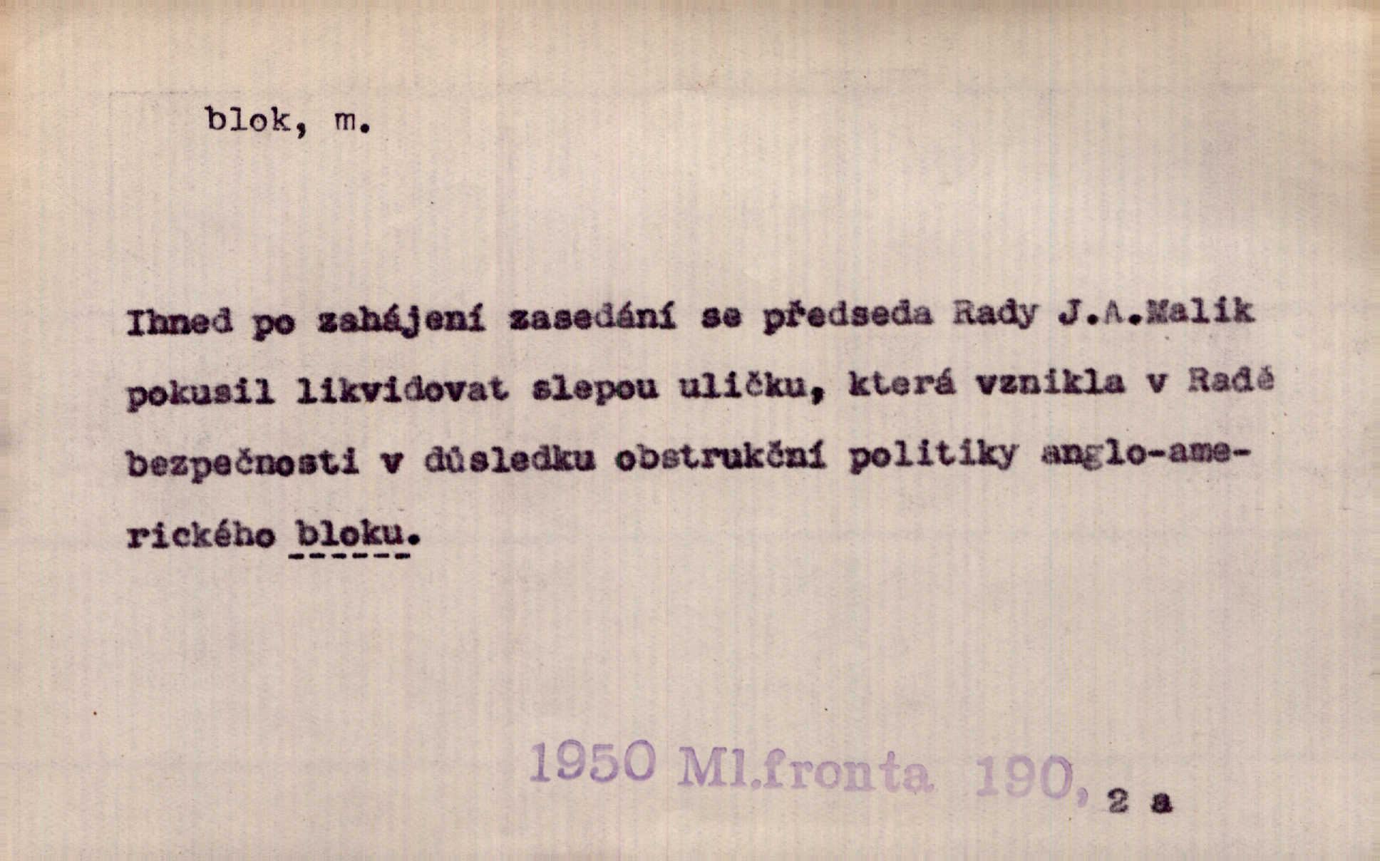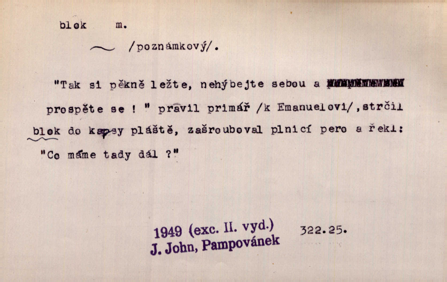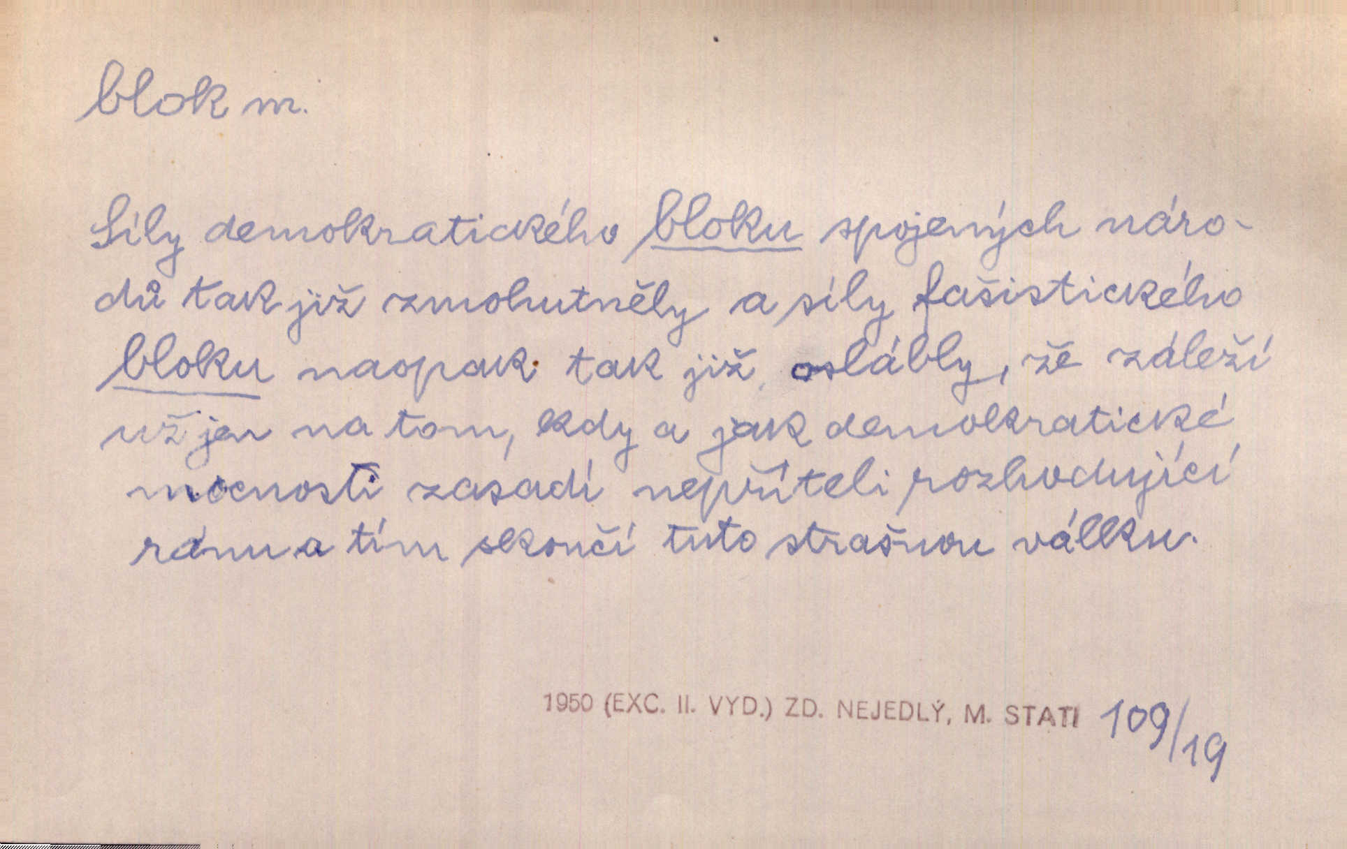 - blok, -u m. skupina domů. Stavěti dům vedle domu, bloky, ulice, město. Lang. D seskupení jistých samostatných organisací se stejnými zájmy, na př. politických stran a pod. Zlatý blok skupina států, které setrvávají při zlaté měně. Země se zlatou měnou se měly státi zároveň blokem hospodářským. Nár. l. První útok vyjde ze socialistického bloku. Mach. D svazek listů papíru a p. Vyňav plnicí pero a blok, jal se psáti recept. Čap. Ch. Blok pokladní, blok poštovních známek. Blok předplatní (v divadle). D Námoř. kladkovnice. Žel. jeden z úseků, na něž je rozdělena trať mezi dvěma stanicemi pro zvýšení bezpečnosti vlaků. Také zařízení, jímž se elektricky uzavírá a uvolňuje vjezd na jistý úsek trati.