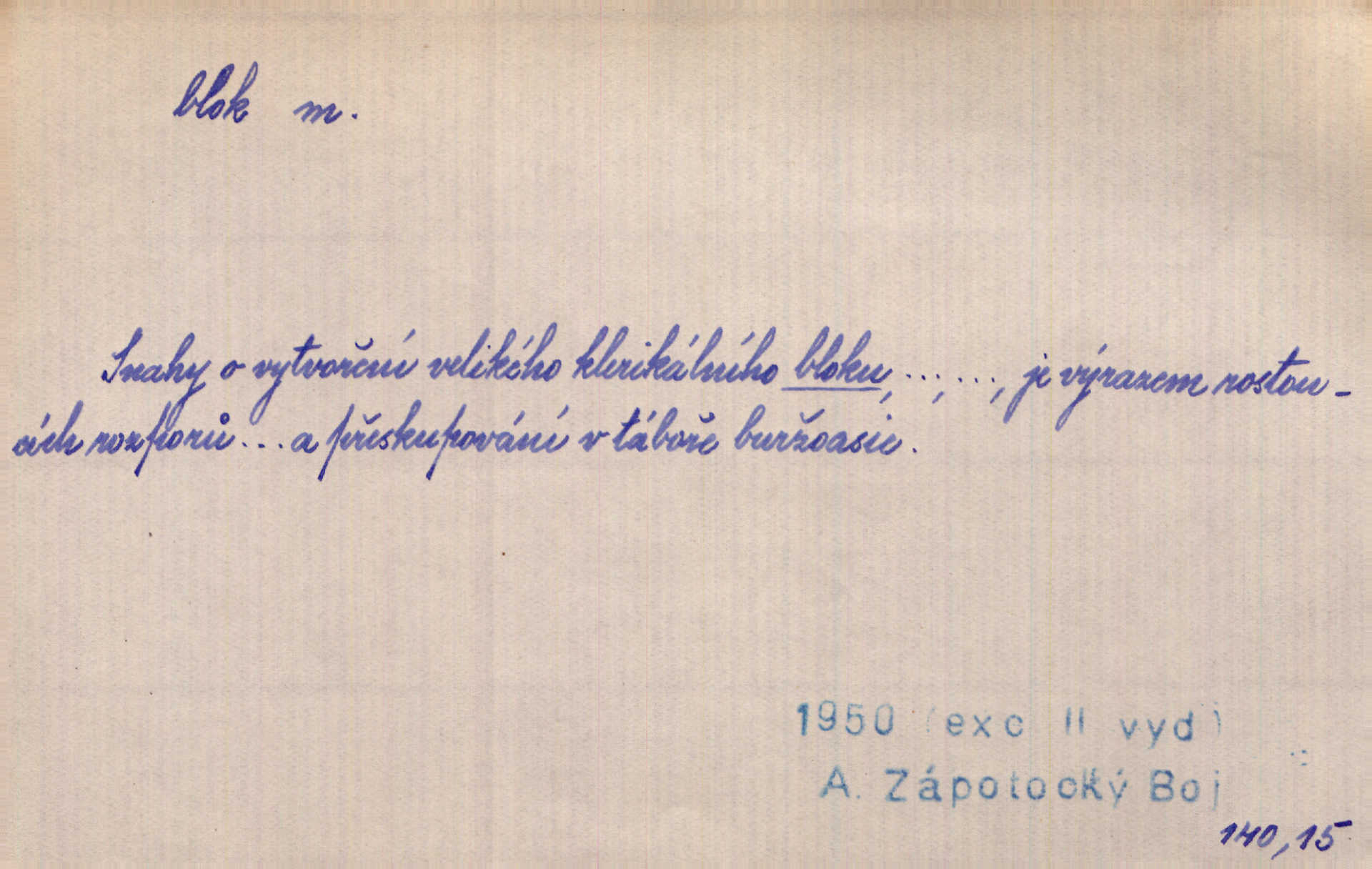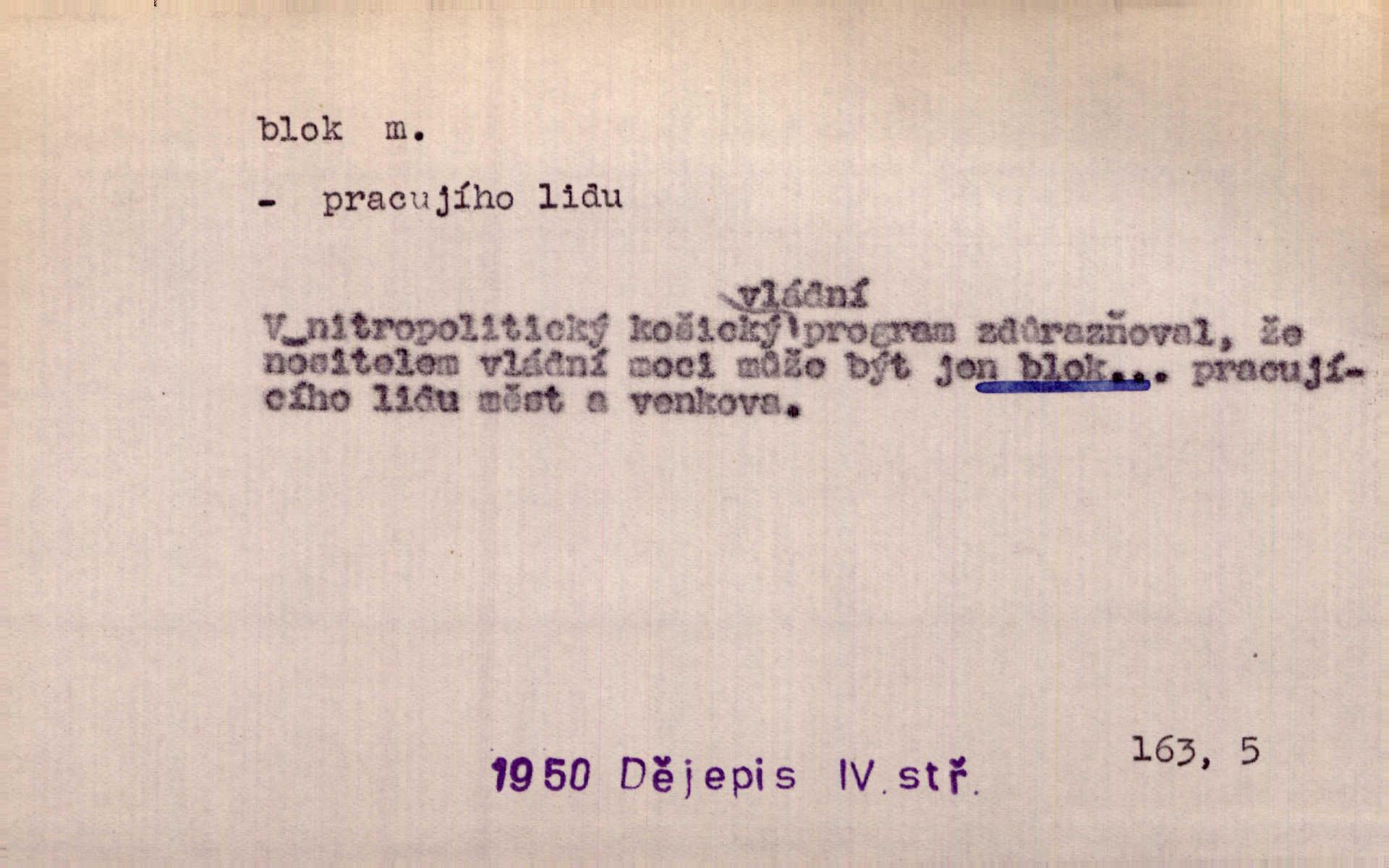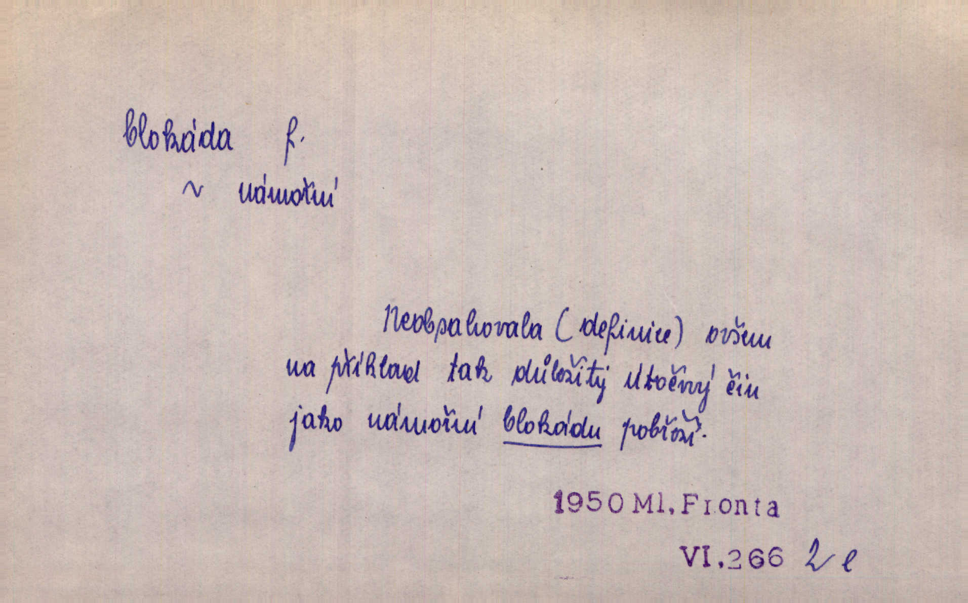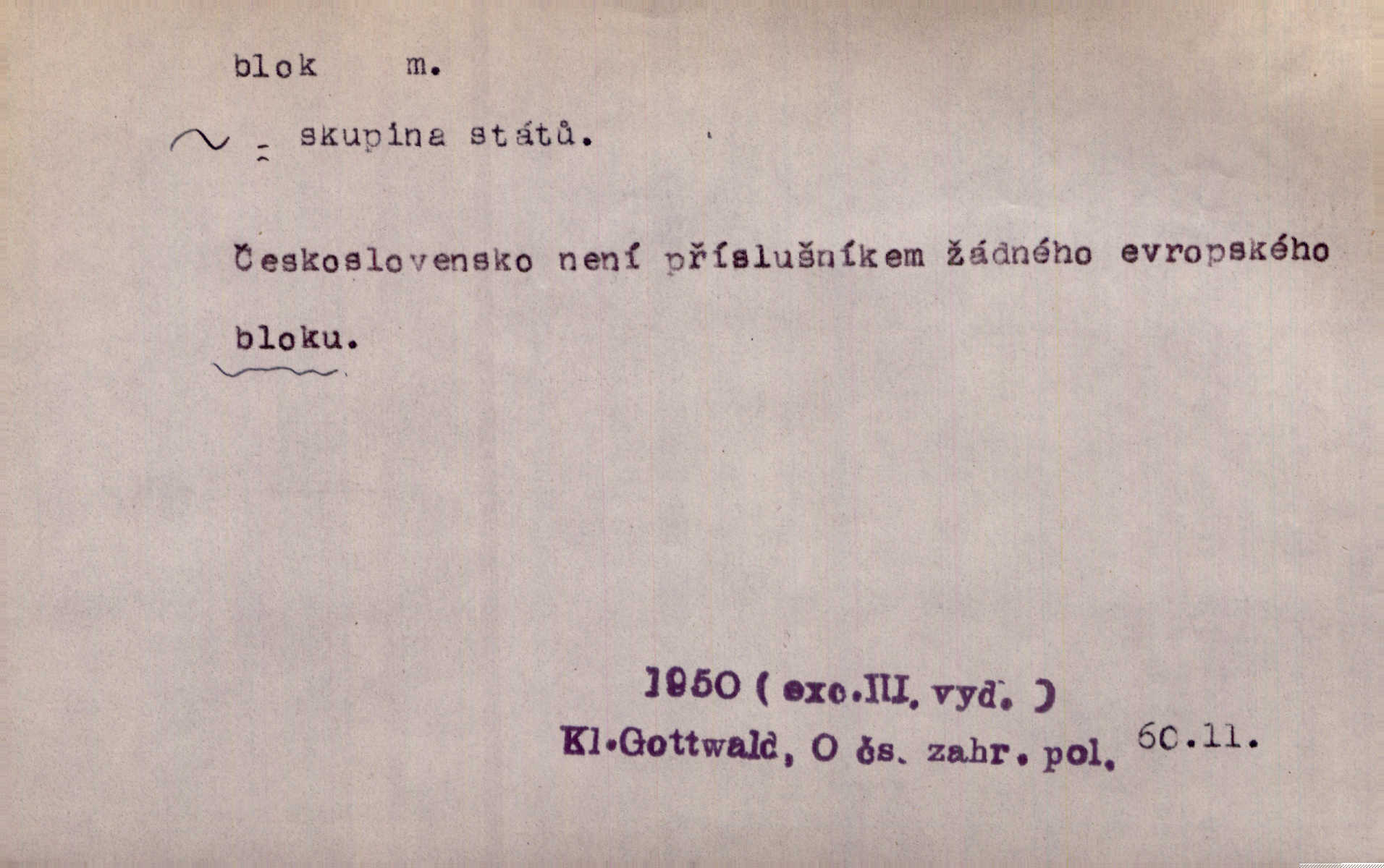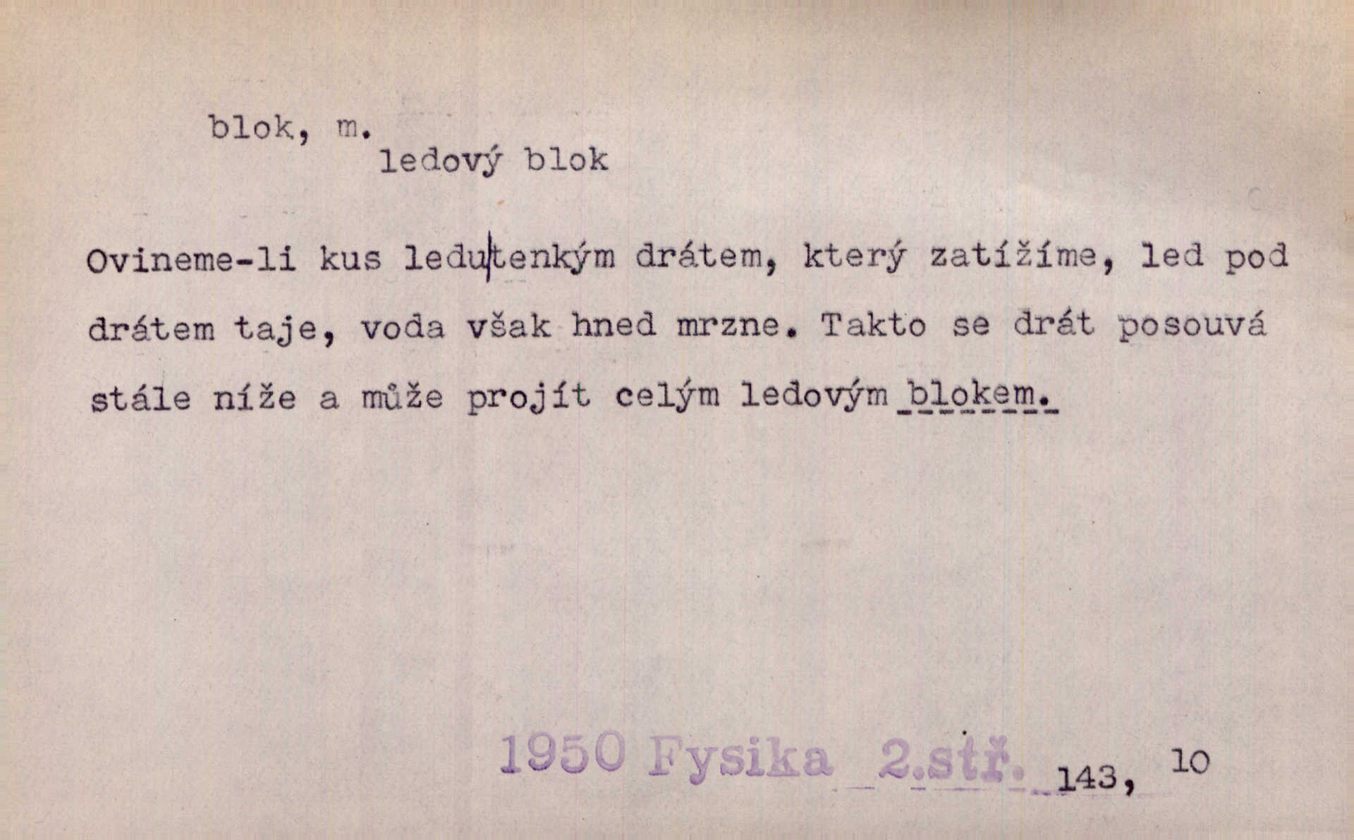 - blok, -u m. skupina domů. Stavěti dům vedle domu, bloky, ulice, město. Lang. D seskupení jistých samostatných organisací se stejnými zájmy, na př. politických stran a pod. Zlatý blok skupina států, které setrvávají při zlaté měně. Země se zlatou měnou se měly státi zároveň blokem hospodářským. Nár. l. První útok vyjde ze socialistického bloku. Mach. D svazek listů papíru a p. Vyňav plnicí pero a blok, jal se psáti recept. Čap. Ch. Blok pokladní, blok poštovních známek. Blok předplatní (v divadle). D Námoř. kladkovnice. Žel. jeden z úseků, na něž je rozdělena trať mezi dvěma stanicemi pro zvýšení bezpečnosti vlaků. Také zařízení, jímž se elektricky uzavírá a uvolňuje vjezd na jistý úsek trati.