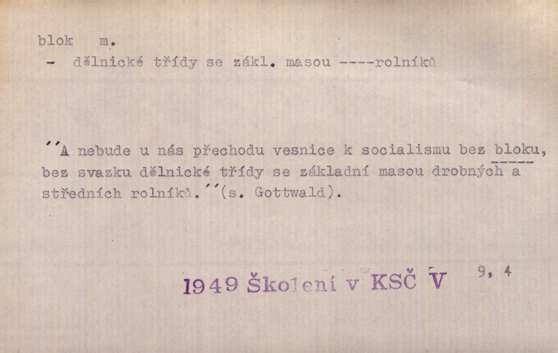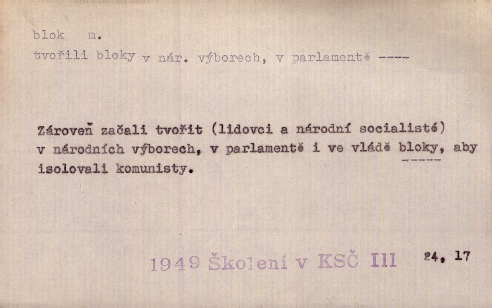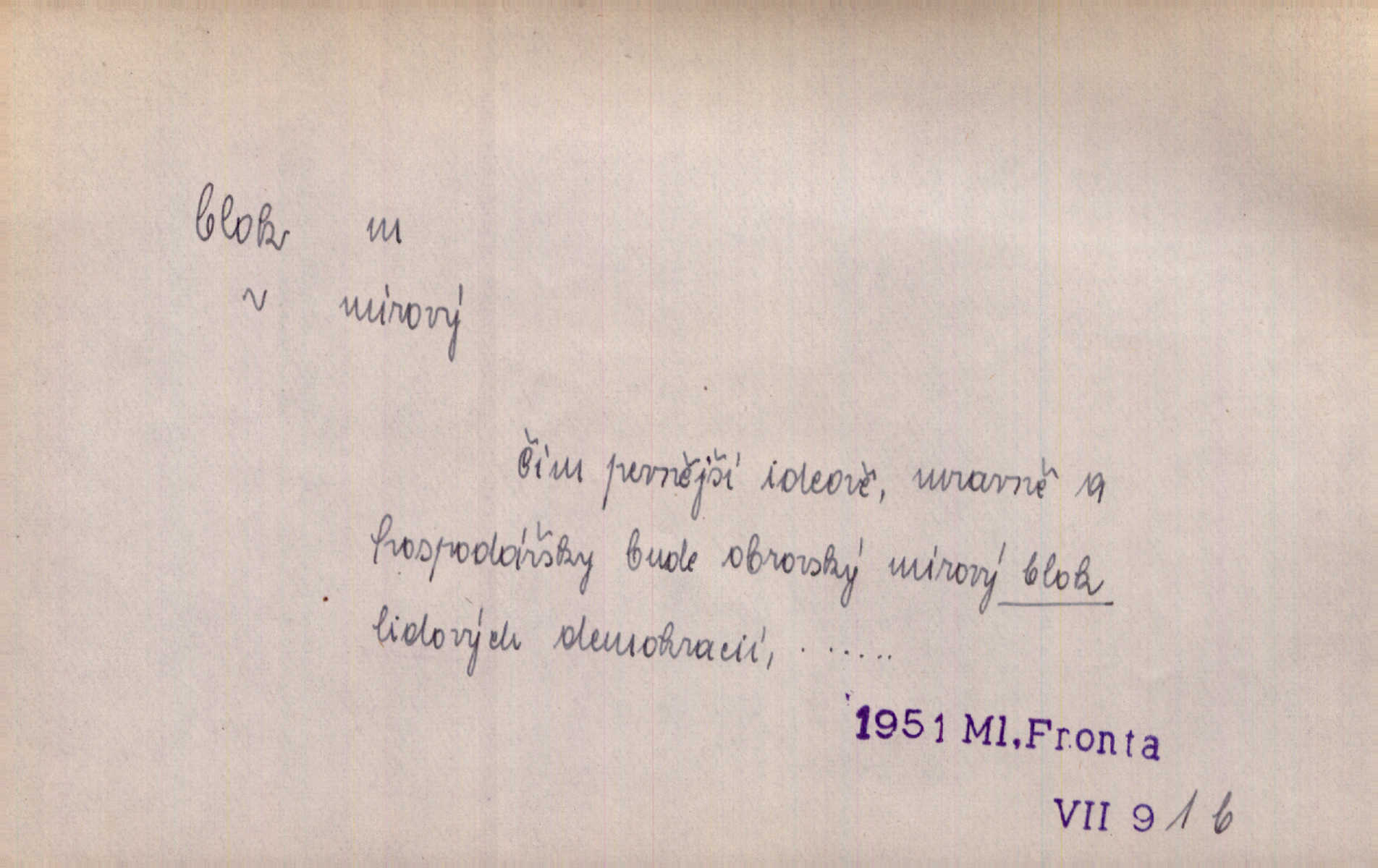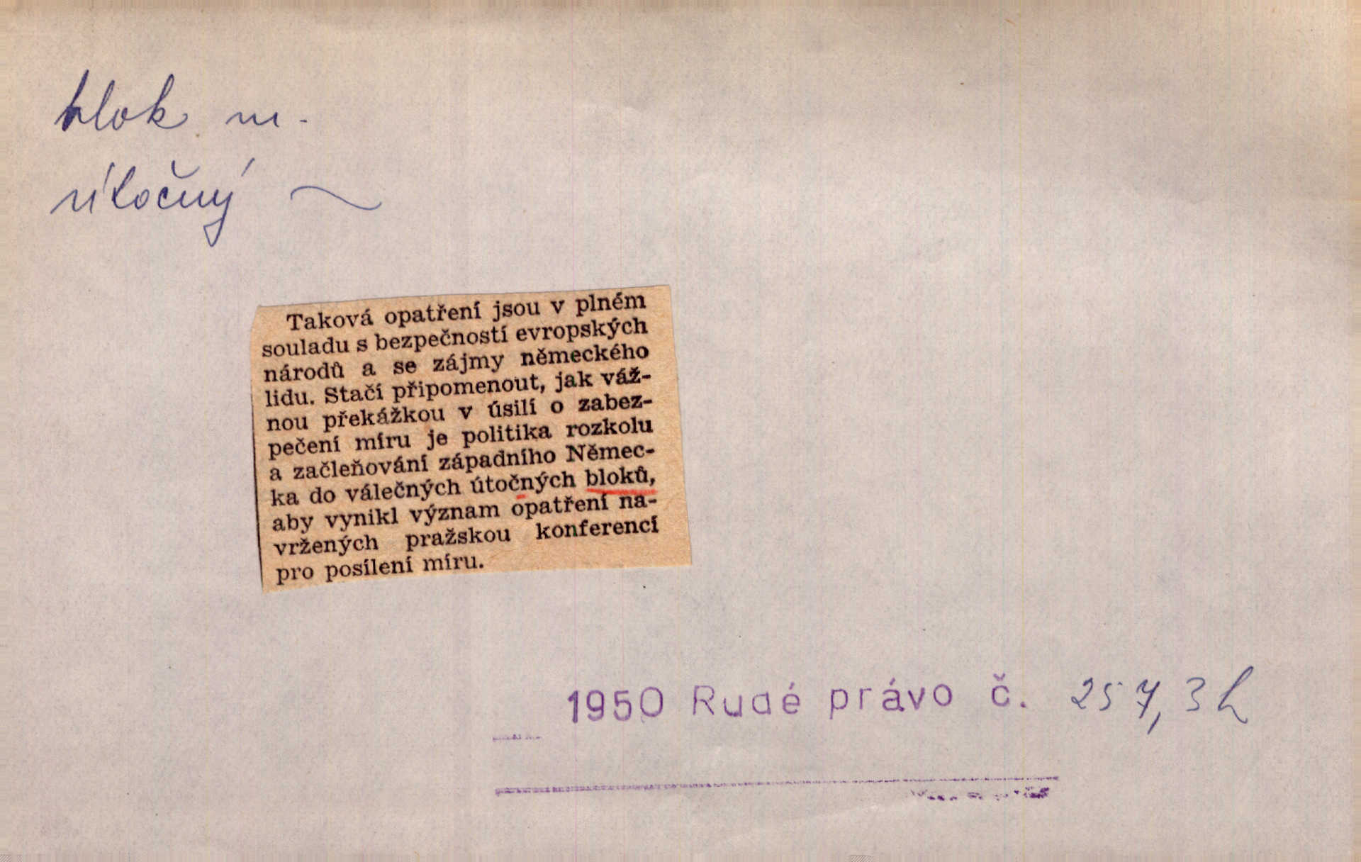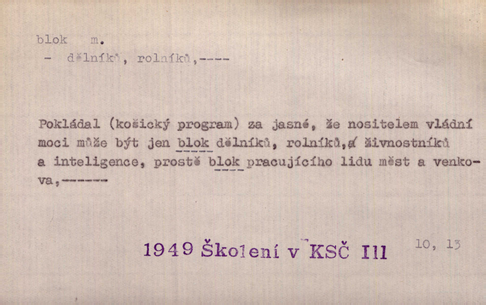 - blok, -u m. skupina domů. Stavěti dům vedle domu, bloky, ulice, město. Lang. D seskupení jistých samostatných organisací se stejnými zájmy, na př. politických stran a pod. Zlatý blok skupina států, které setrvávají při zlaté měně. Země se zlatou měnou se měly státi zároveň blokem hospodářským. Nár. l. První útok vyjde ze socialistického bloku. Mach. D svazek listů papíru a p. Vyňav plnicí pero a blok, jal se psáti recept. Čap. Ch. Blok pokladní, blok poštovních známek. Blok předplatní (v divadle). D Námoř. kladkovnice. Žel. jeden z úseků, na něž je rozdělena trať mezi dvěma stanicemi pro zvýšení bezpečnosti vlaků. Také zařízení, jímž se elektricky uzavírá a uvolňuje vjezd na jistý úsek trati.