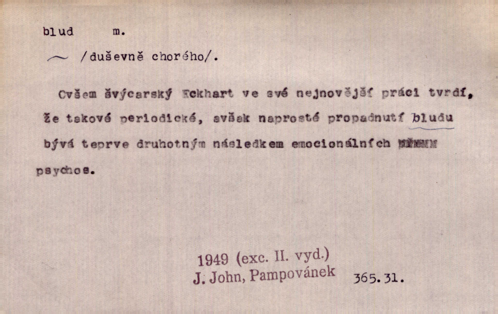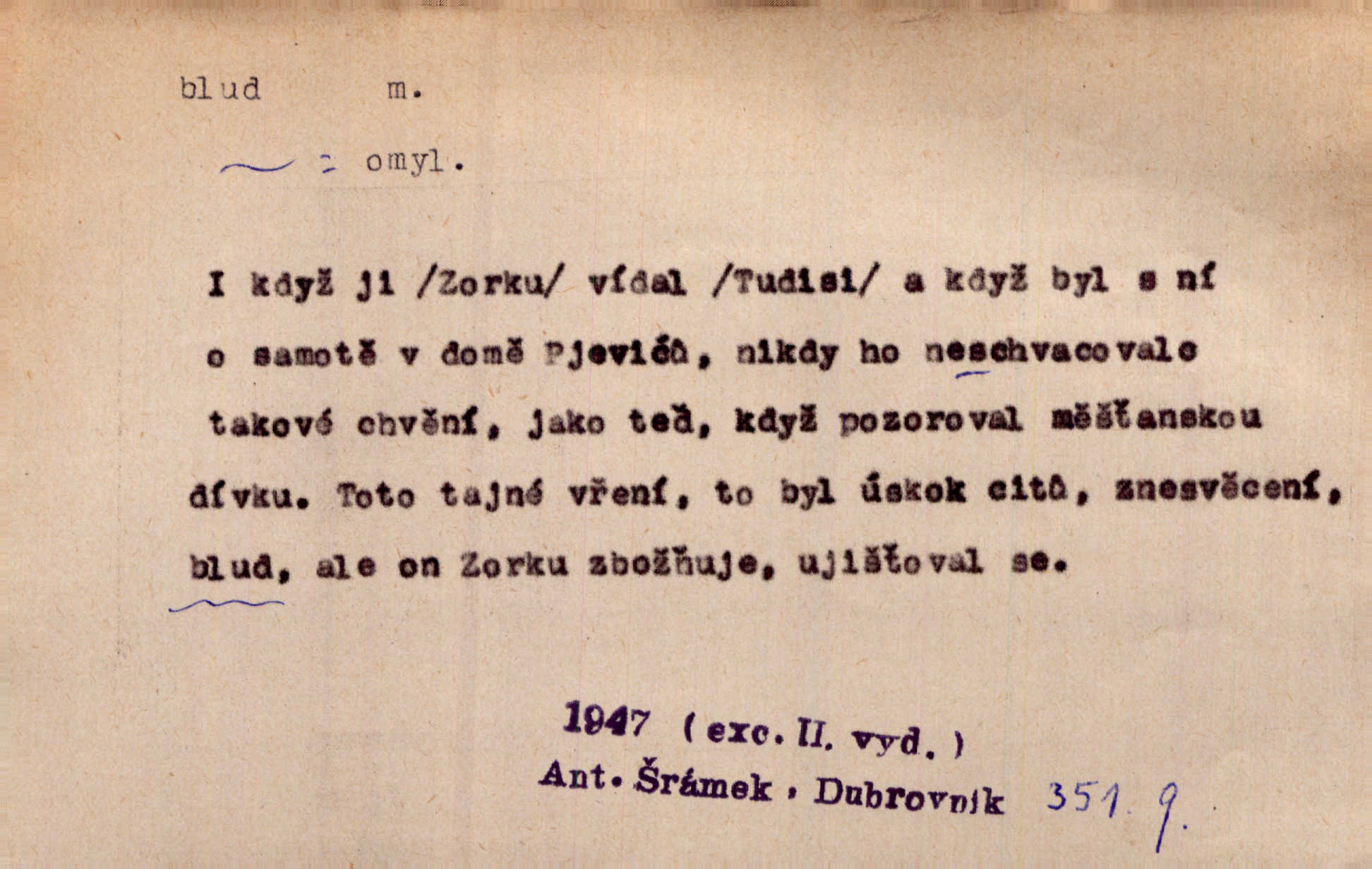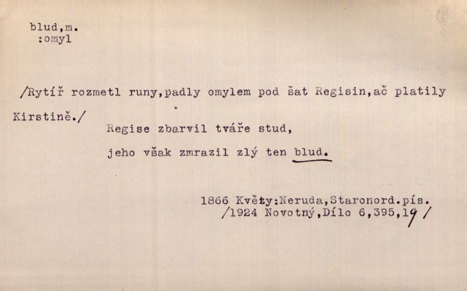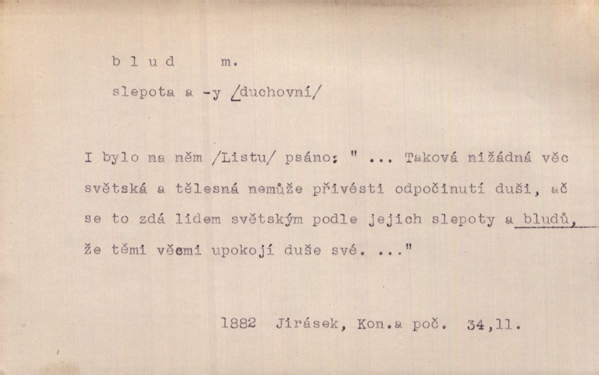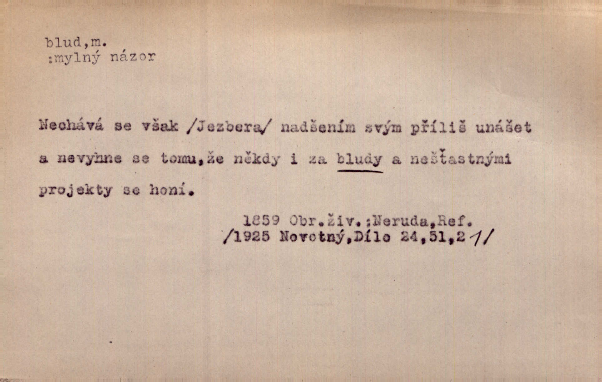 - blud, -u m. nesprávný názor; chyba. Vzdělanost chrání tě před klamy a bludy. Arb. Byl v tom veliký omyl a blud, když se dřív taková svoboda trpěla. Jir. Zavésti někoho v blud, vyvésti z bludu. Upadnouti v blud, poznati svůj blud. D Círk. odchylné přesvědčení ve věcech víry. Bludy Táborů. Lék. chorobný úsudek.