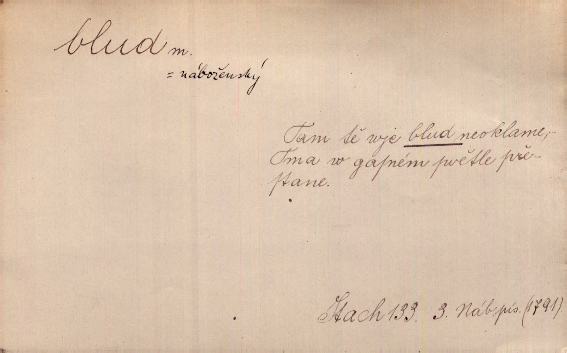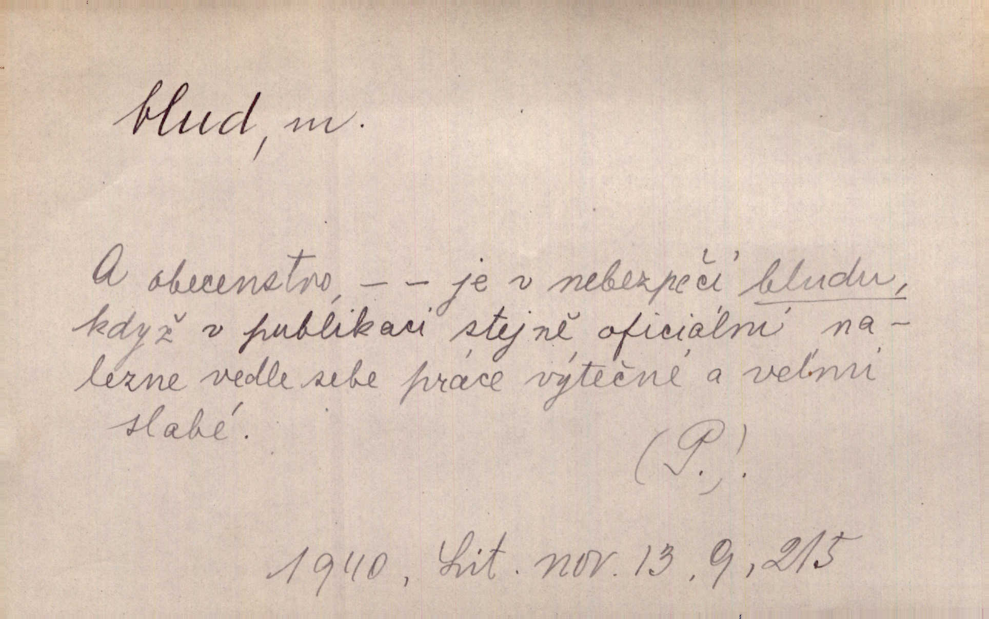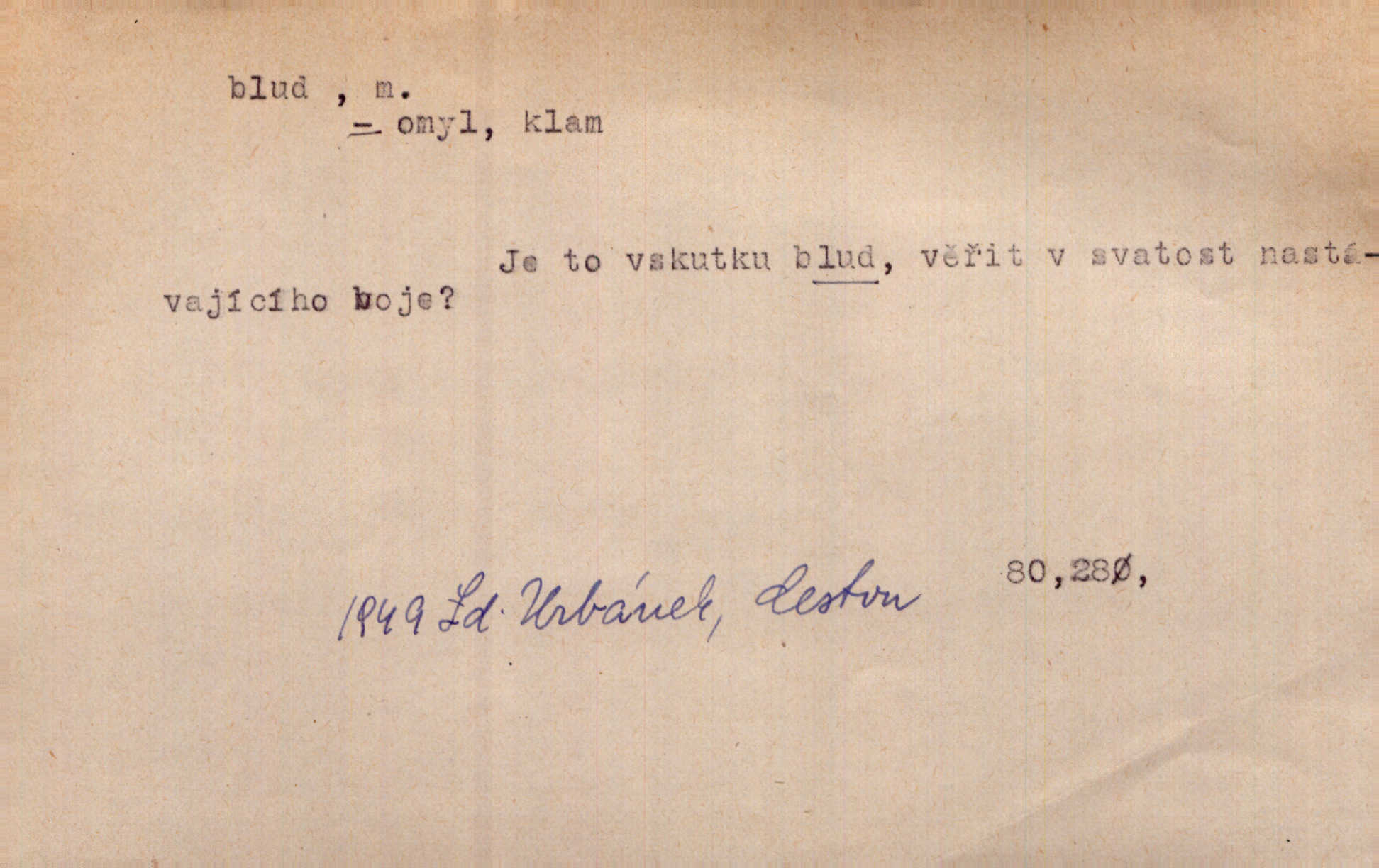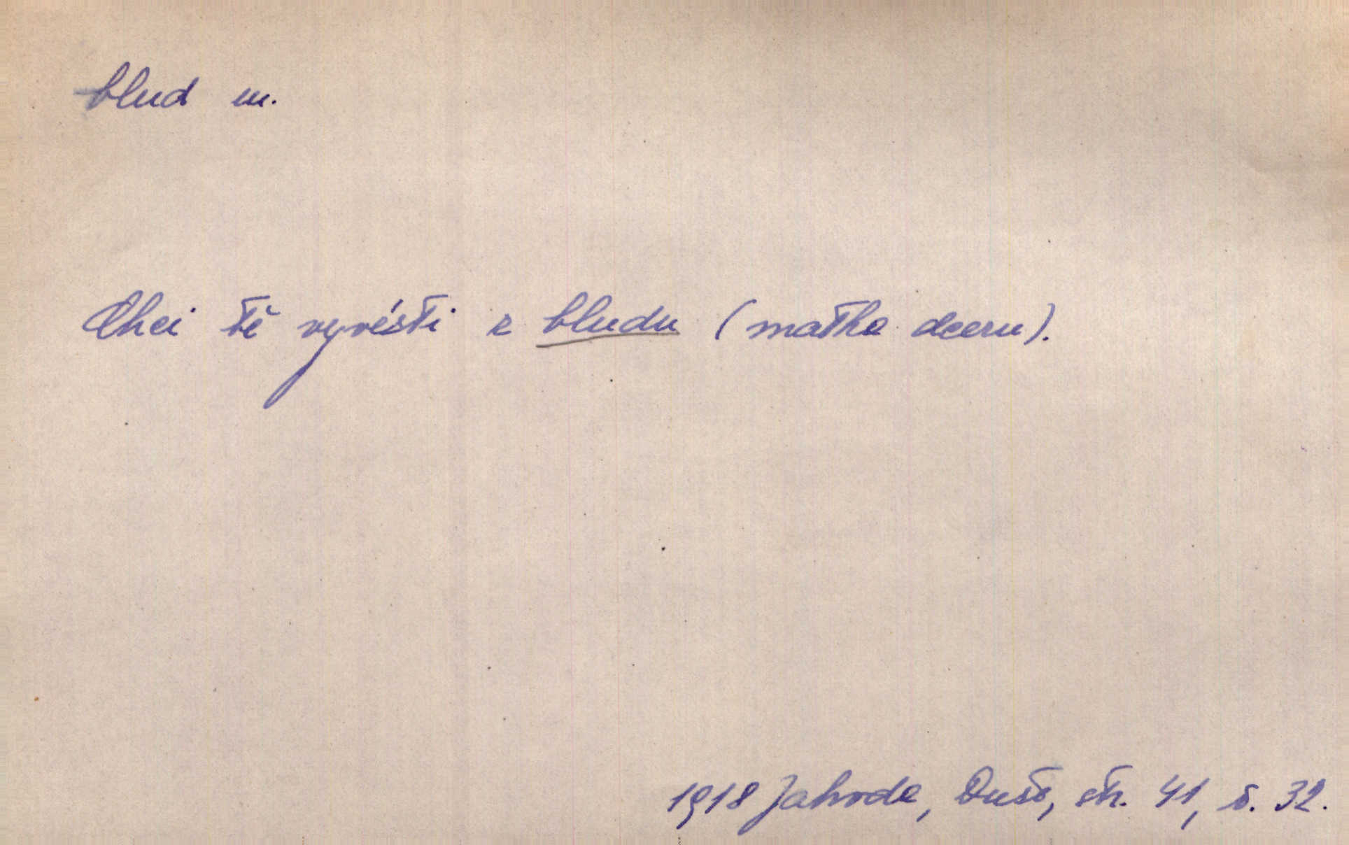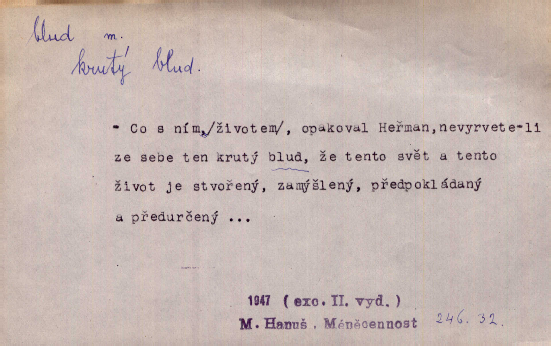 - blud, -u m. nesprávný názor; chyba. Vzdělanost chrání tě před klamy a bludy. Arb. Byl v tom veliký omyl a blud, když se dřív taková svoboda trpěla. Jir. Zavésti někoho v blud, vyvésti z bludu. Upadnouti v blud, poznati svůj blud. D Círk. odchylné přesvědčení ve věcech víry. Bludy Táborů. Lék. chorobný úsudek.
