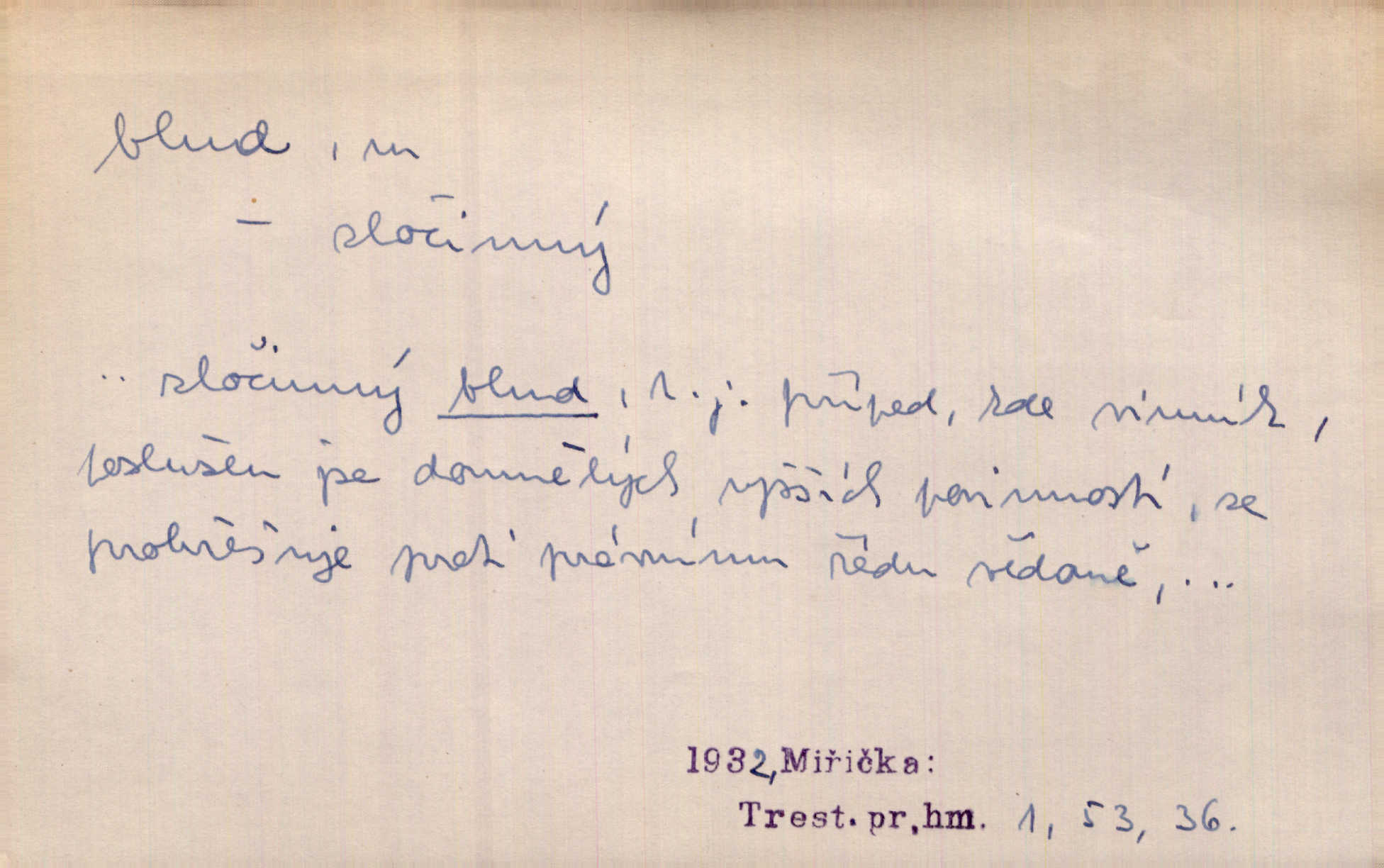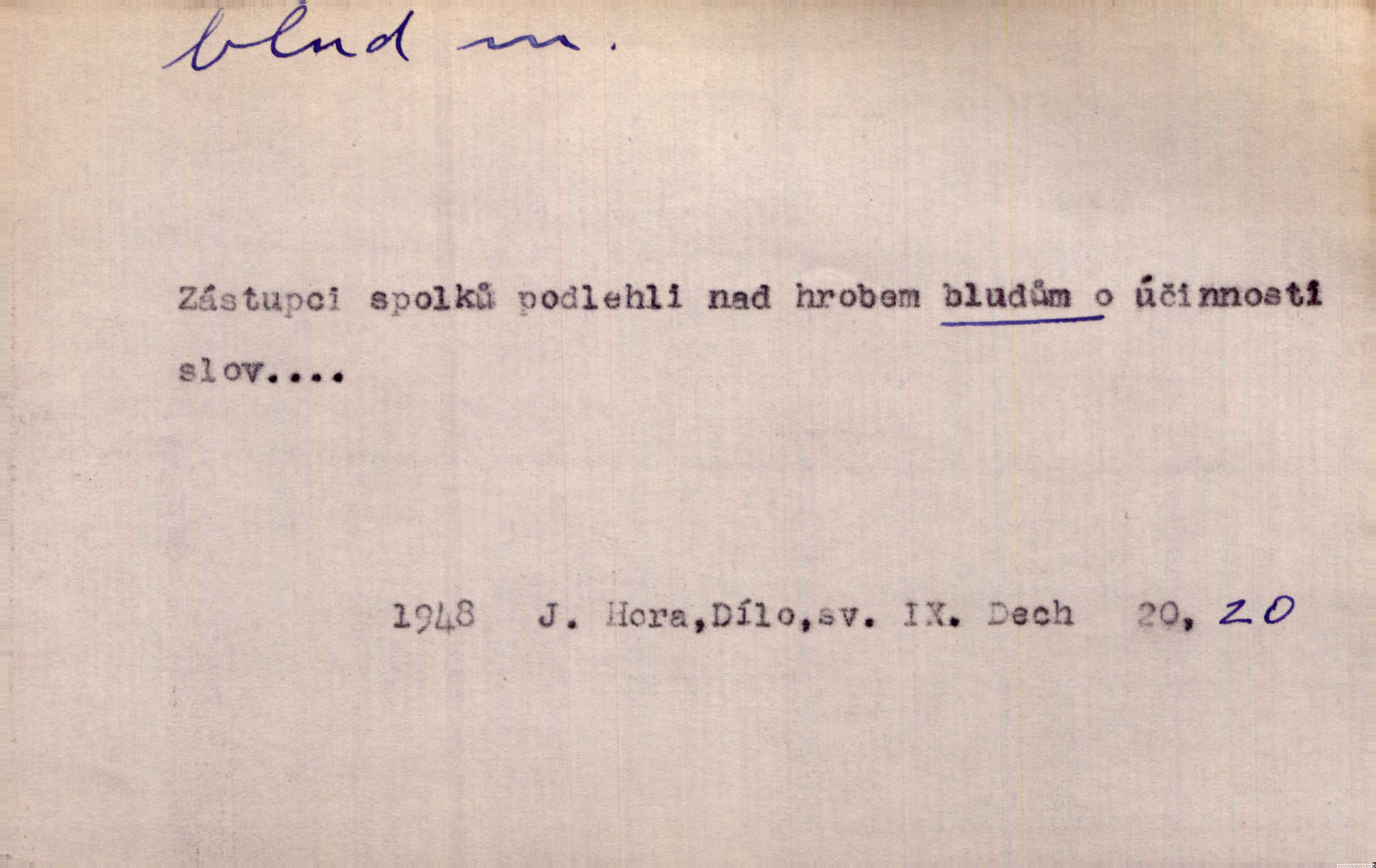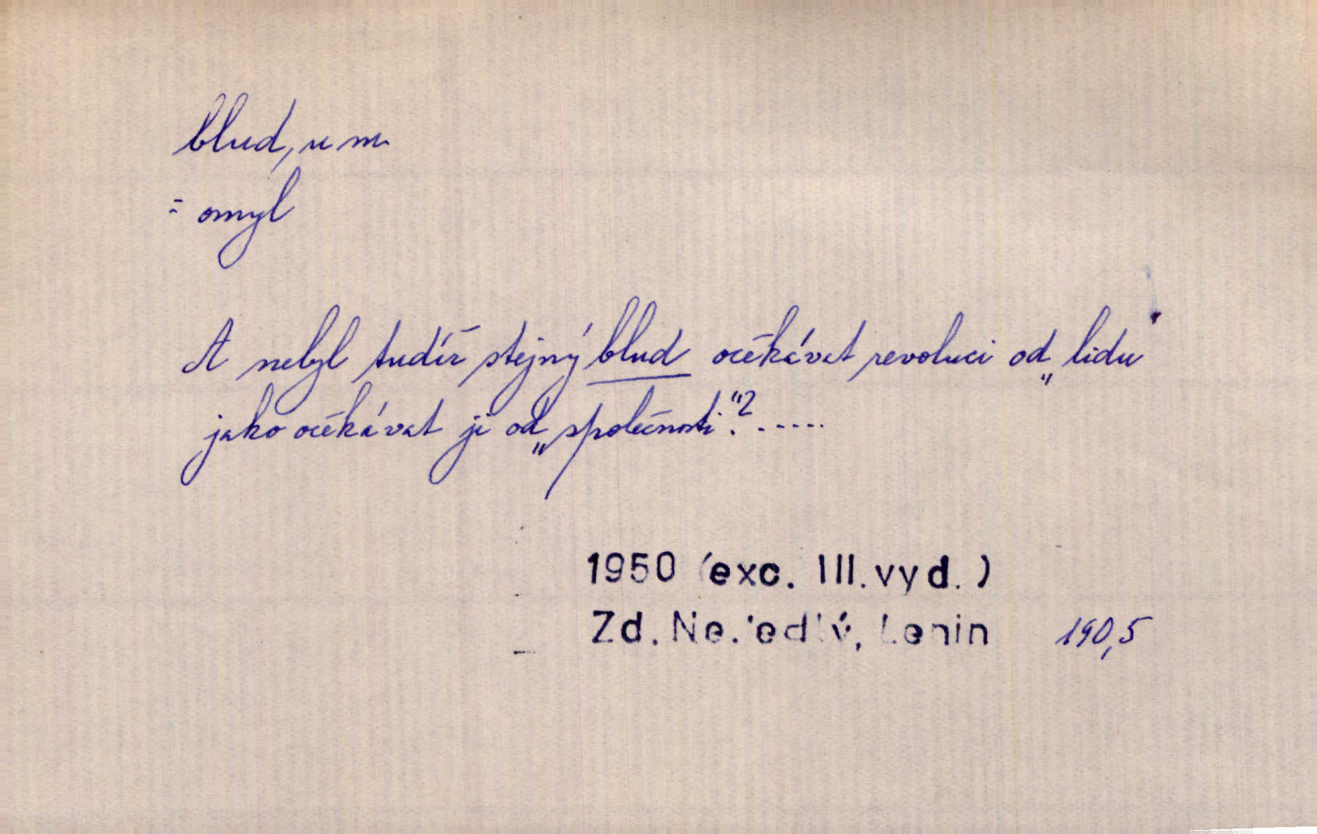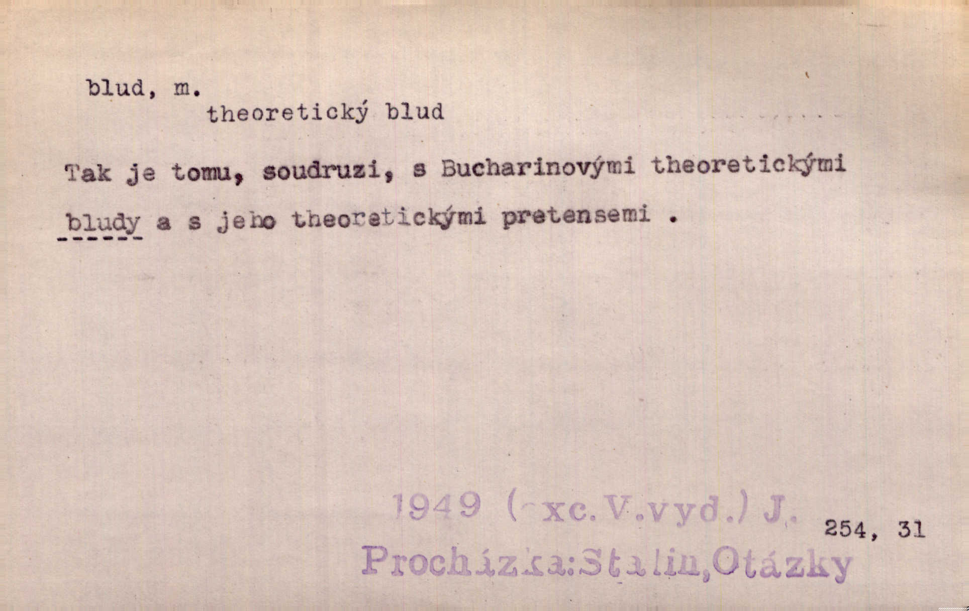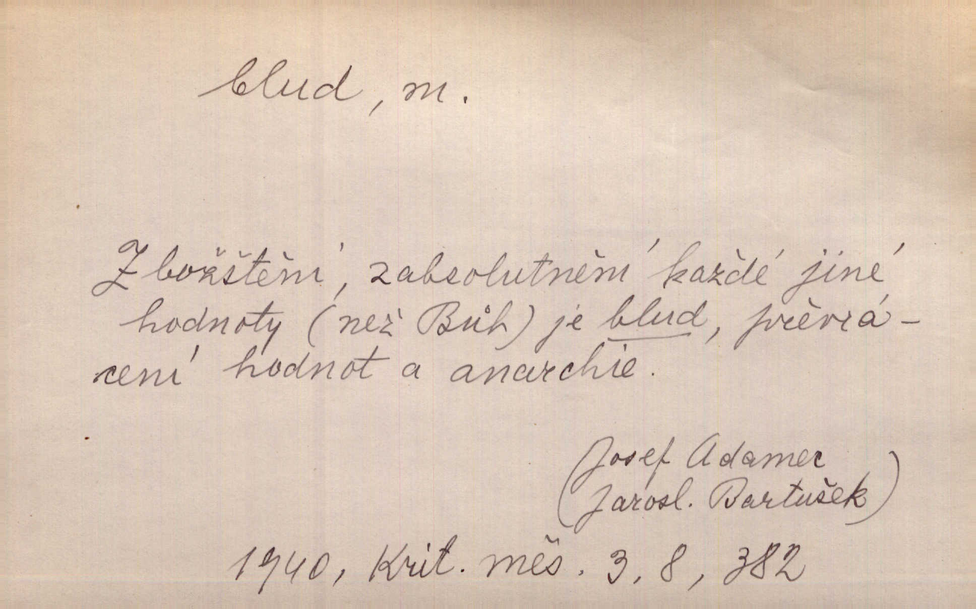 - blud, -u m. nesprávný názor; chyba. Vzdělanost chrání tě před klamy a bludy. Arb. Byl v tom veliký omyl a blud, když se dřív taková svoboda trpěla. Jir. Zavésti někoho v blud, vyvésti z bludu. Upadnouti v blud, poznati svůj blud. D Círk. odchylné přesvědčení ve věcech víry. Bludy Táborů. Lék. chorobný úsudek.