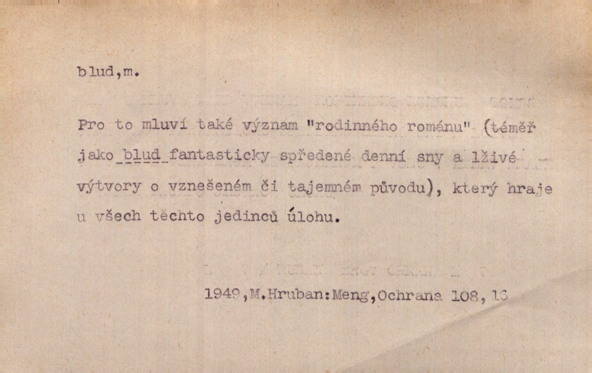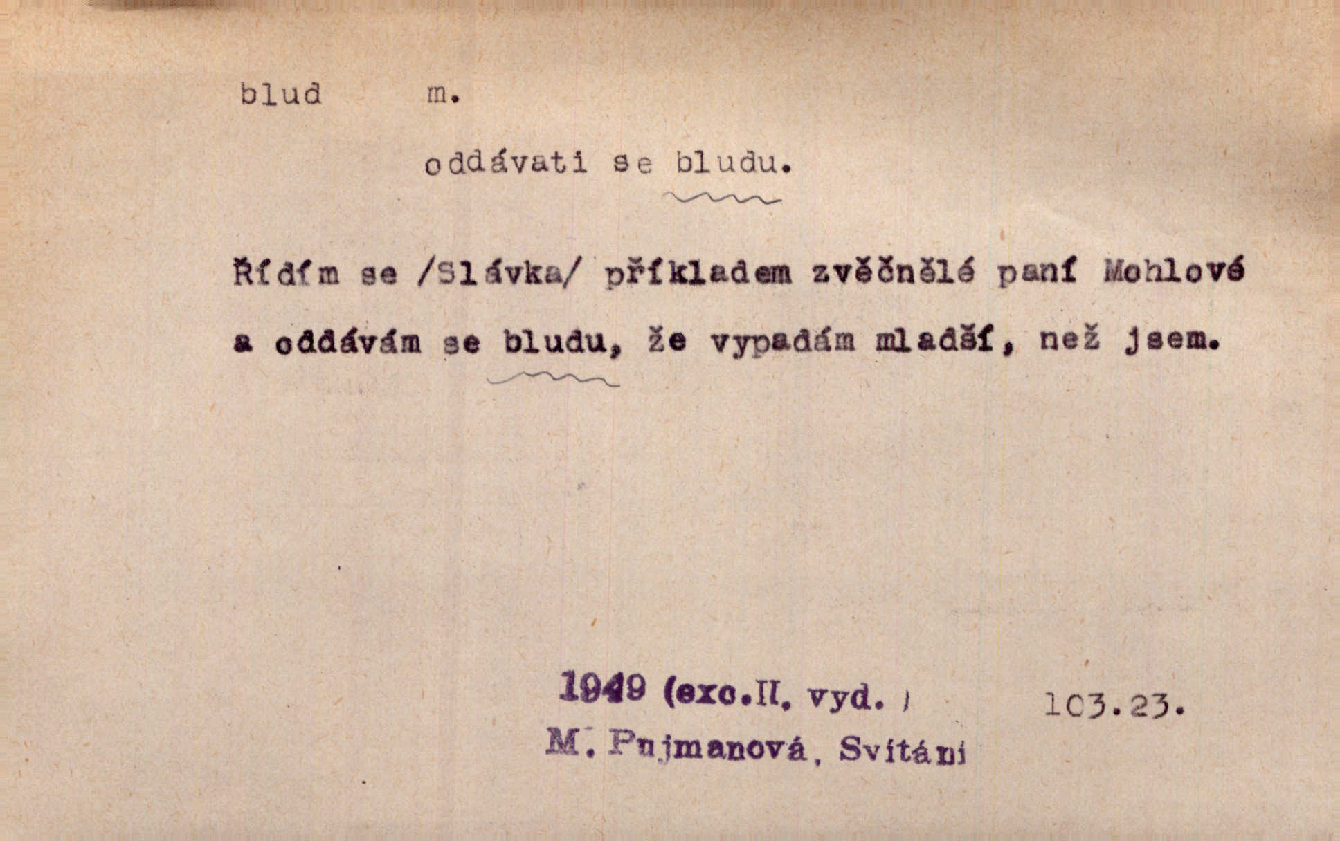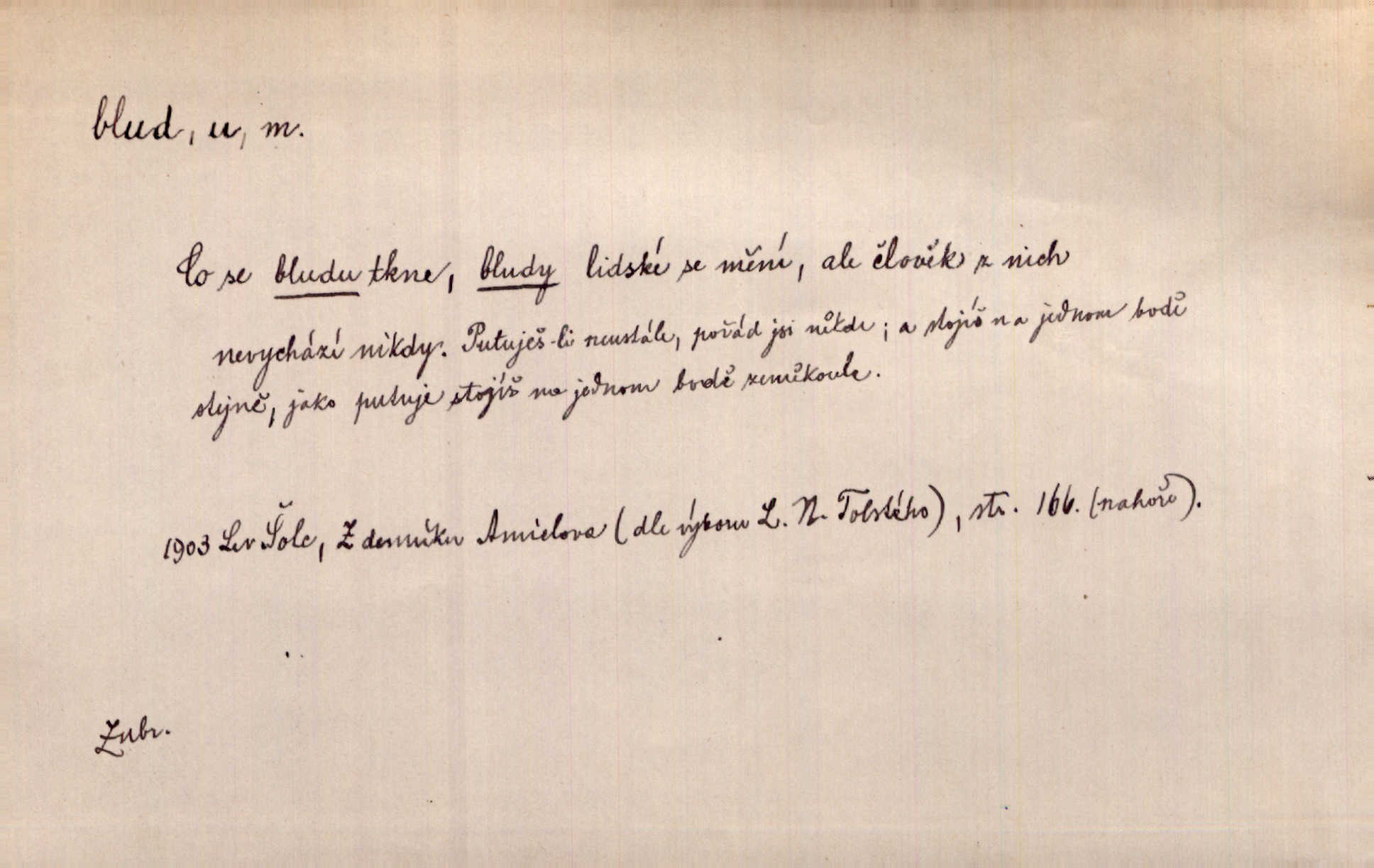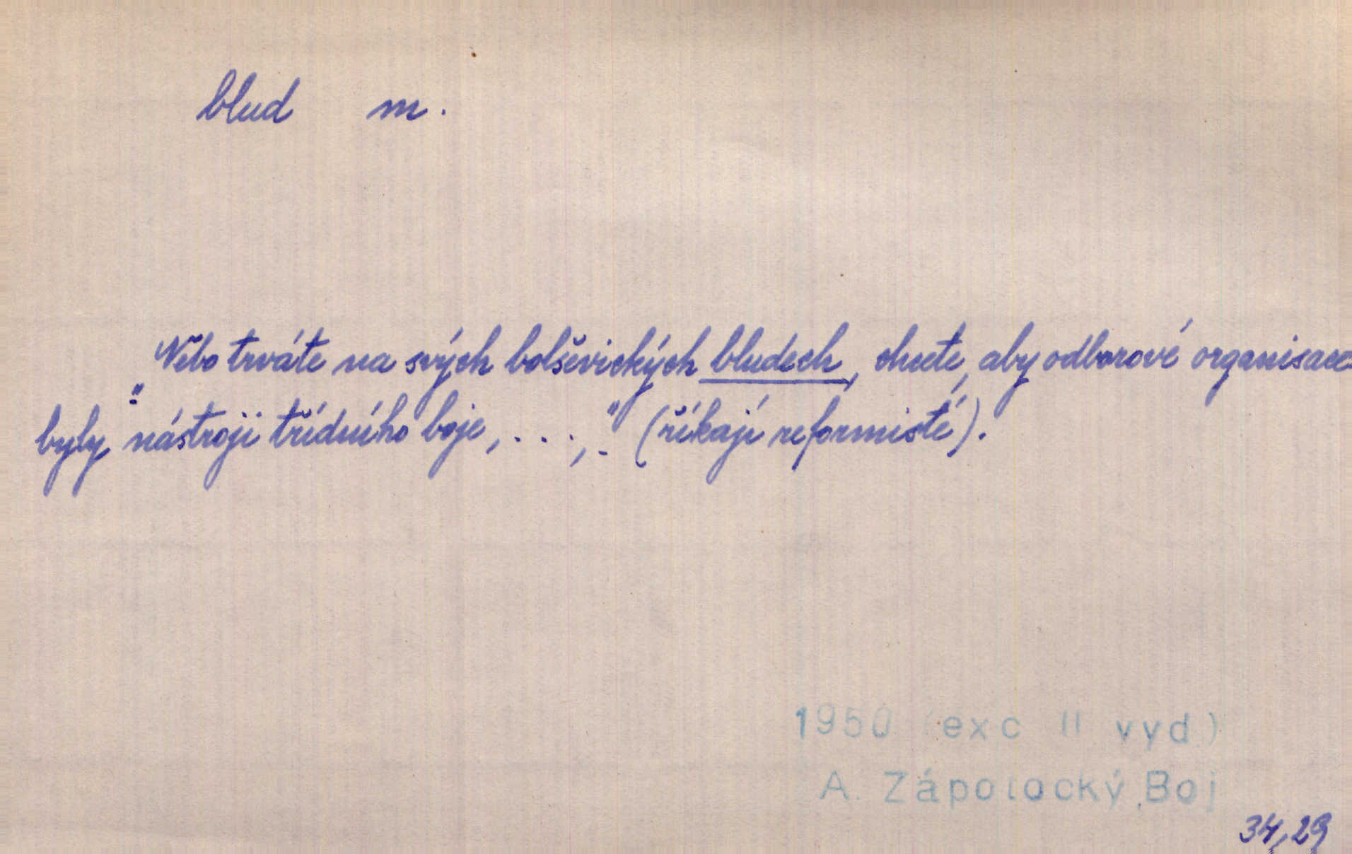 - blud, -u m. nesprávný názor; chyba. Vzdělanost chrání tě před klamy a bludy. Arb. Byl v tom veliký omyl a blud, když se dřív taková svoboda trpěla. Jir. Zavésti někoho v blud, vyvésti z bludu. Upadnouti v blud, poznati svůj blud. D Círk. odchylné přesvědčení ve věcech víry. Bludy Táborů. Lék. chorobný úsudek.