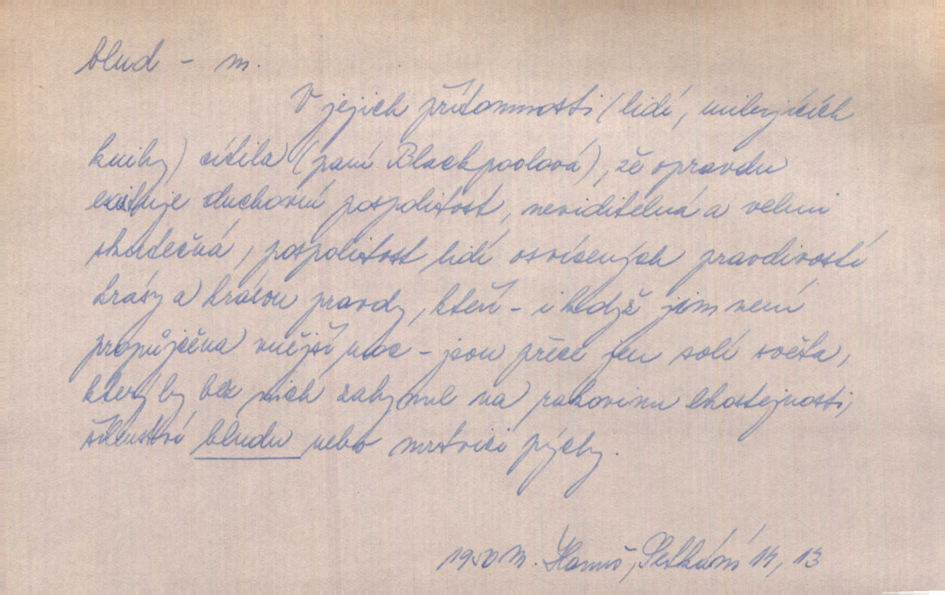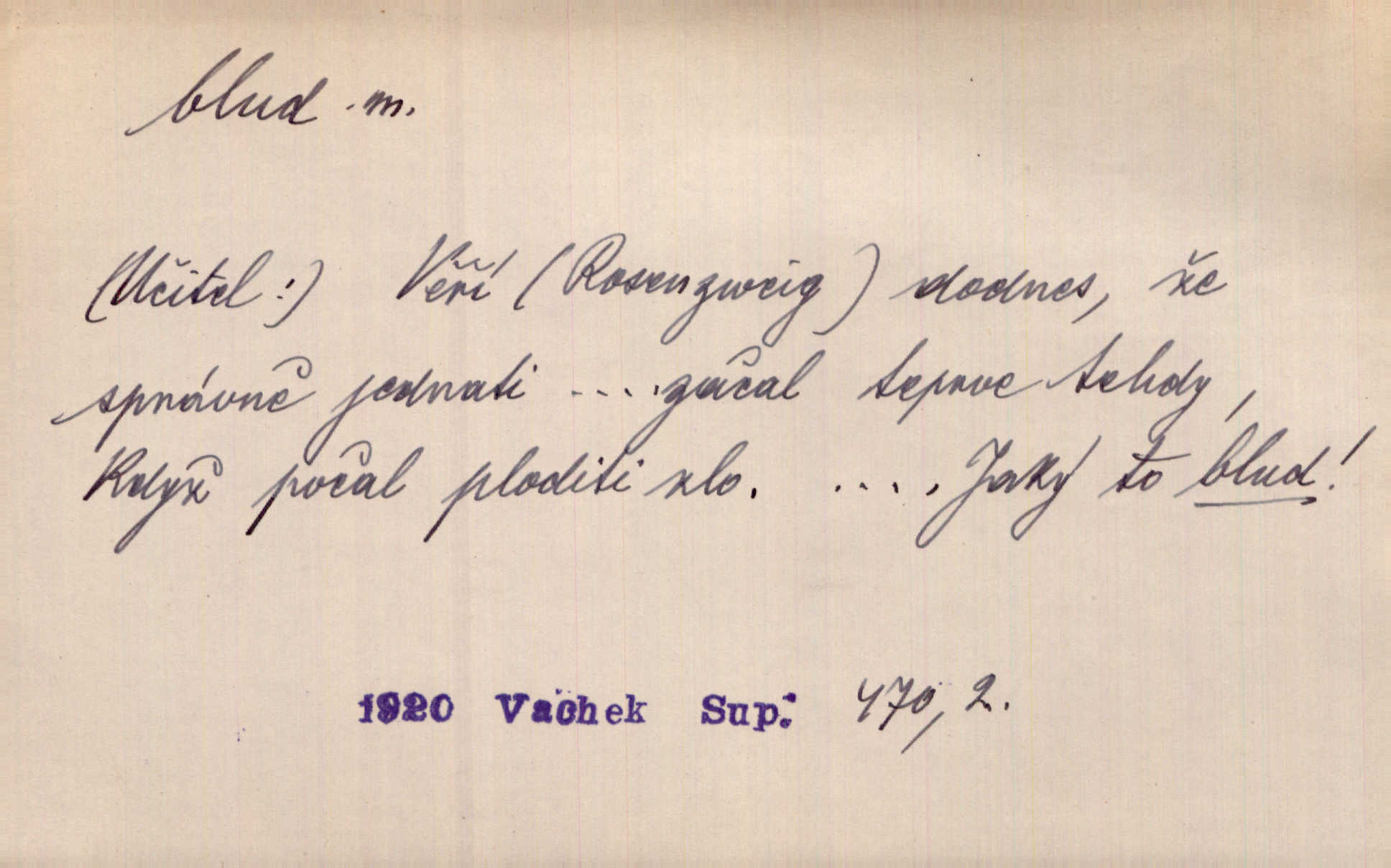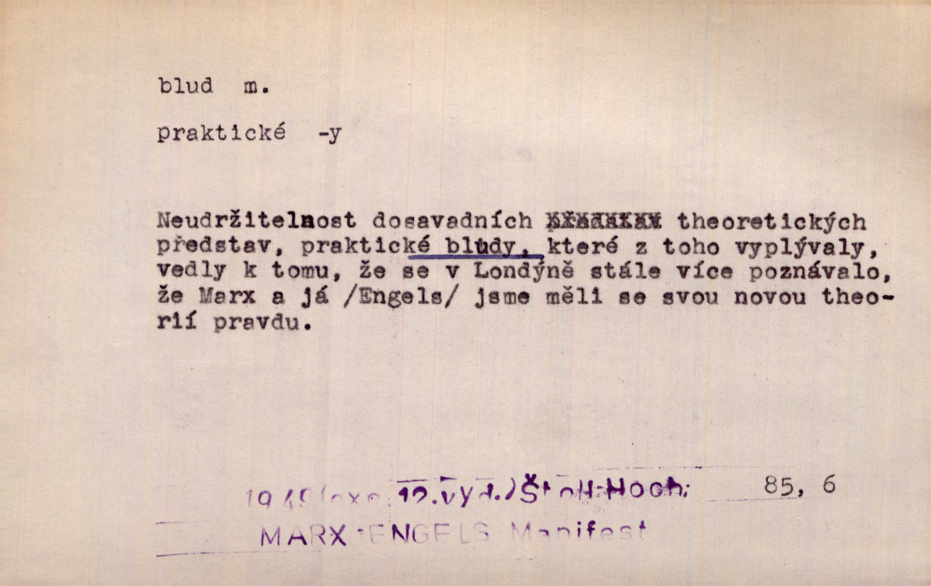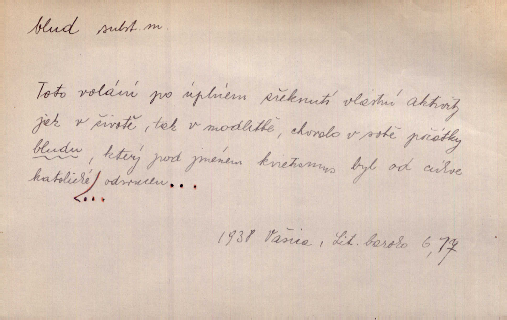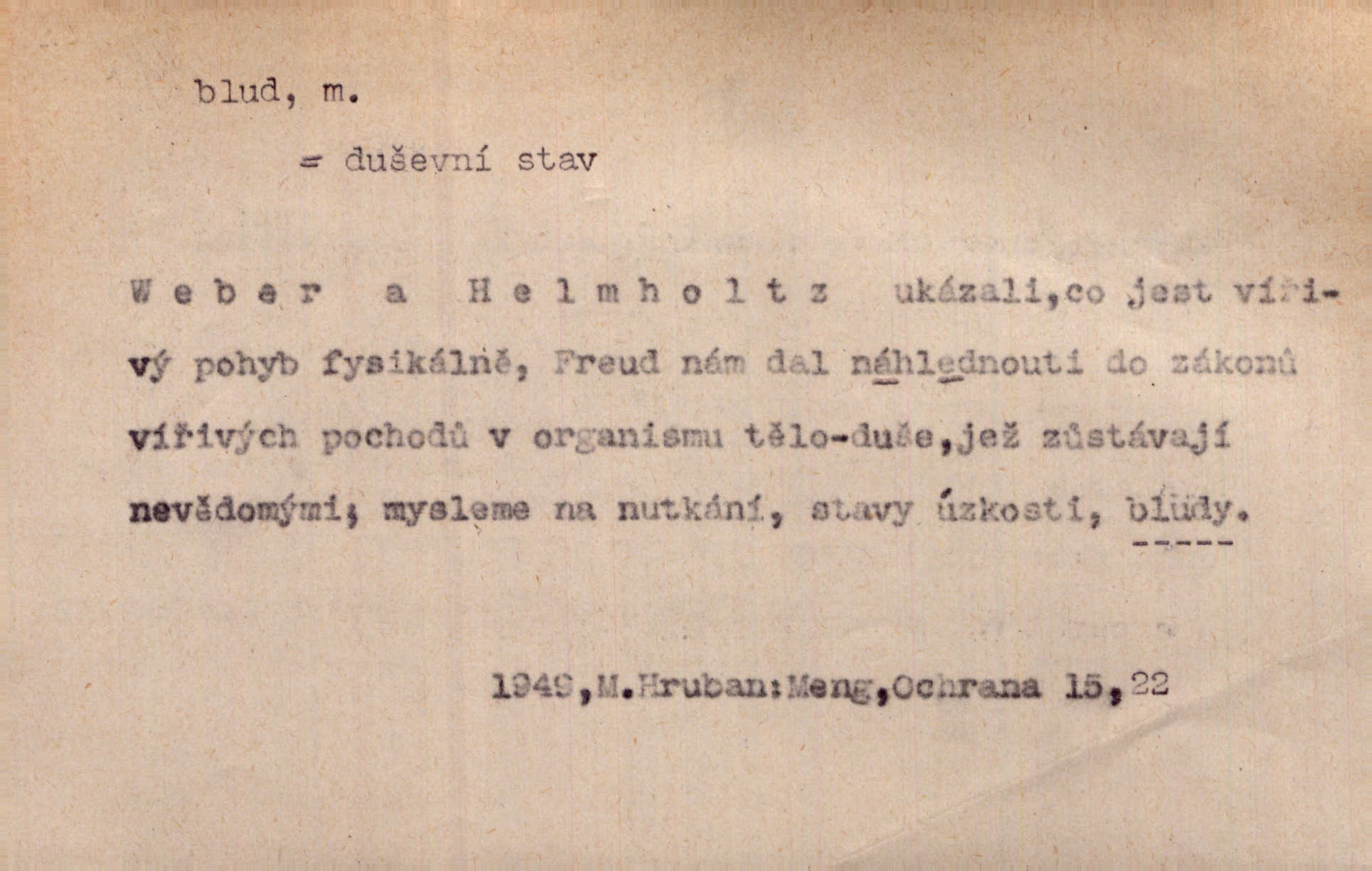 - blud, -u m. nesprávný názor; chyba. Vzdělanost chrání tě před klamy a bludy. Arb. Byl v tom veliký omyl a blud, když se dřív taková svoboda trpěla. Jir. Zavésti někoho v blud, vyvésti z bludu. Upadnouti v blud, poznati svůj blud. D Círk. odchylné přesvědčení ve věcech víry. Bludy Táborů. Lék. chorobný úsudek.