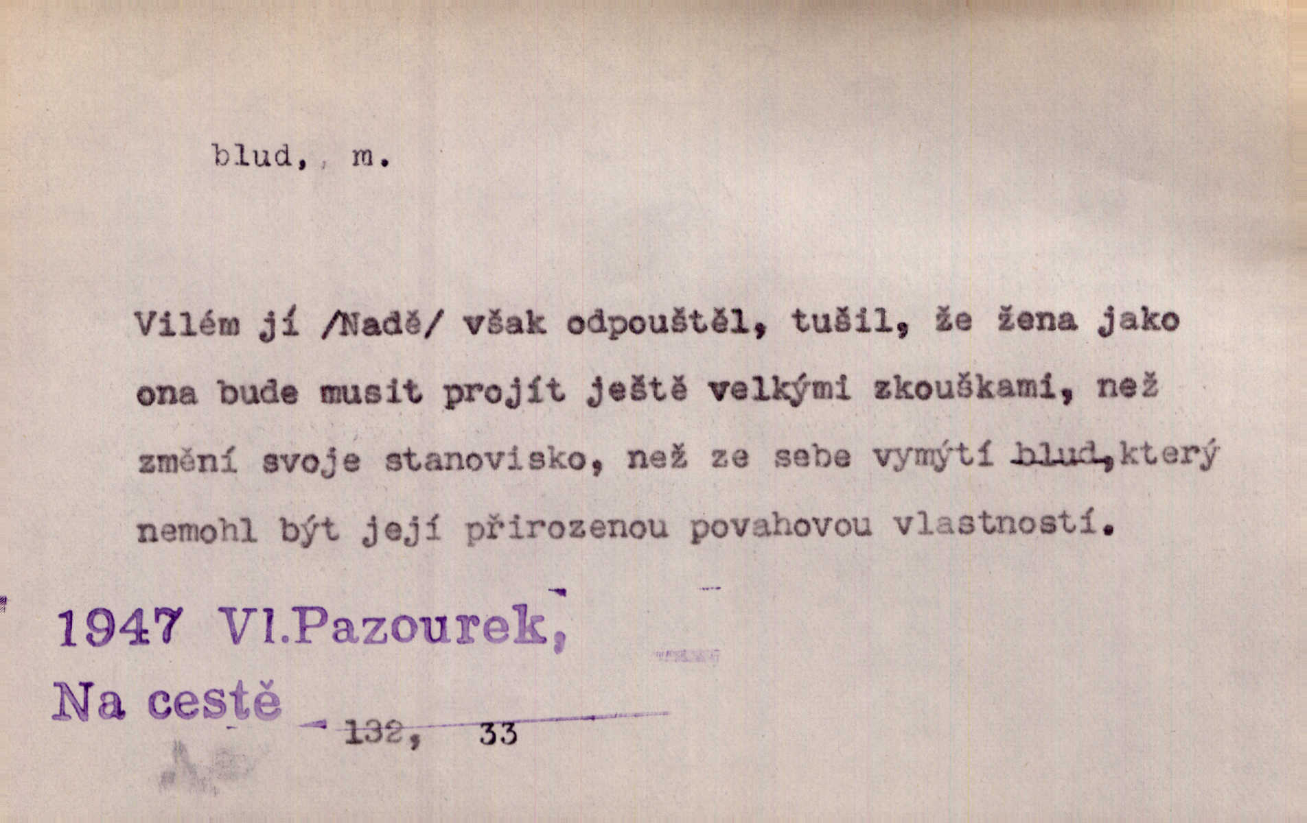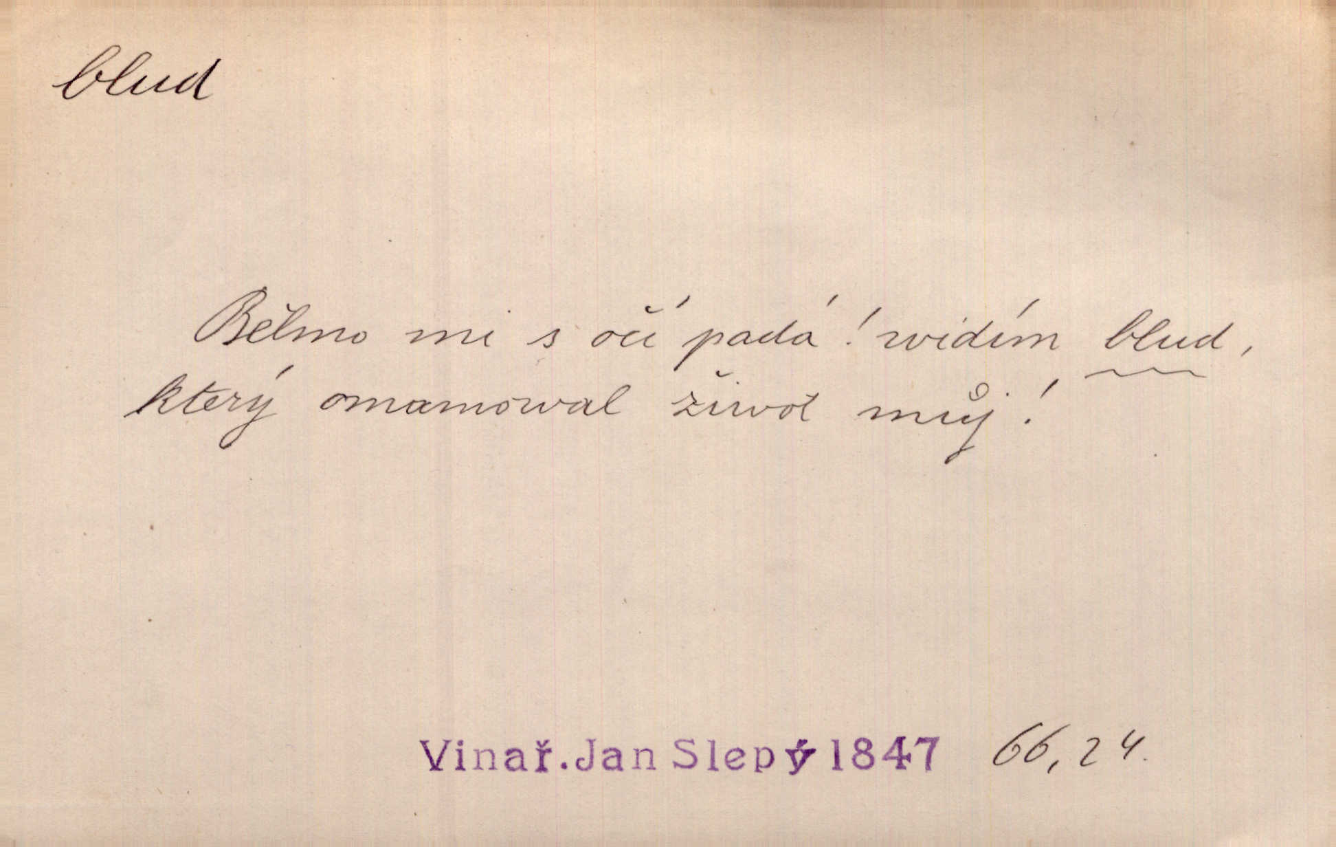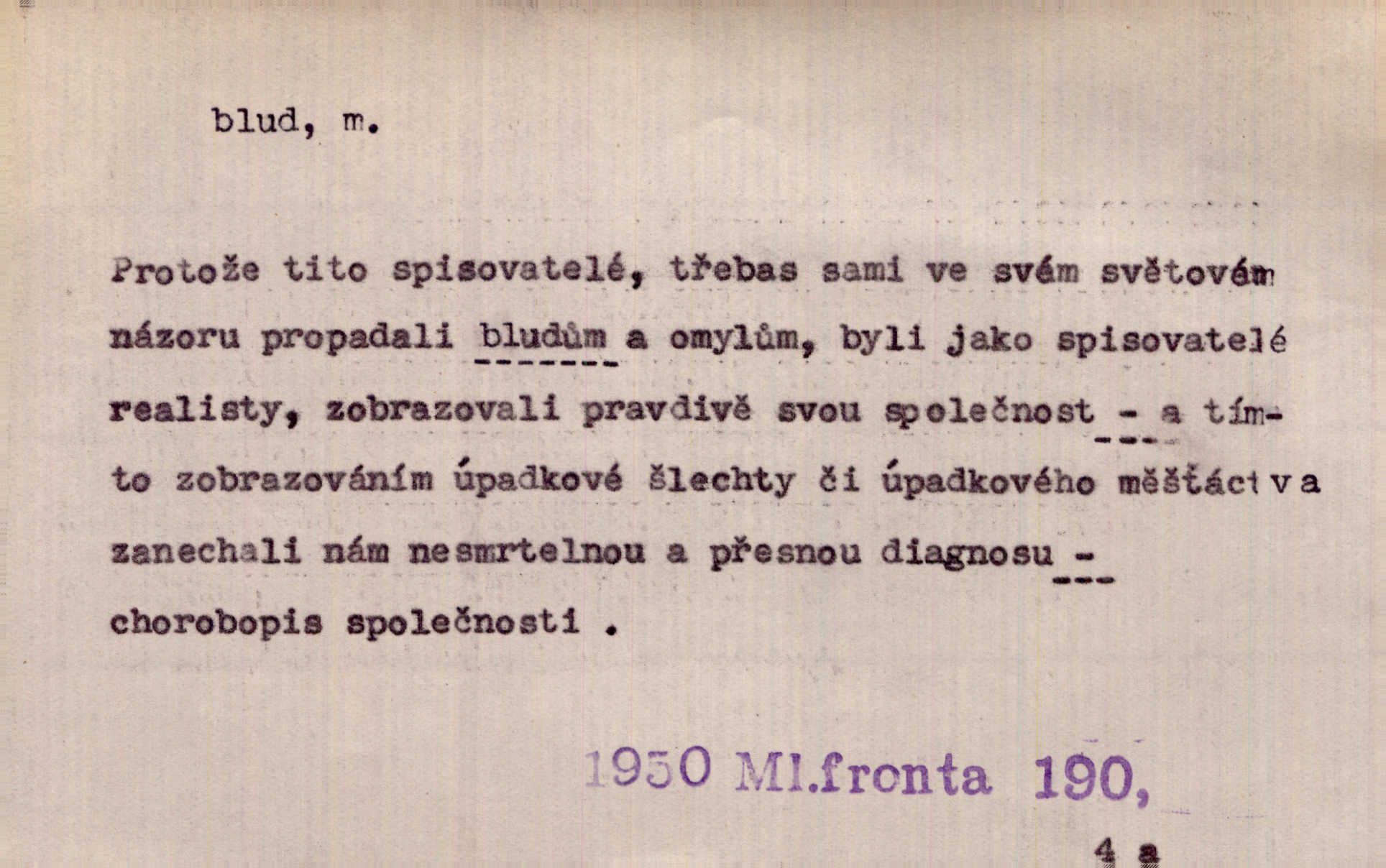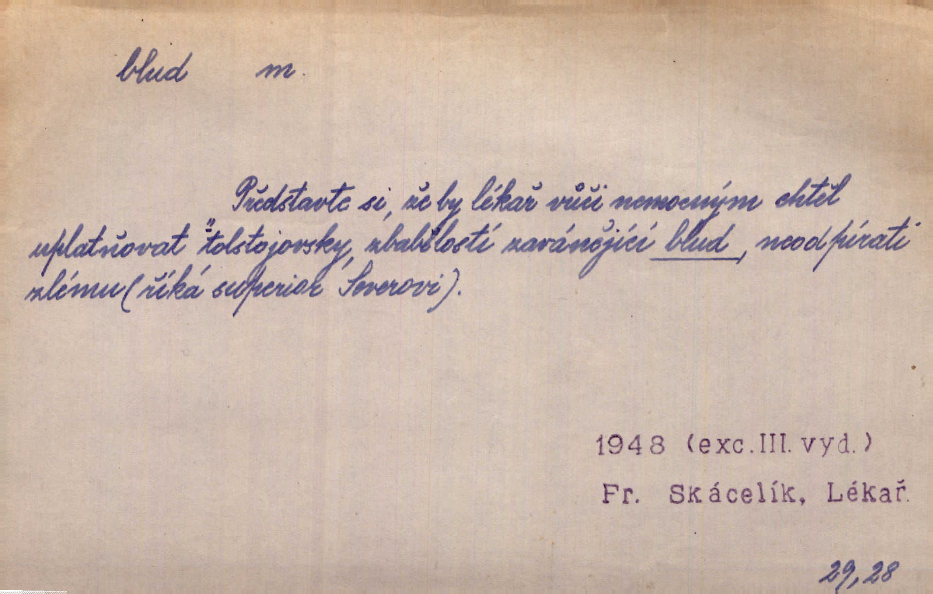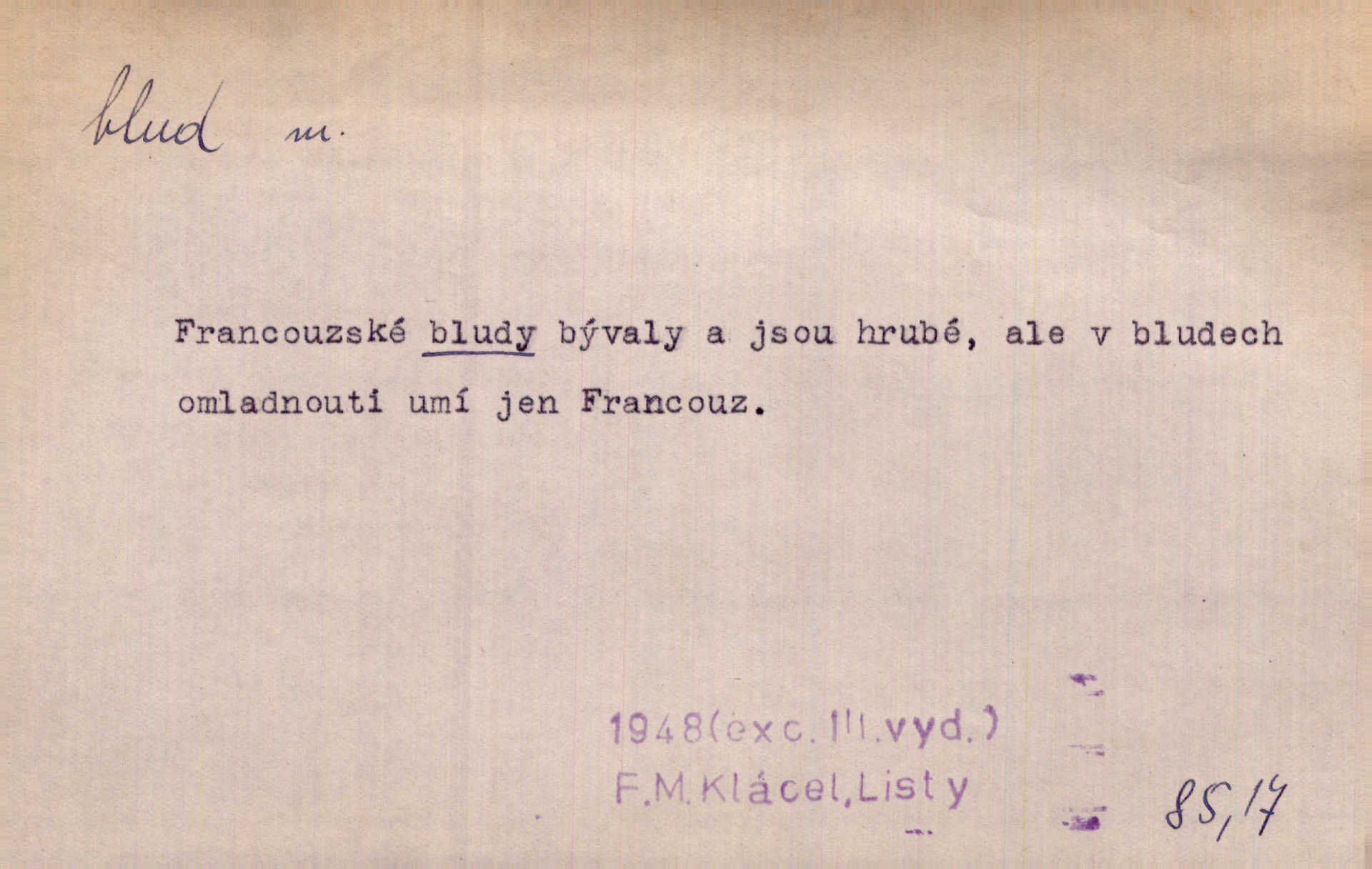 - blud, -u m. nesprávný názor; chyba. Vzdělanost chrání tě před klamy a bludy. Arb. Byl v tom veliký omyl a blud, když se dřív taková svoboda trpěla. Jir. Zavésti někoho v blud, vyvésti z bludu. Upadnouti v blud, poznati svůj blud. D Círk. odchylné přesvědčení ve věcech víry. Bludy Táborů. Lék. chorobný úsudek.