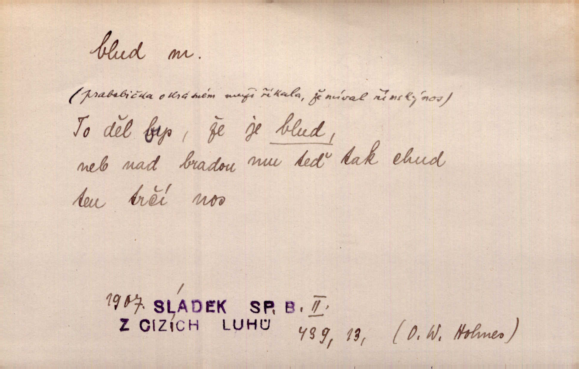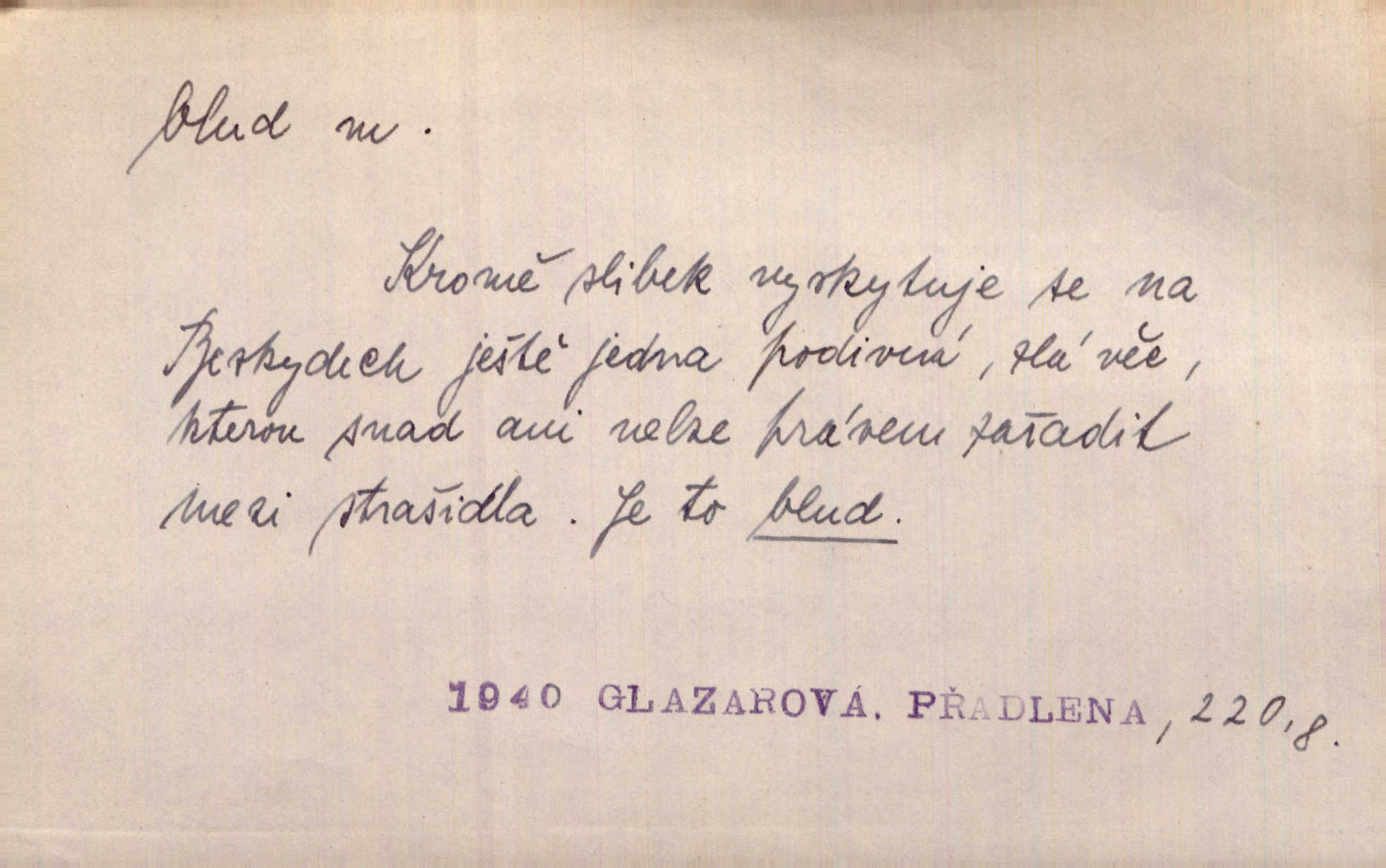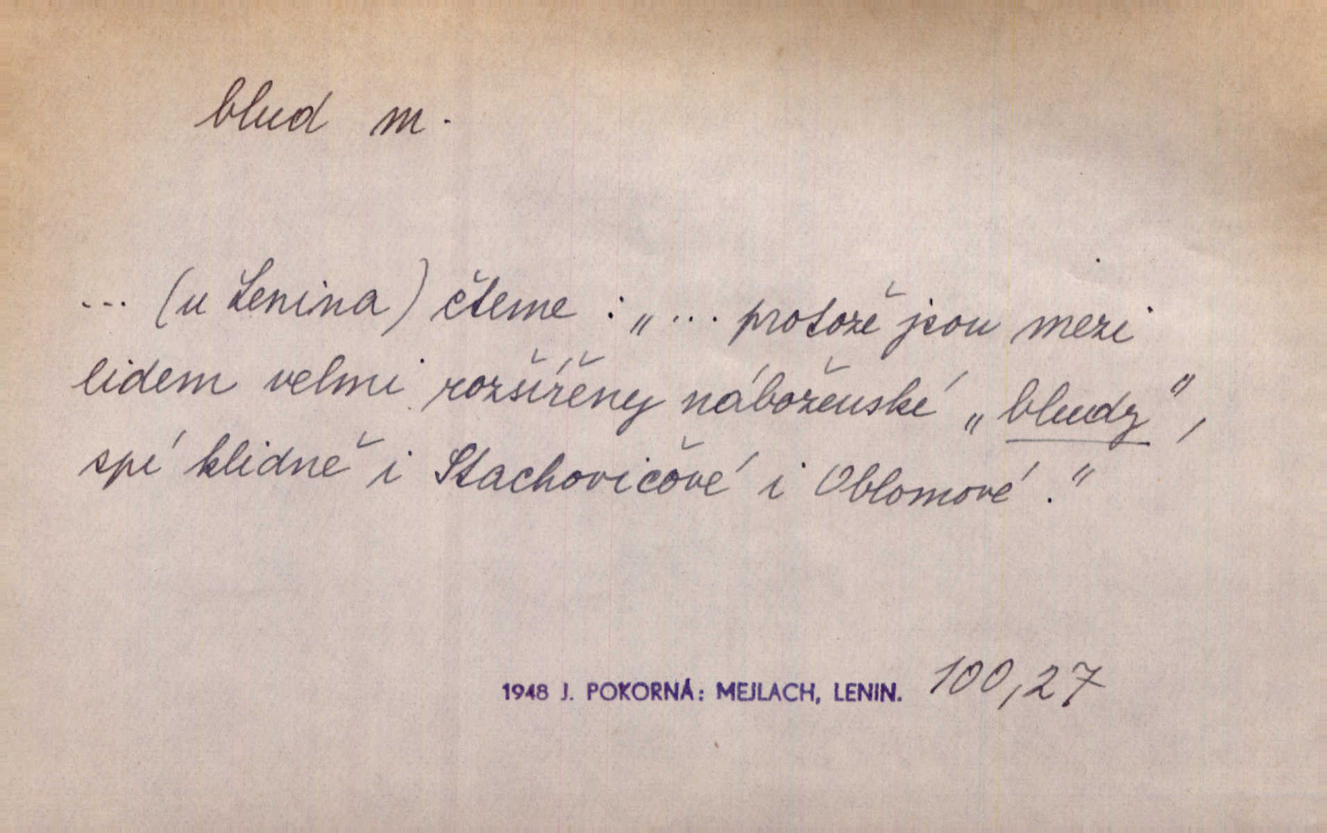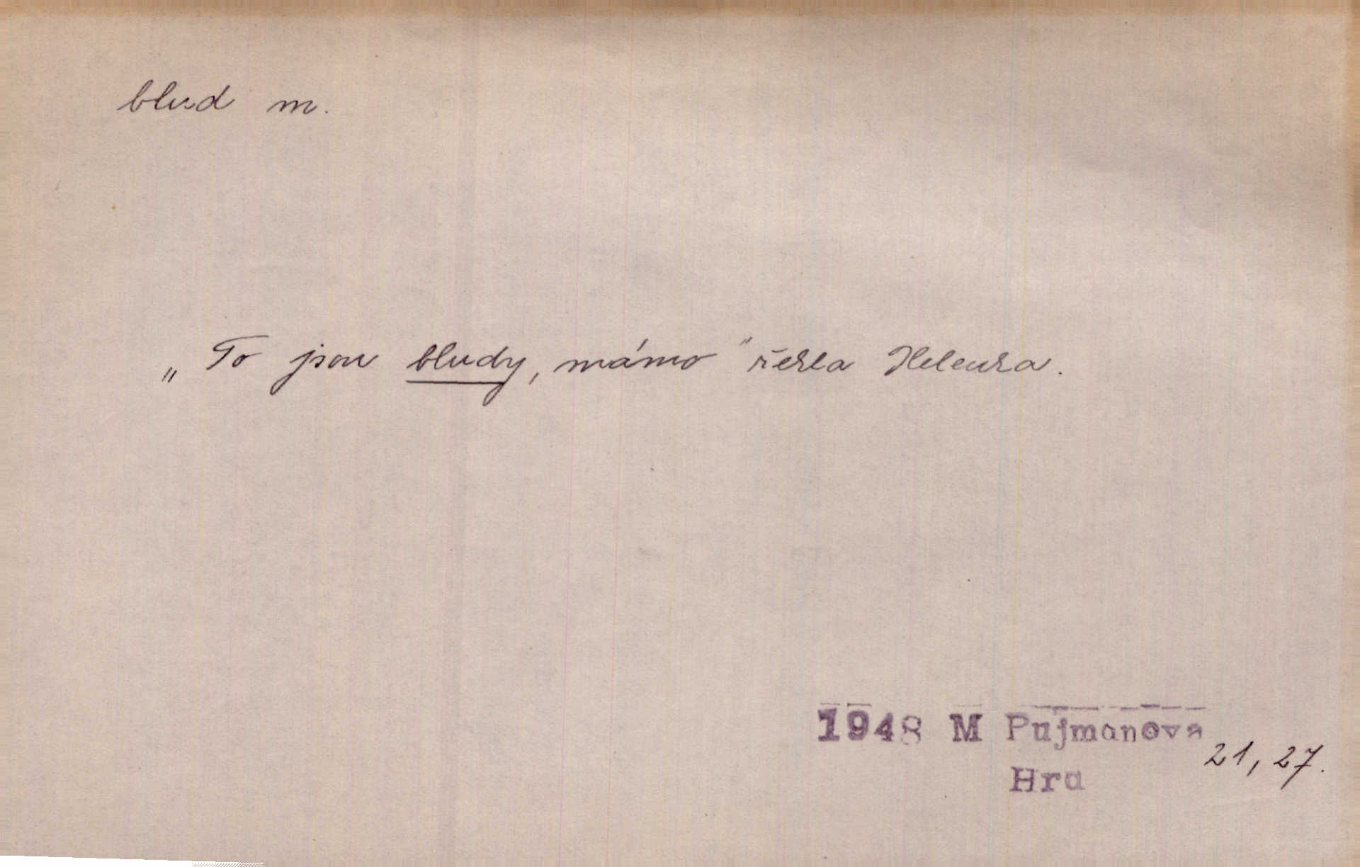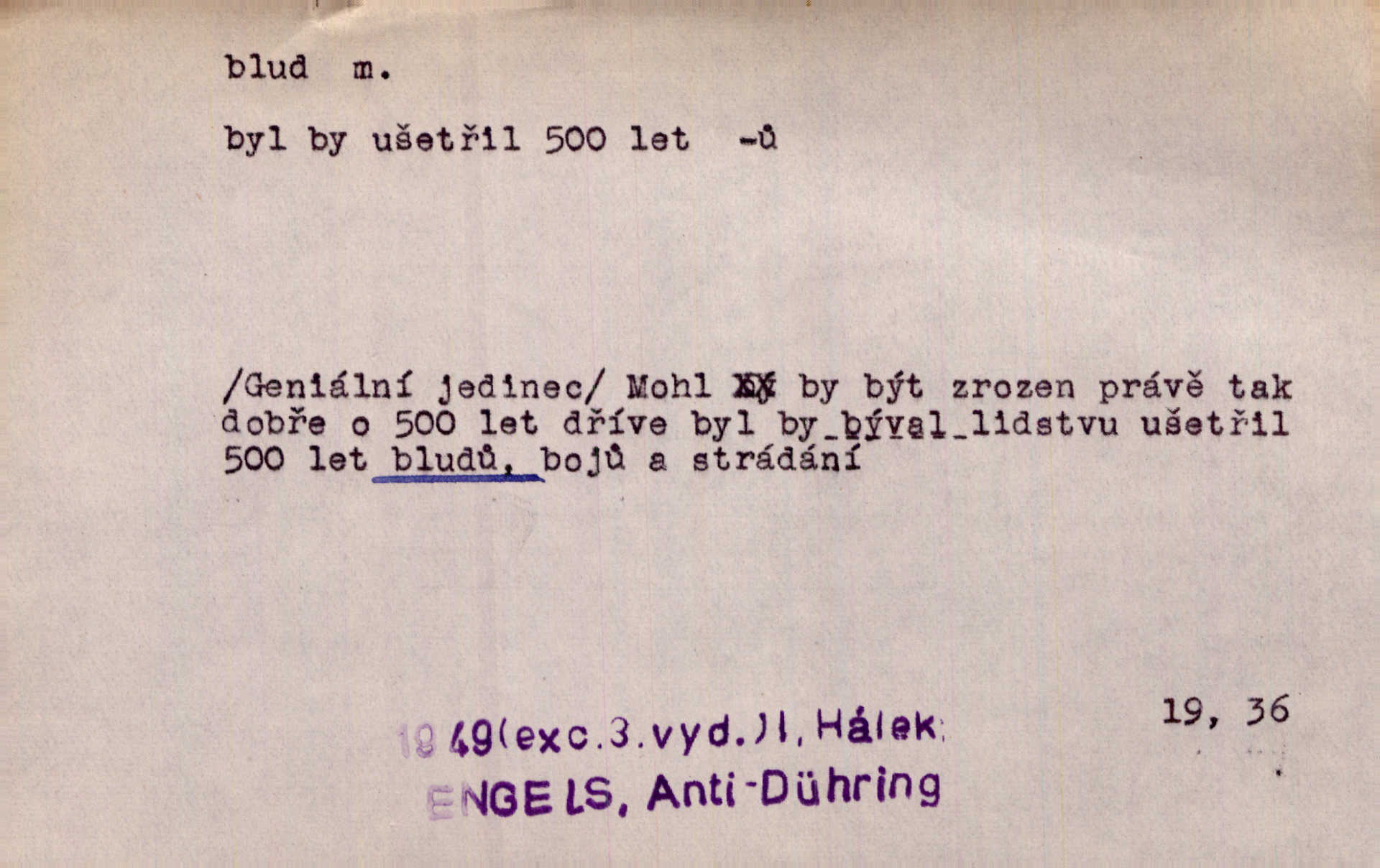- blud, -u m. nesprávný názor; chyba. Vzdělanost chrání tě před klamy a bludy. Arb. Byl v tom veliký omyl a blud, když se dřív taková svoboda trpěla. Jir. Zavésti někoho v blud, vyvésti z bludu. Upadnouti v blud, poznati svůj blud. D Círk. odchylné přesvědčení ve věcech víry. Bludy Táborů. Lék. chorobný úsudek.