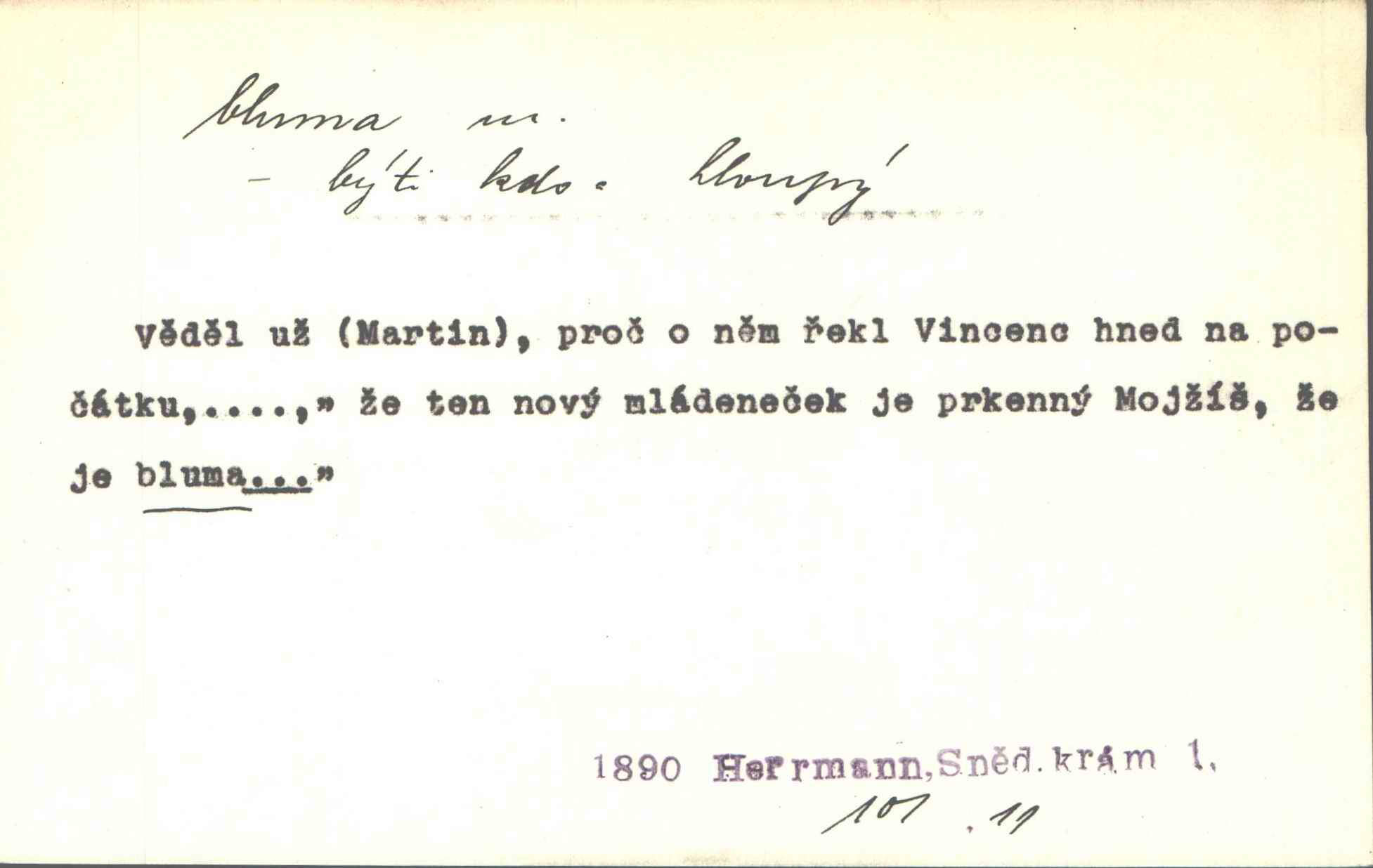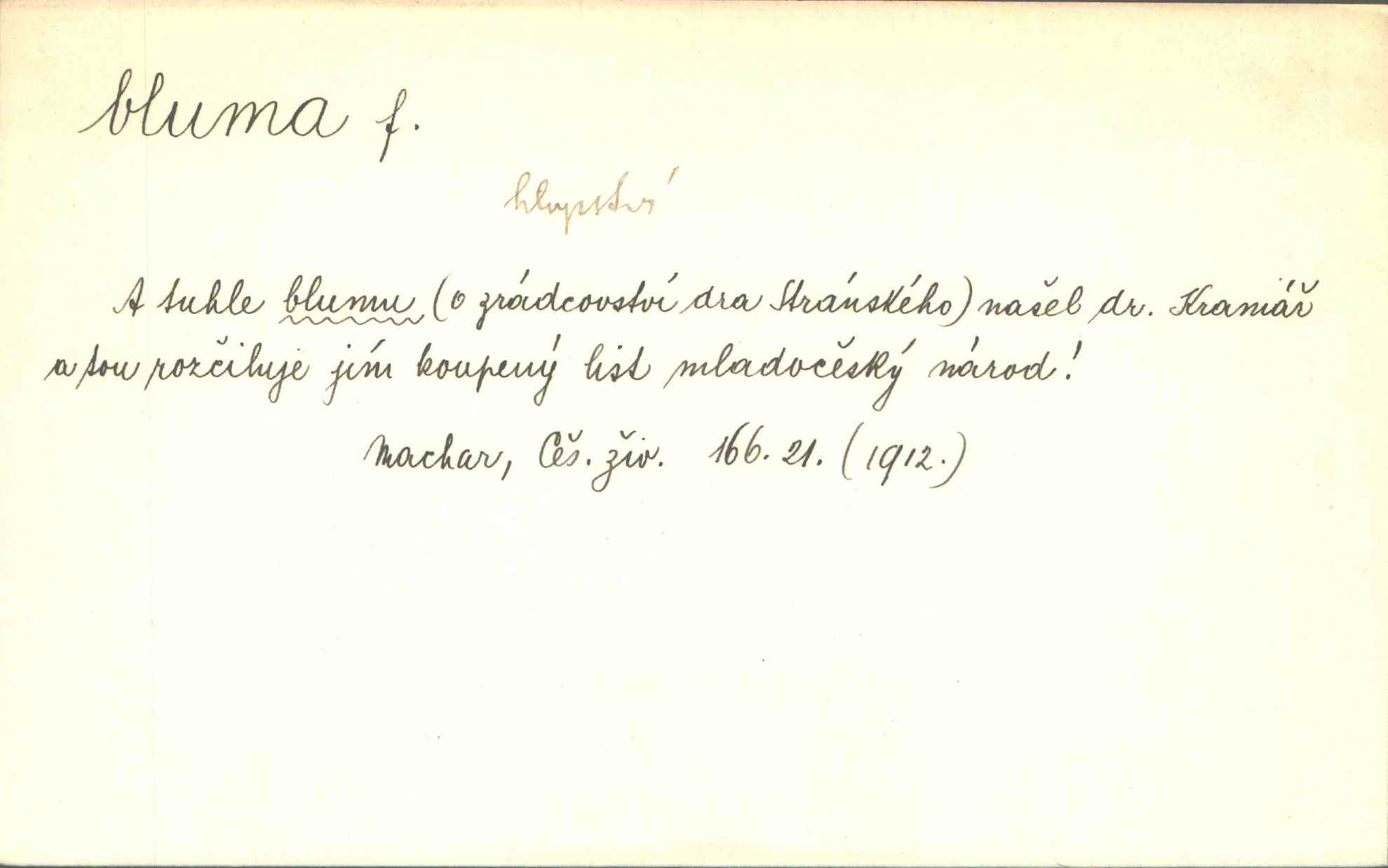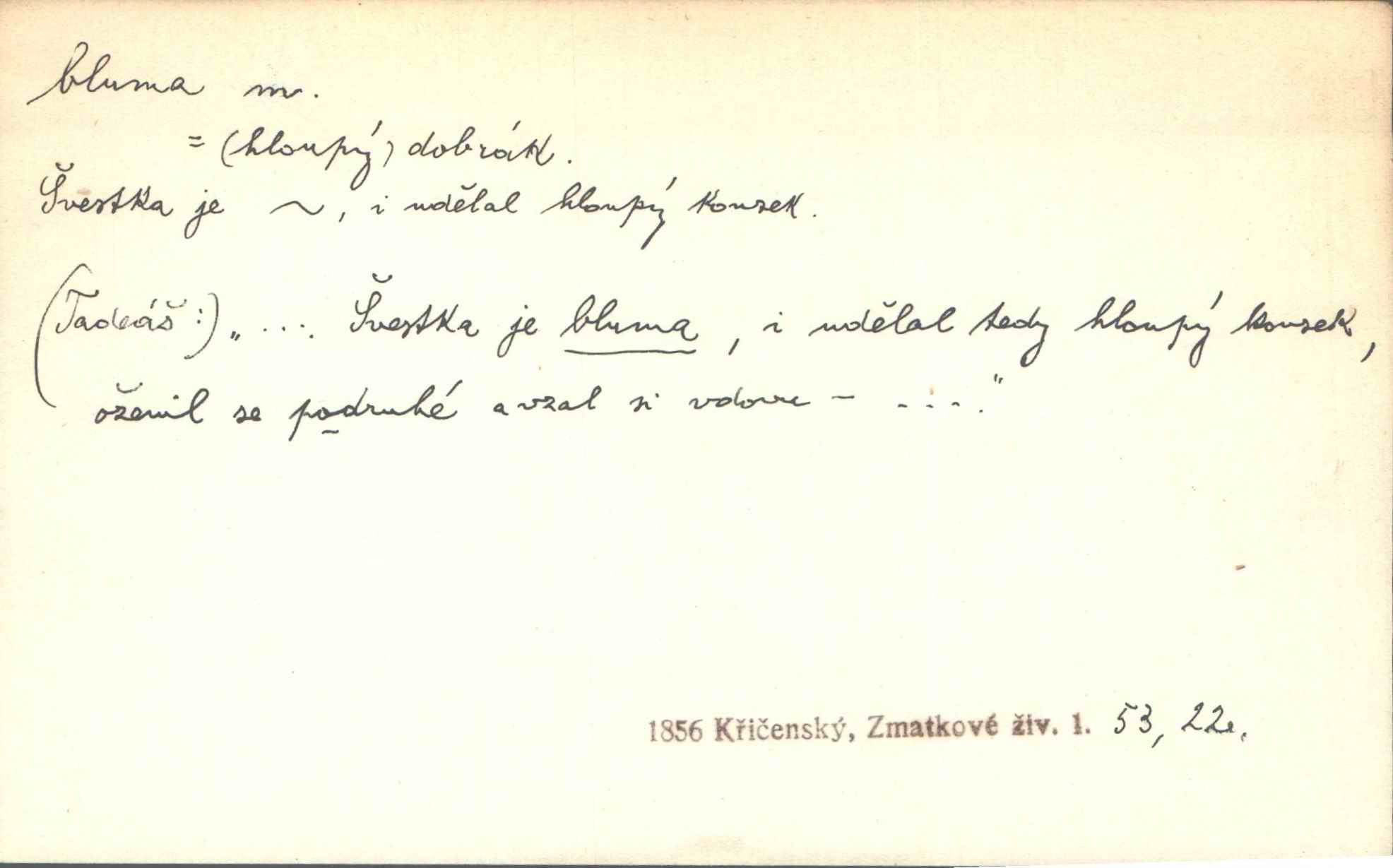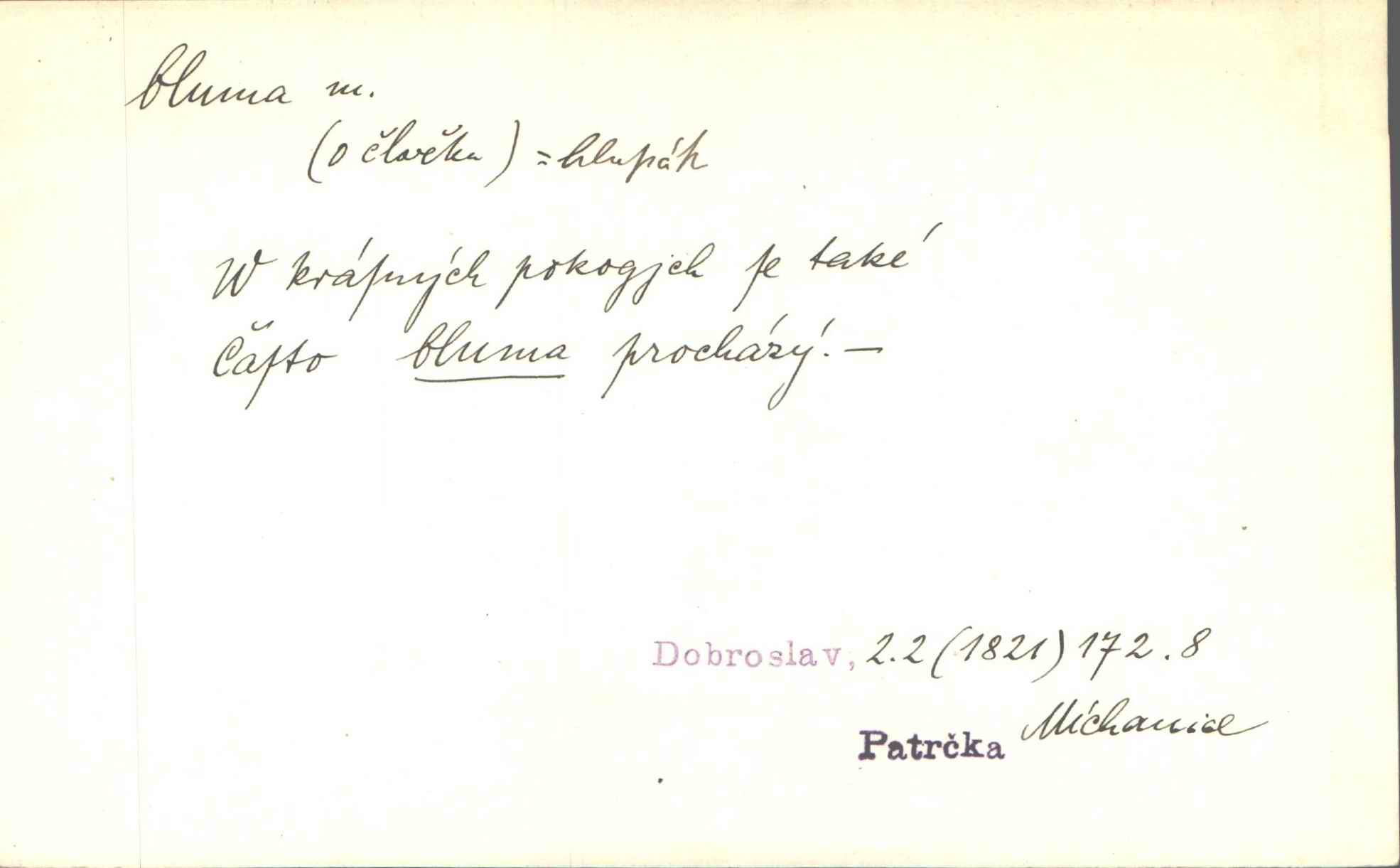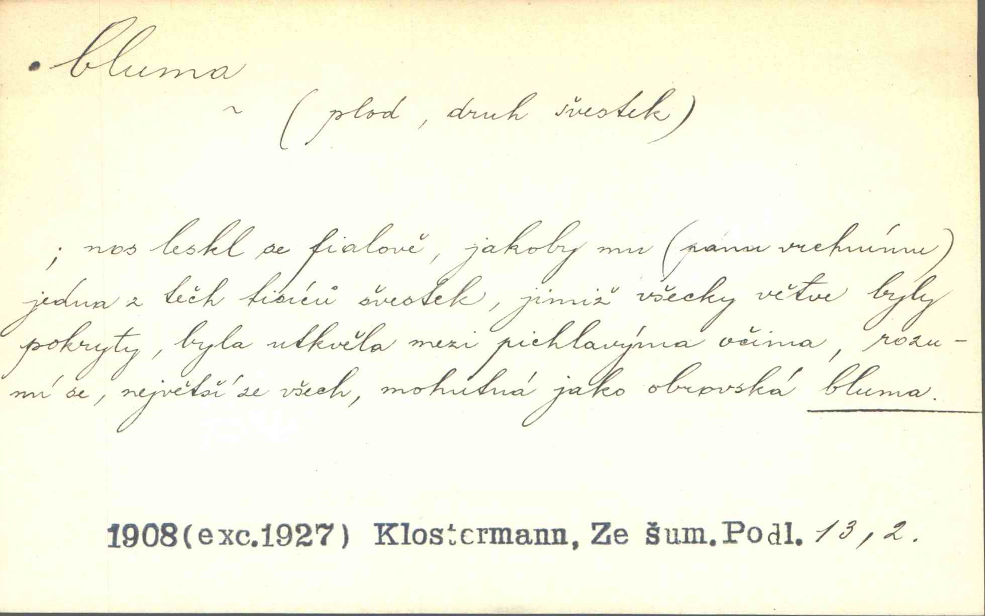 - bluma, -y f. velká švestka (zakulaceného tvaru); strom nesoucí takové švestky. D Lid. budižkničemu, váhal, hlupák. Měla zlost na Josífka, že je bluma a nechá se bránit od děvčete. Něm.