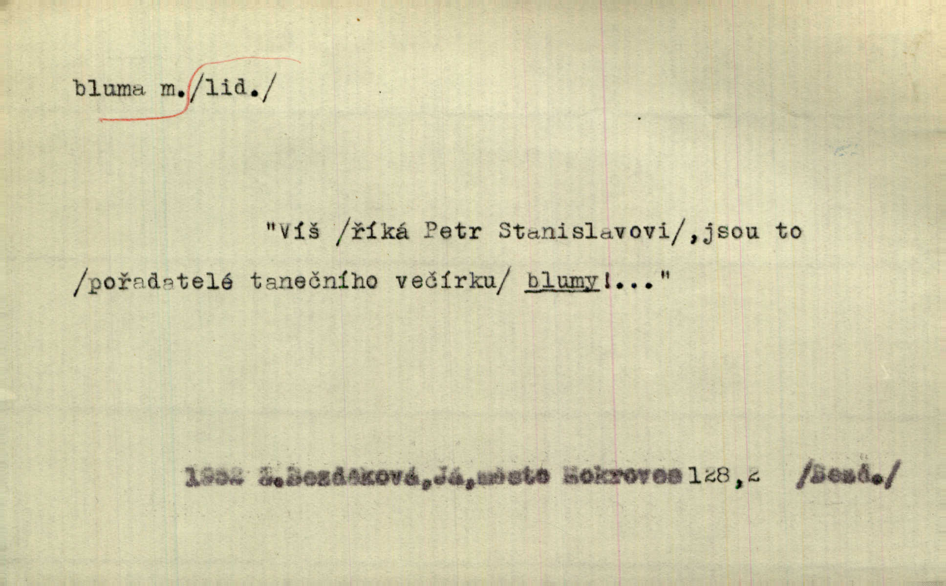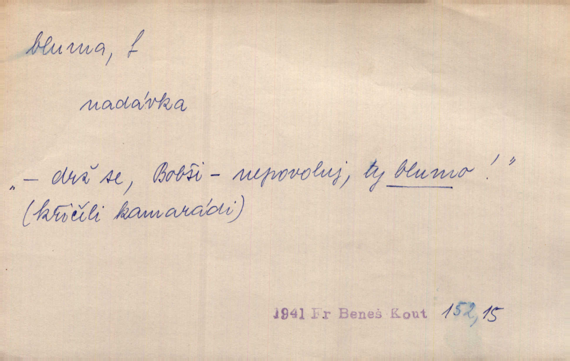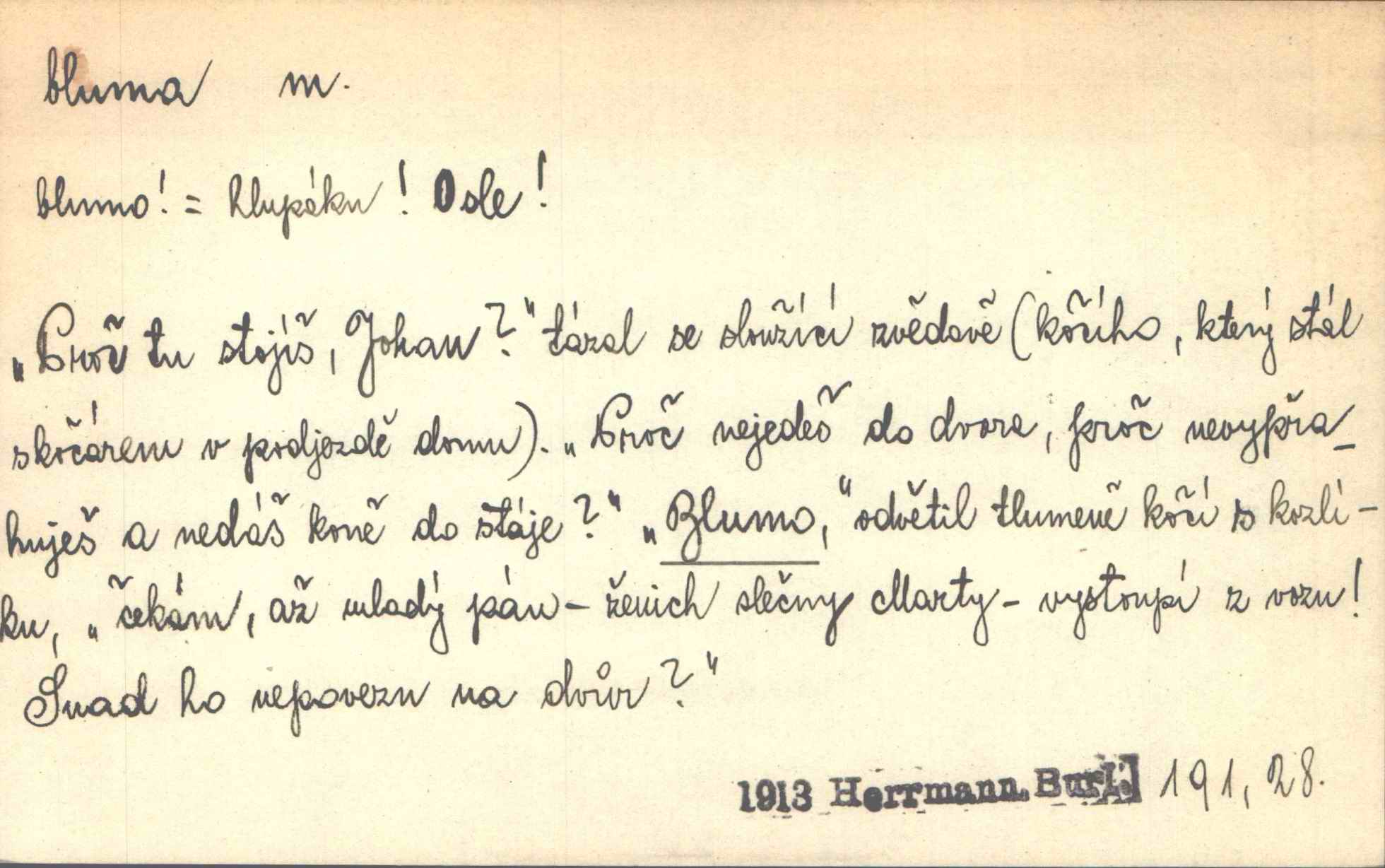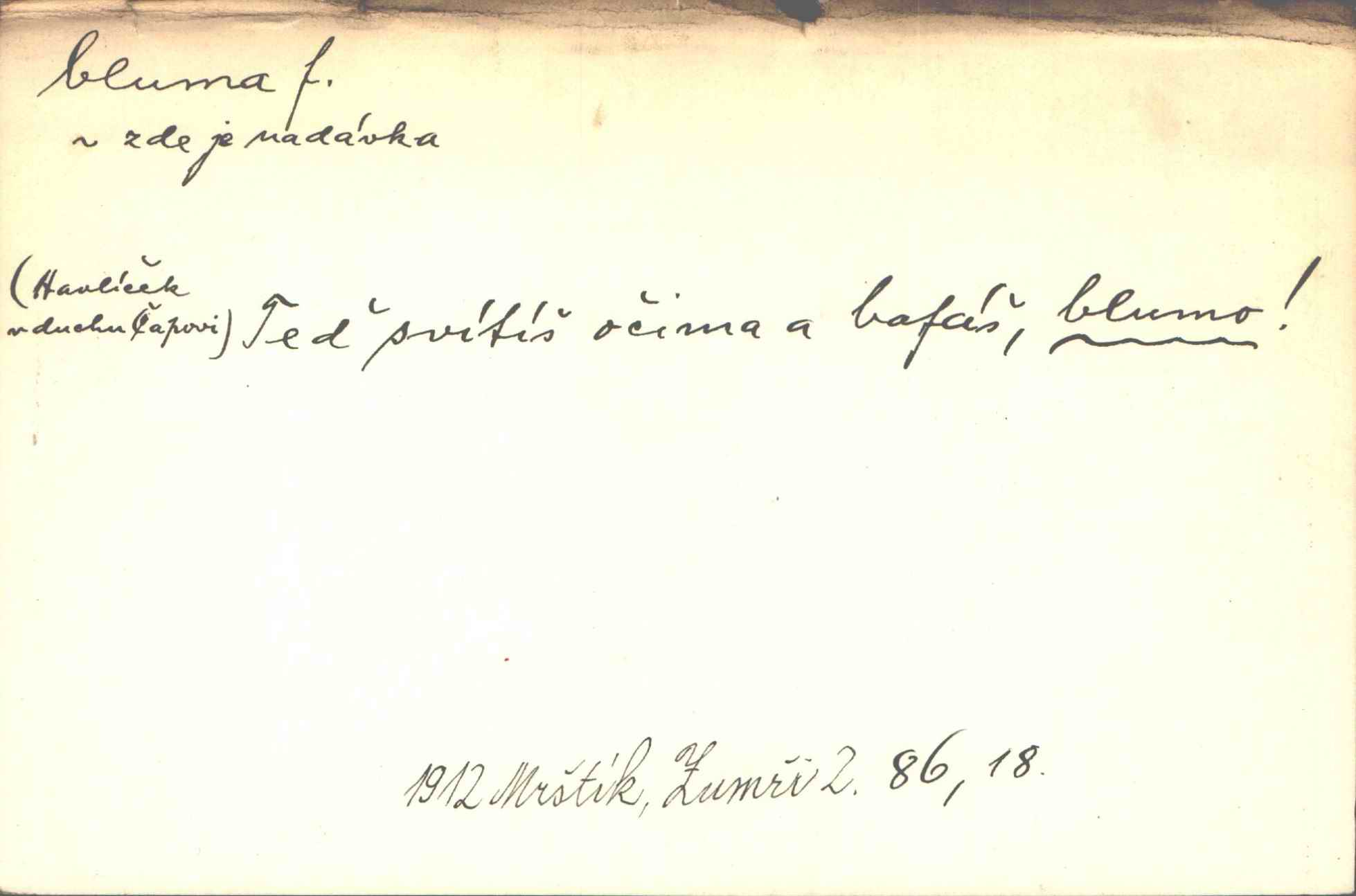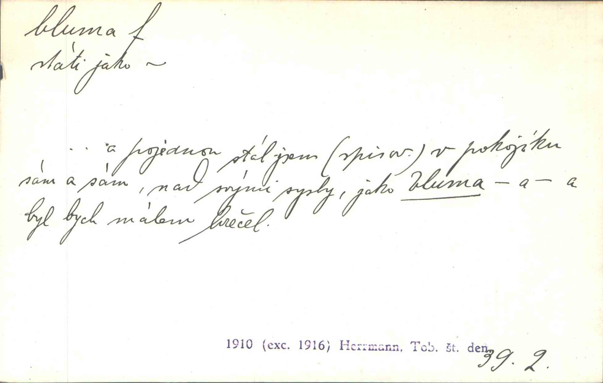 - bluma, -y f. velká švestka (zakulaceného tvaru); strom nesoucí takové švestky. D Lid. budižkničemu, váhal, hlupák. Měla zlost na Josífka, že je bluma a nechá se bránit od děvčete. Něm.