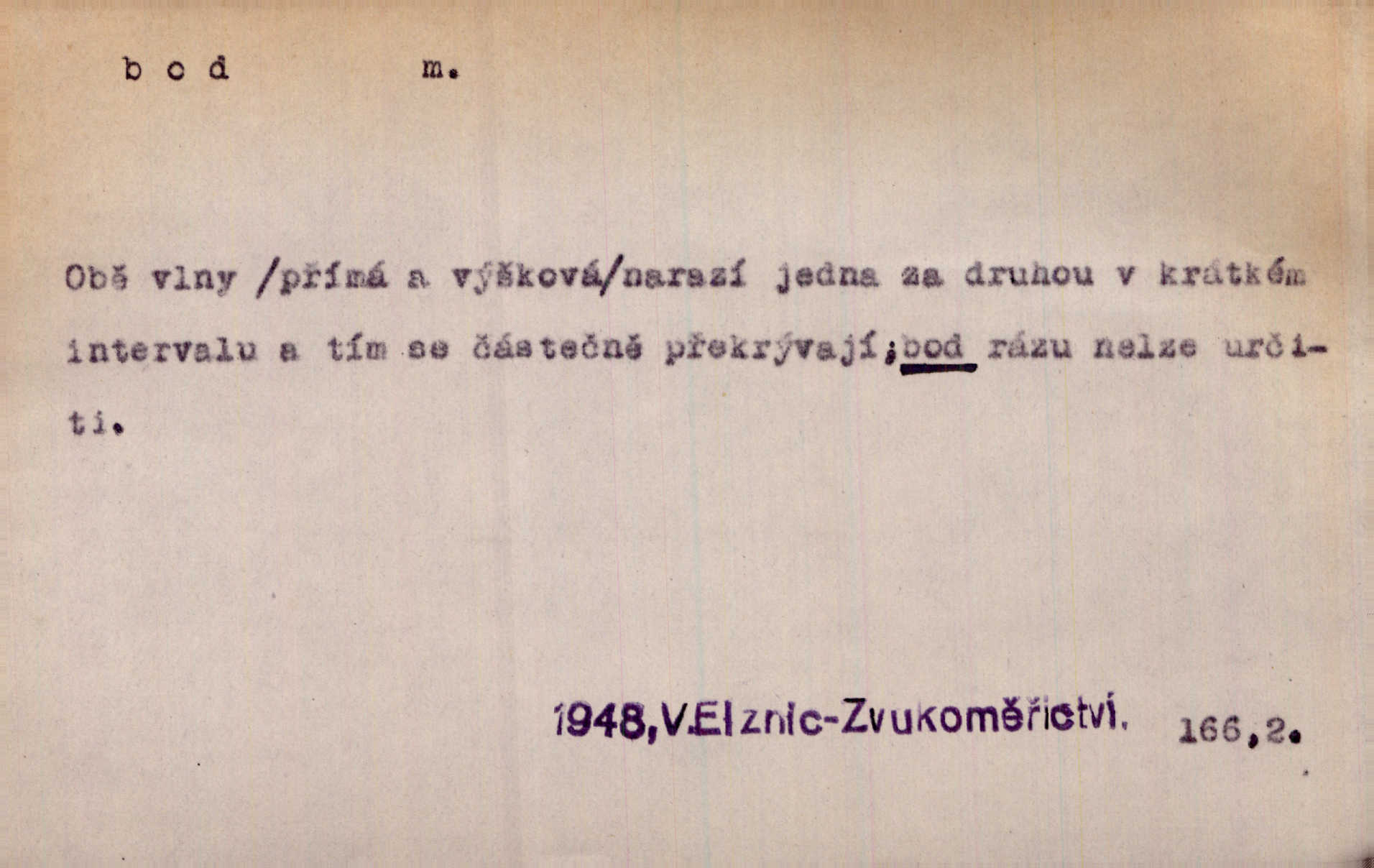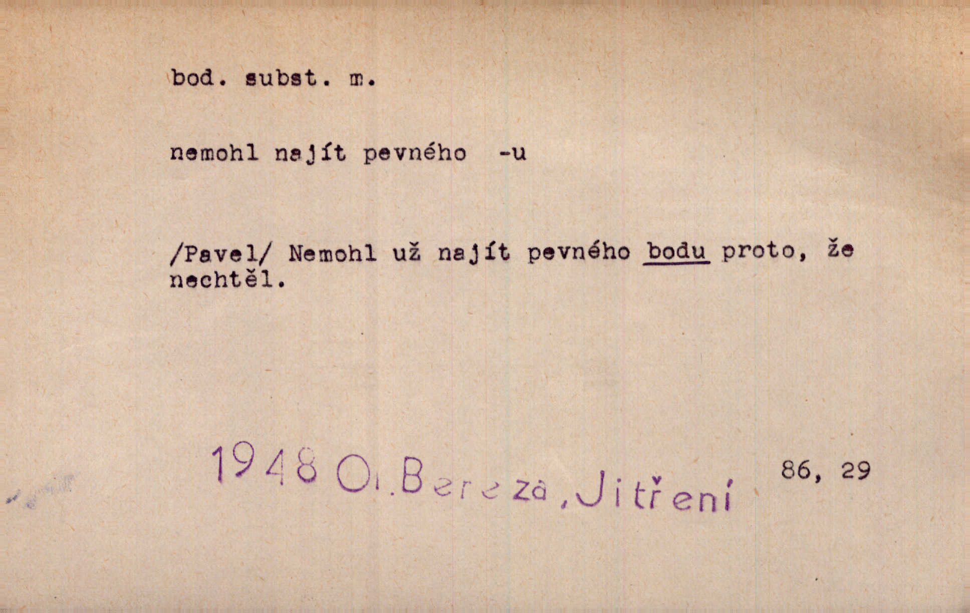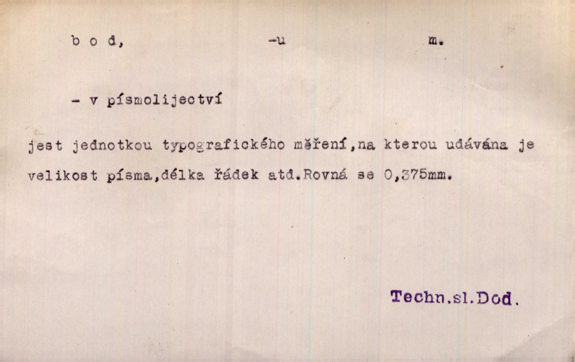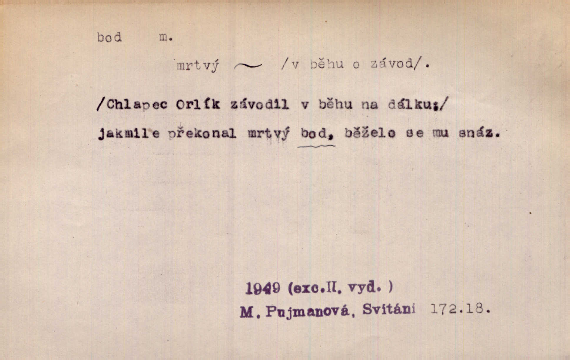 - bod, -u m. mat. nejjednodušší geometrický útvar, znázorňovaný tečkou, průsečíkem dvou čar a p., nejmenší místo v ploše, v prostoru. Astron. bod jarní a bod podzimní průsečíky dráhy sluneční a rovníku nebeského za jarní a podzimní rovnodennosti. Fys. bod tání, bod mrazu, bod tuhnutí hranice, mez, při níž taje látka tuhá n. tuhne kapalina; bod varu hranice, mez, při níž kapalina vře. Bod obratu kdy mechanismus mění smysl svého pohybu. Mrtvý bod přechodná nehybnost některé části mechanismu; přen. přechodné ustání nějakého děje. Dnes je naše i cizí hudba na mrtvém bodu. Smet. Obch. vývozní zlatový bod nejvyšší kurs devisy, nad kterým se vyplácí posílati do ciziny zlato. Dovozní zlatový bod nejnižší kurs, při kterém se vyplácí posílati zlato do ciziny. D tečka n. zcela nepatrná plocha jevící se jako tečka. Místo výkresu spatřil jsem na listech pouhé body a přímé čáry, jež jen tu a tam spojeny byly několika křivkami. Arb. Je klamem vaše písmo od počátku až do konce, až na poslední bod! Heyd. Zřím hory, nivy, zřídla jak temné čáry, města jako body. Vrch. Ondřej myslil, že posud lze rozeznati černý bod, o němž se domníval, že jest povozem. Zey. Sem tam kmitaly se zářivé body rudých světel. Jir. Filat. body na poštovních známkách, aby se znesnadnilo padělání. D malá část plochy, prostoru n. krajiny: malé místo n. místo vůbec. V jeden bod když velké upřeš oči, hned v touze k tobě vztahují se ruce. Vrch. Ostrov Bourbon je nejkrásnější bod Indického oceánu co do bujné vegetace tropické. Vrch. Sad barcelonský byl krásný sad či zahrada, spočívající na bohatých sloupech na nejvyšším bodu města. Vrch. Voj. opěrný bod místo v terénu, které je svými vlastnostmi za boje důležité; přen. Pro tento případ nemám ve svých theoriích nijakého opěrného bodu opory, pomoci. Vach. D Méně správně ve význ. část, oddíl, prvek něčeho. Nejskvělejší bod slavnosti. Čap. Ch. U tohoto bodu svých úvah pan rada vždycky vzdychl. Čap. Ch. Starosta mohutným hlasem vpadl a opakoval jednotlivé body debaty. Baar. Já se své strany připojím ke kritice svých předřečníků ještě body další a neméně důležité. Olb. D Přen. stránka, vlastnost něčeho. Vylíčili jsme si svá dětská léta a našli v nich mnoho styčných bodů. Mach. V životě mém málo světlých bodů radostných okamžiků, chvil. Holý. Veškerá jeho morálka balansovala na dvou bodech: na pravdomluvnosti a snaze dostáti danému slovu. Arb. Lehce se přehoupl přes to, co by v každém jiném manželství bylo nejchoulostivějším bodem. Vrch. D Sport. jednotka k měření úspěchu ve hře a zápase. Míti nejvíce bodů. Spočítati své body. Vyhráti (prohráti) na body (při boxu) (op. vyhráti knock out). D zasažení bodnou zbraní n. podobným nástrojem, bodnutí. Teď na sek a teď na bod meč svůj chystá. Vrch. Napřáhl kordík k smrtivému bodu. Třeb. Jako body pronikala slova její mé srdce. Bozd. Lék. vykonati bod punkci.