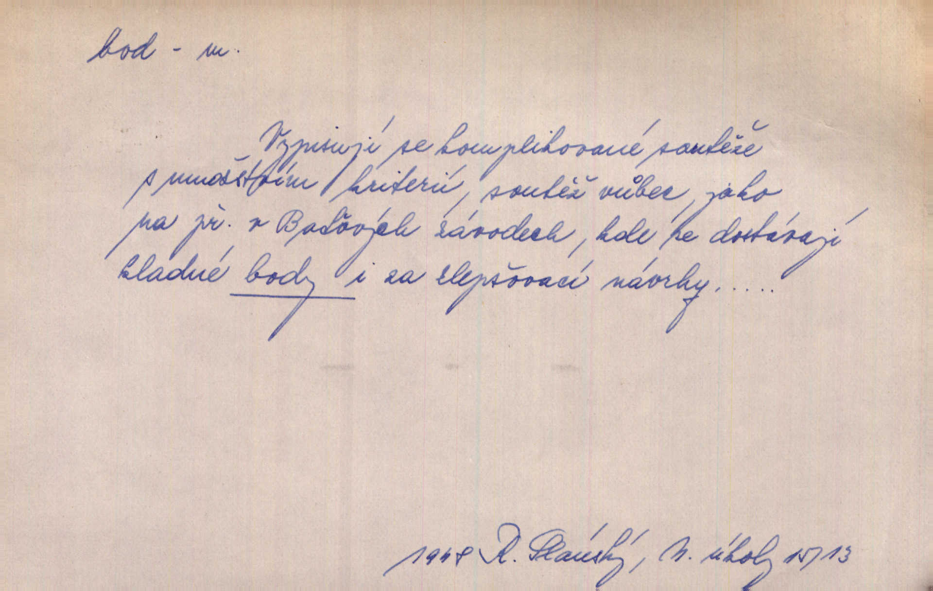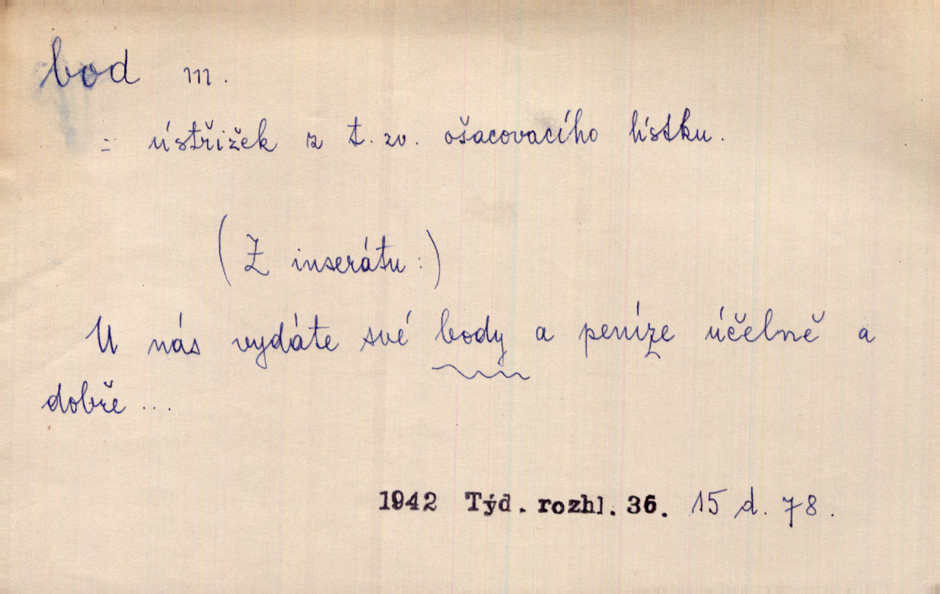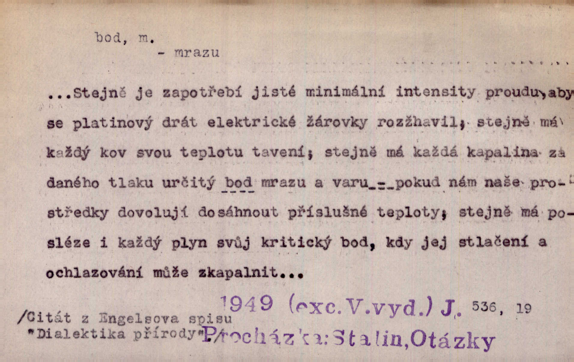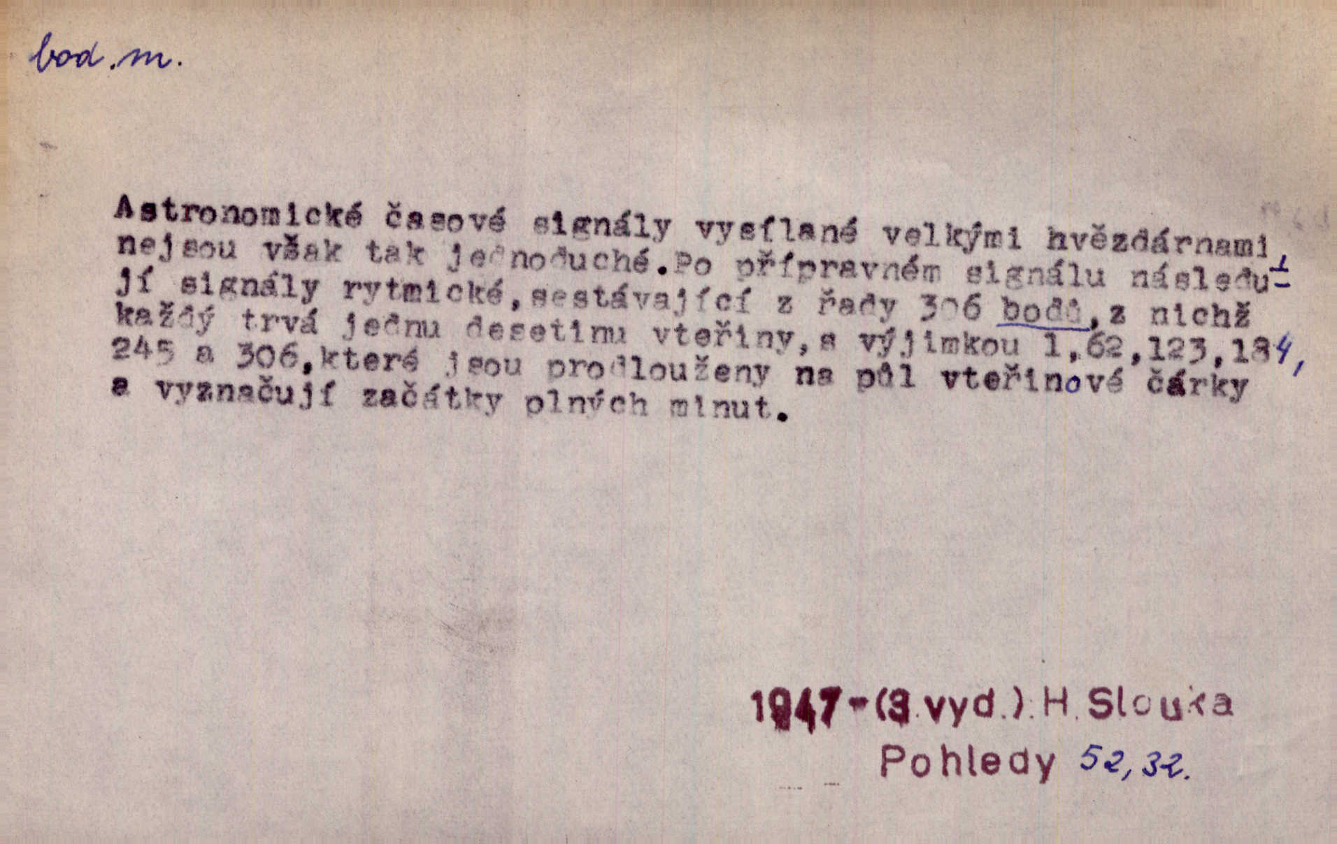 - bod, -u m. mat. nejjednodušší geometrický útvar, znázorňovaný tečkou, průsečíkem dvou čar a p., nejmenší místo v ploše, v prostoru. Astron. bod jarní a bod podzimní průsečíky dráhy sluneční a rovníku nebeského za jarní a podzimní rovnodennosti. Fys. bod tání, bod mrazu, bod tuhnutí hranice, mez, při níž taje látka tuhá n. tuhne kapalina; bod varu hranice, mez, při níž kapalina vře. Bod obratu kdy mechanismus mění smysl svého pohybu. Mrtvý bod přechodná nehybnost některé části mechanismu; přen. přechodné ustání nějakého děje. Dnes je naše i cizí hudba na mrtvém bodu. Smet. Obch. vývozní zlatový bod nejvyšší kurs devisy, nad kterým se vyplácí posílati do ciziny zlato. Dovozní zlatový bod nejnižší kurs, při kterém se vyplácí posílati zlato do ciziny. D tečka n. zcela nepatrná plocha jevící se jako tečka. Místo výkresu spatřil jsem na listech pouhé body a přímé čáry, jež jen tu a tam spojeny byly několika křivkami. Arb. Je klamem vaše písmo od počátku až do konce, až na poslední bod! Heyd. Zřím hory, nivy, zřídla jak temné čáry, města jako body. Vrch. Ondřej myslil, že posud lze rozeznati černý bod, o němž se domníval, že jest povozem. Zey. Sem tam kmitaly se zářivé body rudých světel. Jir. Filat. body na poštovních známkách, aby se znesnadnilo padělání. D malá část plochy, prostoru n. krajiny: malé místo n. místo vůbec. V jeden bod když velké upřeš oči, hned v touze k tobě vztahují se ruce. Vrch. Ostrov Bourbon je nejkrásnější bod Indického oceánu co do bujné vegetace tropické. Vrch. Sad barcelonský byl krásný sad či zahrada, spočívající na bohatých sloupech na nejvyšším bodu města. Vrch. Voj. opěrný bod místo v terénu, které je svými vlastnostmi za boje důležité; přen. Pro tento případ nemám ve svých theoriích nijakého opěrného bodu opory, pomoci. Vach. D Méně správně ve význ. část, oddíl, prvek něčeho. Nejskvělejší bod slavnosti. Čap. Ch. U tohoto bodu svých úvah pan rada vždycky vzdychl. Čap. Ch. Starosta mohutným hlasem vpadl a opakoval jednotlivé body debaty. Baar. Já se své strany připojím ke kritice svých předřečníků ještě body další a neméně důležité. Olb. D Přen. stránka, vlastnost něčeho. Vylíčili jsme si svá dětská léta a našli v nich mnoho styčných bodů. Mach. V životě mém málo světlých bodů radostných okamžiků, chvil. Holý. Veškerá jeho morálka balansovala na dvou bodech: na pravdomluvnosti a snaze dostáti danému slovu. Arb. Lehce se přehoupl přes to, co by v každém jiném manželství bylo nejchoulostivějším bodem. Vrch. D Sport. jednotka k měření úspěchu ve hře a zápase. Míti nejvíce bodů. Spočítati své body. Vyhráti (prohráti) na body (při boxu) (op. vyhráti knock out). D zasažení bodnou zbraní n. podobným nástrojem, bodnutí. Teď na sek a teď na bod meč svůj chystá. Vrch. Napřáhl kordík k smrtivému bodu. Třeb. Jako body pronikala slova její mé srdce. Bozd. Lék. vykonati bod punkci.
