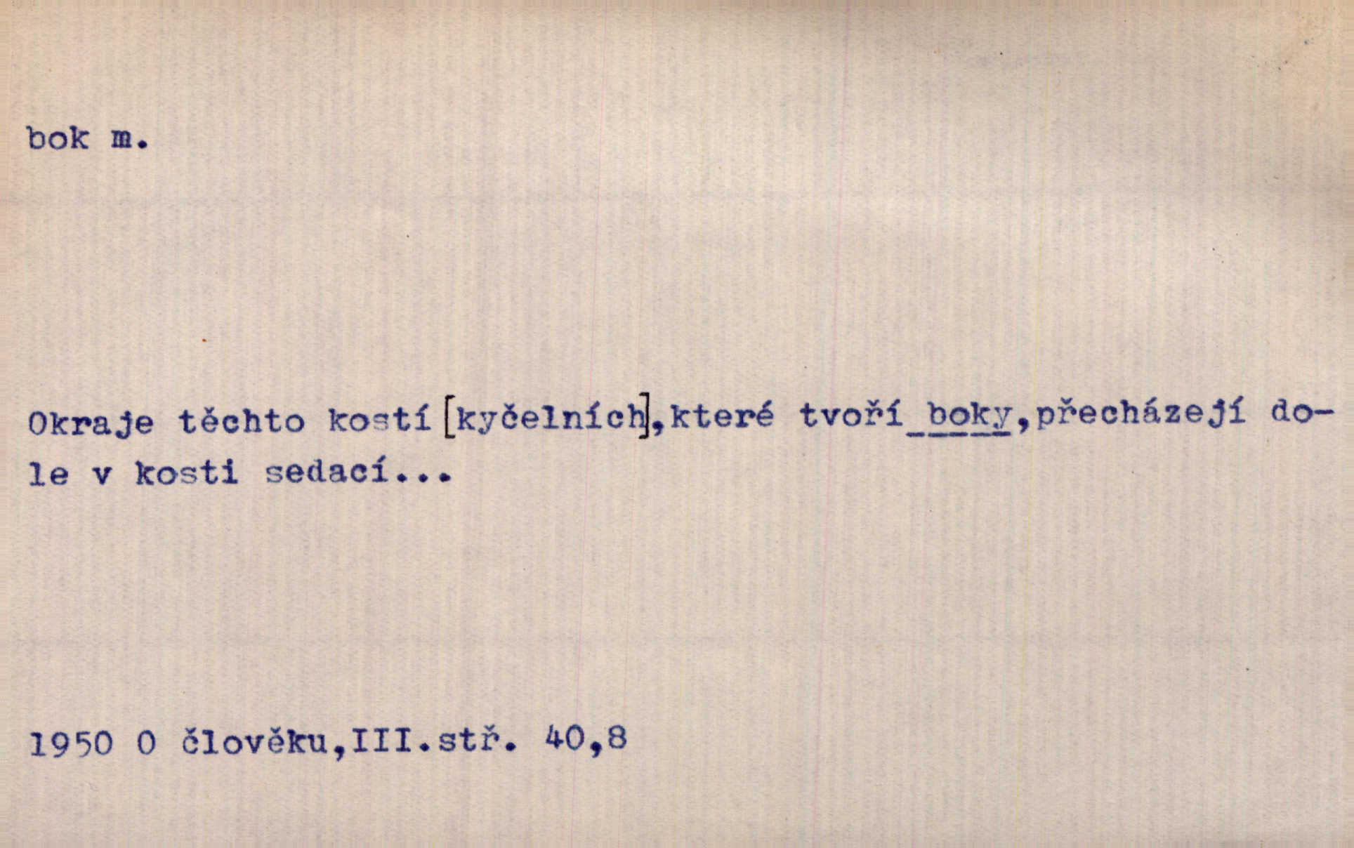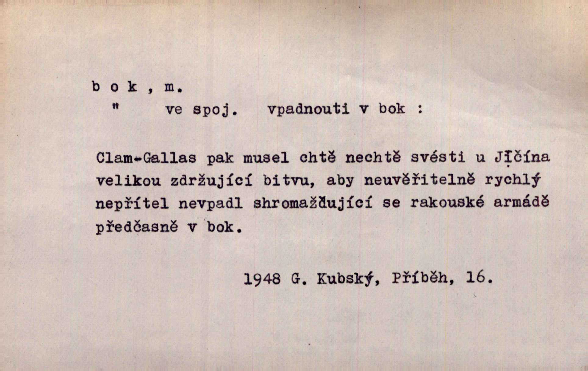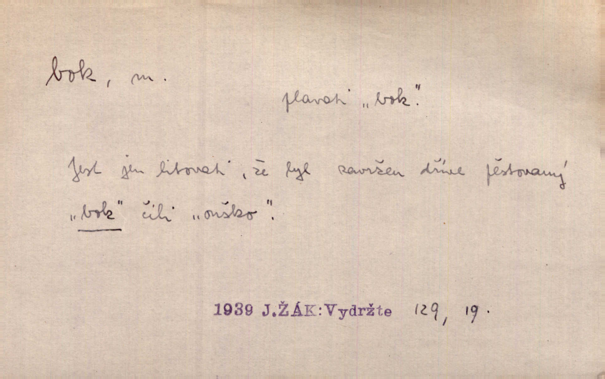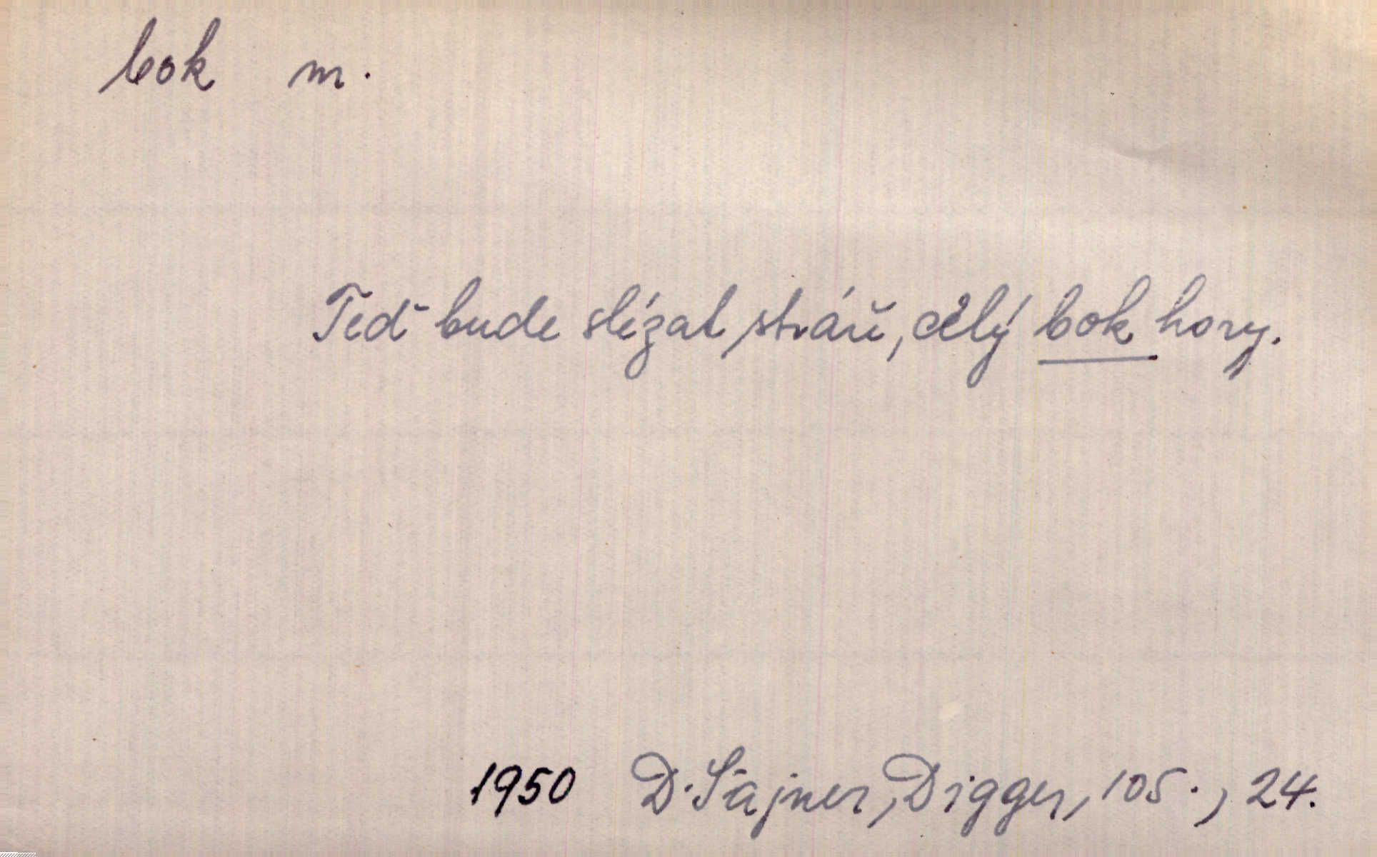 - bok, -u m. postranní část těla omezená obloukem žeber a hřebenem kyčle. Olšovský objal dívku okolo boků. Pfleg. Koňům od udidel i s boků prchala bílá pěna. Jir. Měla na sobě šaty modré, kolem boku spjaté atlasovým pasem. V. Mrš. Po boku se mu houpal kordík. Svět. Míti píchání v boku, lehnouti si na bok, podepříti si boky, založiti ruce v boky, obraceti se s boku na bok. Smál se, až se za boky bral. Plování na bok. Bok po boku těsně vedle sebe. Po boku, po bok vedle, ve společnosti, ve společenství, ve spojitosti a j. Dáma po boku štíhlého jonáka. Mácha. Rytířovi po boku mnich used’ v loubí stinném. Vrch. Postavil se jí po bok. Jir. Trávila věk svůj po boku muže chorobného. Svět. Jen krása vše tu měří, jíž pravda v boku jde. Vrch. Státi komu po boku pomáhati. Čechové i Moravané stáli sobě věrně po boku. Pal. Když poznala hořkost osudu, tu stála jí matka po boku s posilou a radou. Podl. Stavěti po bok na roveň stavěti. Básník, jemuž z nyní žijících nikoho po bok stavěti nemůžeme. Neb. Národ náš důstojně postaviti se mohl po bok národům jiným. Šmil. S boku, z boku, bokem stranou, šikmo, přen. úkosem. Strojil se s boku na hosta parohem udeřiti. Hol. Pošilhávala naň s boku. Staš. Krabi bokem utíkali do vody. Maj. Helena bokem hleděla před sebe. V. Mrš. Nepravím slov křivých v ucho, nechyl hlavy, nehleď bokem, nerdi se mi, ty děvucho! Bezr. Dítě z levého boku nemanželské. D strana, postranní stěna nějakého předmětu (op. předek, fronta). Již lze zříti lichoběžné boky a pestrá nároží předměstských domů. Vanč. Po boku povozu šel párek manželů. Rais. Boky lodi, klenby. Voj. těl. vpravo v bok, vlevo v bok! otoč se vpravo, vlevo. Bok vojska. Krýti bok, napadnouti s boku. Odkrytý bok. Rozvinouti v bok. D Geogr. úbočí, svah, stráň. Šerá hora Kunětická v rovině rozkládala rozdrásané boky. Rais. Boky úzkého údolí byly zarostlejší. Jir. Jako ostrov v zeleném moři, jehož boky vzedmuté vlny ještě polévají, tak tu stojí fara až po pás porostlá vínem. Baar.