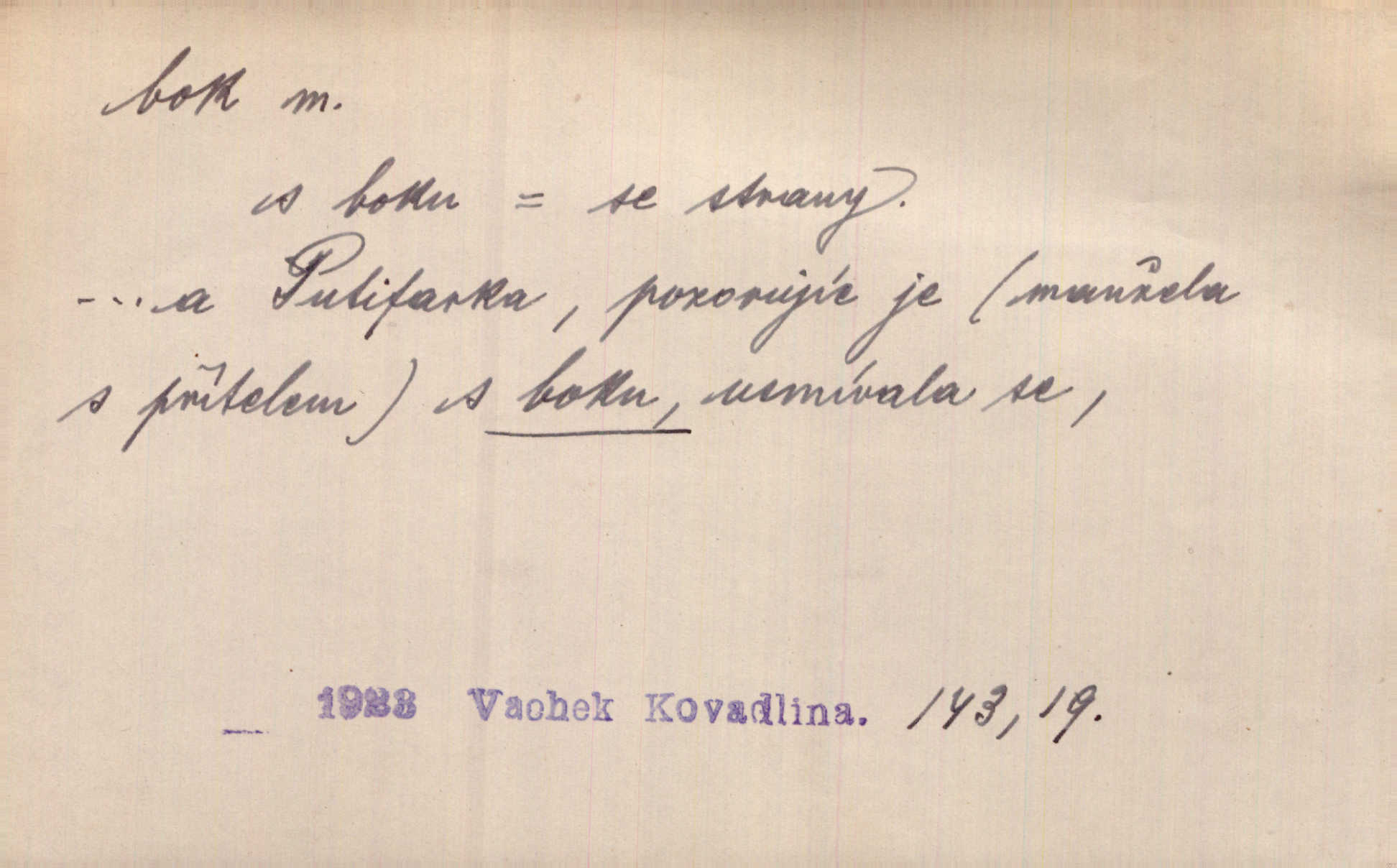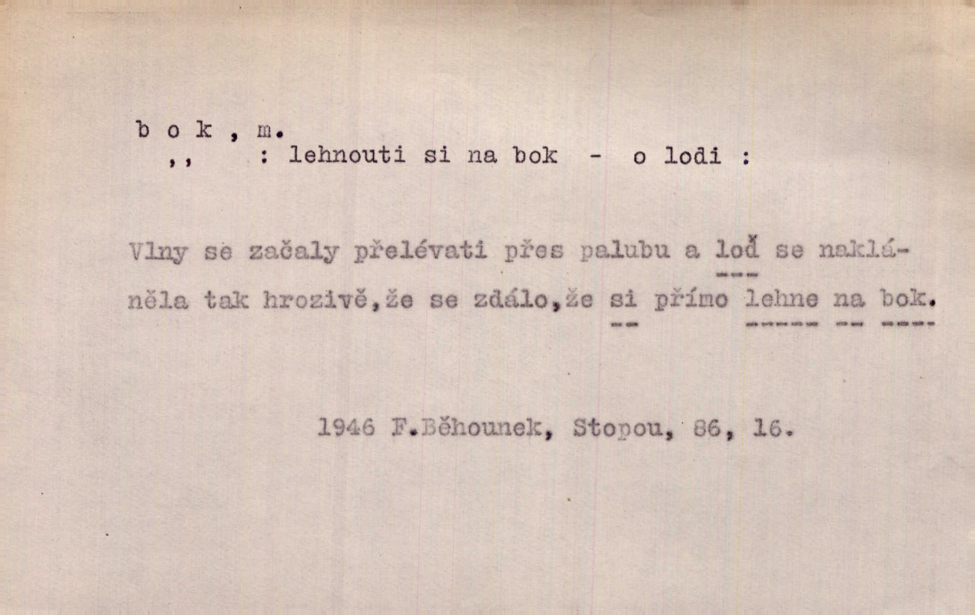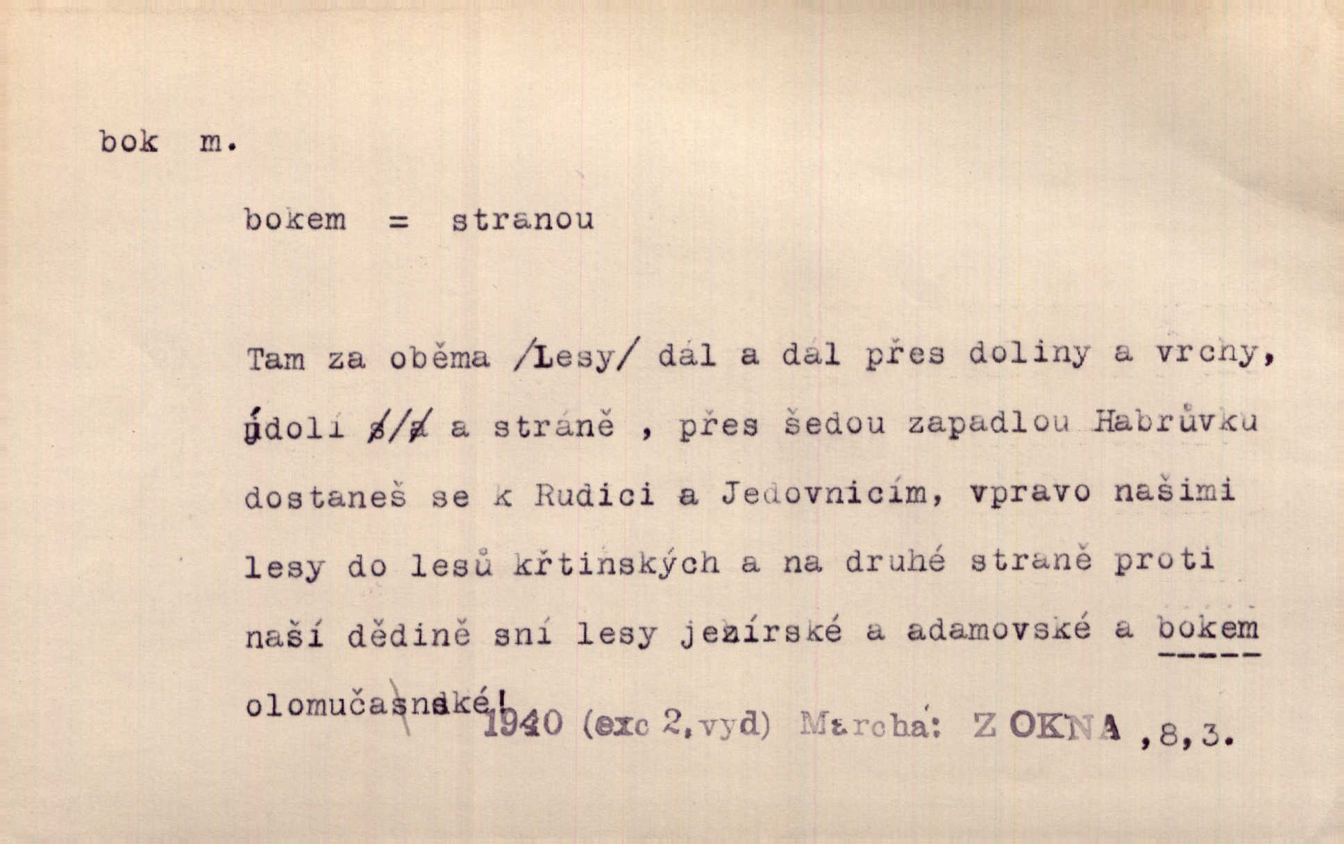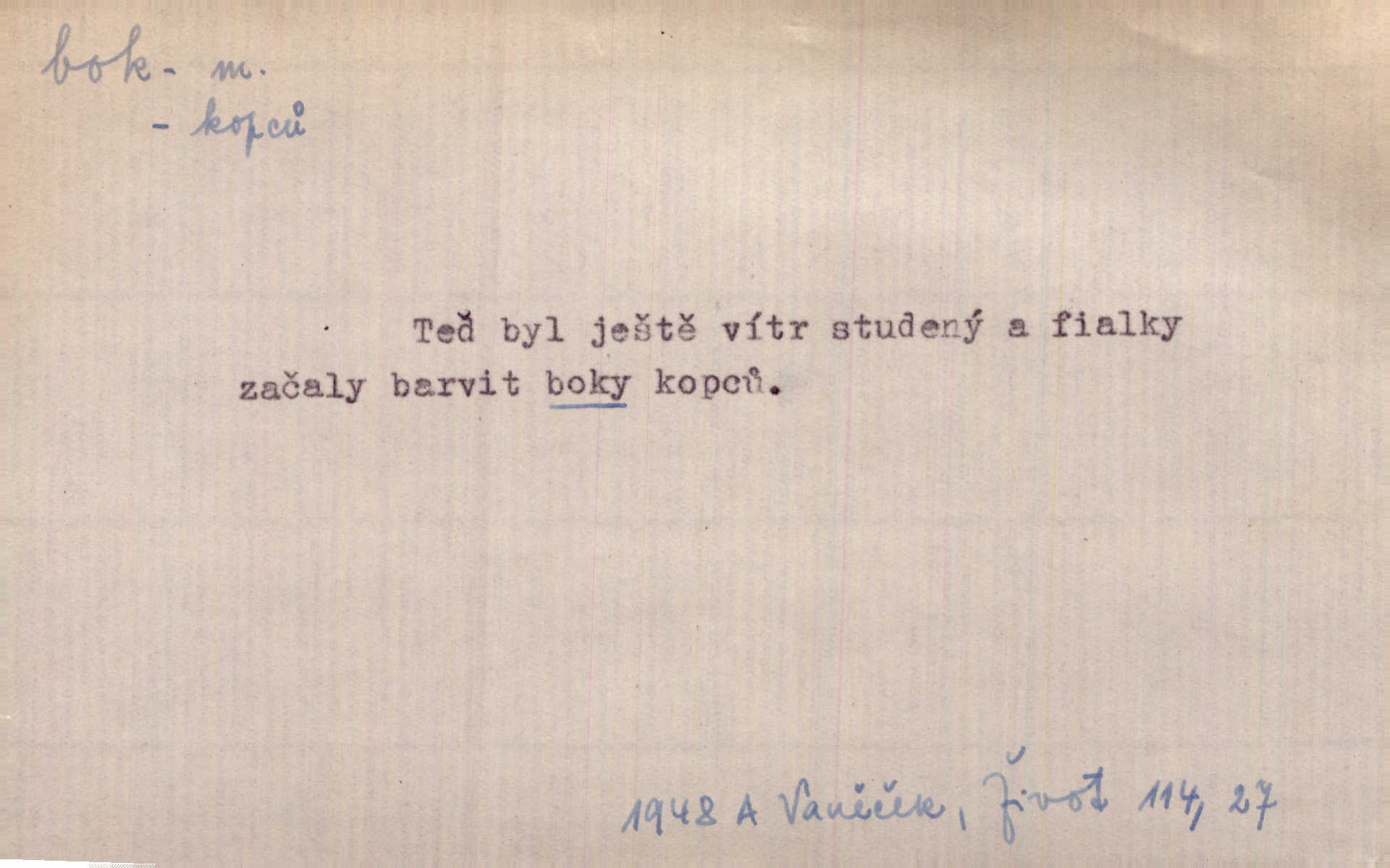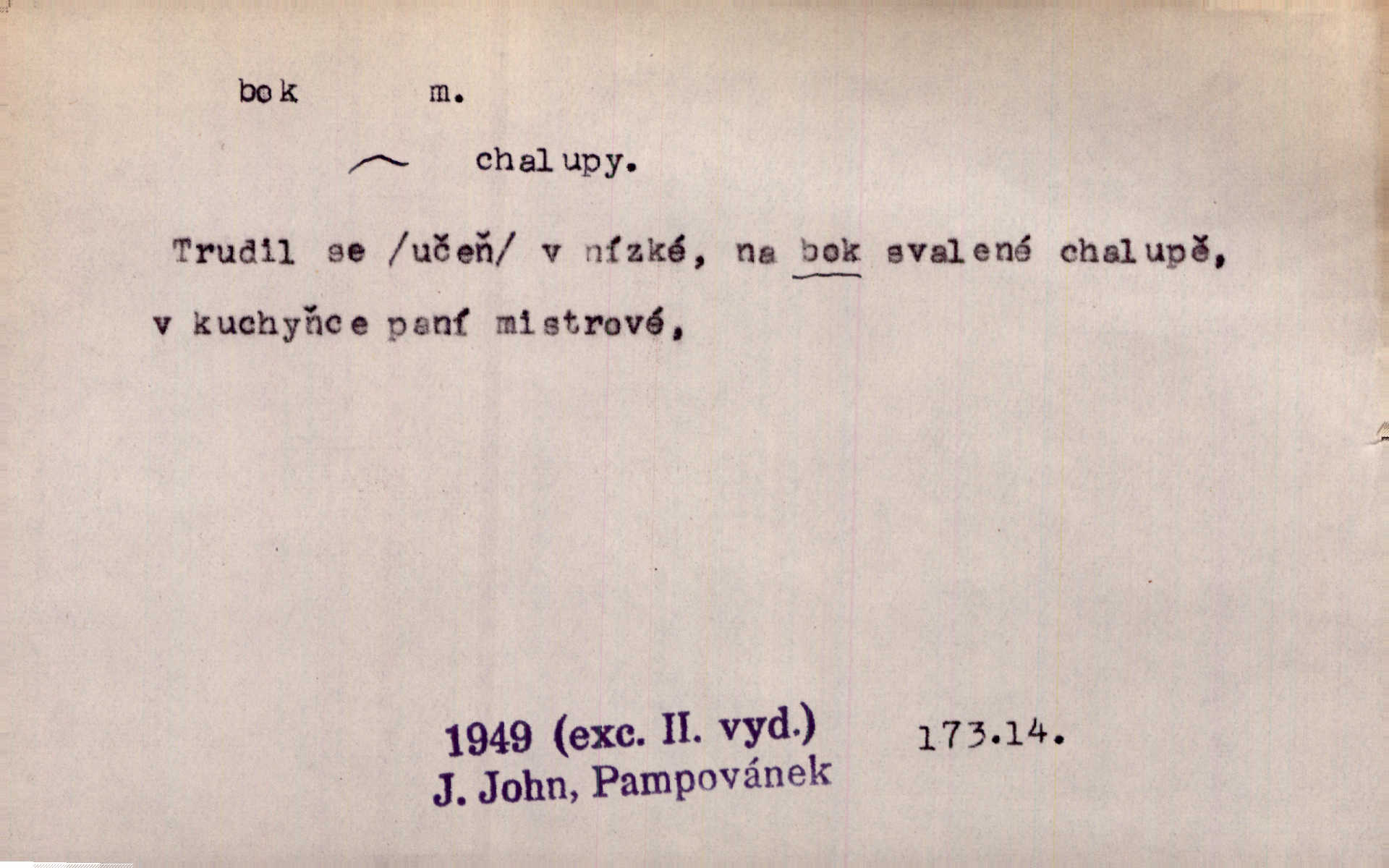 - bok, -u m. postranní část těla omezená obloukem žeber a hřebenem kyčle. Olšovský objal dívku okolo boků. Pfleg. Koňům od udidel i s boků prchala bílá pěna. Jir. Měla na sobě šaty modré, kolem boku spjaté atlasovým pasem. V. Mrš. Po boku se mu houpal kordík. Svět. Míti píchání v boku, lehnouti si na bok, podepříti si boky, založiti ruce v boky, obraceti se s boku na bok. Smál se, až se za boky bral. Plování na bok. Bok po boku těsně vedle sebe. Po boku, po bok vedle, ve společnosti, ve společenství, ve spojitosti a j. Dáma po boku štíhlého jonáka. Mácha. Rytířovi po boku mnich used’ v loubí stinném. Vrch. Postavil se jí po bok. Jir. Trávila věk svůj po boku muže chorobného. Svět. Jen krása vše tu měří, jíž pravda v boku jde. Vrch. Státi komu po boku pomáhati. Čechové i Moravané stáli sobě věrně po boku. Pal. Když poznala hořkost osudu, tu stála jí matka po boku s posilou a radou. Podl. Stavěti po bok na roveň stavěti. Básník, jemuž z nyní žijících nikoho po bok stavěti nemůžeme. Neb. Národ náš důstojně postaviti se mohl po bok národům jiným. Šmil. S boku, z boku, bokem stranou, šikmo, přen. úkosem. Strojil se s boku na hosta parohem udeřiti. Hol. Pošilhávala naň s boku. Staš. Krabi bokem utíkali do vody. Maj. Helena bokem hleděla před sebe. V. Mrš. Nepravím slov křivých v ucho, nechyl hlavy, nehleď bokem, nerdi se mi, ty děvucho! Bezr. Dítě z levého boku nemanželské. D strana, postranní stěna nějakého předmětu (op. předek, fronta). Již lze zříti lichoběžné boky a pestrá nároží předměstských domů. Vanč. Po boku povozu šel párek manželů. Rais. Boky lodi, klenby. Voj. těl. vpravo v bok, vlevo v bok! otoč se vpravo, vlevo. Bok vojska. Krýti bok, napadnouti s boku. Odkrytý bok. Rozvinouti v bok. D Geogr. úbočí, svah, stráň. Šerá hora Kunětická v rovině rozkládala rozdrásané boky. Rais. Boky úzkého údolí byly zarostlejší. Jir. Jako ostrov v zeleném moři, jehož boky vzedmuté vlny ještě polévají, tak tu stojí fara až po pás porostlá vínem. Baar.