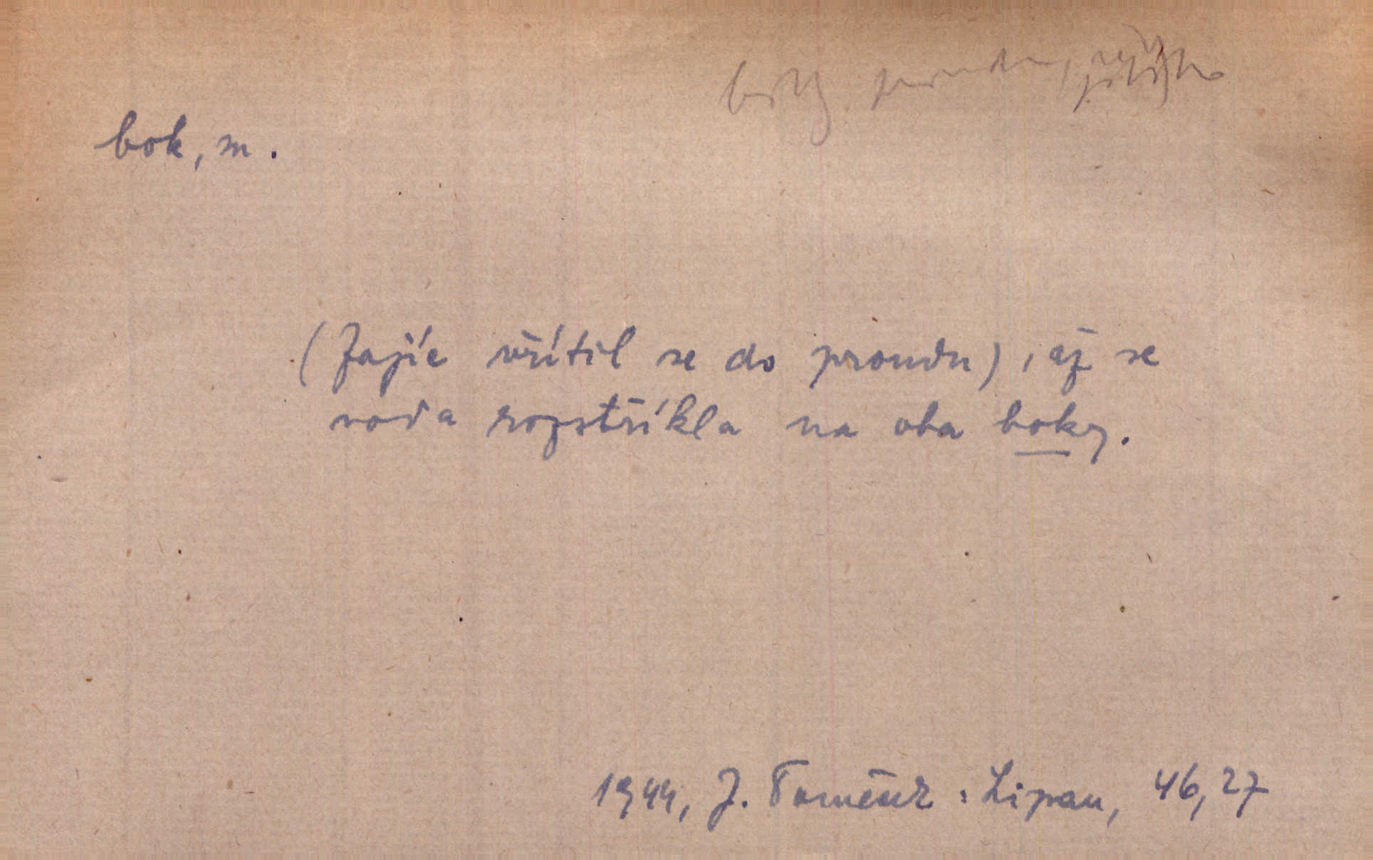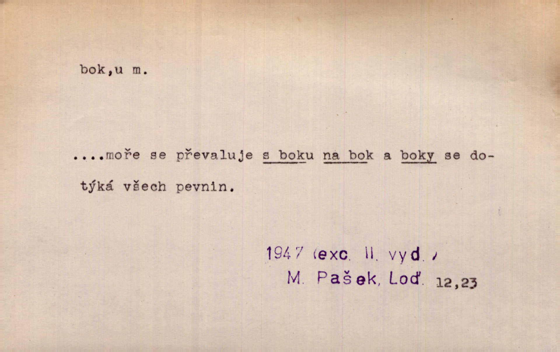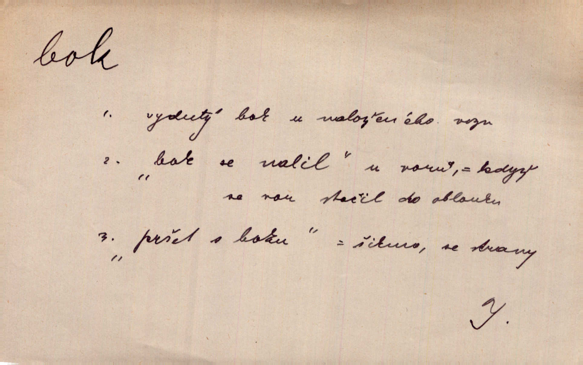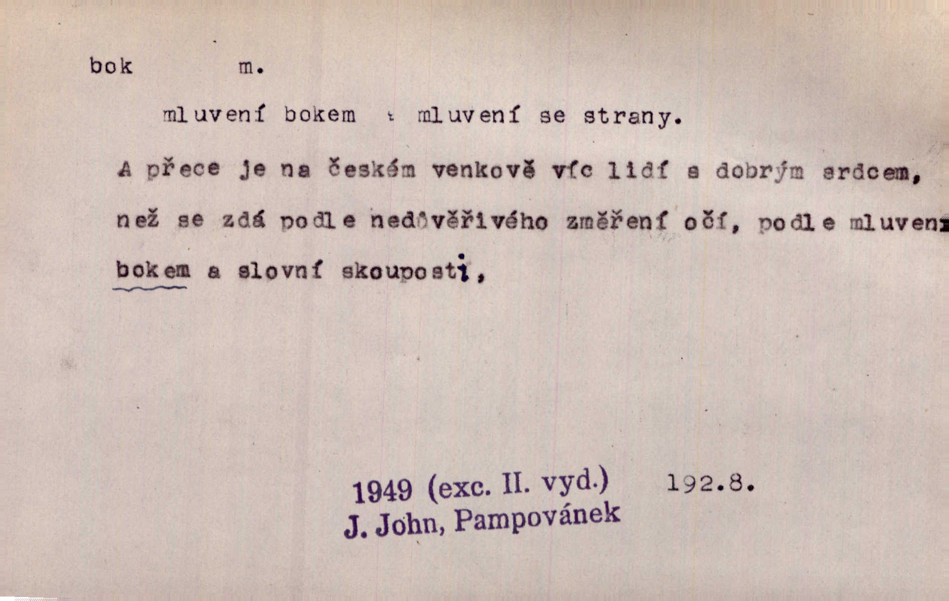 - bok, -u m. postranní část těla omezená obloukem žeber a hřebenem kyčle. Olšovský objal dívku okolo boků. Pfleg. Koňům od udidel i s boků prchala bílá pěna. Jir. Měla na sobě šaty modré, kolem boku spjaté atlasovým pasem. V. Mrš. Po boku se mu houpal kordík. Svět. Míti píchání v boku, lehnouti si na bok, podepříti si boky, založiti ruce v boky, obraceti se s boku na bok. Smál se, až se za boky bral. Plování na bok. Bok po boku těsně vedle sebe. Po boku, po bok vedle, ve společnosti, ve společenství, ve spojitosti a j. Dáma po boku štíhlého jonáka. Mácha. Rytířovi po boku mnich used’ v loubí stinném. Vrch. Postavil se jí po bok. Jir. Trávila věk svůj po boku muže chorobného. Svět. Jen krása vše tu měří, jíž pravda v boku jde. Vrch. Státi komu po boku pomáhati. Čechové i Moravané stáli sobě věrně po boku. Pal. Když poznala hořkost osudu, tu stála jí matka po boku s posilou a radou. Podl. Stavěti po bok na roveň stavěti. Básník, jemuž z nyní žijících nikoho po bok stavěti nemůžeme. Neb. Národ náš důstojně postaviti se mohl po bok národům jiným. Šmil. S boku, z boku, bokem stranou, šikmo, přen. úkosem. Strojil se s boku na hosta parohem udeřiti. Hol. Pošilhávala naň s boku. Staš. Krabi bokem utíkali do vody. Maj. Helena bokem hleděla před sebe. V. Mrš. Nepravím slov křivých v ucho, nechyl hlavy, nehleď bokem, nerdi se mi, ty děvucho! Bezr. Dítě z levého boku nemanželské. D strana, postranní stěna nějakého předmětu (op. předek, fronta). Již lze zříti lichoběžné boky a pestrá nároží předměstských domů. Vanč. Po boku povozu šel párek manželů. Rais. Boky lodi, klenby. Voj. těl. vpravo v bok, vlevo v bok! otoč se vpravo, vlevo. Bok vojska. Krýti bok, napadnouti s boku. Odkrytý bok. Rozvinouti v bok. D Geogr. úbočí, svah, stráň. Šerá hora Kunětická v rovině rozkládala rozdrásané boky. Rais. Boky úzkého údolí byly zarostlejší. Jir. Jako ostrov v zeleném moři, jehož boky vzedmuté vlny ještě polévají, tak tu stojí fara až po pás porostlá vínem. Baar.