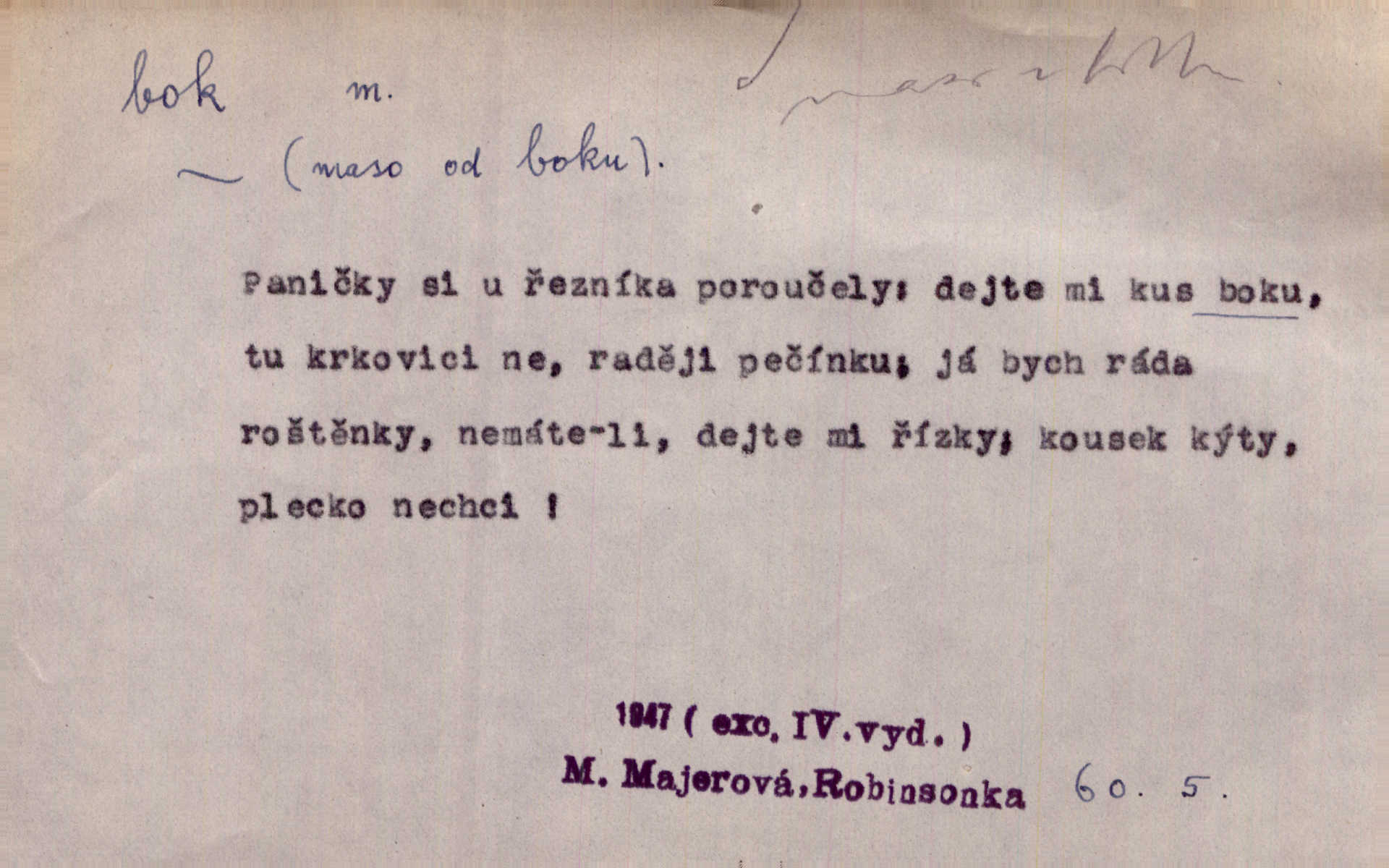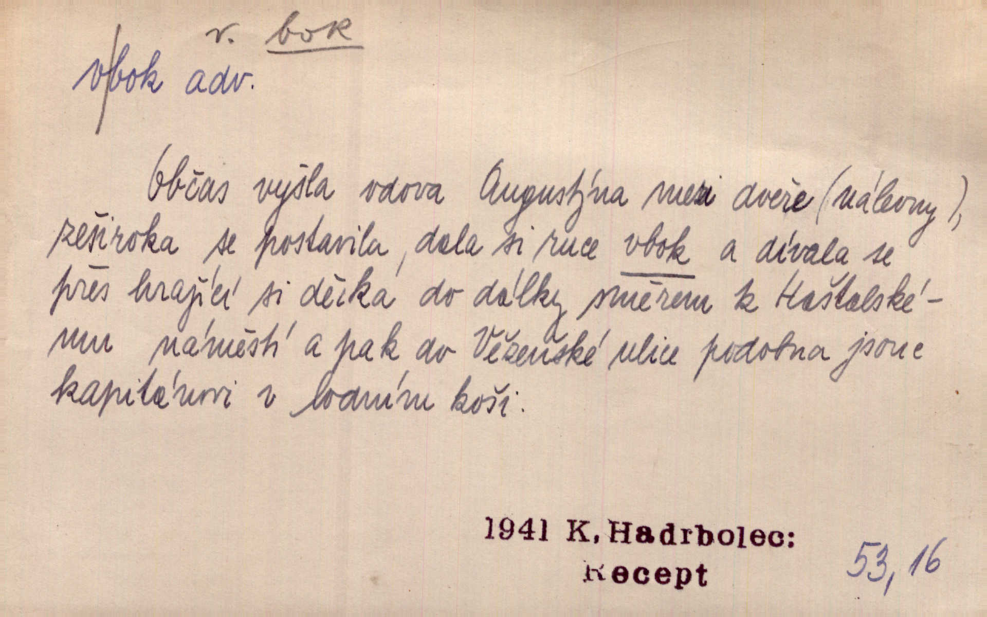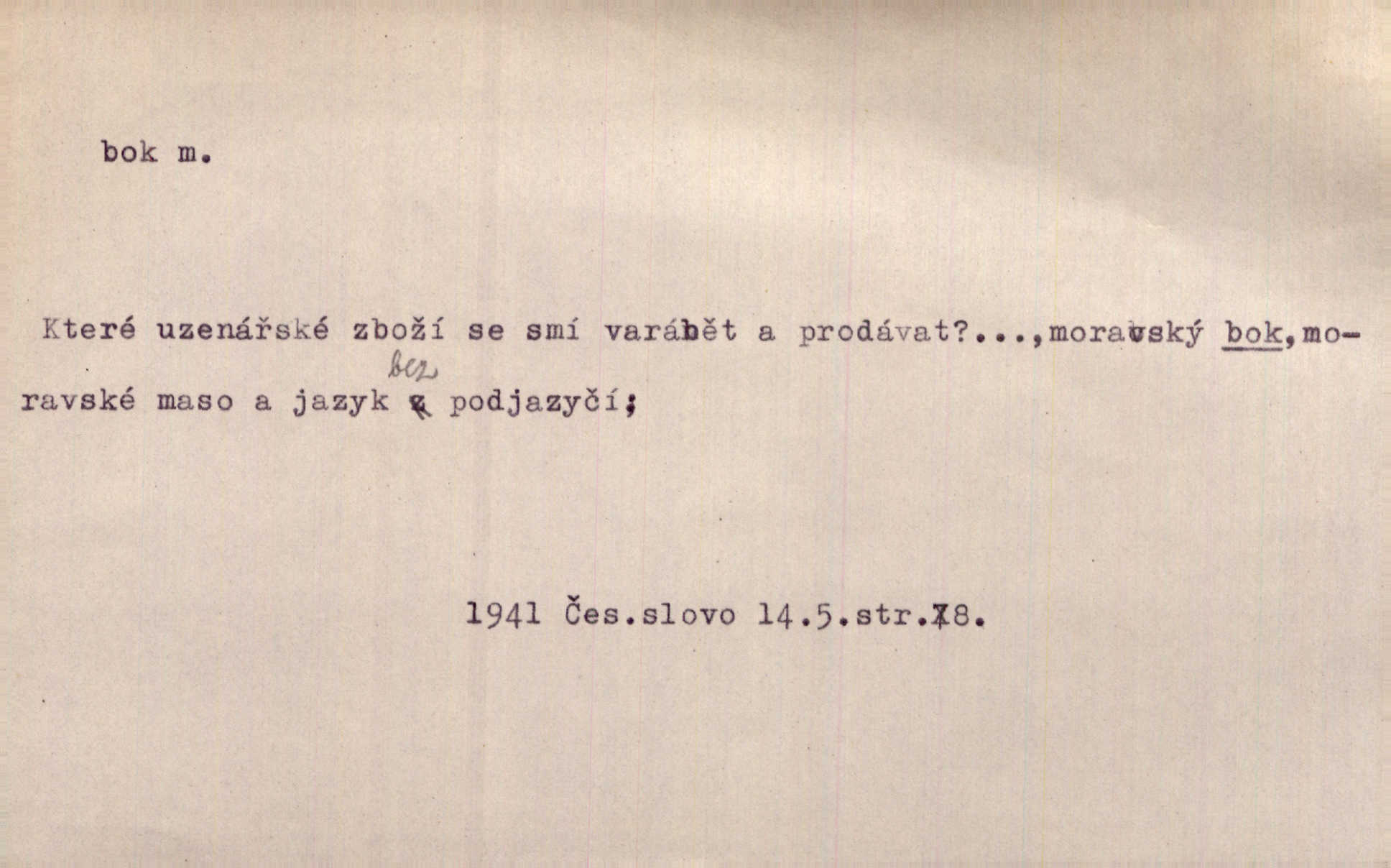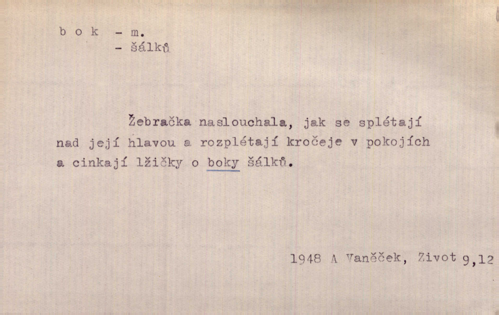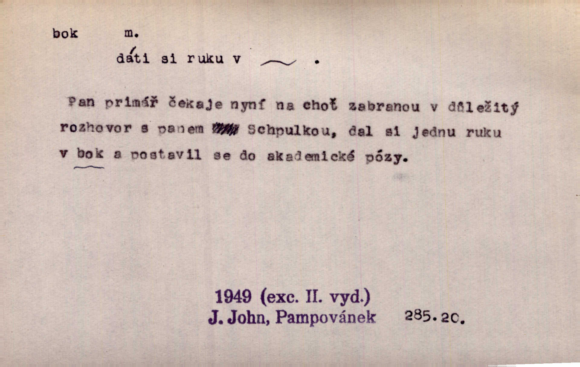 - bok, -u m. postranní část těla omezená obloukem žeber a hřebenem kyčle. Olšovský objal dívku okolo boků. Pfleg. Koňům od udidel i s boků prchala bílá pěna. Jir. Měla na sobě šaty modré, kolem boku spjaté atlasovým pasem. V. Mrš. Po boku se mu houpal kordík. Svět. Míti píchání v boku, lehnouti si na bok, podepříti si boky, založiti ruce v boky, obraceti se s boku na bok. Smál se, až se za boky bral. Plování na bok. Bok po boku těsně vedle sebe. Po boku, po bok vedle, ve společnosti, ve společenství, ve spojitosti a j. Dáma po boku štíhlého jonáka. Mácha. Rytířovi po boku mnich used’ v loubí stinném. Vrch. Postavil se jí po bok. Jir. Trávila věk svůj po boku muže chorobného. Svět. Jen krása vše tu měří, jíž pravda v boku jde. Vrch. Státi komu po boku pomáhati. Čechové i Moravané stáli sobě věrně po boku. Pal. Když poznala hořkost osudu, tu stála jí matka po boku s posilou a radou. Podl. Stavěti po bok na roveň stavěti. Básník, jemuž z nyní žijících nikoho po bok stavěti nemůžeme. Neb. Národ náš důstojně postaviti se mohl po bok národům jiným. Šmil. S boku, z boku, bokem stranou, šikmo, přen. úkosem. Strojil se s boku na hosta parohem udeřiti. Hol. Pošilhávala naň s boku. Staš. Krabi bokem utíkali do vody. Maj. Helena bokem hleděla před sebe. V. Mrš. Nepravím slov křivých v ucho, nechyl hlavy, nehleď bokem, nerdi se mi, ty děvucho! Bezr. Dítě z levého boku nemanželské. D strana, postranní stěna nějakého předmětu (op. předek, fronta). Již lze zříti lichoběžné boky a pestrá nároží předměstských domů. Vanč. Po boku povozu šel párek manželů. Rais. Boky lodi, klenby. Voj. těl. vpravo v bok, vlevo v bok! otoč se vpravo, vlevo. Bok vojska. Krýti bok, napadnouti s boku. Odkrytý bok. Rozvinouti v bok. D Geogr. úbočí, svah, stráň. Šerá hora Kunětická v rovině rozkládala rozdrásané boky. Rais. Boky úzkého údolí byly zarostlejší. Jir. Jako ostrov v zeleném moři, jehož boky vzedmuté vlny ještě polévají, tak tu stojí fara až po pás porostlá vínem. Baar.