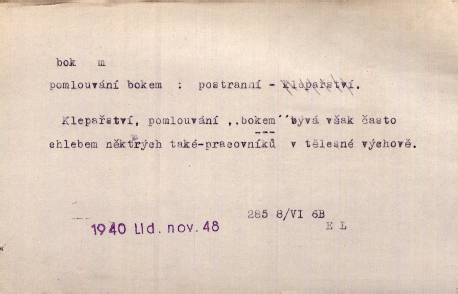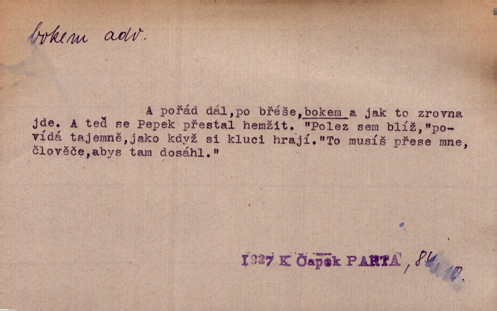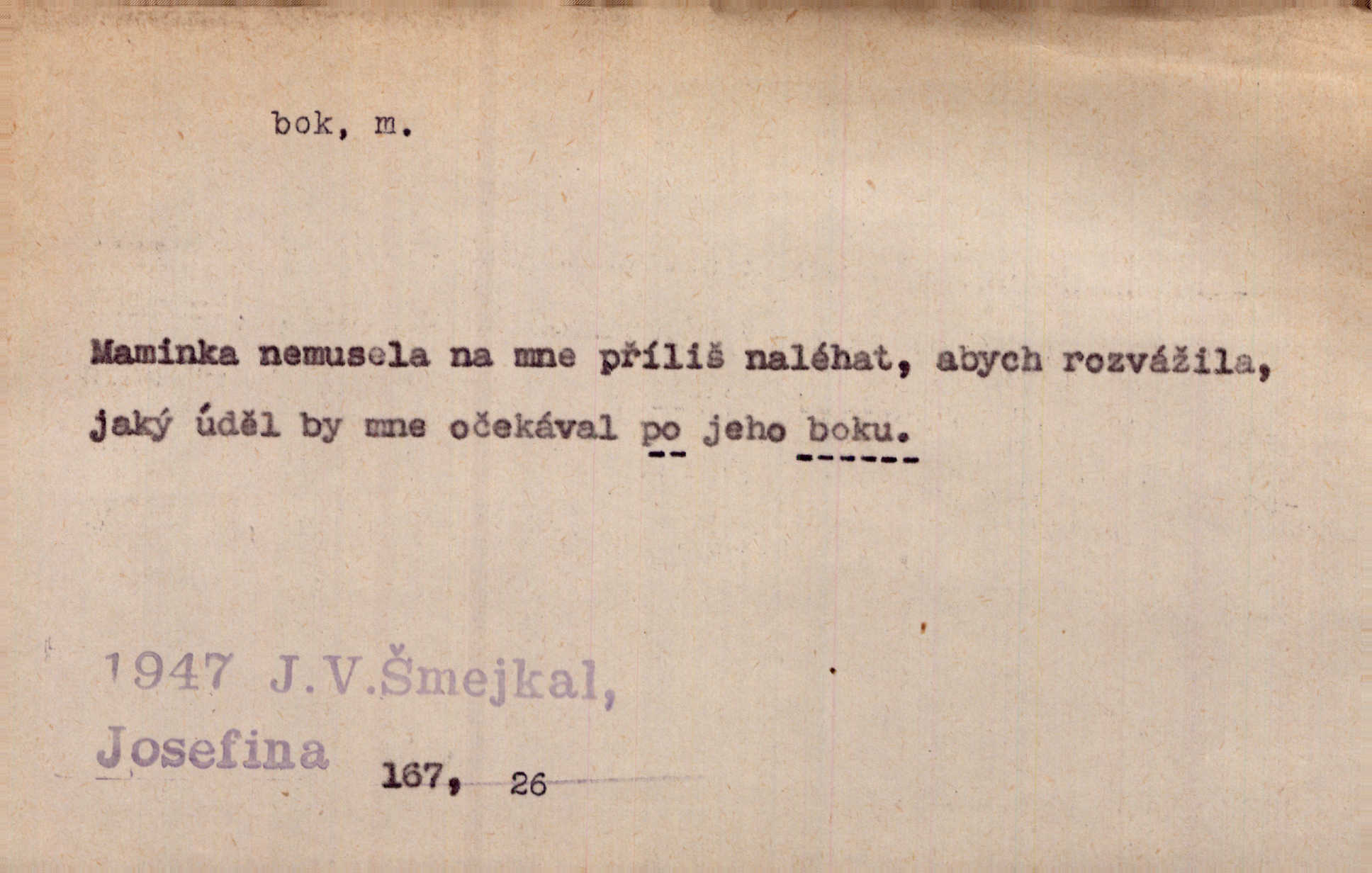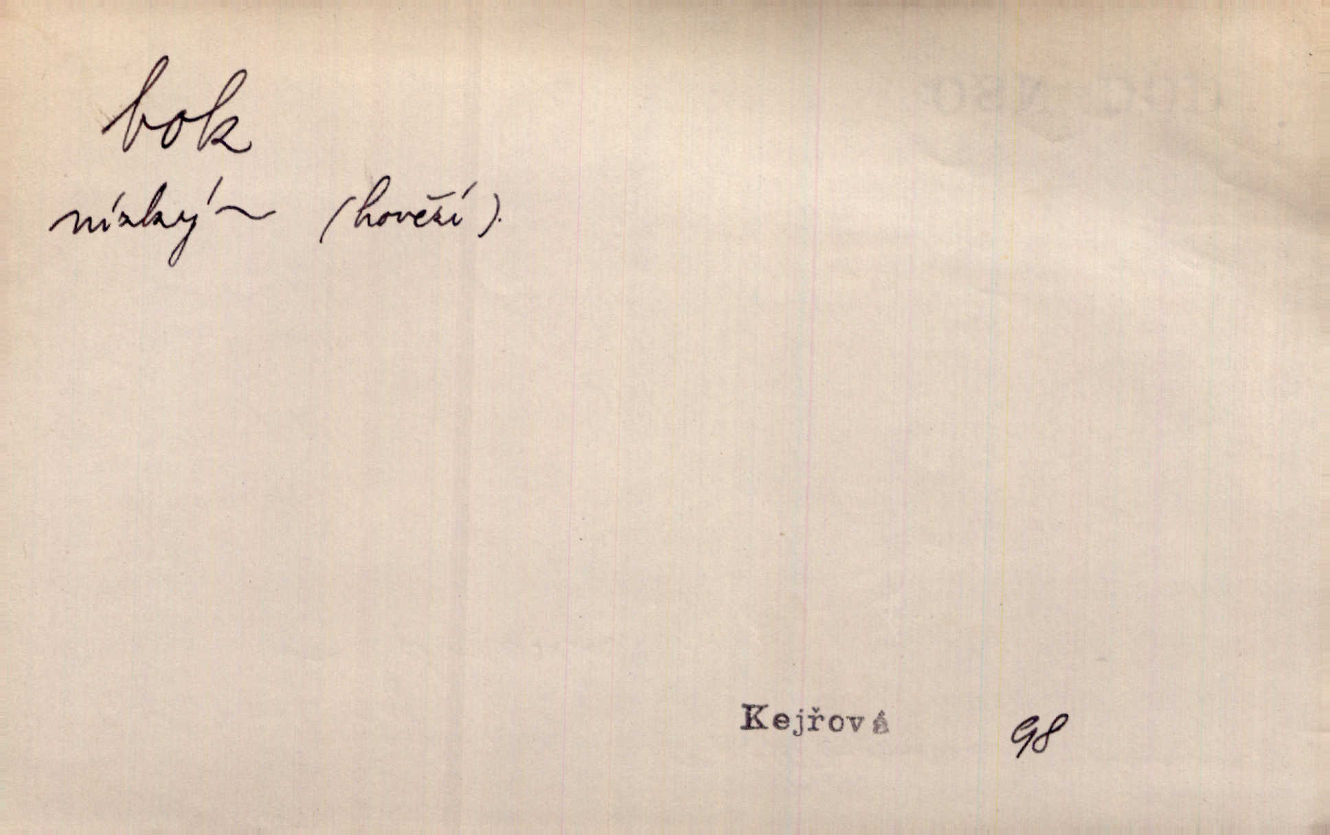 - bok, -u m. postranní část těla omezená obloukem žeber a hřebenem kyčle. Olšovský objal dívku okolo boků. Pfleg. Koňům od udidel i s boků prchala bílá pěna. Jir. Měla na sobě šaty modré, kolem boku spjaté atlasovým pasem. V. Mrš. Po boku se mu houpal kordík. Svět. Míti píchání v boku, lehnouti si na bok, podepříti si boky, založiti ruce v boky, obraceti se s boku na bok. Smál se, až se za boky bral. Plování na bok. Bok po boku těsně vedle sebe. Po boku, po bok vedle, ve společnosti, ve společenství, ve spojitosti a j. Dáma po boku štíhlého jonáka. Mácha. Rytířovi po boku mnich used’ v loubí stinném. Vrch. Postavil se jí po bok. Jir. Trávila věk svůj po boku muže chorobného. Svět. Jen krása vše tu měří, jíž pravda v boku jde. Vrch. Státi komu po boku pomáhati. Čechové i Moravané stáli sobě věrně po boku. Pal. Když poznala hořkost osudu, tu stála jí matka po boku s posilou a radou. Podl. Stavěti po bok na roveň stavěti. Básník, jemuž z nyní žijících nikoho po bok stavěti nemůžeme. Neb. Národ náš důstojně postaviti se mohl po bok národům jiným. Šmil. S boku, z boku, bokem stranou, šikmo, přen. úkosem. Strojil se s boku na hosta parohem udeřiti. Hol. Pošilhávala naň s boku. Staš. Krabi bokem utíkali do vody. Maj. Helena bokem hleděla před sebe. V. Mrš. Nepravím slov křivých v ucho, nechyl hlavy, nehleď bokem, nerdi se mi, ty děvucho! Bezr. Dítě z levého boku nemanželské. D strana, postranní stěna nějakého předmětu (op. předek, fronta). Již lze zříti lichoběžné boky a pestrá nároží předměstských domů. Vanč. Po boku povozu šel párek manželů. Rais. Boky lodi, klenby. Voj. těl. vpravo v bok, vlevo v bok! otoč se vpravo, vlevo. Bok vojska. Krýti bok, napadnouti s boku. Odkrytý bok. Rozvinouti v bok. D Geogr. úbočí, svah, stráň. Šerá hora Kunětická v rovině rozkládala rozdrásané boky. Rais. Boky úzkého údolí byly zarostlejší. Jir. Jako ostrov v zeleném moři, jehož boky vzedmuté vlny ještě polévají, tak tu stojí fara až po pás porostlá vínem. Baar.
