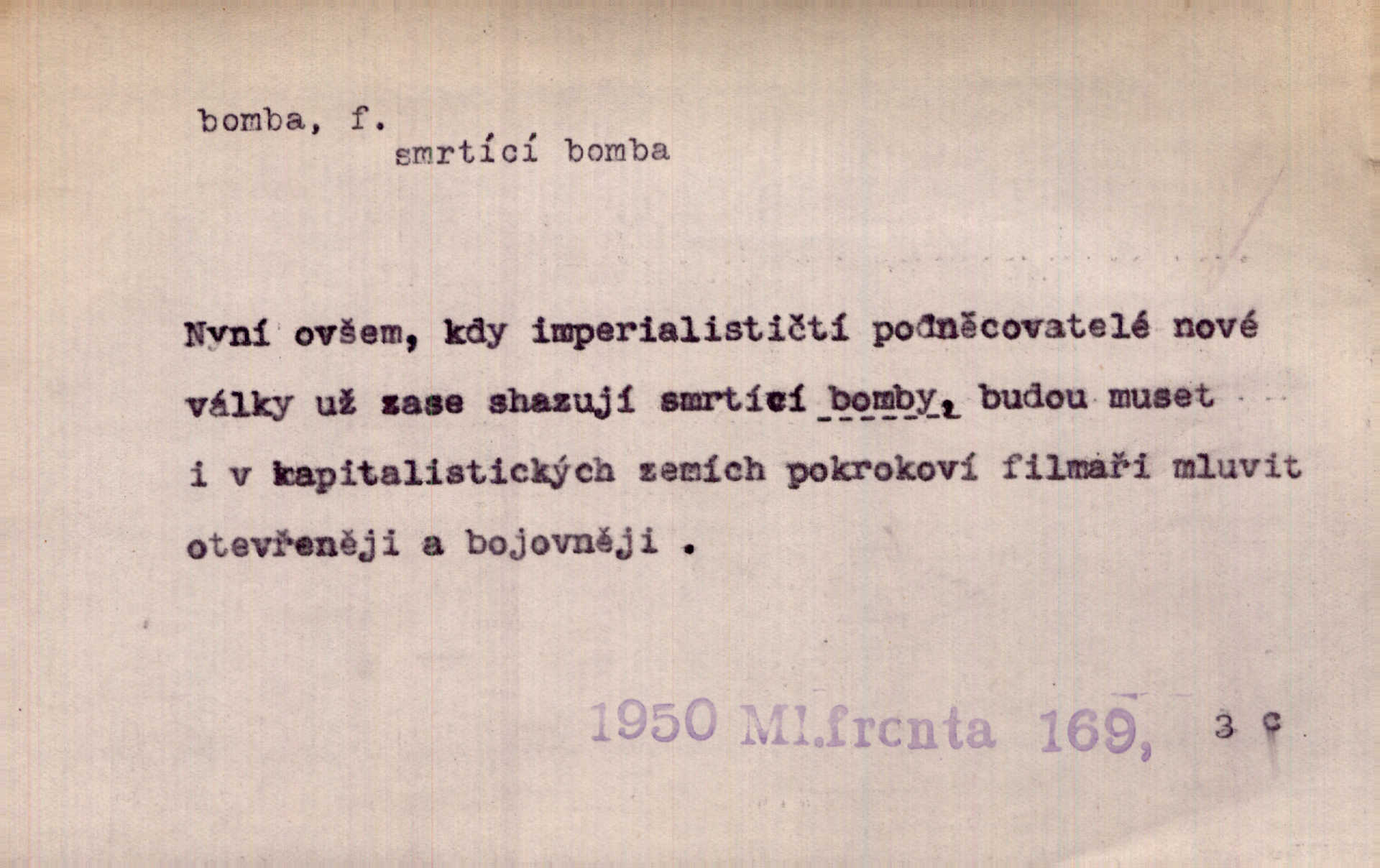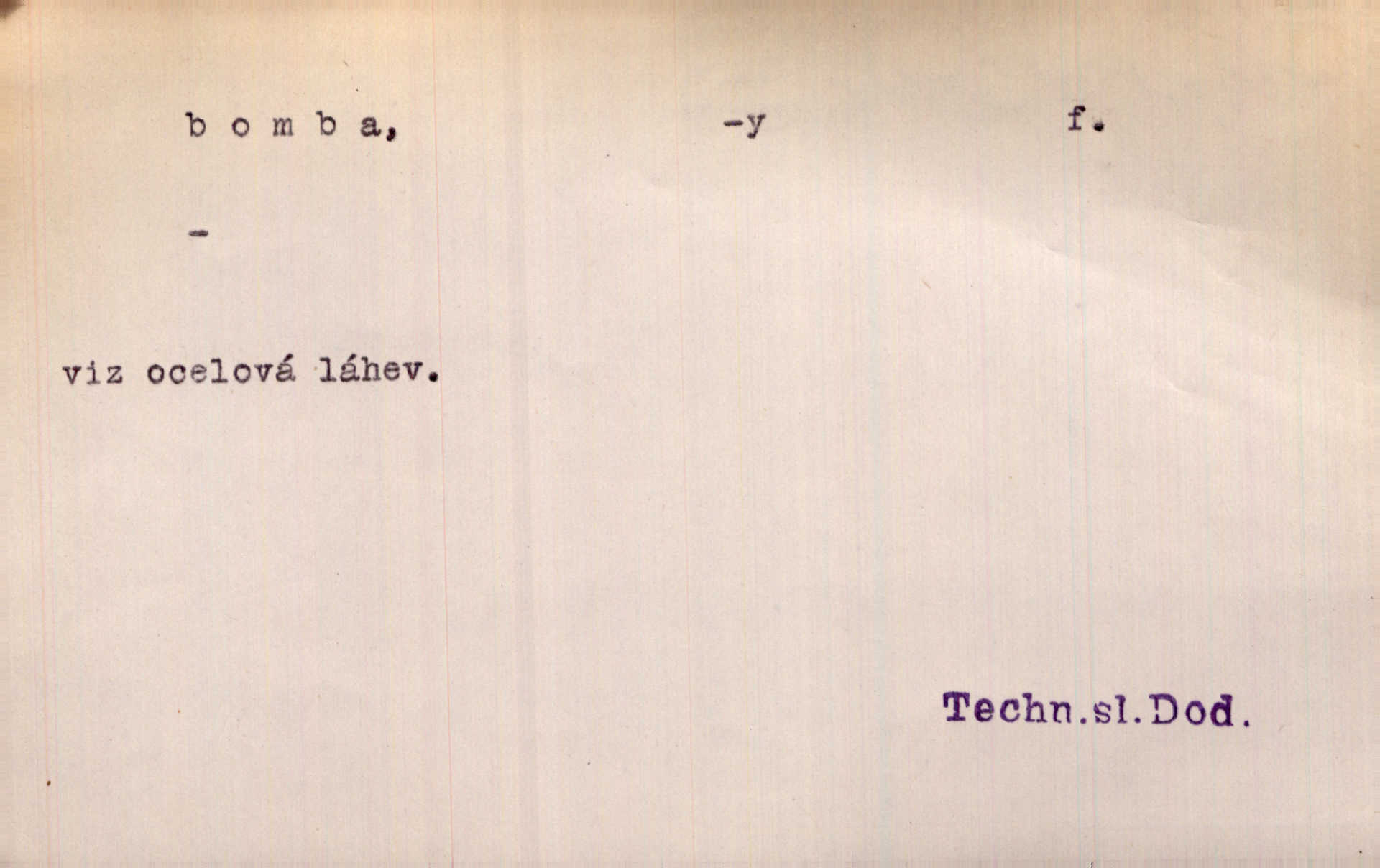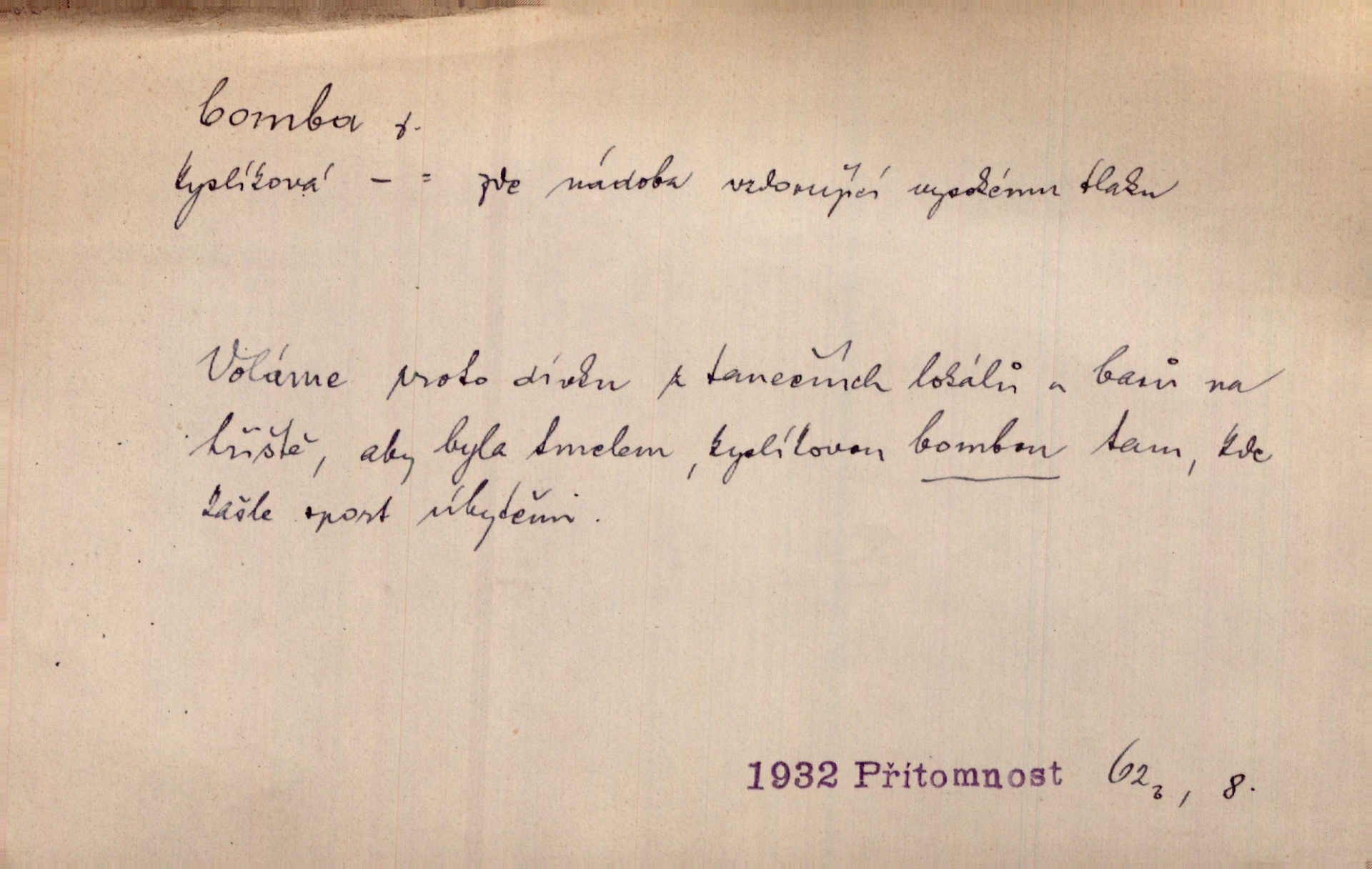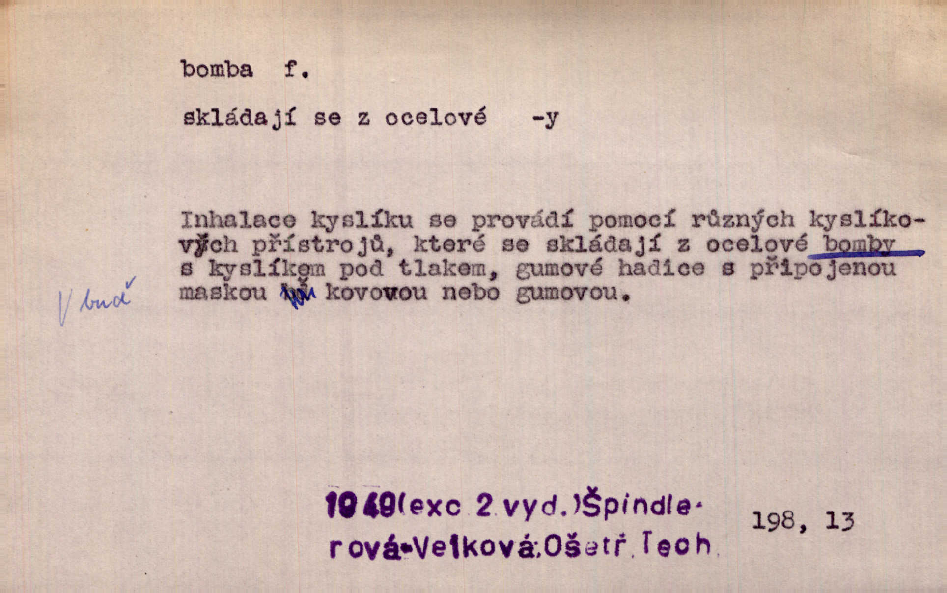 - bomba, -y f. výbušná koule, puma. Kdyby byla praskla bomba uprostřed náměstí, nemohly býti Zubřany překvapeny více. Vrba. Letecká bomba. D kovová nádoba na plyny. Bomba kyslíku. D Kuch. zmrzlina mražená v kulovitém tvořítku.